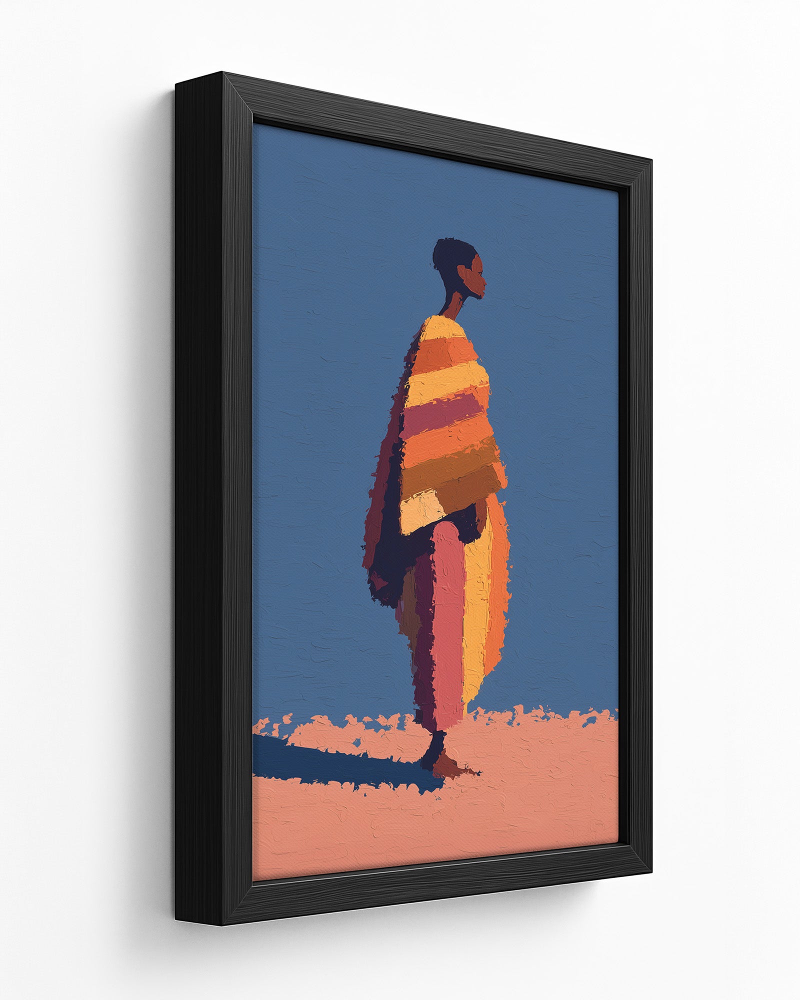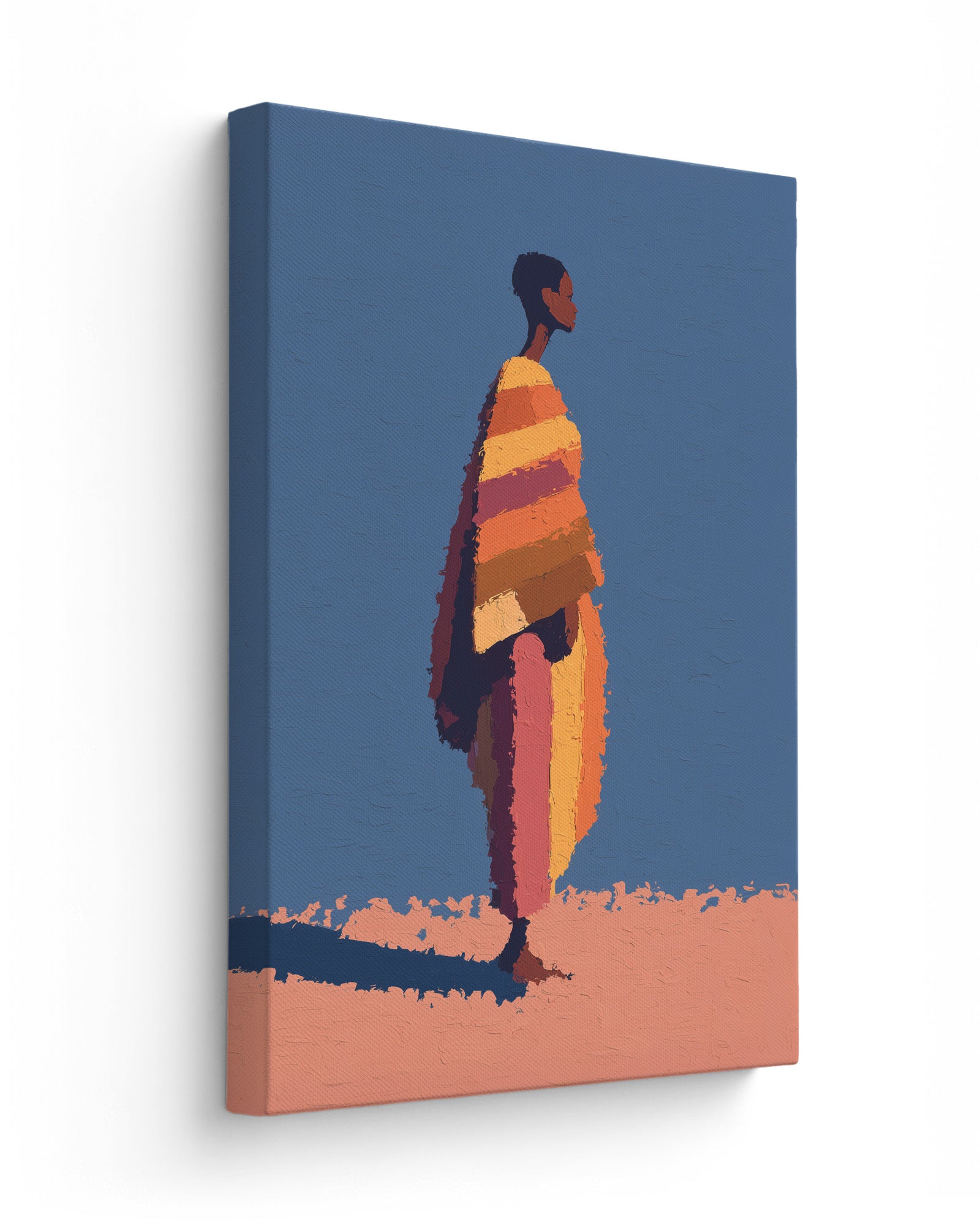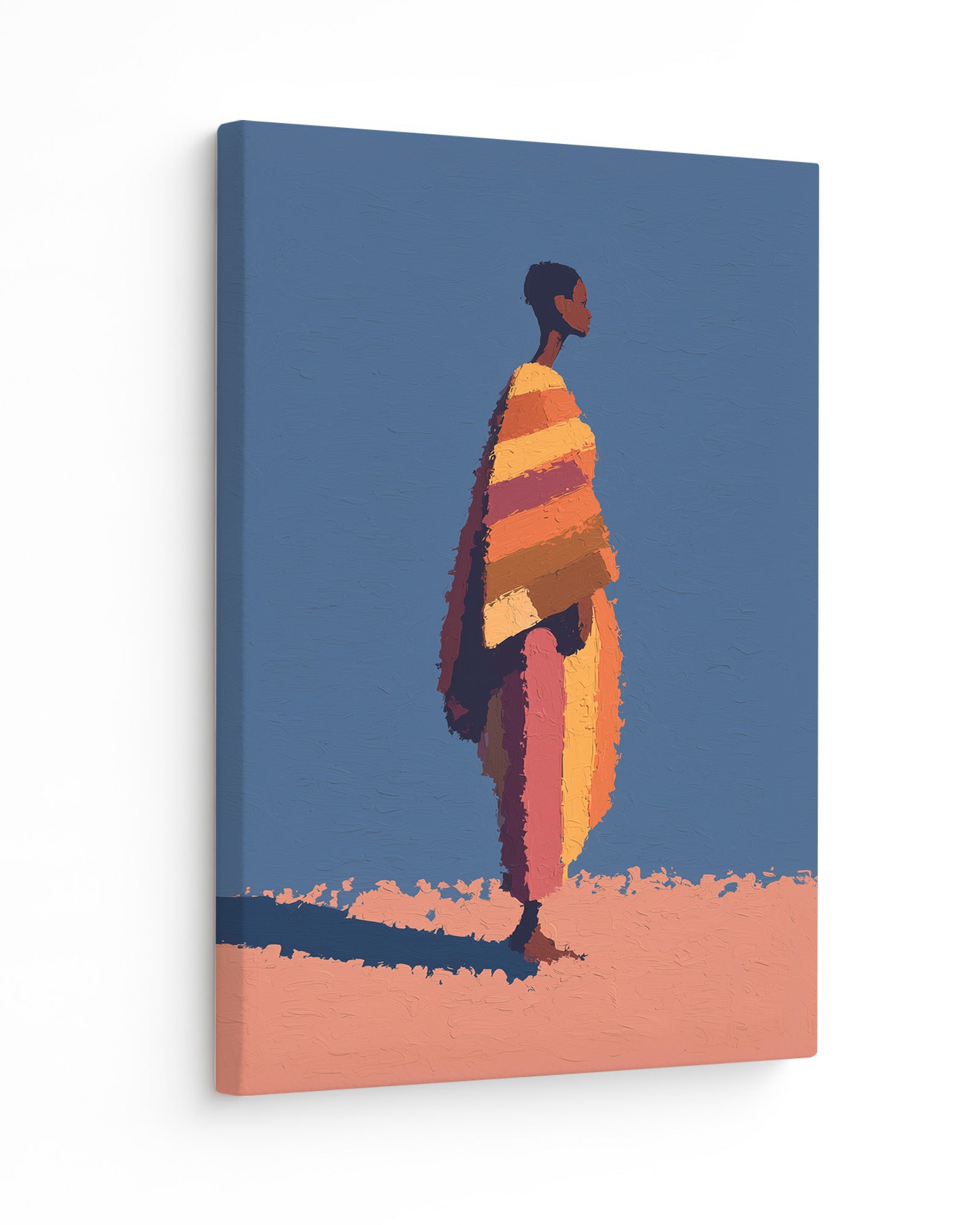 "Contemporary Ghanaian Portraiture: Identity and Textile Heritage Through Geometric Color Patterns" explores the profound connection between body, dress, and cultural identity through minimalist figuration and bold color blocking. This striking artwork depicts a standing figure rendered in profile against a Winter Palace-blue background, the silhouetted head and neck rendered in deep tones providing contrast to the body wrapped in horizontal stripes of warm orange, golden yellow, deep red, and burgundy. The geometric striping references authentic Ghanaian kente cloth traditions while the color layering suggests both the visual richness of textile heritage and the metaphorical layering of cultural identity, personal history, and individual expression.