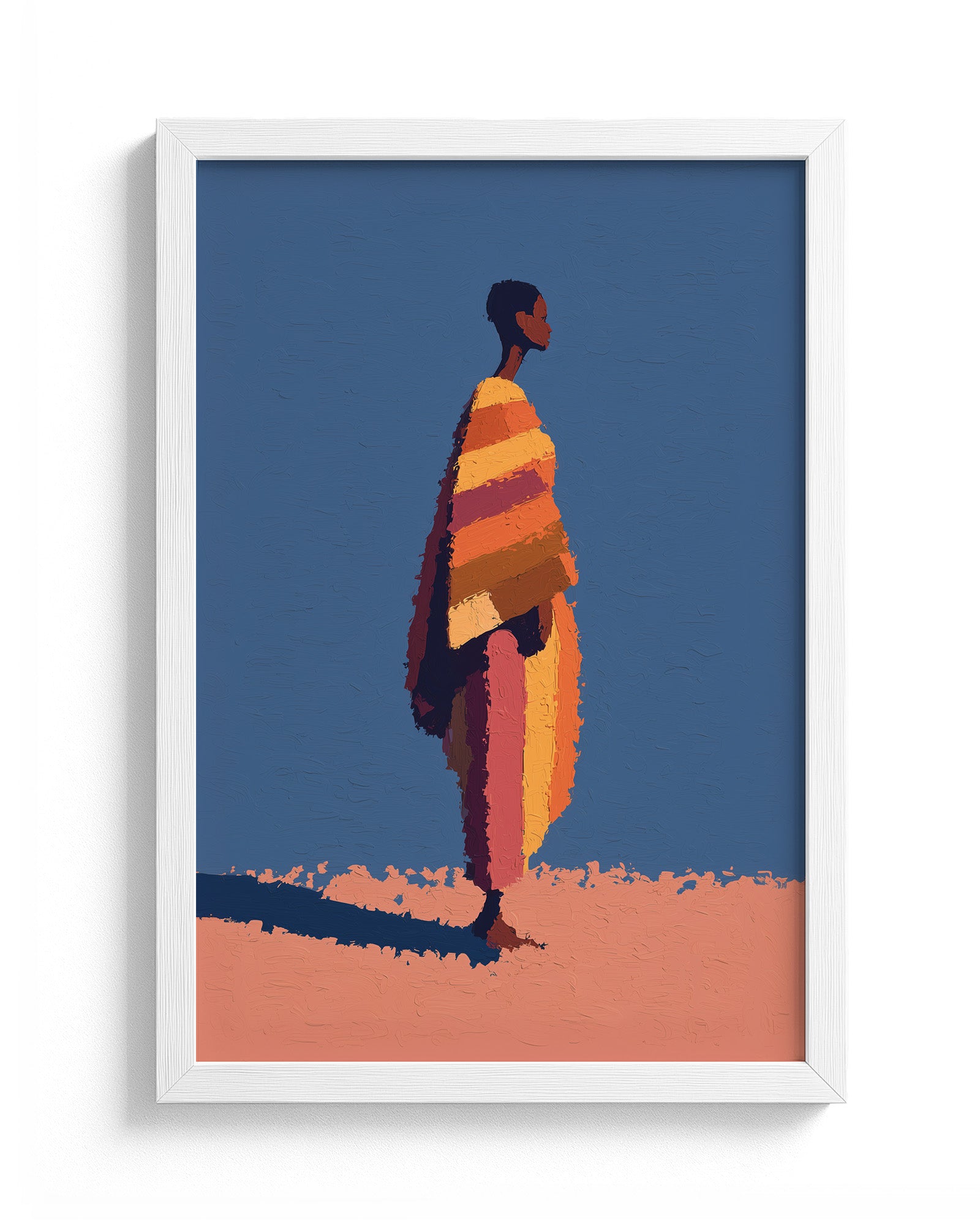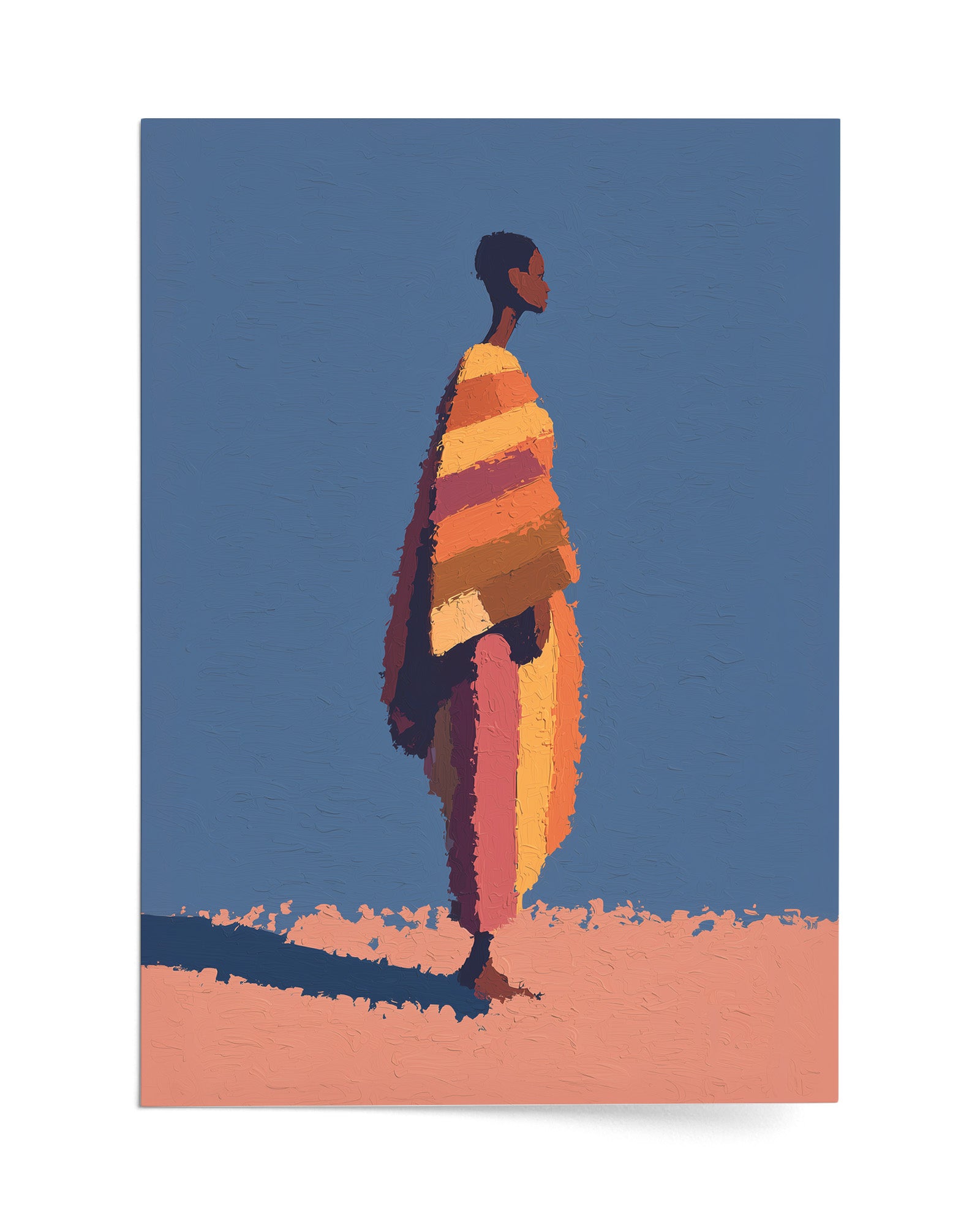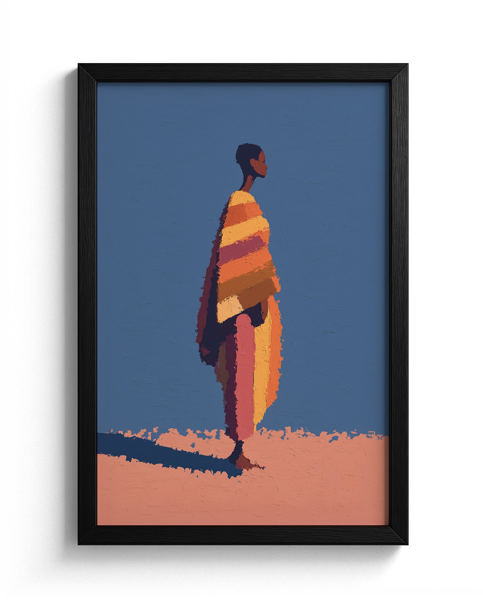 "Contemporary Ghanaian Portraiture: Identity and Textile Heritage Through Geometric Color Patterns" explores the profound connection between body, dress, and cultural identity through minimalist figuration and bold color blocking. This striking artwork depicts a standing figure rendered in profile against a Winter Palace-blue background, the silhouetted head and neck rendered in deep tones providing contrast to the body wrapped in horizontal stripes of warm orange, golden yellow, deep red, and burgundy. The geometric striping references authentic Ghanaian kente cloth traditions while the color layering suggests both the visual richness of textile heritage and the metaphorical layering of cultural identity, personal history, and individual expression.