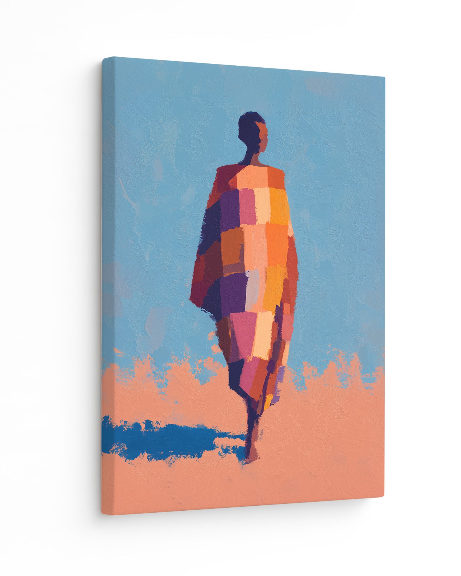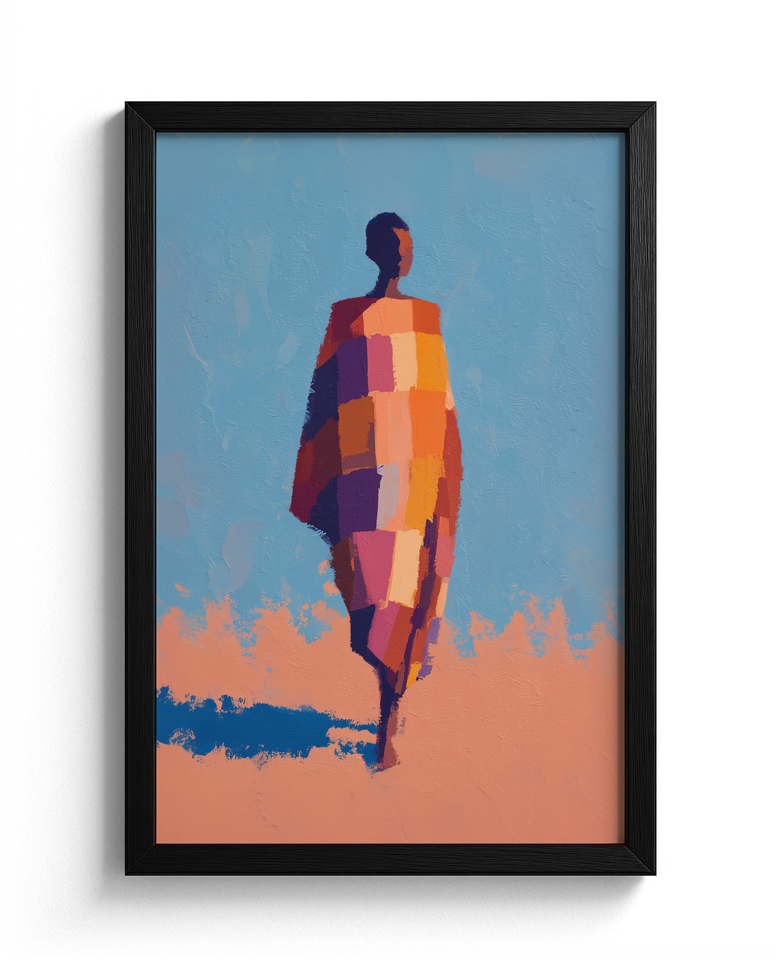 "Contemporary Ghanaian Portraiture: Identity and Textile Heritage Through Geometric Color Patterns" explores the profound connection between body, dress, and cultural identity through minimalist figuration and bold color blocking. This striking artwork depicts a standing figure rendered in profile against a Fate-blue background, the silhouetted head and neck rendered in deep tones providing contrast to the body wrapped in horizontal stripes of warm orange, golden yellow, deep red, and burgundy. The geometric striping references authentic Ghanaian kente cloth traditions while the color layering suggests both the visual richness of textile heritage and the metaphorical layering of cultural identity, personal history, and individual expression.