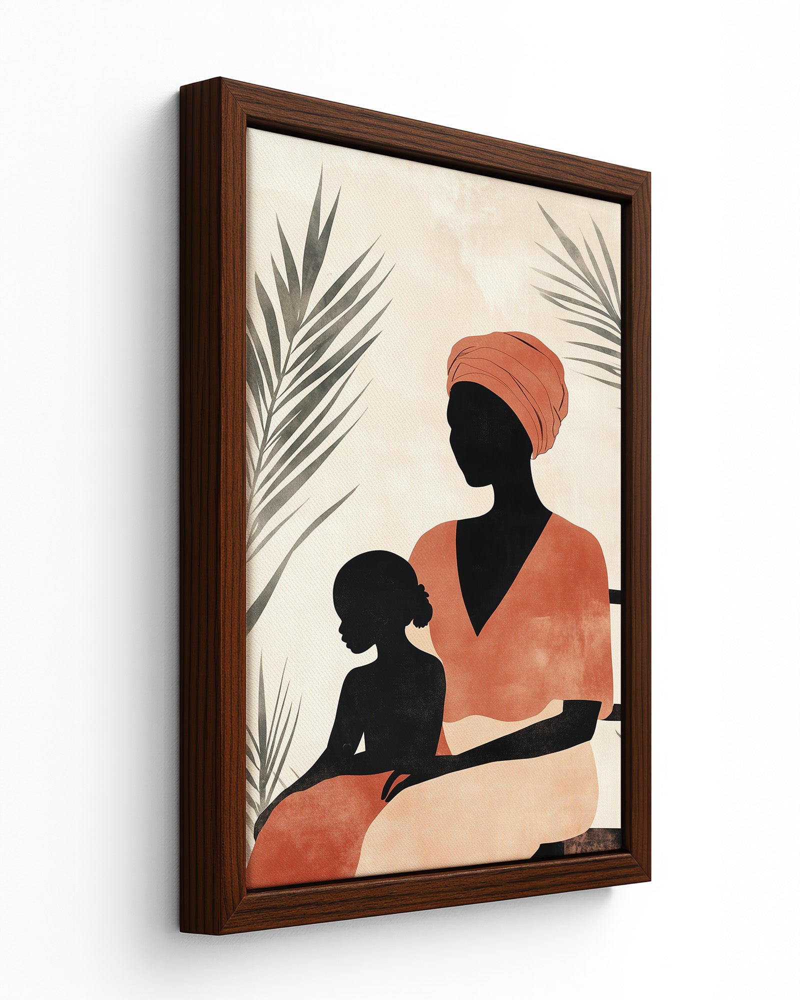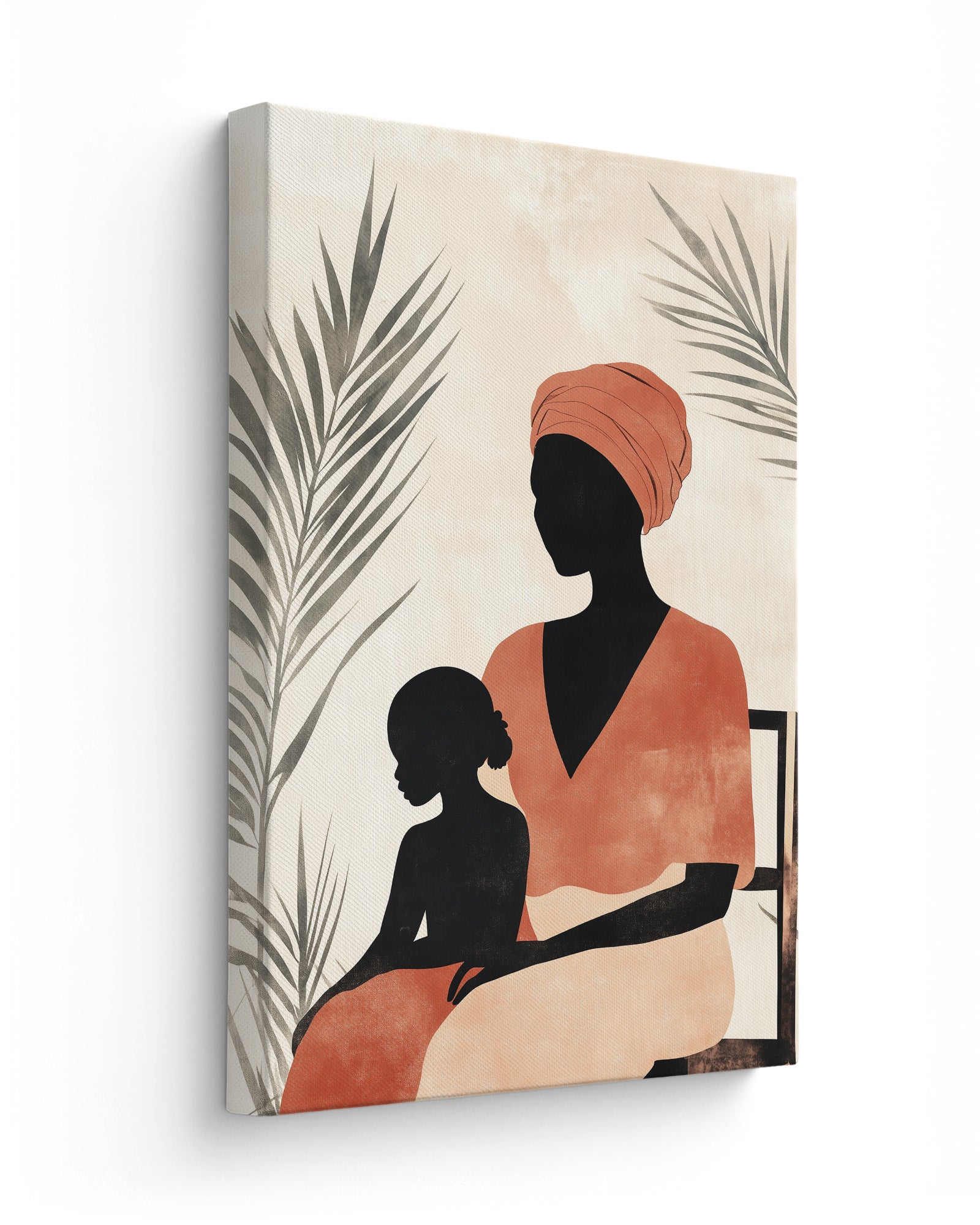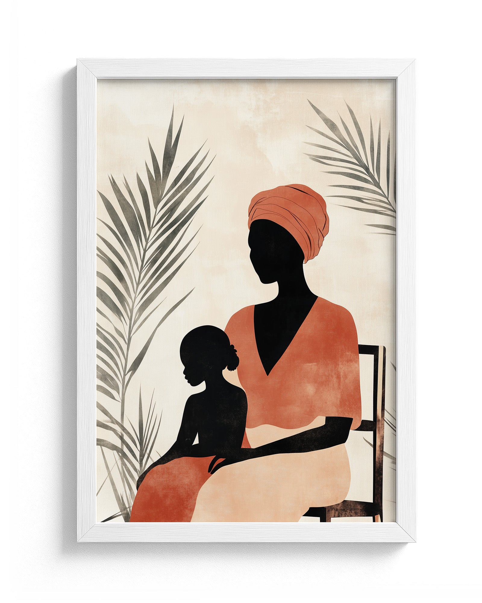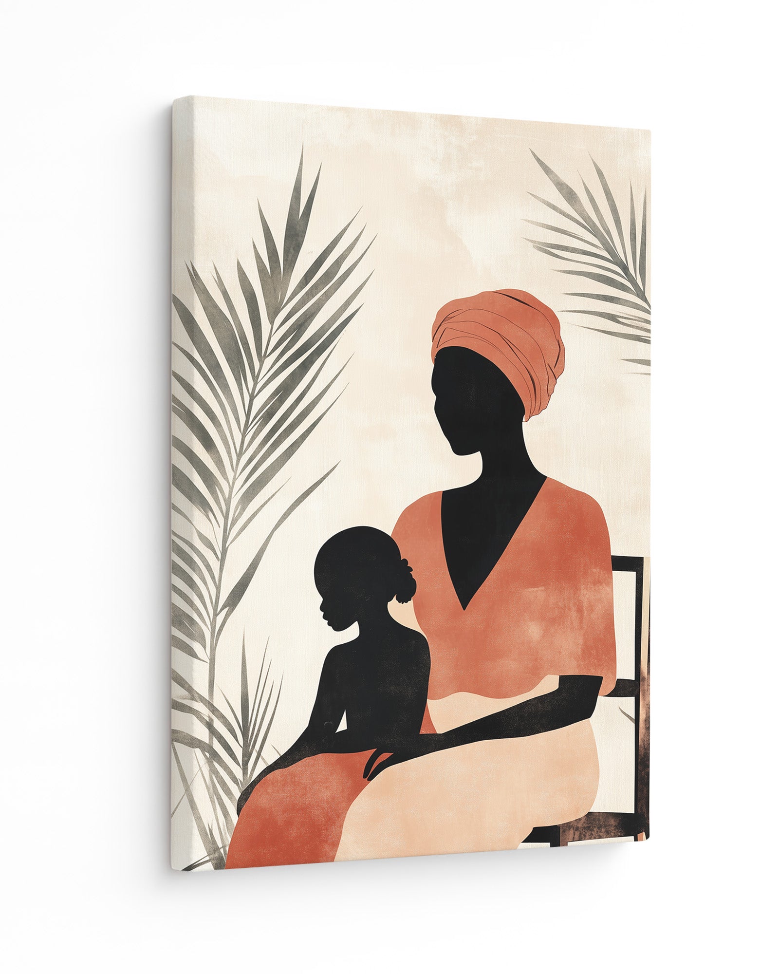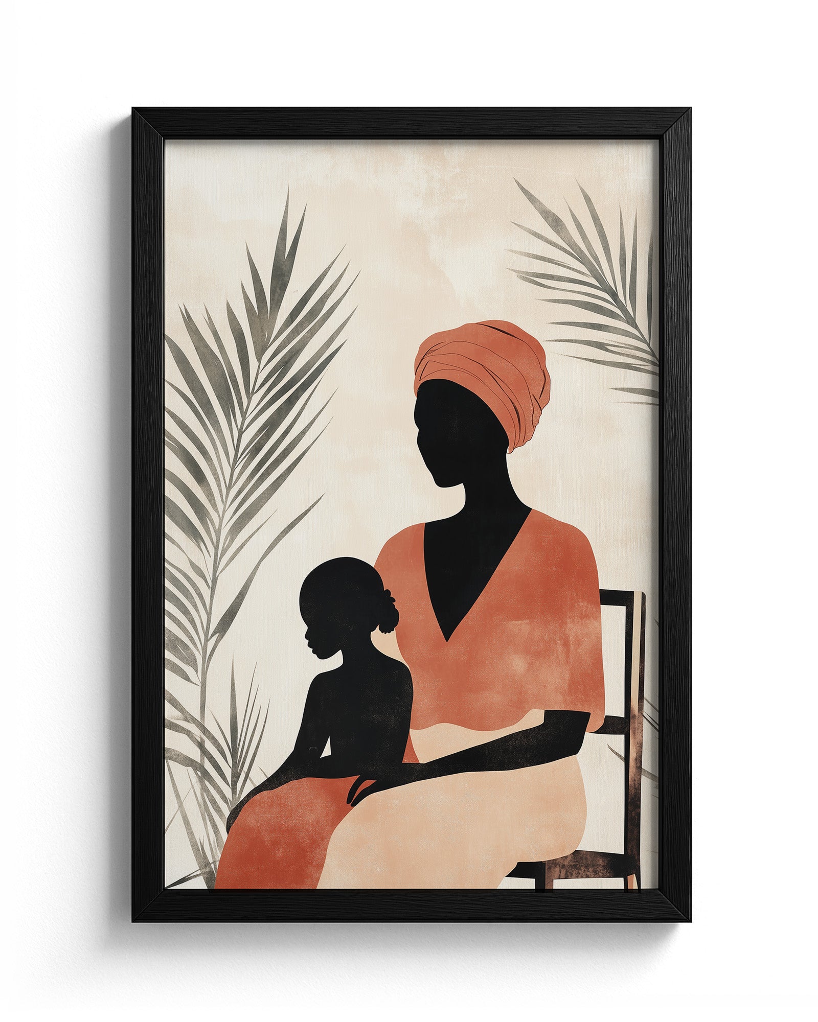 This captivating oil painting portrays an intimate moment between an African mother and daughter, rendered with rich emotional depth and cultural significance. The mother, adorned in a striking orange headdress and vibrant red dress, sits regally on a brown chair against a subdued grey wall, creating a powerful contrast that draws the viewer's eye to the subjects. Lush green plants frame the composition, adding life and symbolism to this cross-generational portrait.