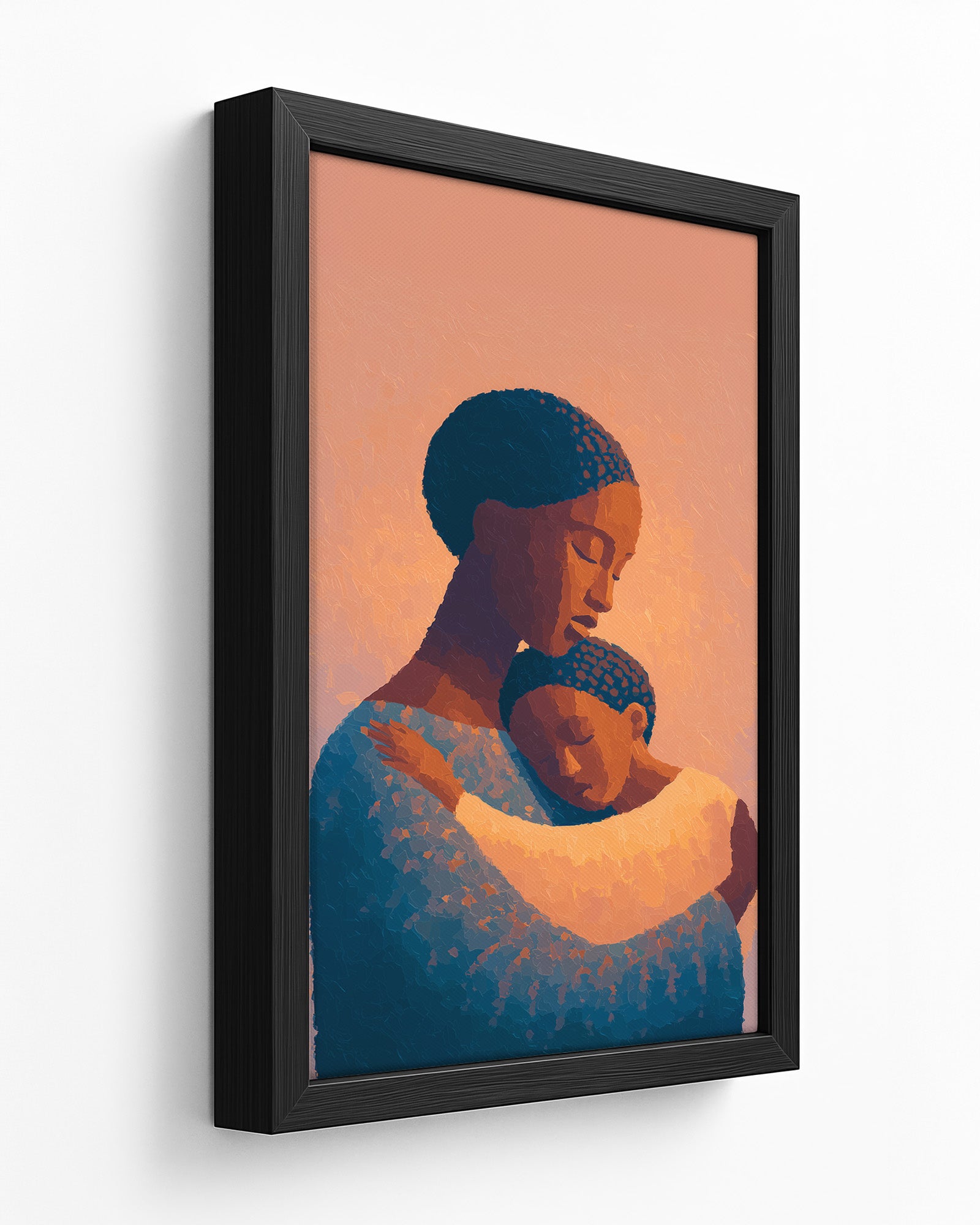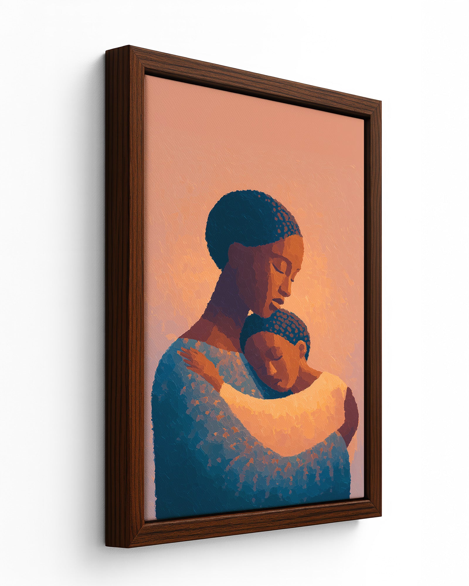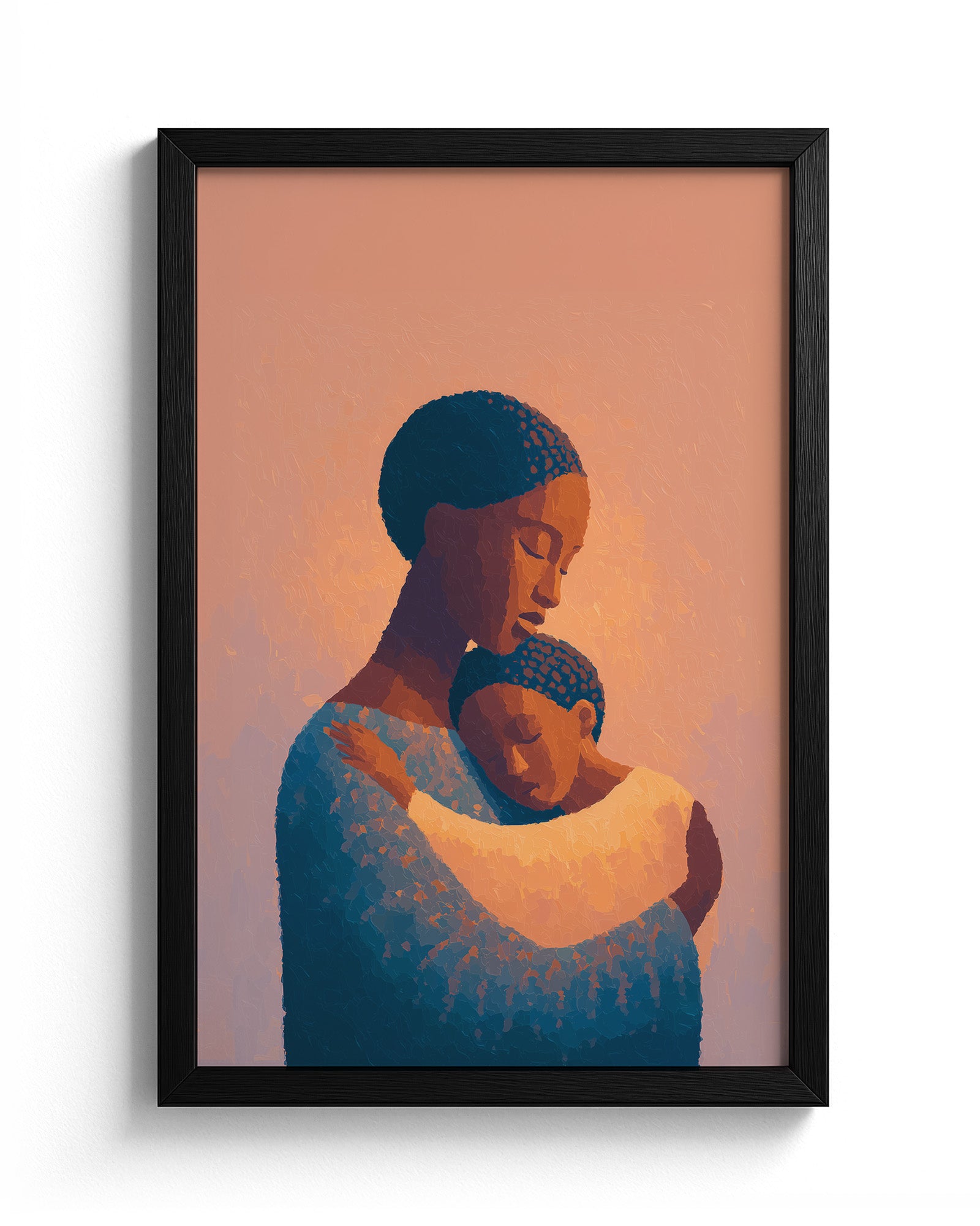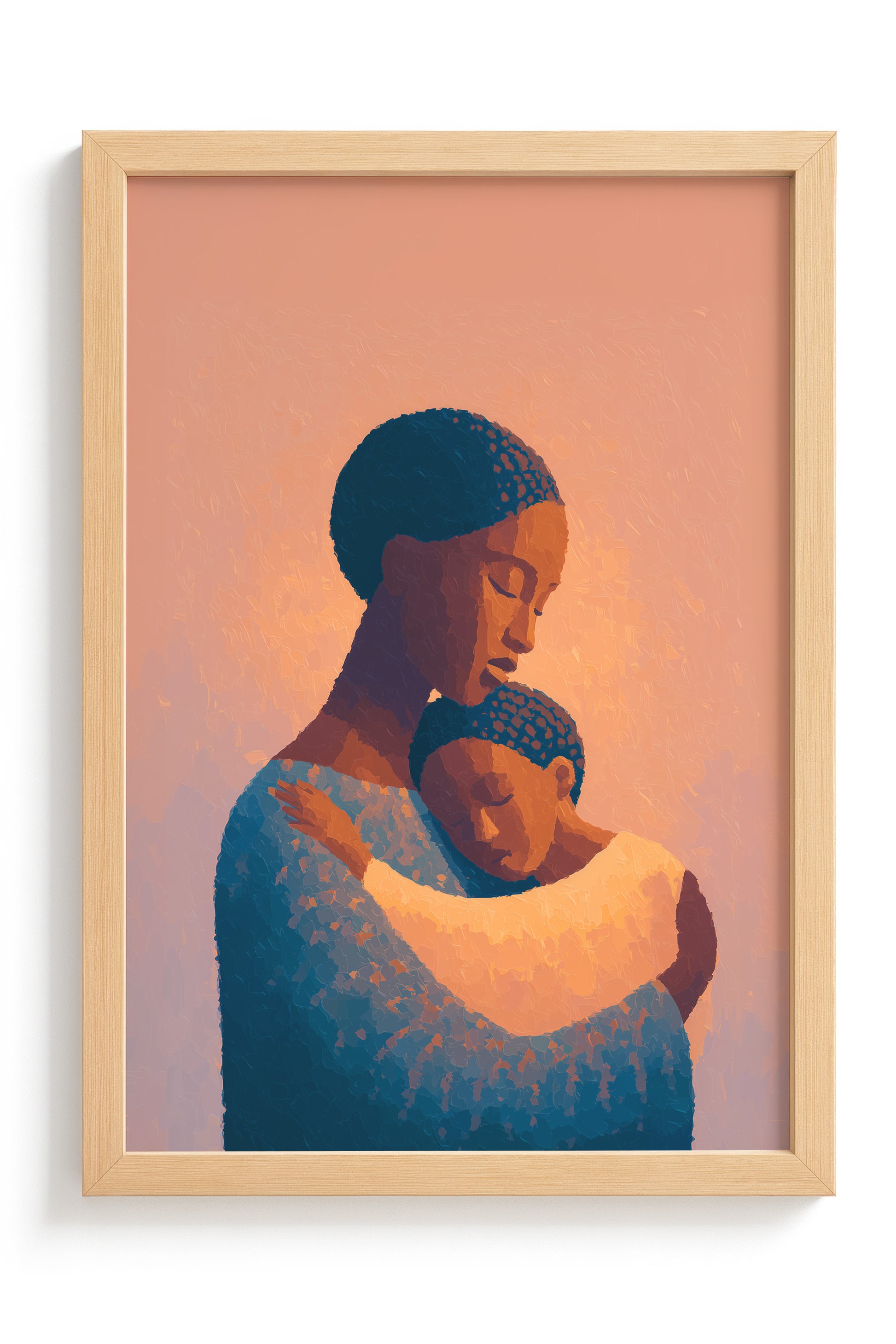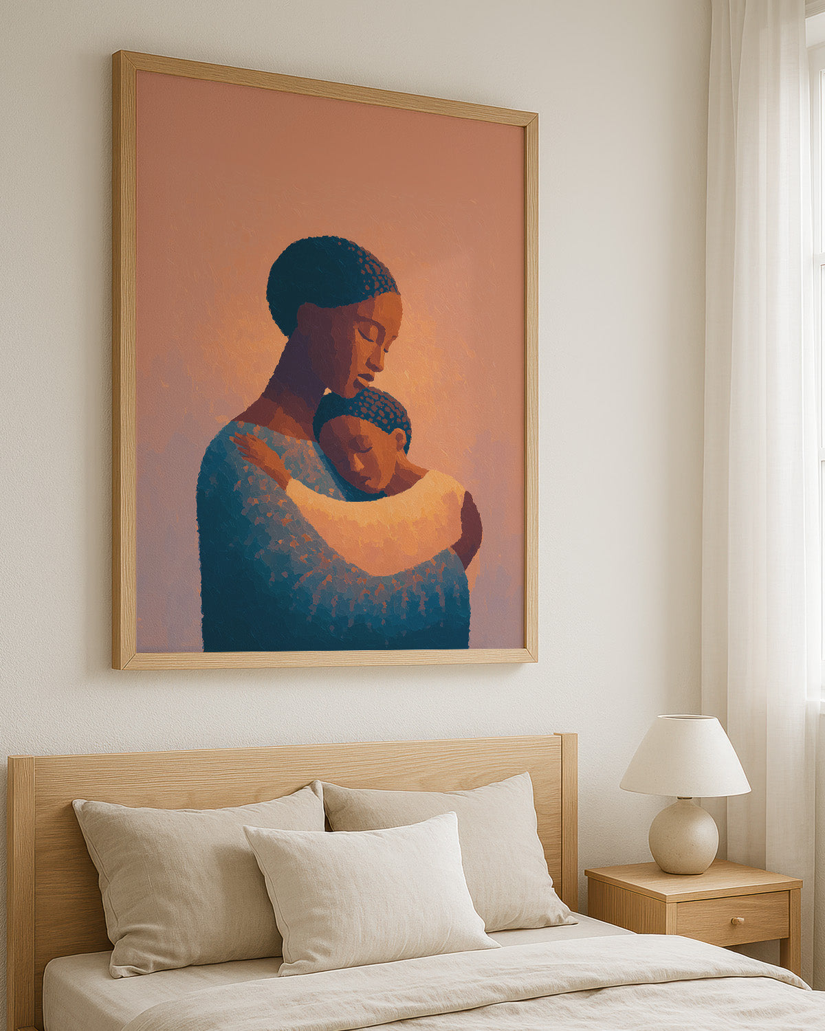 "African Motherhood Art: Contemporary Portraiture Celebrating Maternal Love and Generational Continuity" honors the sacred role of African mothers as keepers of cultural memory, nurturers of life, and transmitters of heritage through intimate figurative composition and symbolic color relationships. This stunning artwork depicts a mother and child rendered in profile in complementary teal and warm orange tones, creating visual harmony that suggests emotional and spiritual bond.