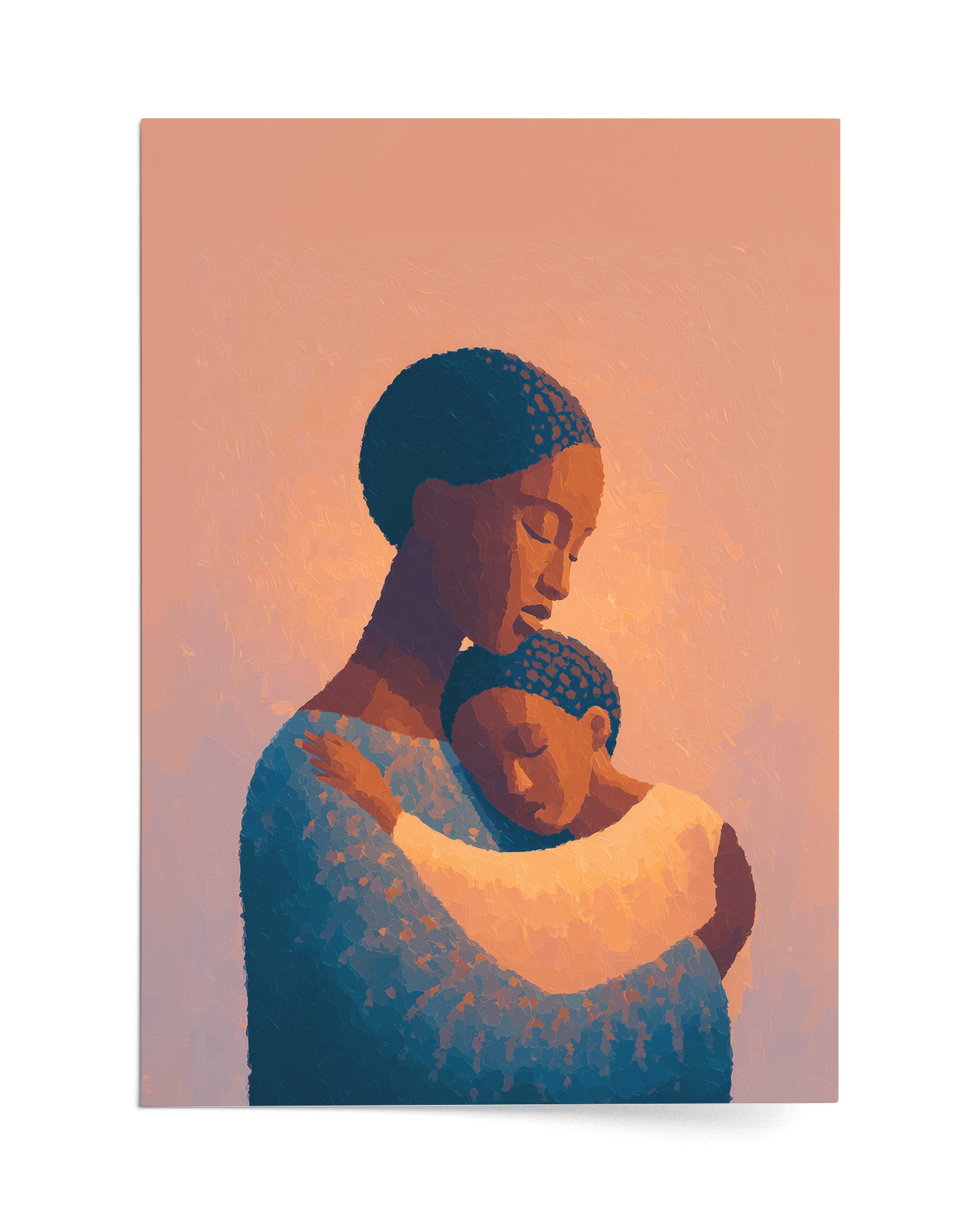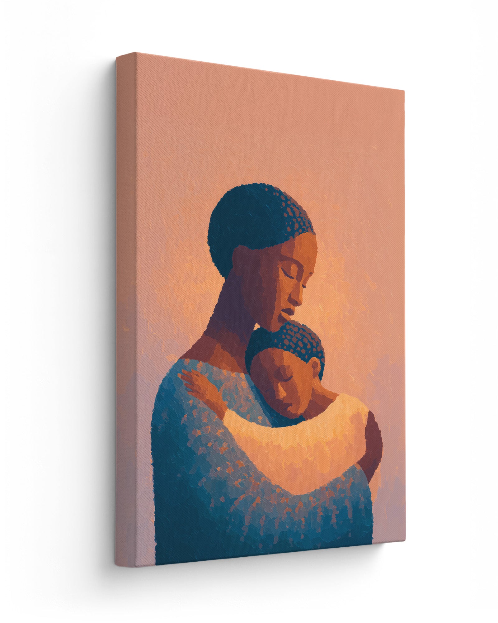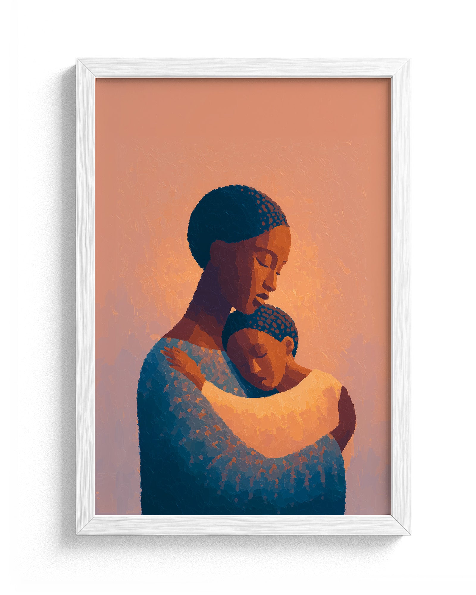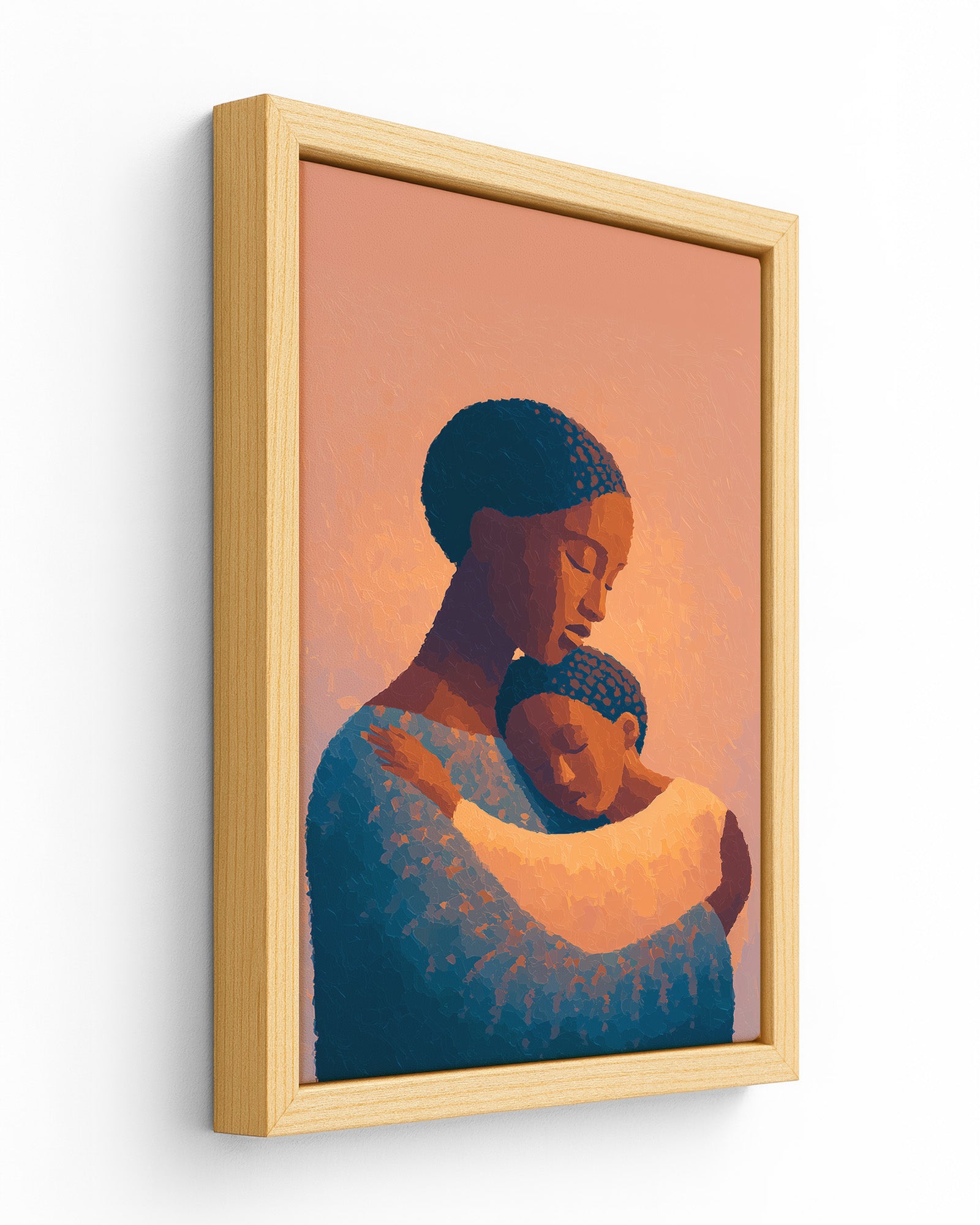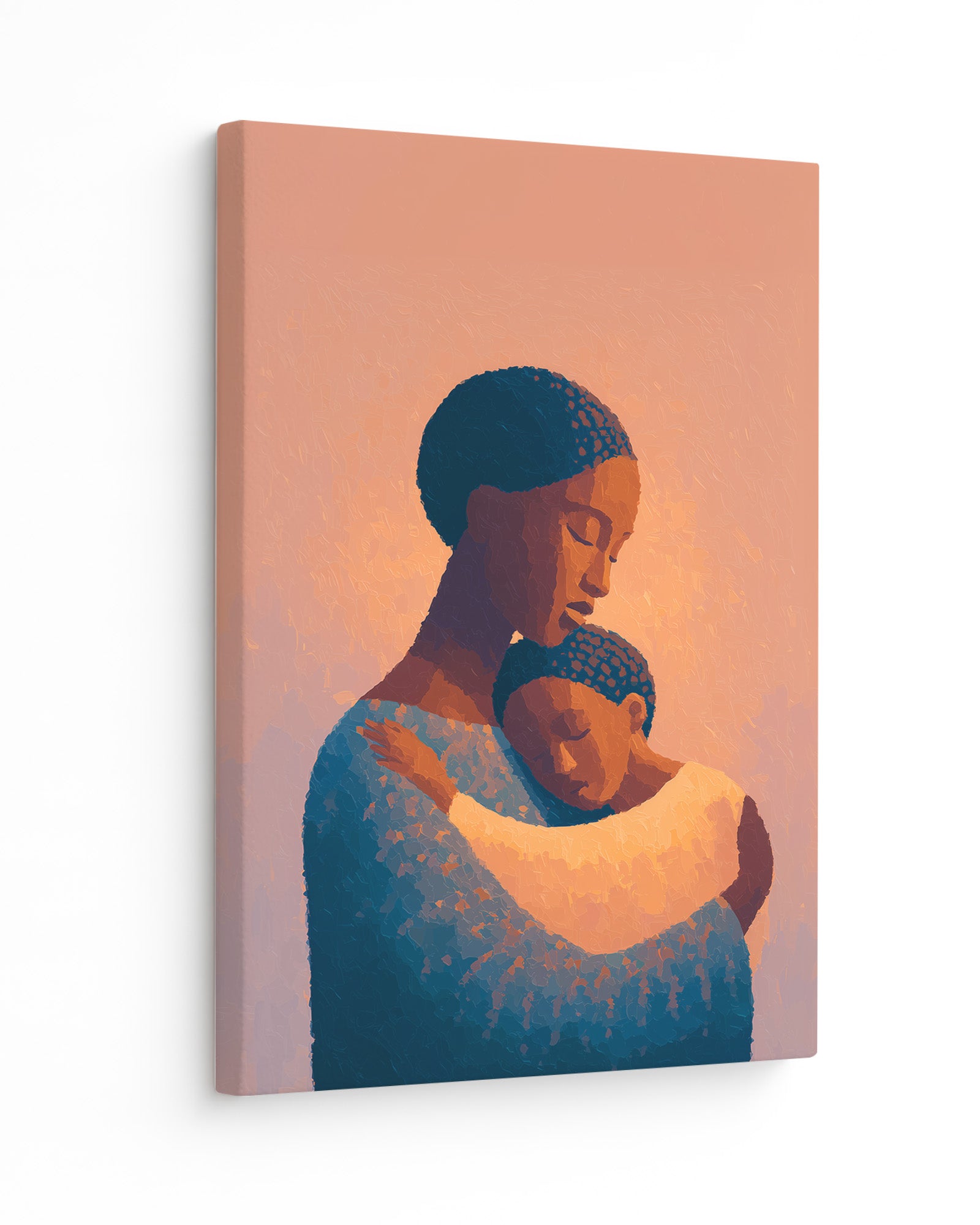 "African Motherhood Art: Contemporary Portraiture Celebrating Maternal Love and Generational Continuity" honors the sacred role of African mothers as keepers of cultural memory, nurturers of life, and transmitters of heritage through intimate figurative composition and symbolic color relationships. This stunning artwork depicts a mother and child rendered in profile in complementary teal and warm orange tones, creating visual harmony that suggests emotional and spiritual bond.