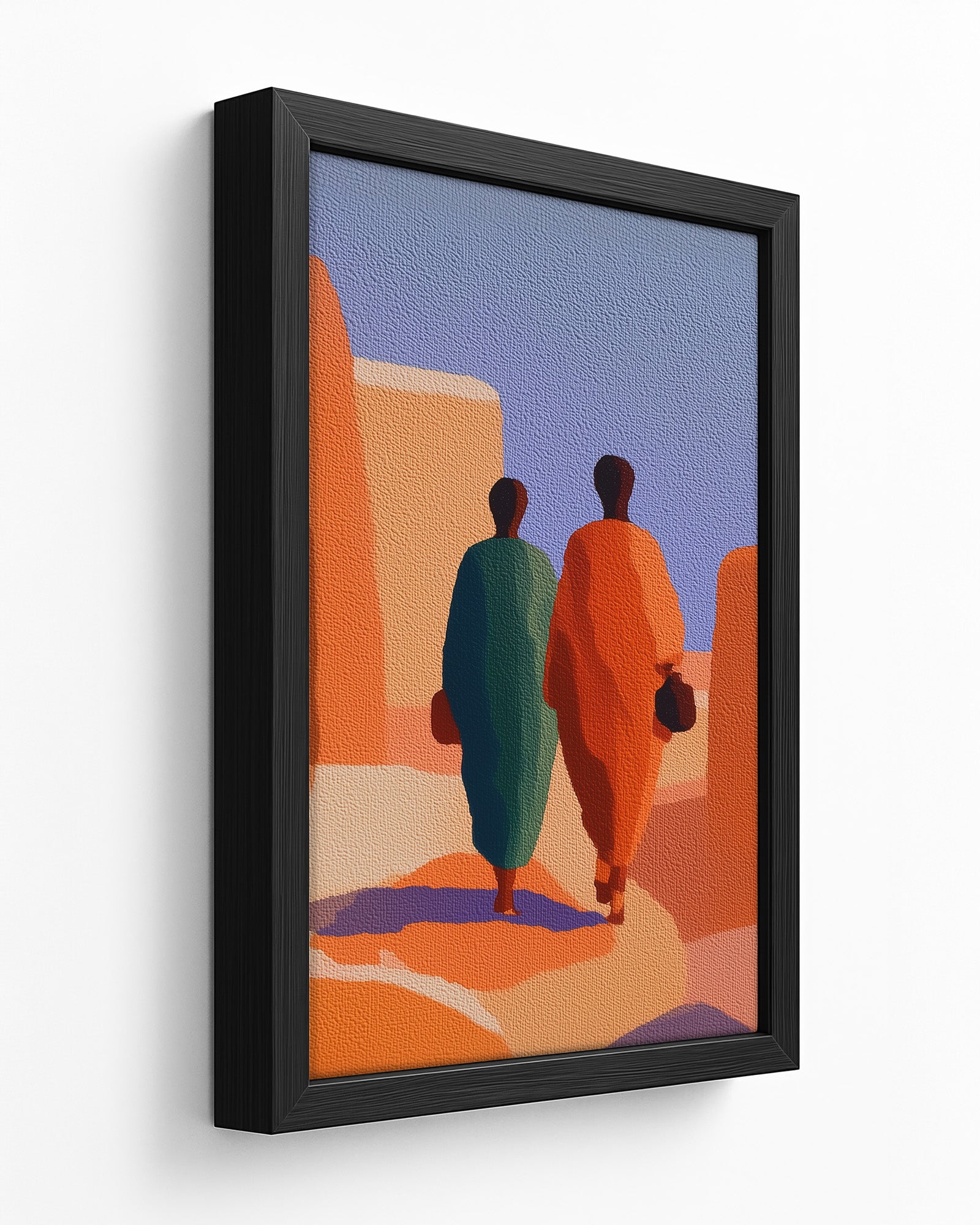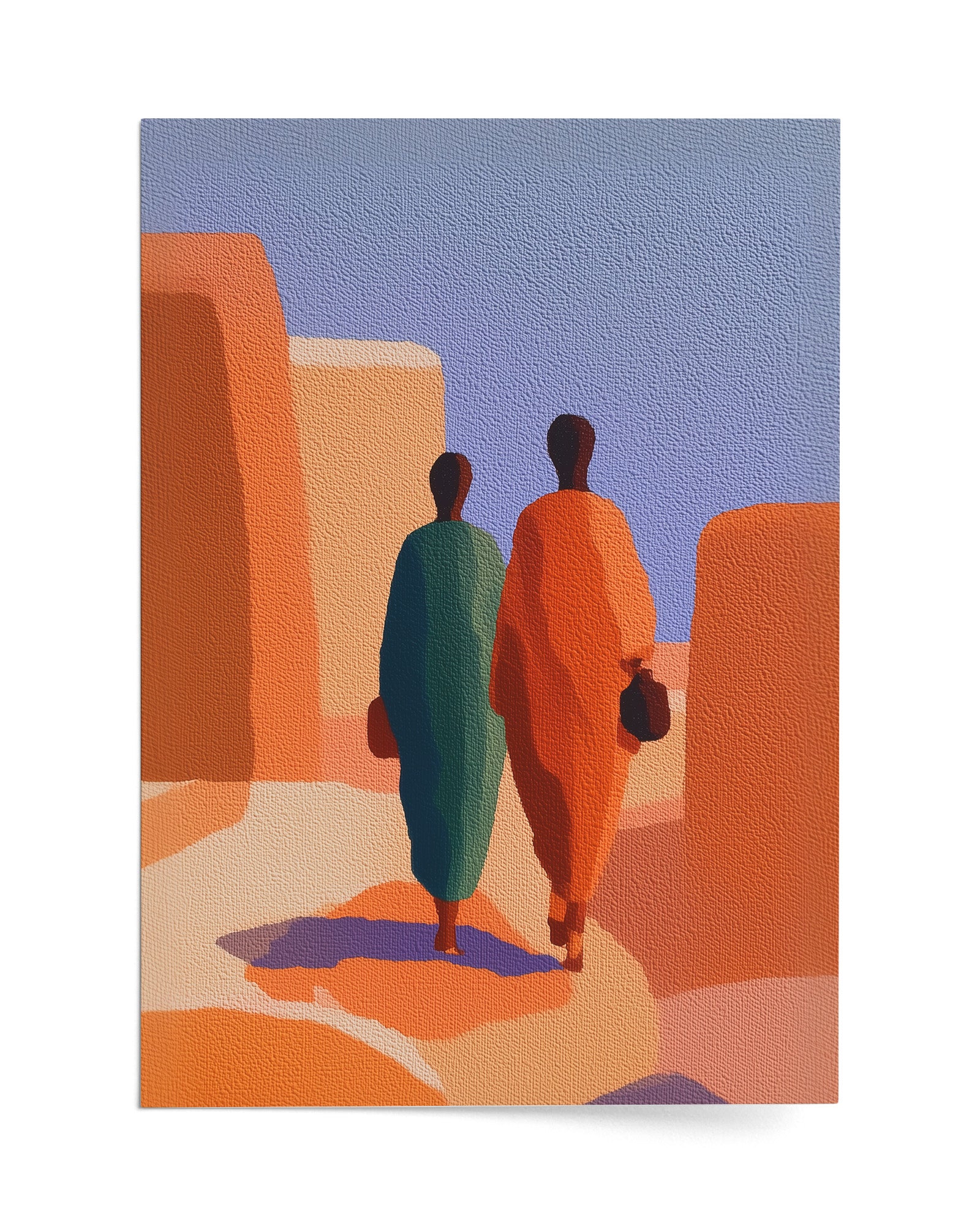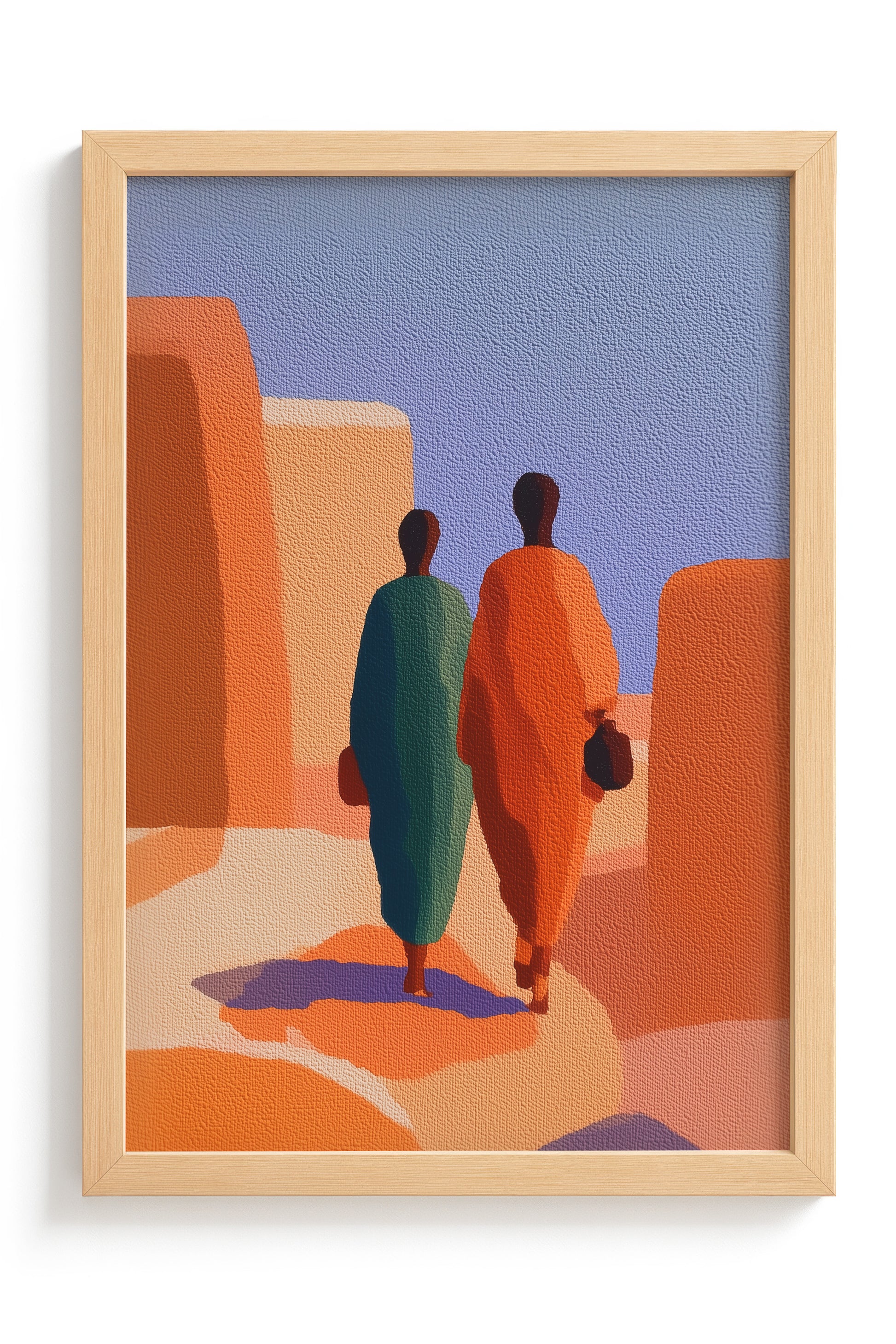 "Contemporary Ghanaian Art: Urban Figures and Modern Identity in Accra" explores the intersection of traditional Ghanaian cultural values with contemporary minimalist aesthetics through bold geometric composition and strategic color symbolism. This artwork features two figures rendered in striking complementary colors—deep teal and vibrant orange positioned within an architectural landscape that evokes ancient Ghanaian urban environments like Accra.