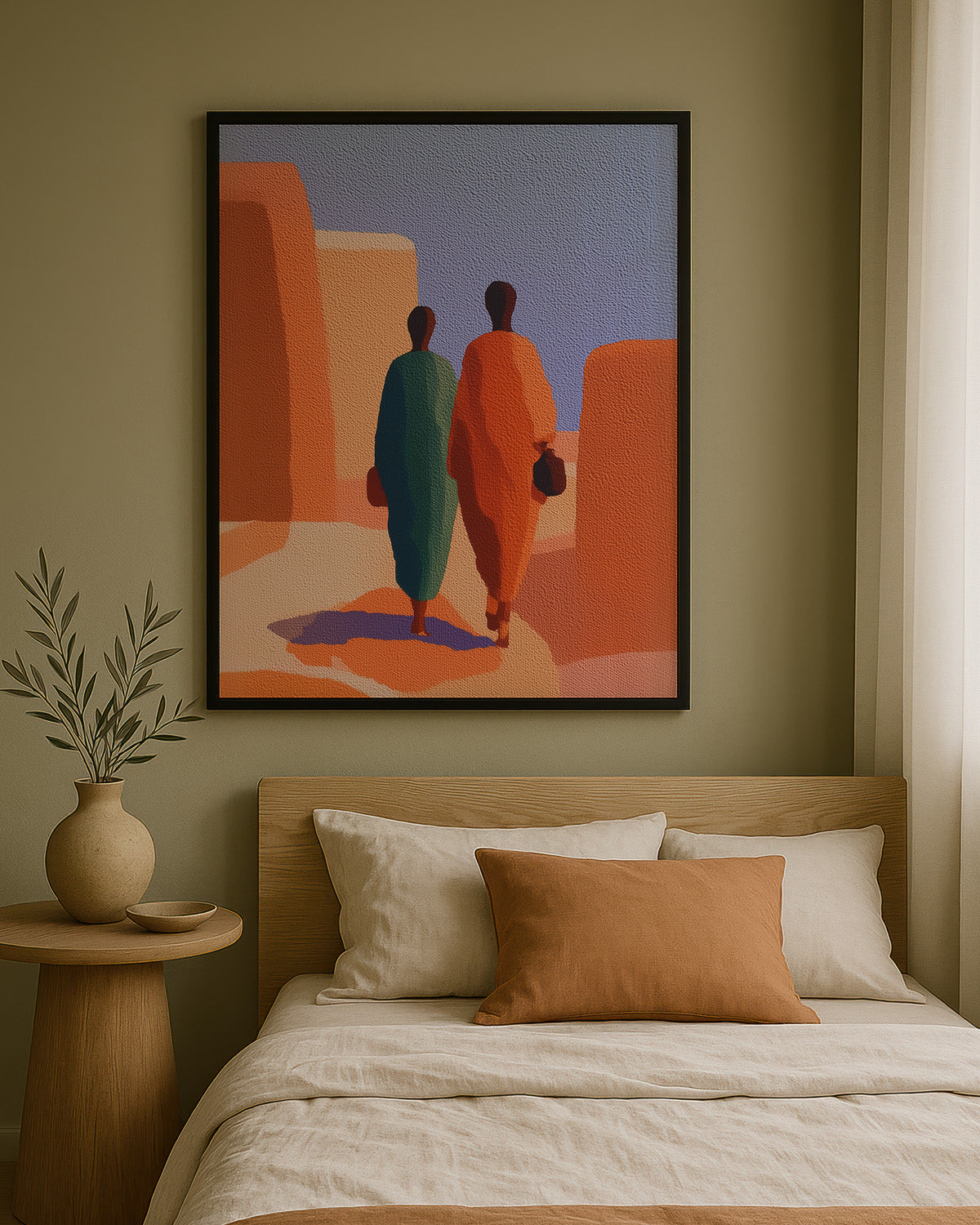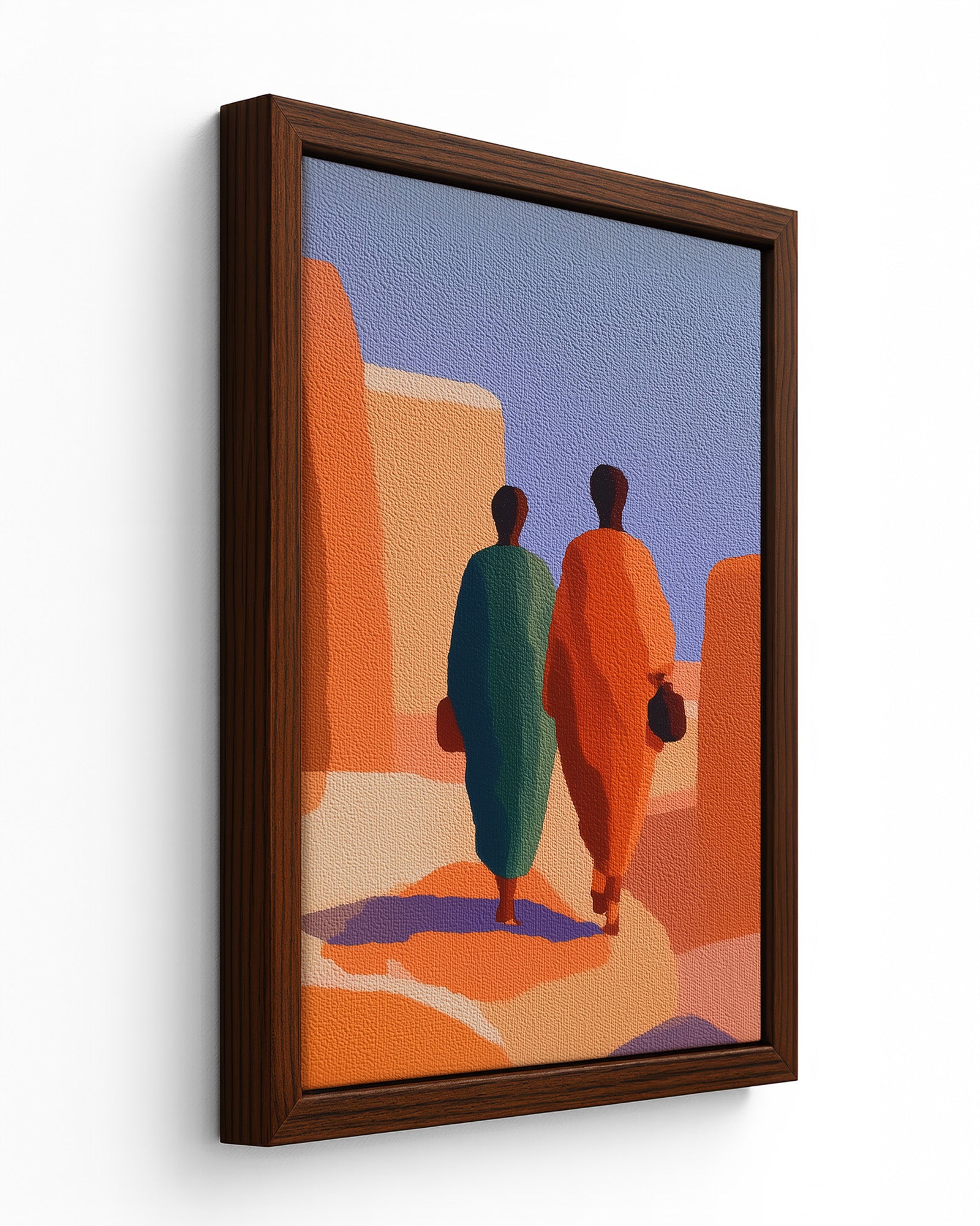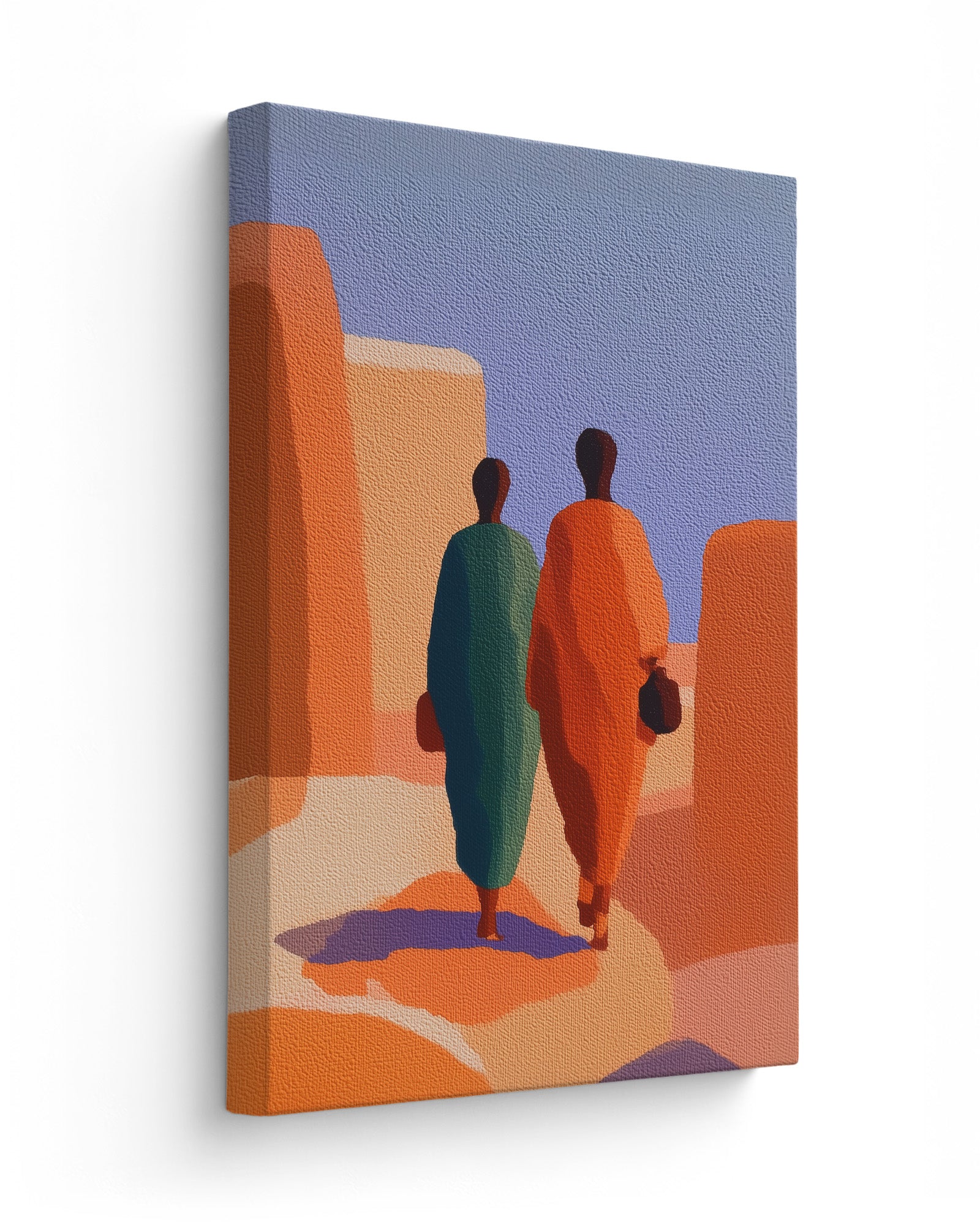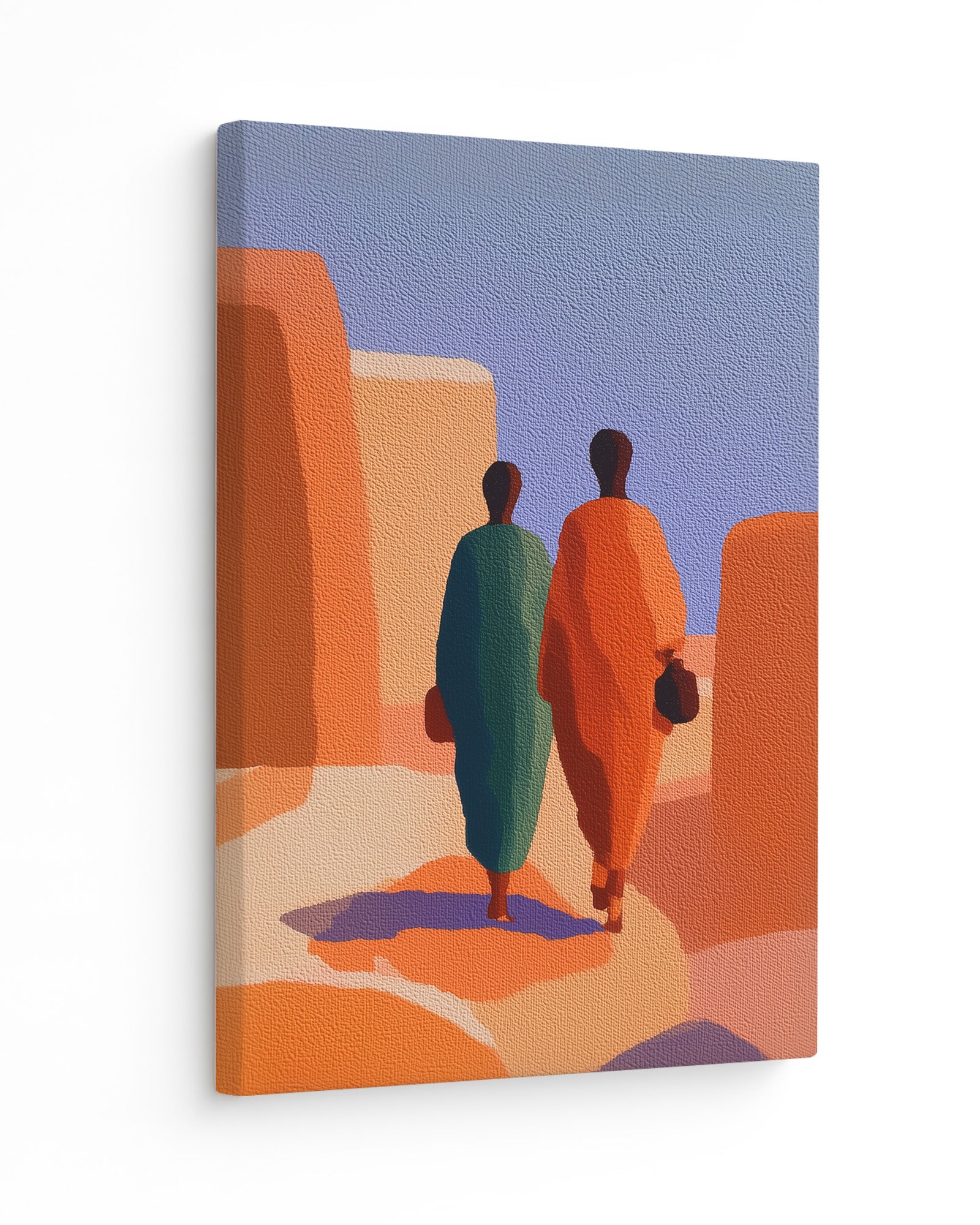 "Contemporary Ghanaian Art: Urban Figures and Modern Identity in Accra" explores the intersection of traditional Ghanaian cultural values with contemporary minimalist aesthetics through bold geometric composition and strategic color symbolism. This artwork features two figures rendered in striking complementary colors—deep teal and vibrant orange positioned within an architectural landscape that evokes ancient Ghanaian urban environments like Accra.