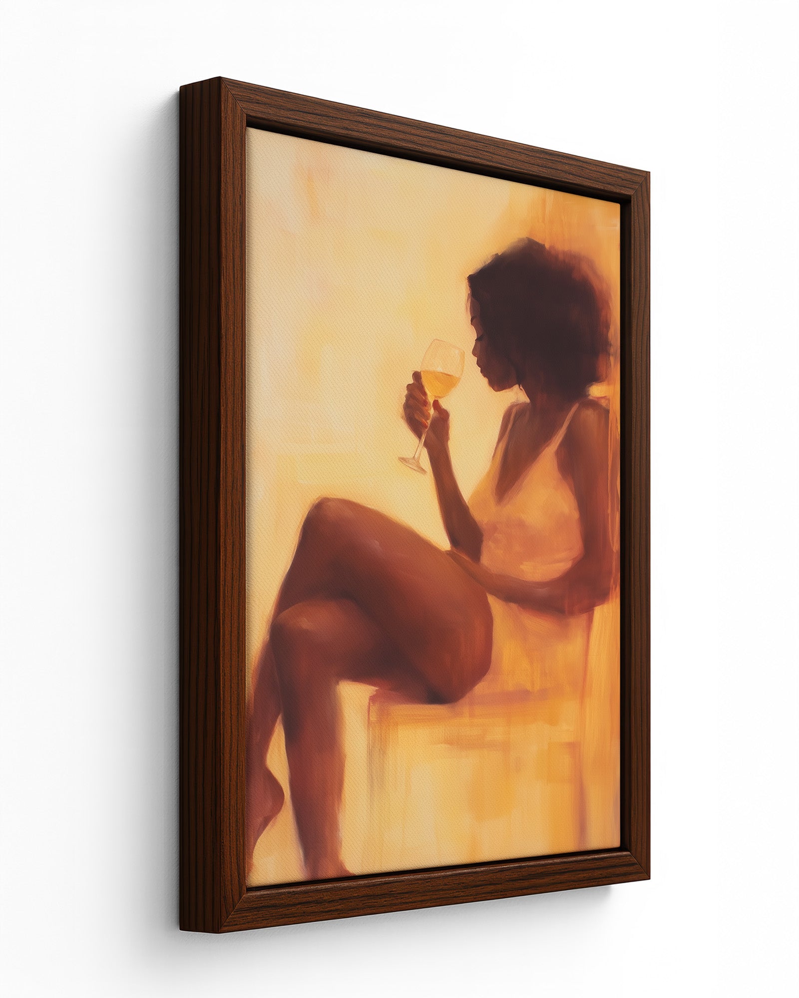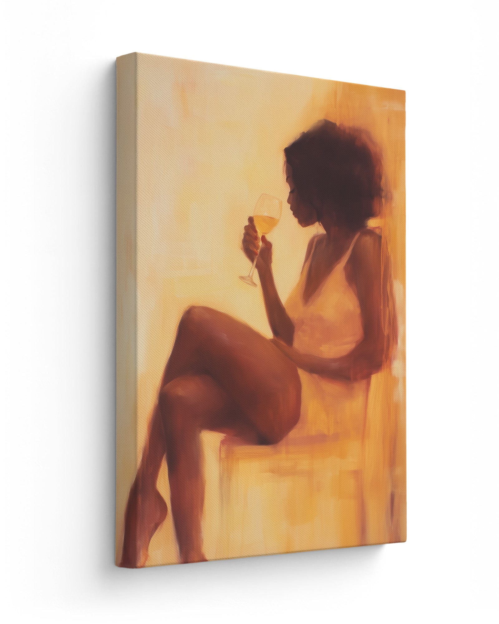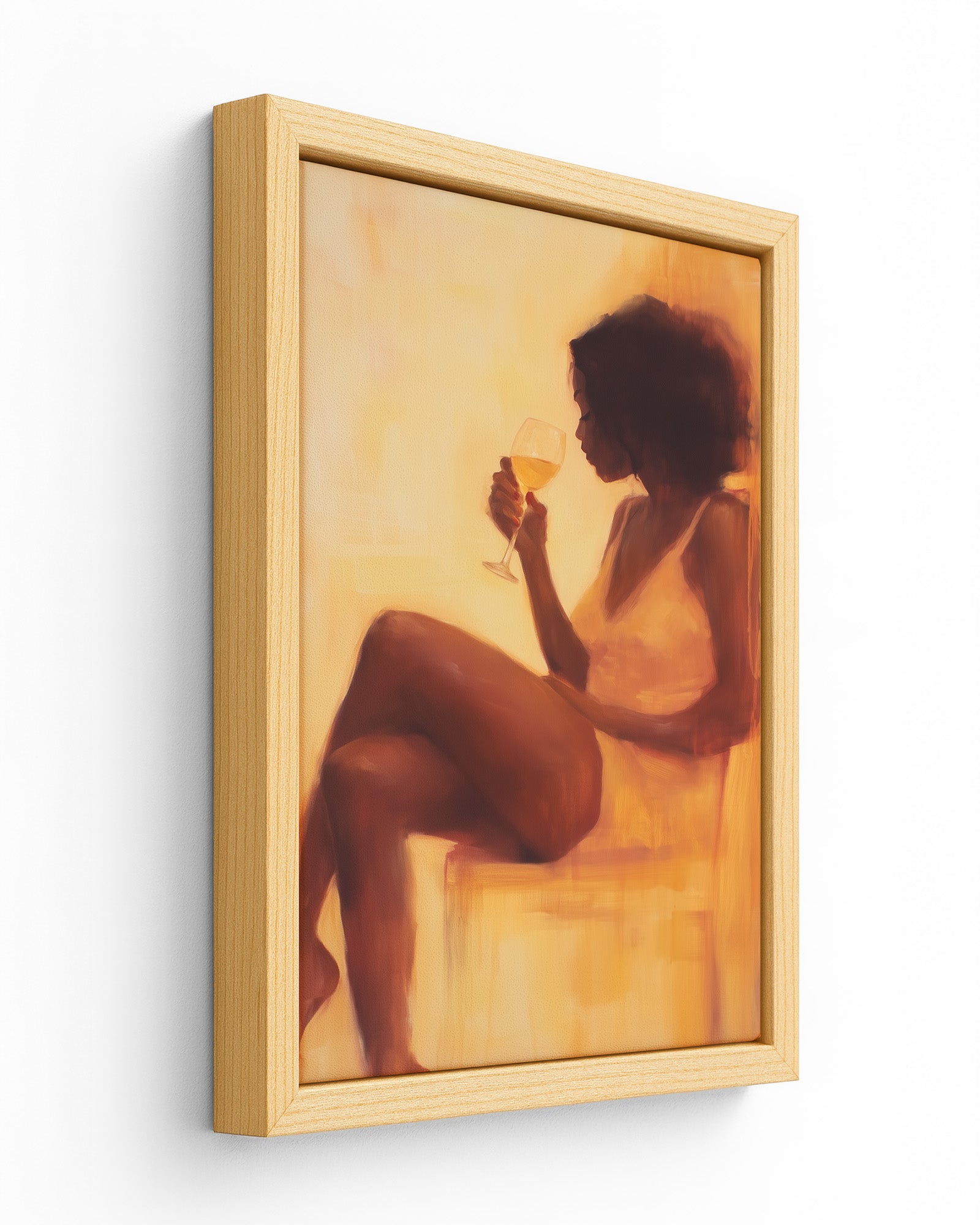 Bask in the warmth of quiet luxury with The Golden Sip, a soft and soulful oil-style artwork that captures the tranquil ritual of reflection. Painted in flowing amber hues and rich golden light, this piece portrays a woman in peaceful solitude, savouring a glass of wine in a moment of meditative calm.