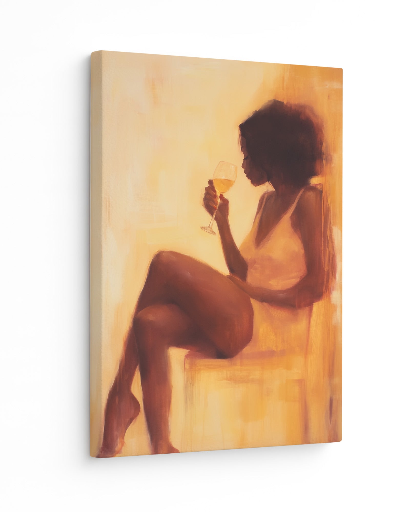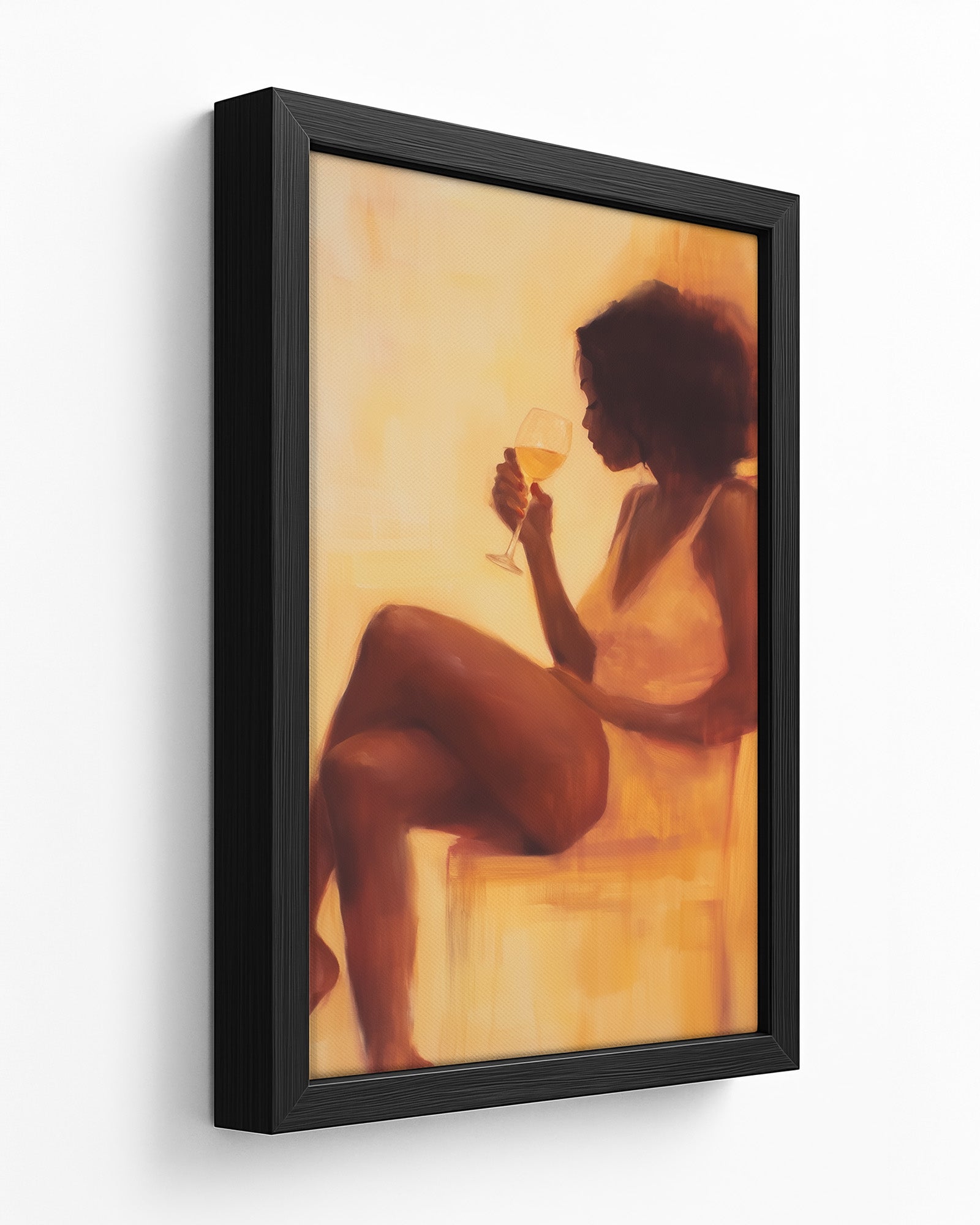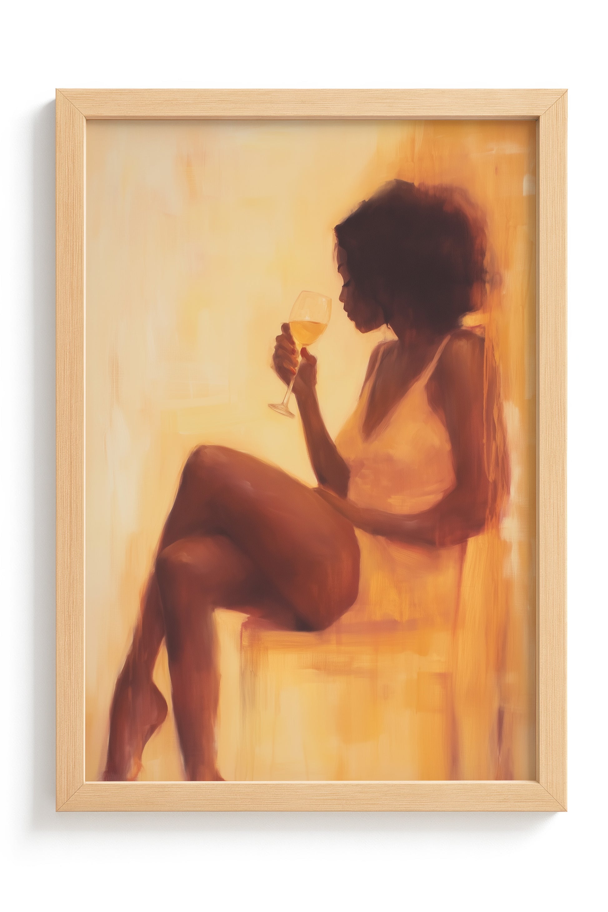 Bask in the warmth of quiet luxury with The Golden Sip, a soft and soulful oil-style artwork that captures the tranquil ritual of reflection. Painted in flowing amber hues and rich golden light, this piece portrays a woman in peaceful solitude, savouring a glass of wine in a moment of meditative calm.