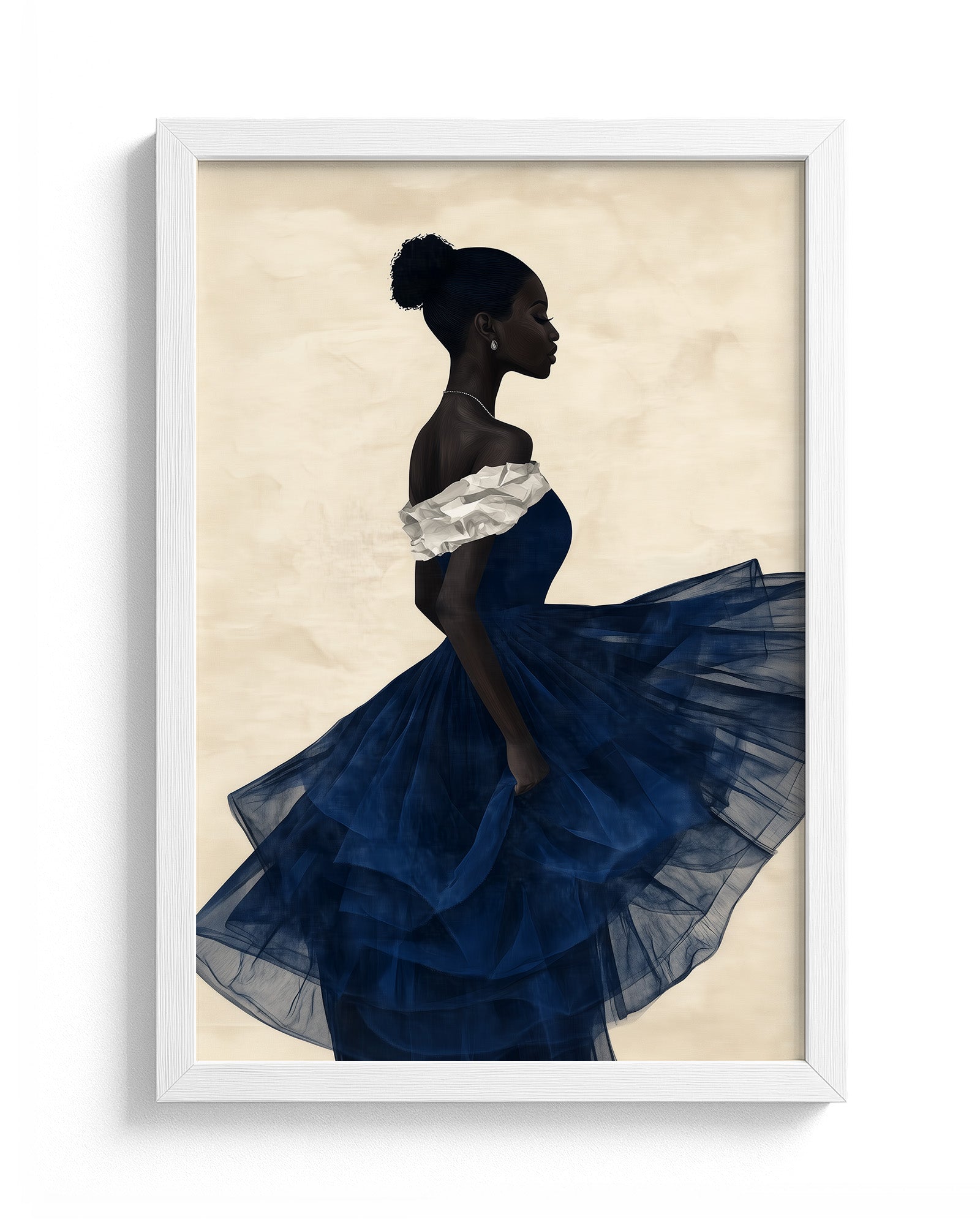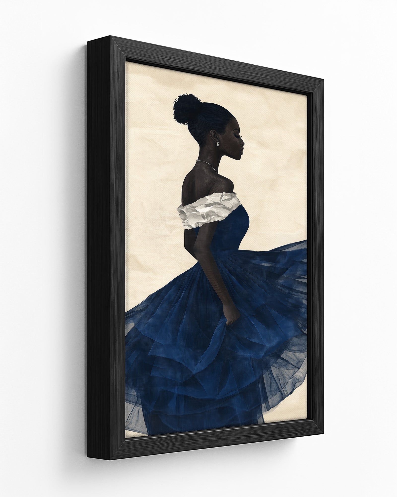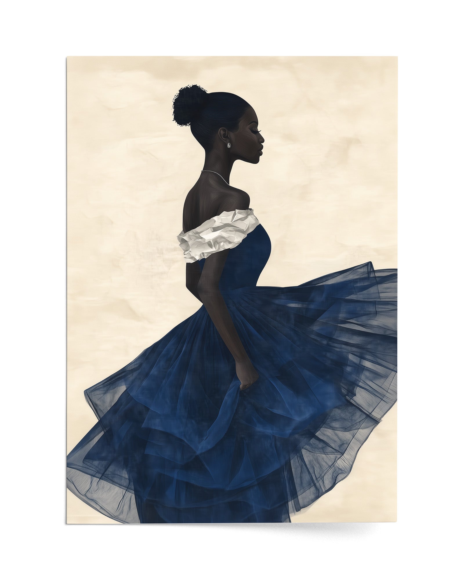 Indigo Muse: A graceful African woman in a flowing dress, her attire layered with soft indigo and white papers. Her dark skin and elegant bun stand out against a textured beige background, creating a stunning minimalist collage.