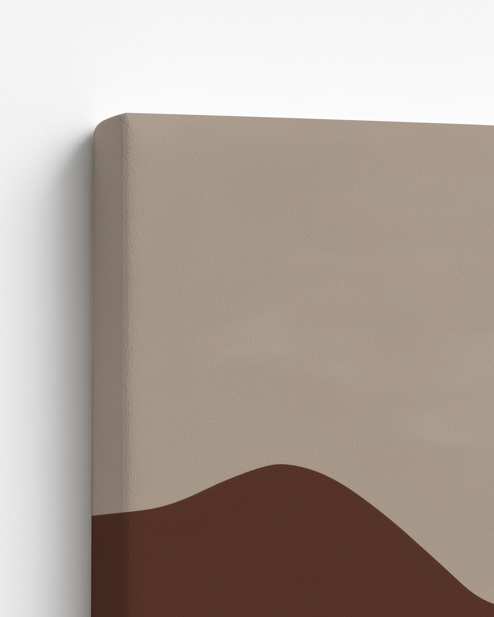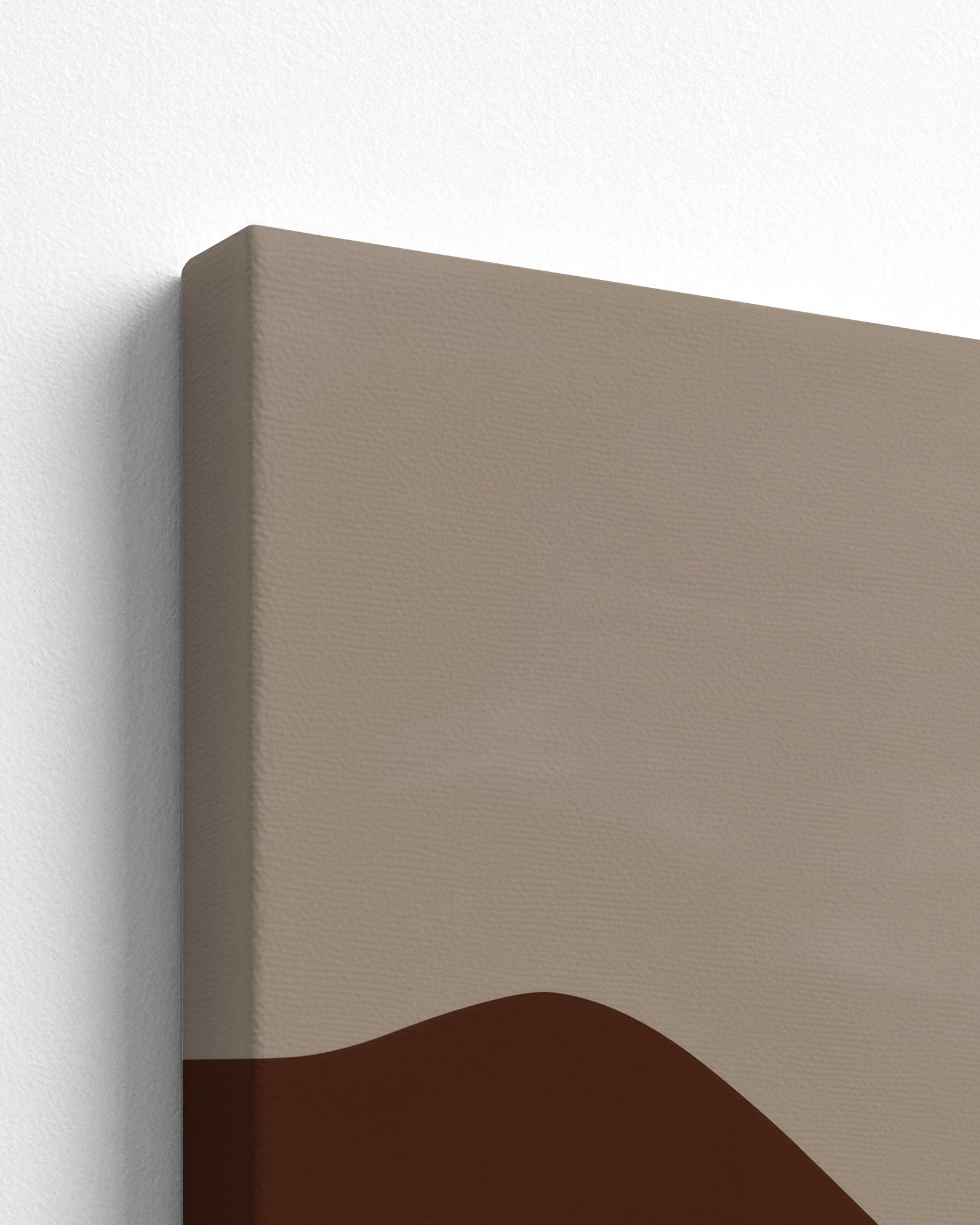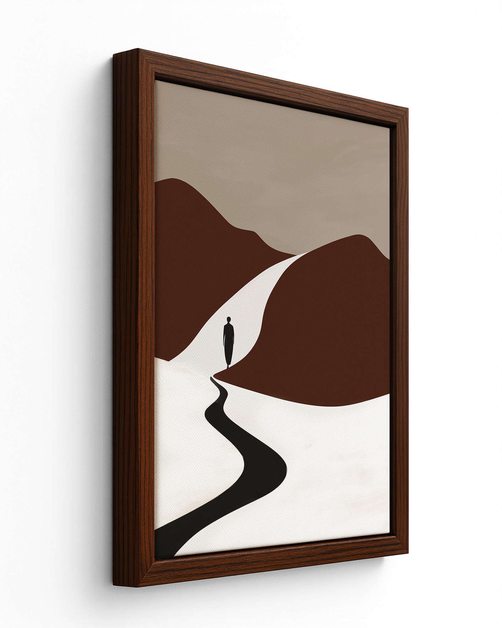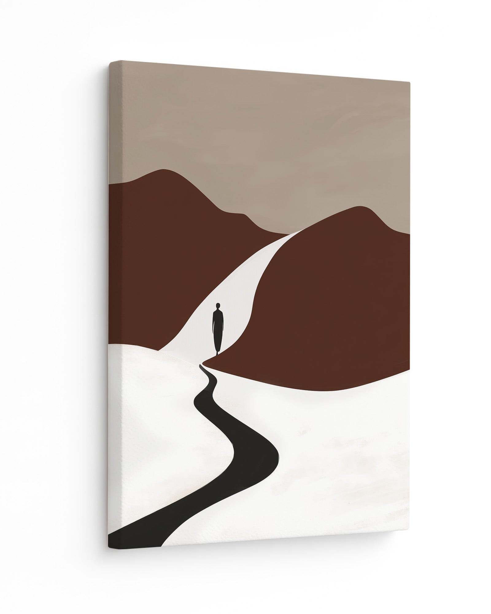 A minimalist cultural artwork featuring a solitary figure walking a winding path between warm-toned mountains. This piece captures the inner journey, evoking resilience, solitude, and reflection. Earthy browns and muted cream tones create a calm, grounded atmosphere — perfect for spaces that invite stillness and growth.