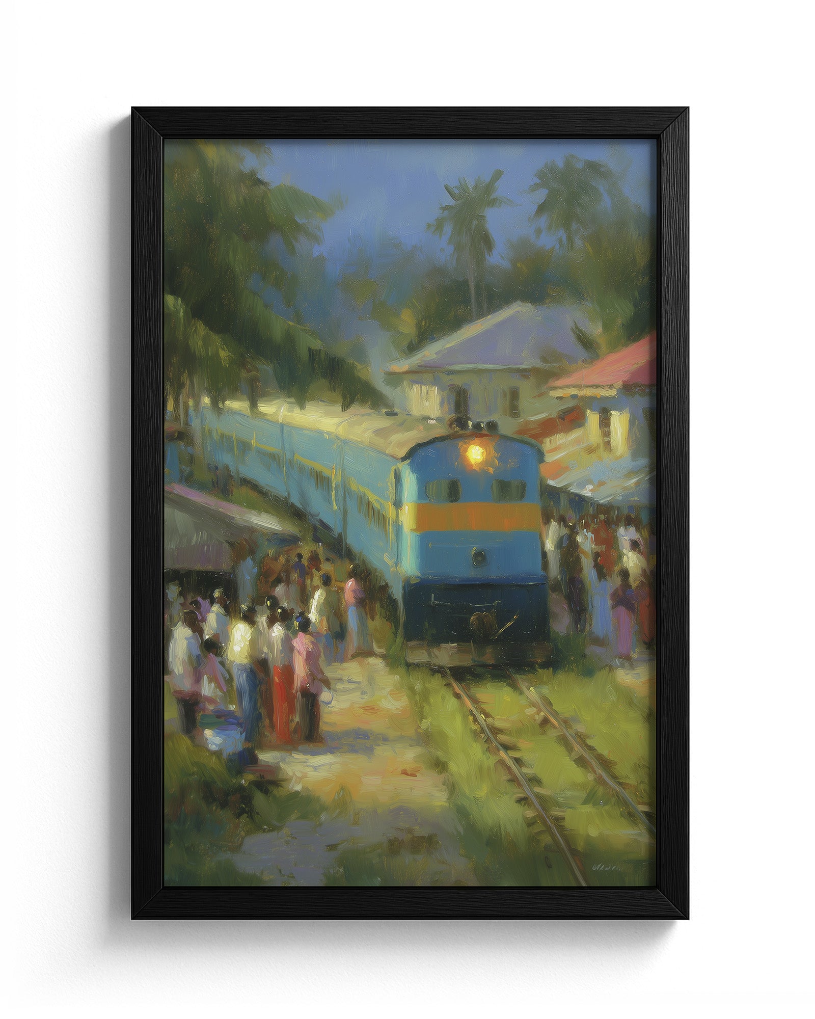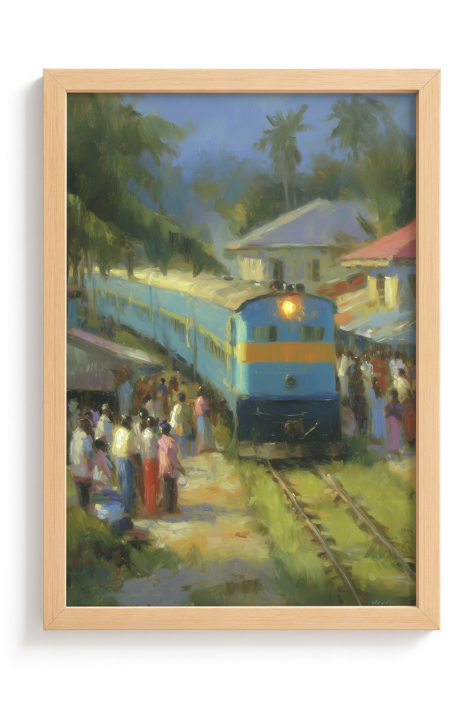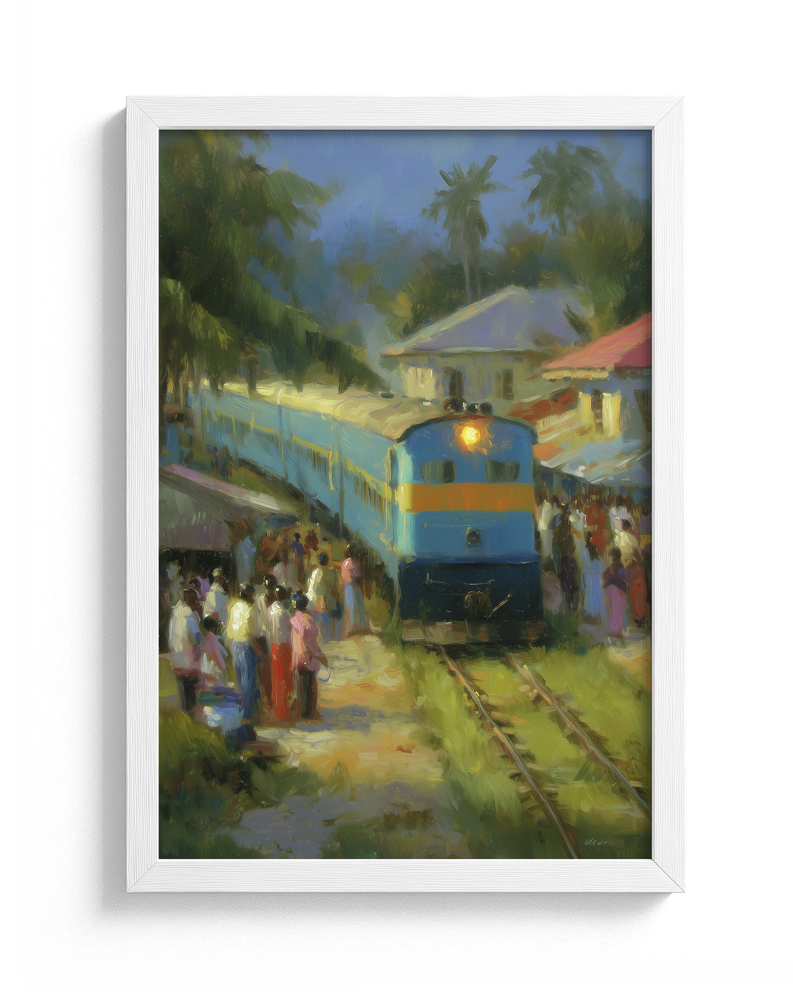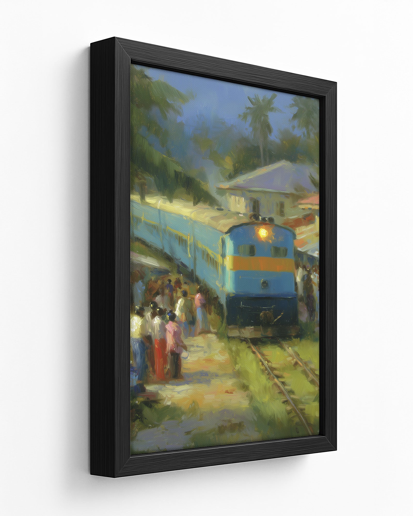 The Kasai Line Brings Them Home: Art on Congo's Interior Railway, Diasporic Return, and the Sacred Moment When Kinshasa's Scattered Children Come Back to Kasai's Heart. This striking composition captures a train on the Kasai railway line arriving at a rural station deep in Congo's interior, revealing how the rails that connect the capital to the interior regions become pathways through which the diaspora returns to ancestral ground.