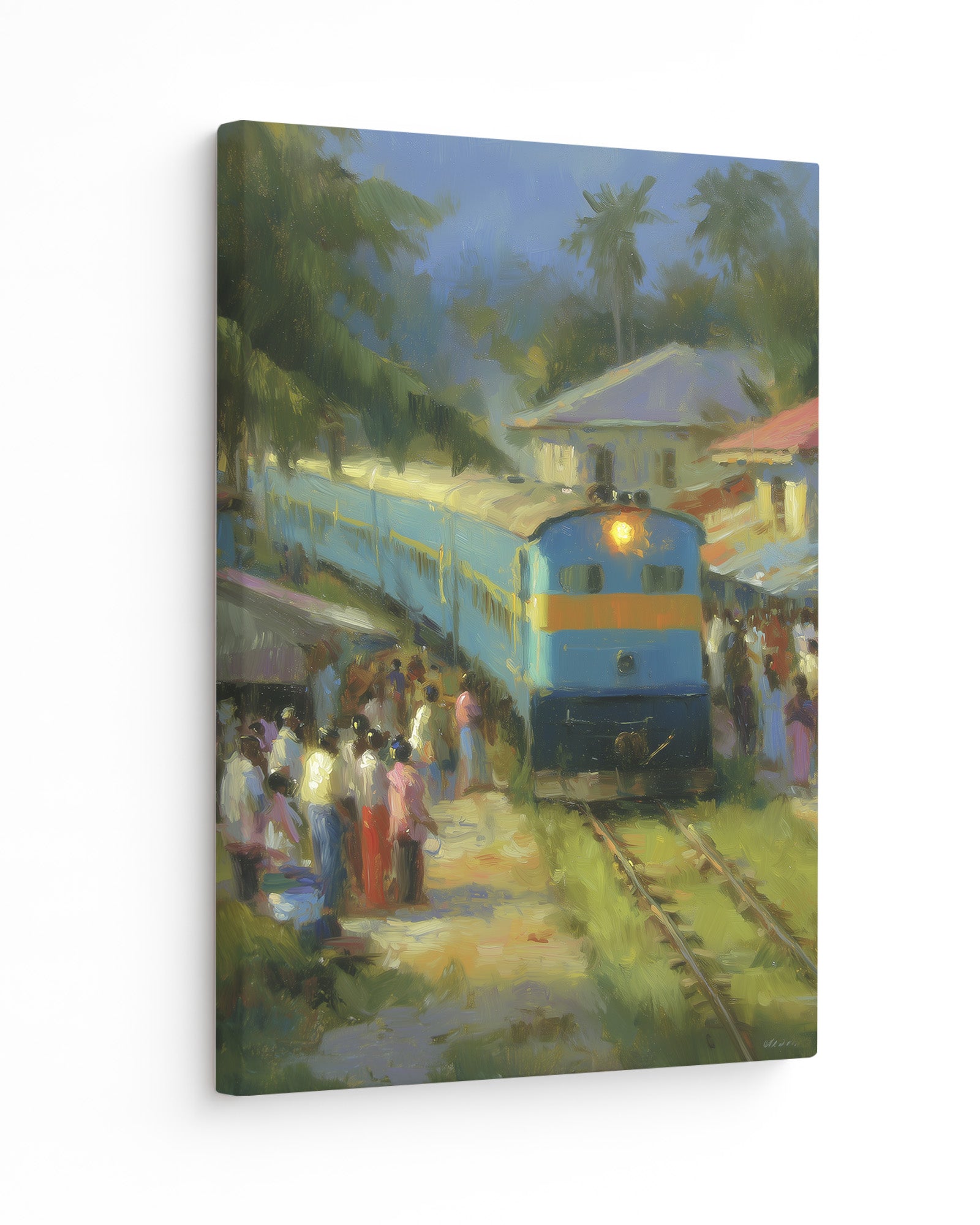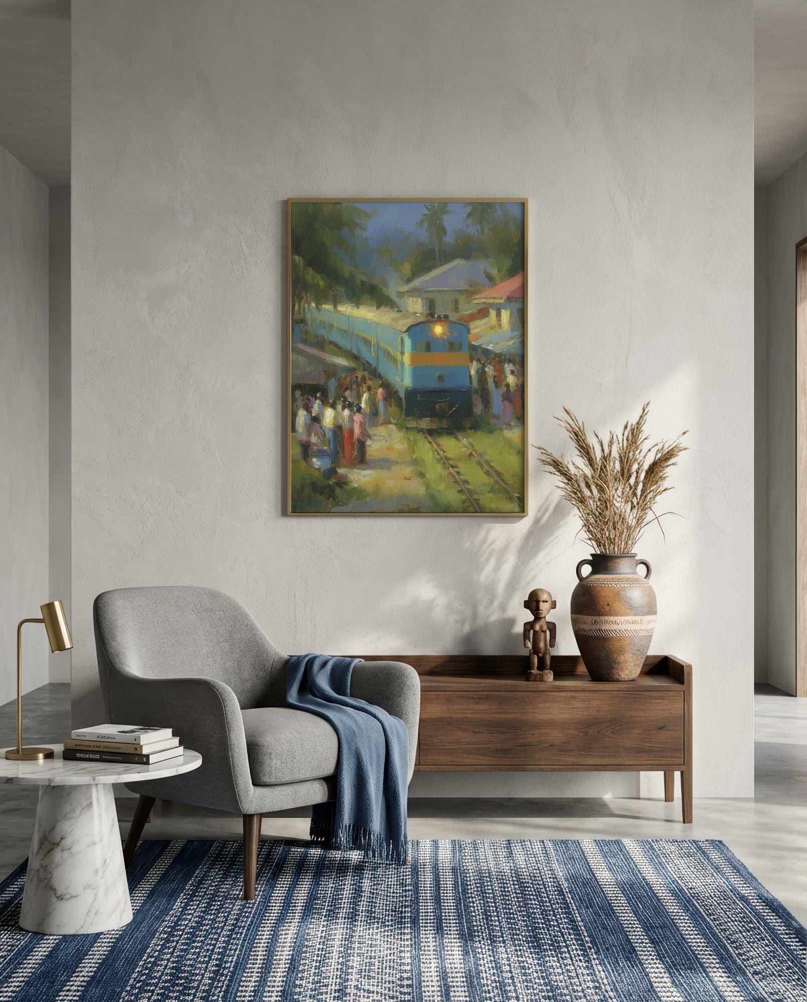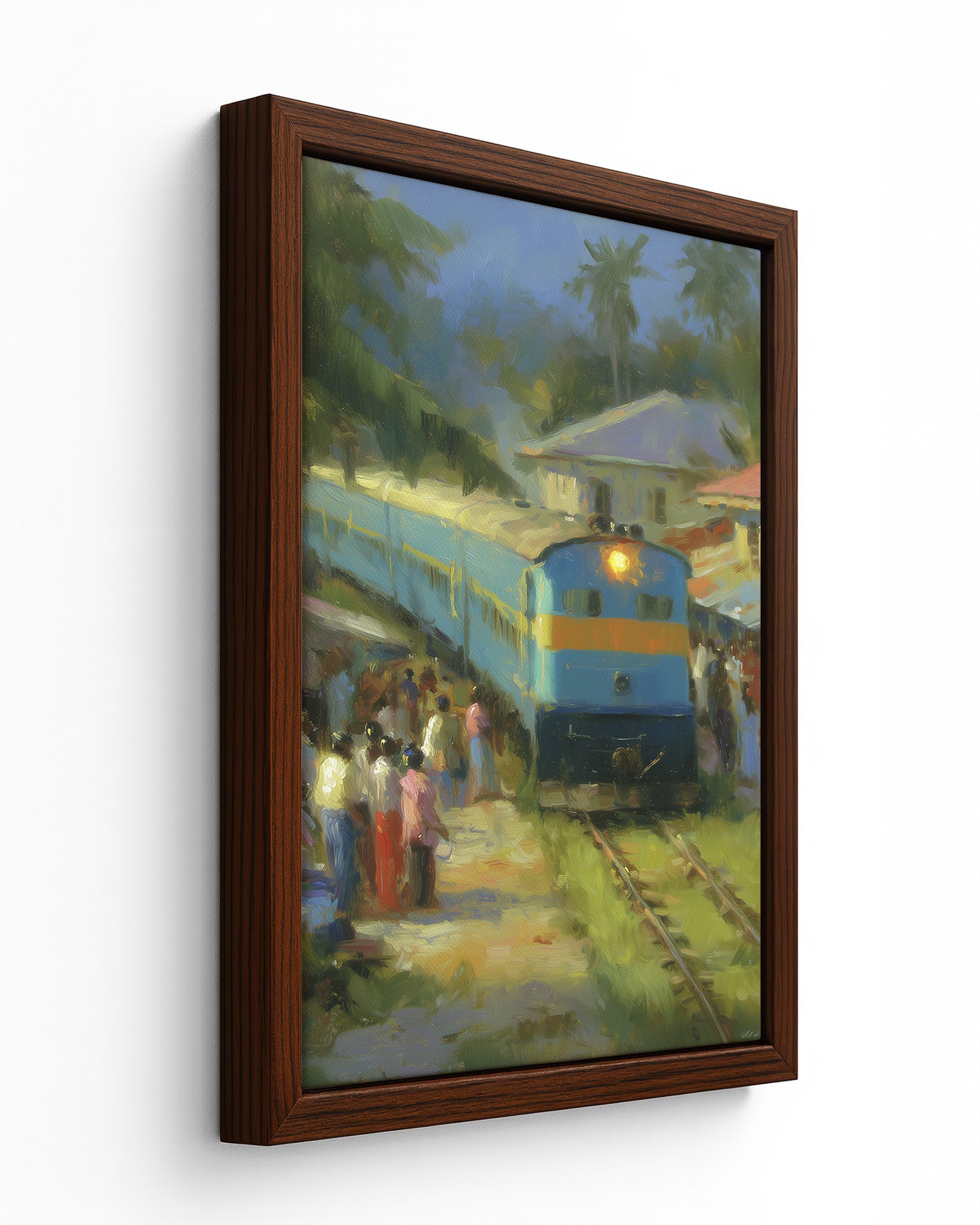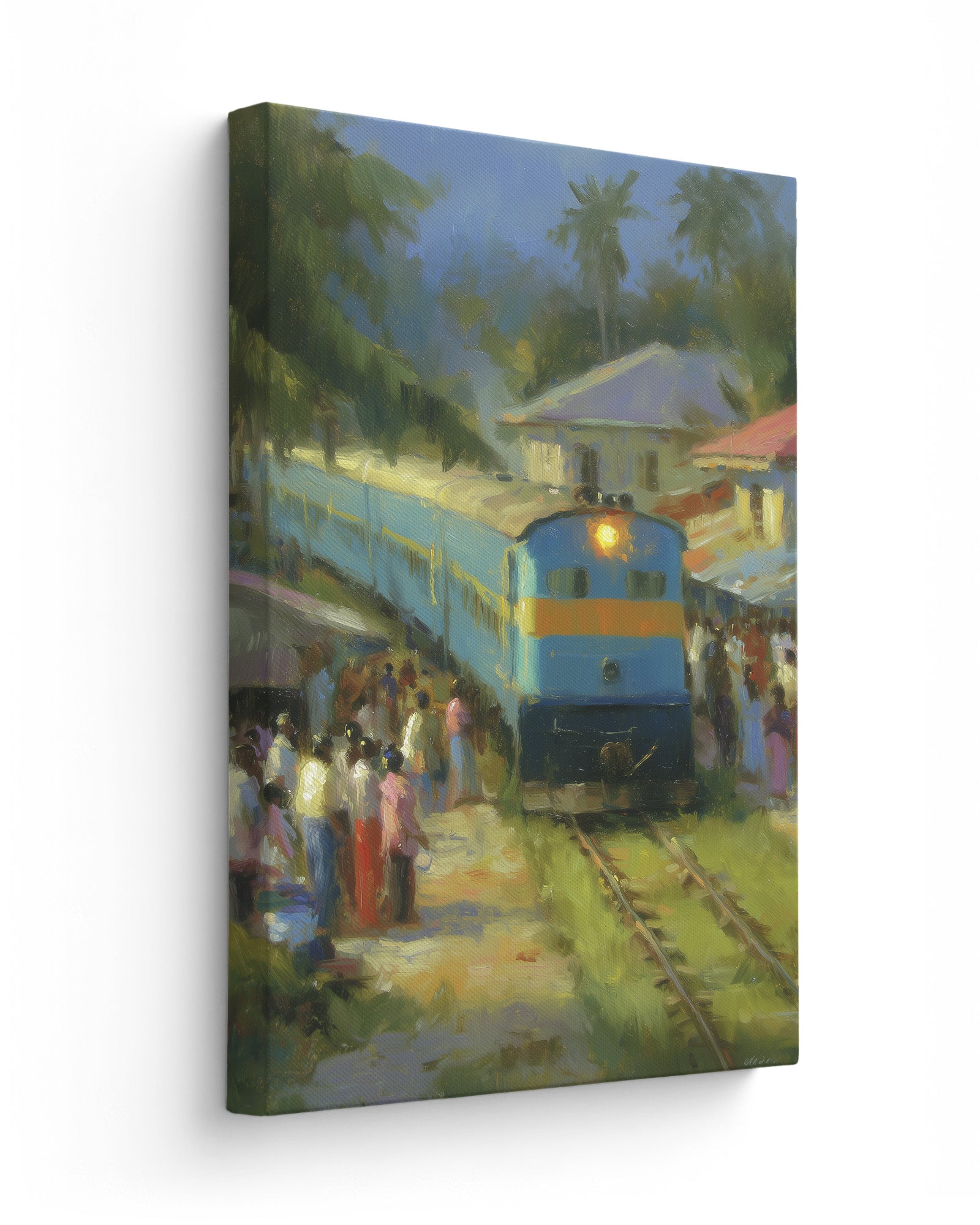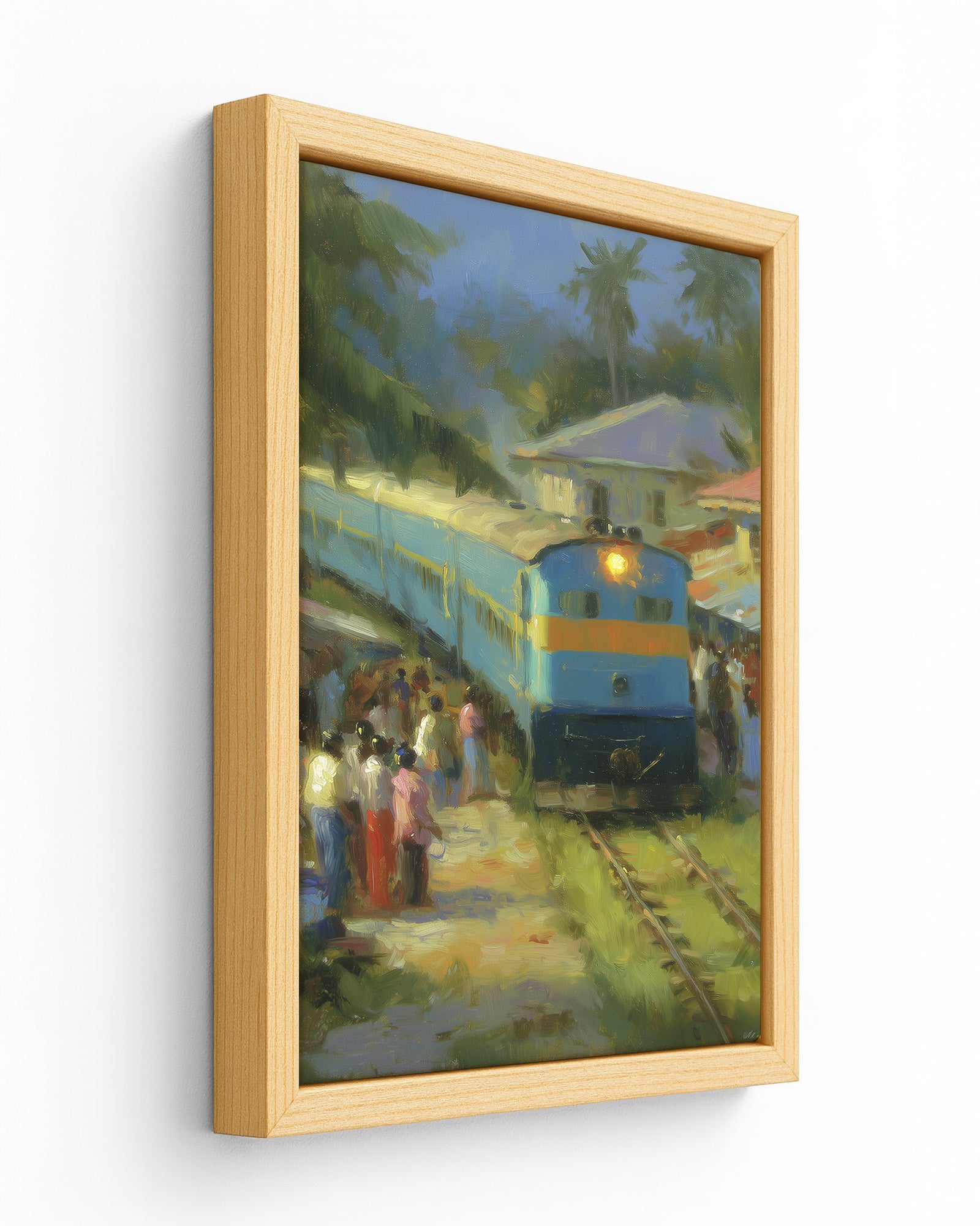 The Kasai Line Brings Them Home: Art on Congo's Interior Railway, Diasporic Return, and the Sacred Moment When Kinshasa's Scattered Children Come Back to Kasai's Heart. This striking composition captures a train on the Kasai railway line arriving at a rural station deep in Congo's interior, revealing how the rails that connect the capital to the interior regions become pathways through which the diaspora returns to ancestral ground.