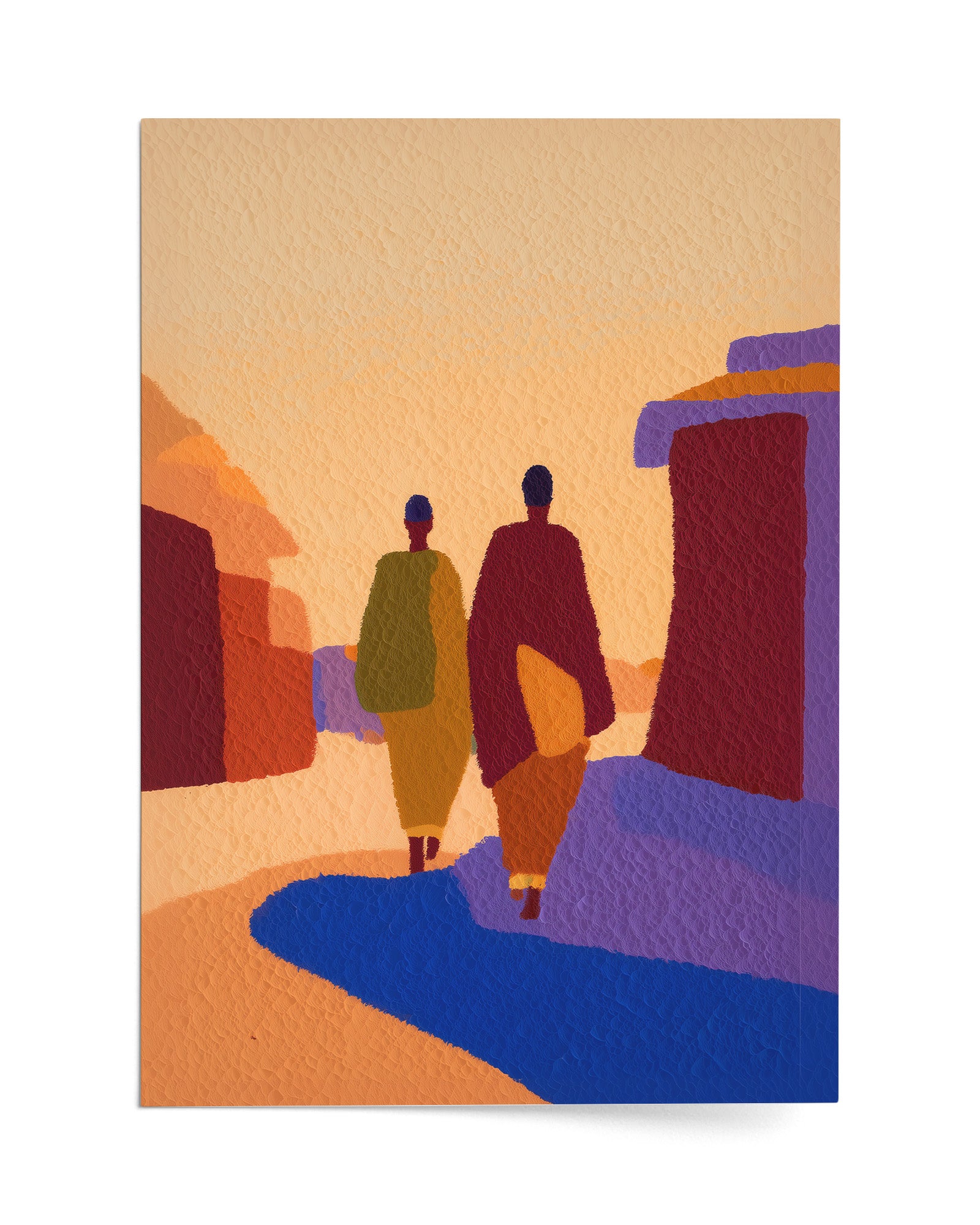 Through a sophisticated interplay of warm and cool tones, this work presents urban space as a vehicle for personal and collective transformation. The two figures move with quiet determination through an architectural passage that feels both monumental and intimate.