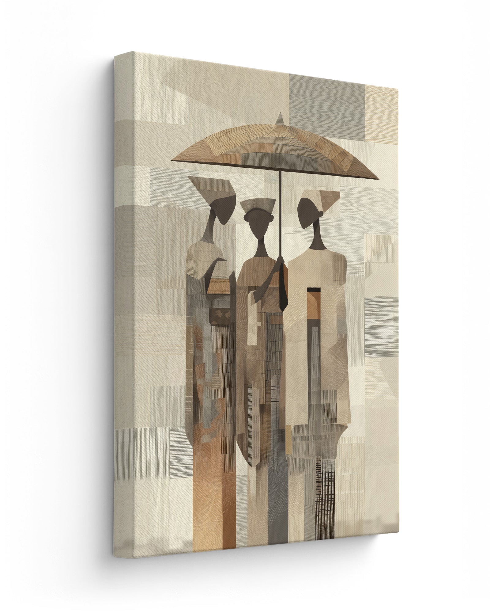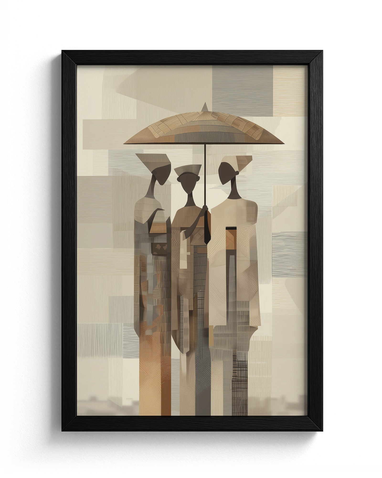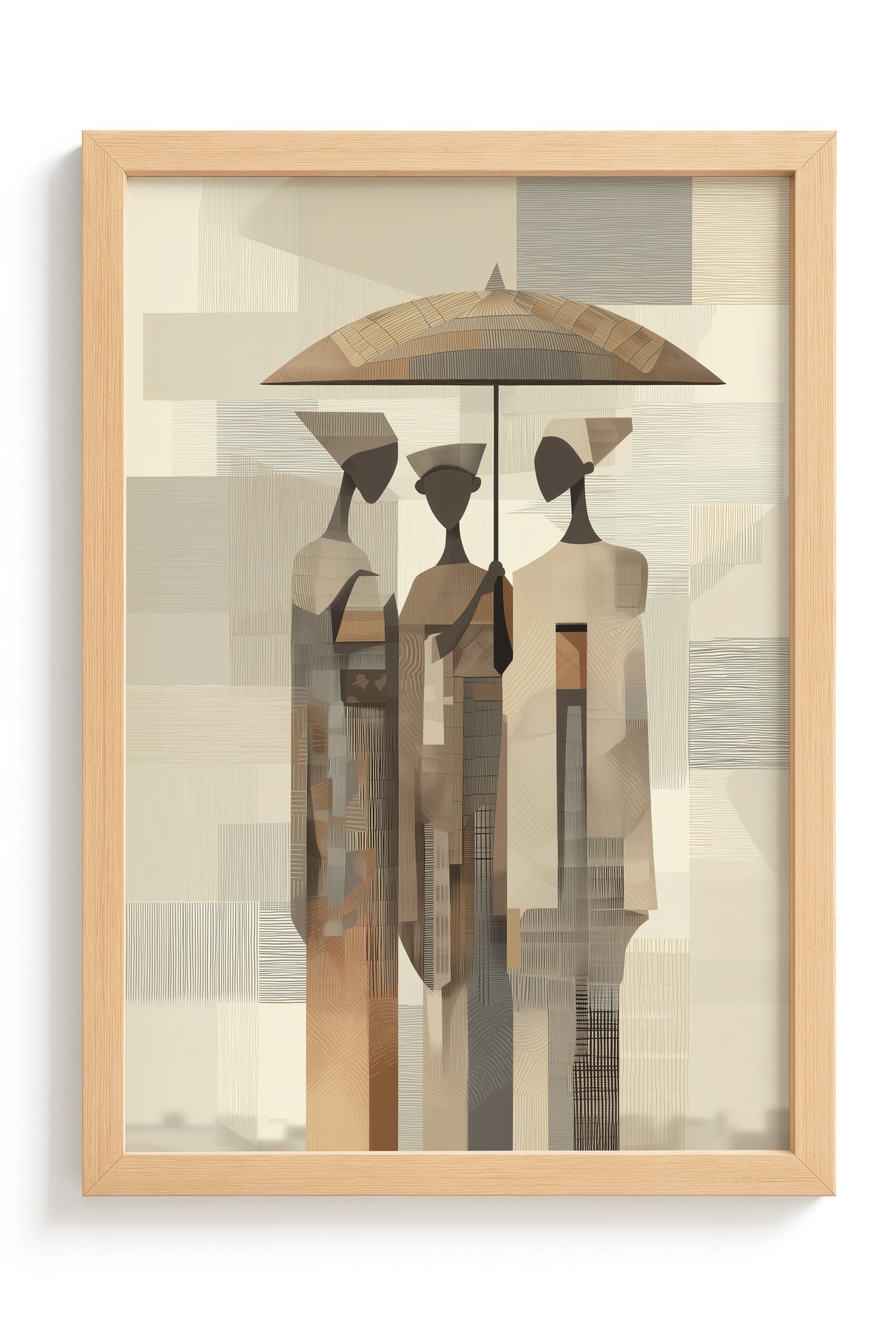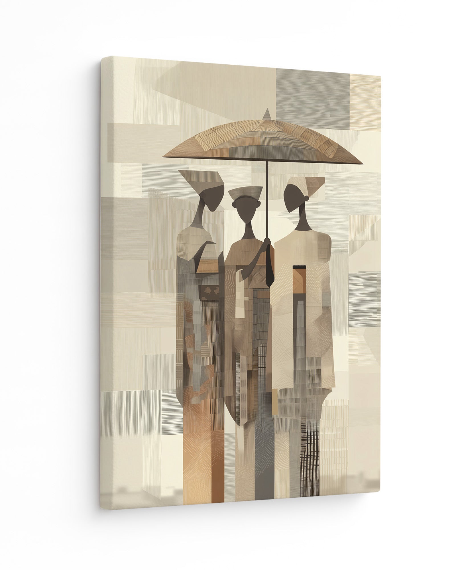 A minimalistic African silhouette artwork depicting three women in traditional attire standing beneath a woven umbrella. Rendered in muted tones of beige, taupe, ivory, and stone grey, the piece blends cultural symbolism with modern abstraction. The umbrella, textured in sand and cream, symbolises protection and unity, while the geometric background adds depth to the earthy composition.
