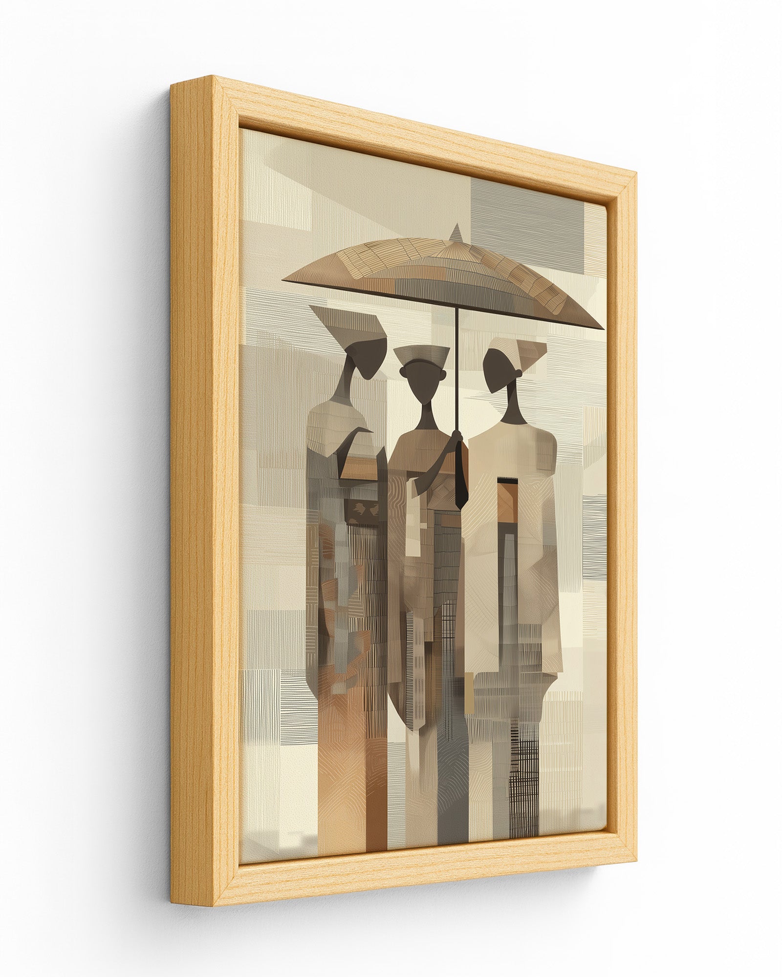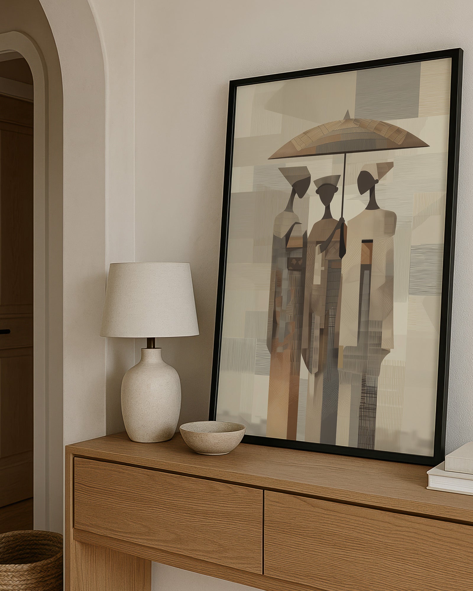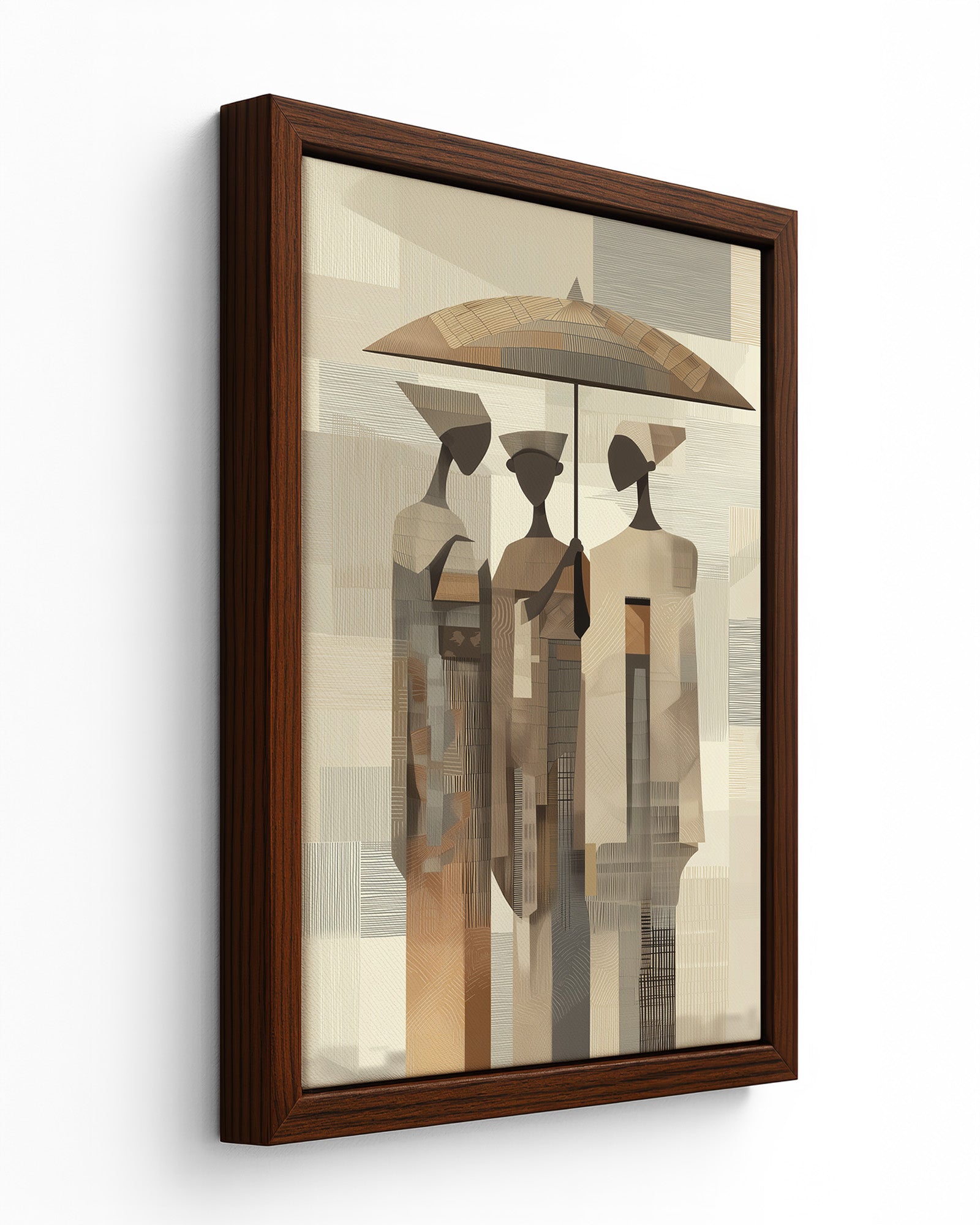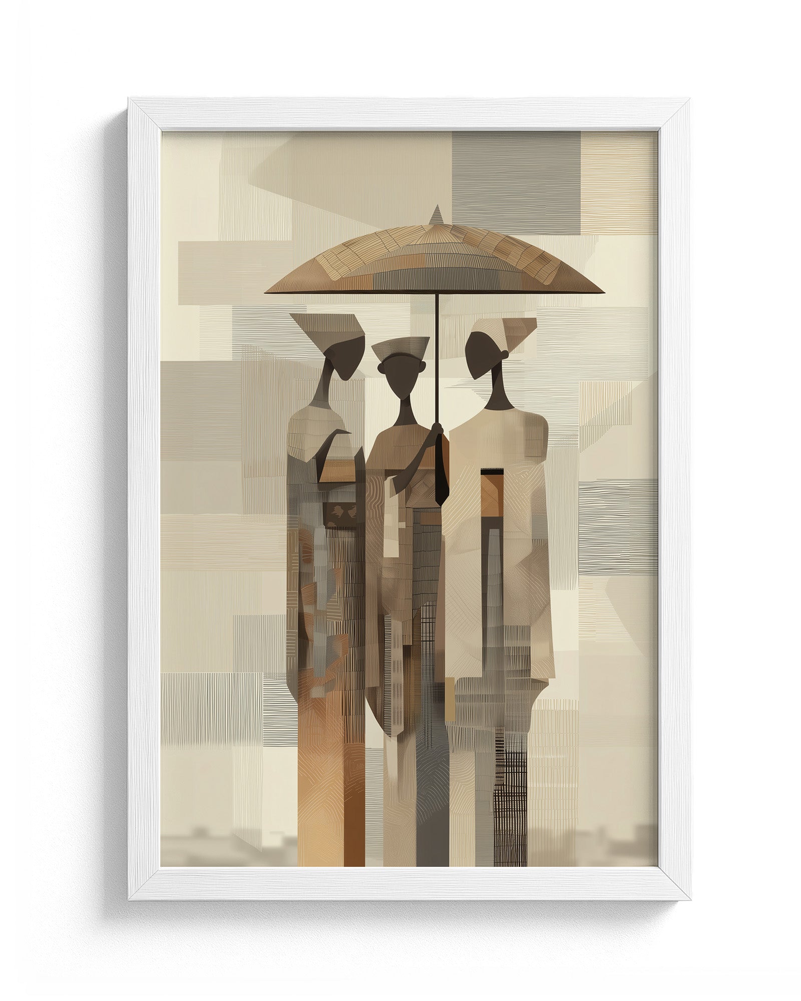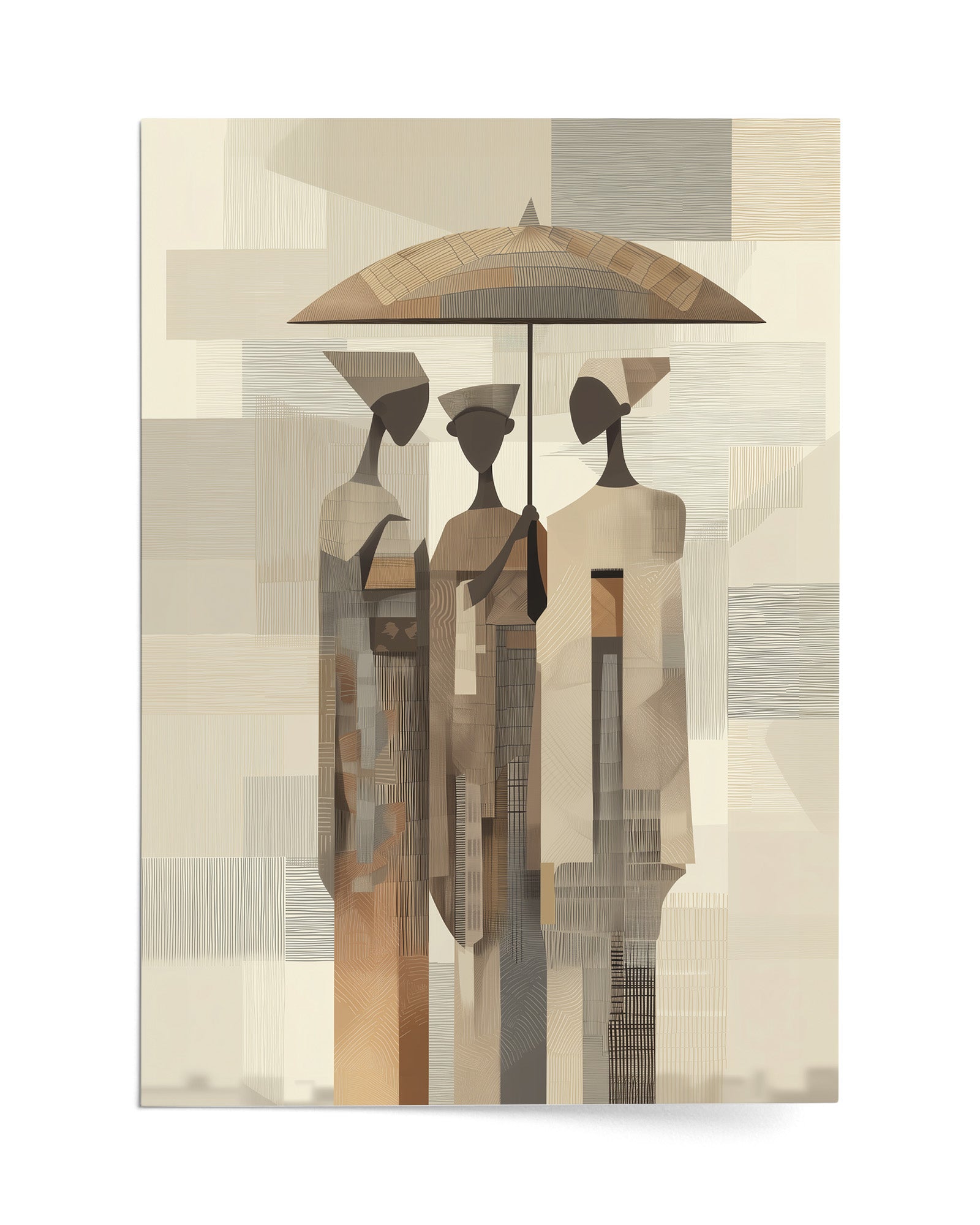 A minimalistic African silhouette artwork depicting three women in traditional attire standing beneath a woven umbrella. Rendered in muted tones of beige, taupe, ivory, and stone grey, the piece blends cultural symbolism with modern abstraction. The umbrella, textured in sand and cream, symbolises protection and unity, while the geometric background adds depth to the earthy composition.