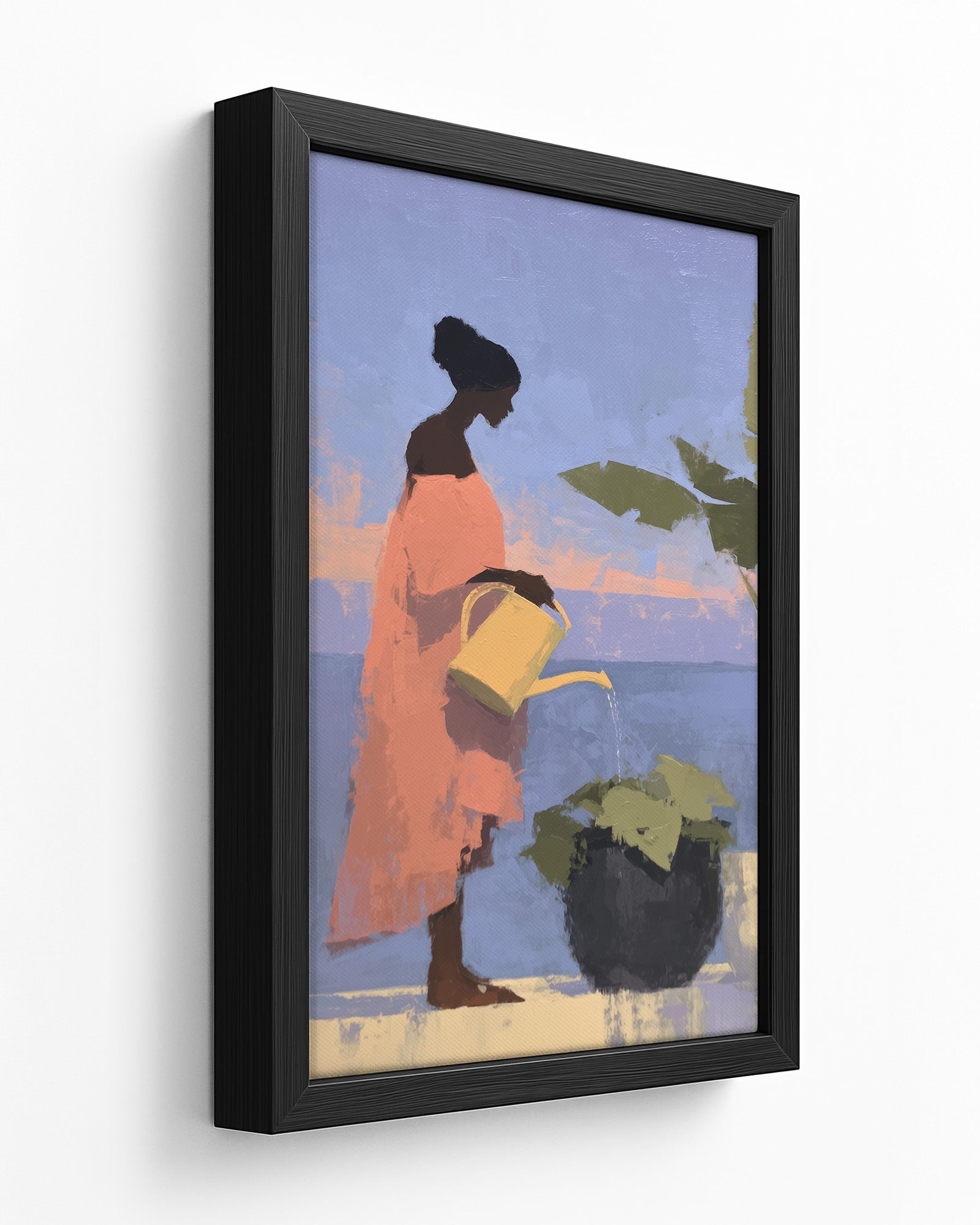 The Ritual of Care: Art on Displacement, Diaspora Care, and the Radical Act of Tending in Exile. This striking composition captures a woman watering her plants with the vast ocean and horizon behind her, revealing how the simple act of garden care becomes profound statement about refusing to let connection wither despite distance and displacement.
