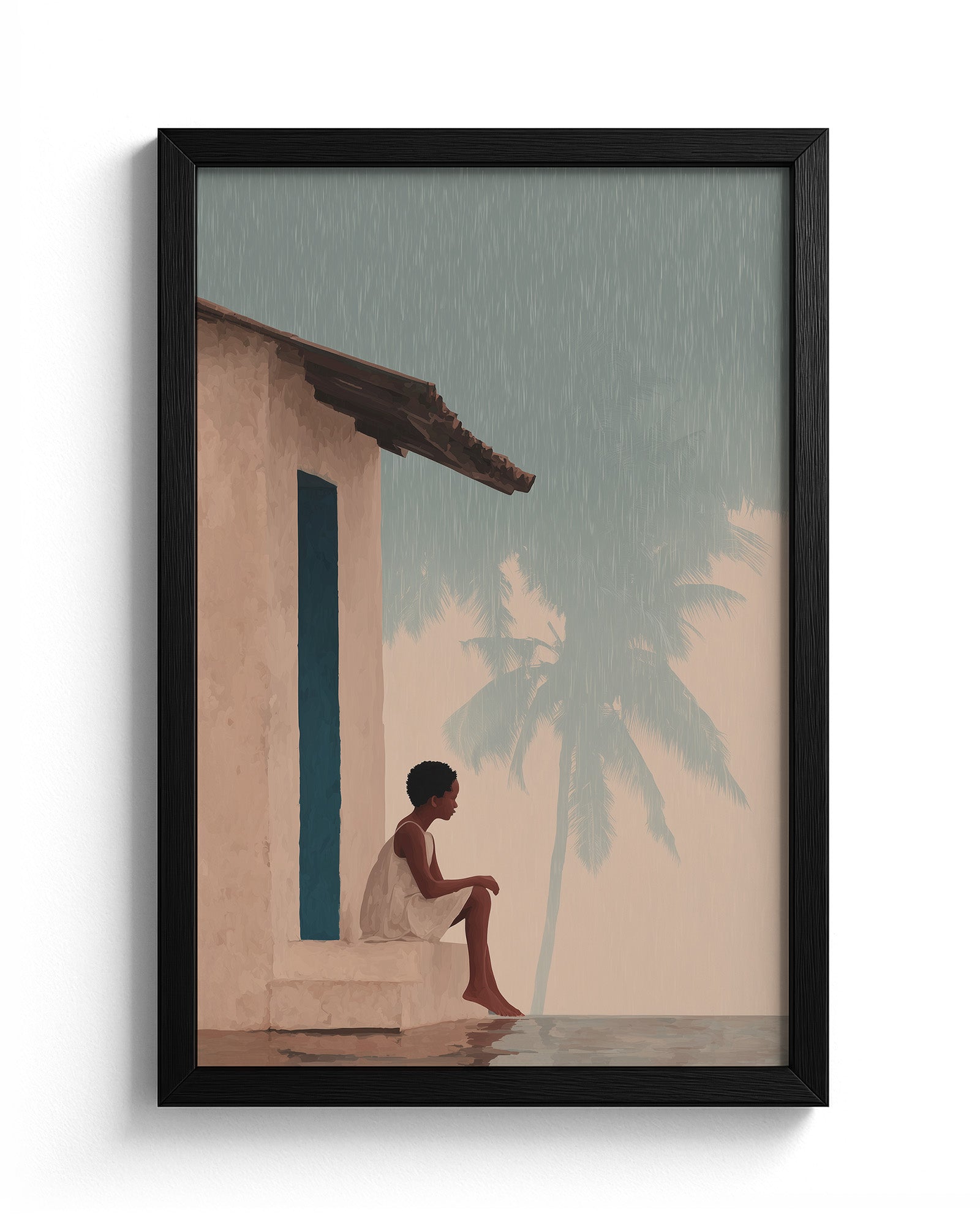 The Shelter She Knows: Art on Childhood Understanding, Safety, and the Knowledge That Lives in Stillness. This striking composition captures a child positioned at the threshold between shelter and storm, revealing how the porch becomes first classroom in learning the boundaries between safety and danger, between inside and outside, between control and surrender.