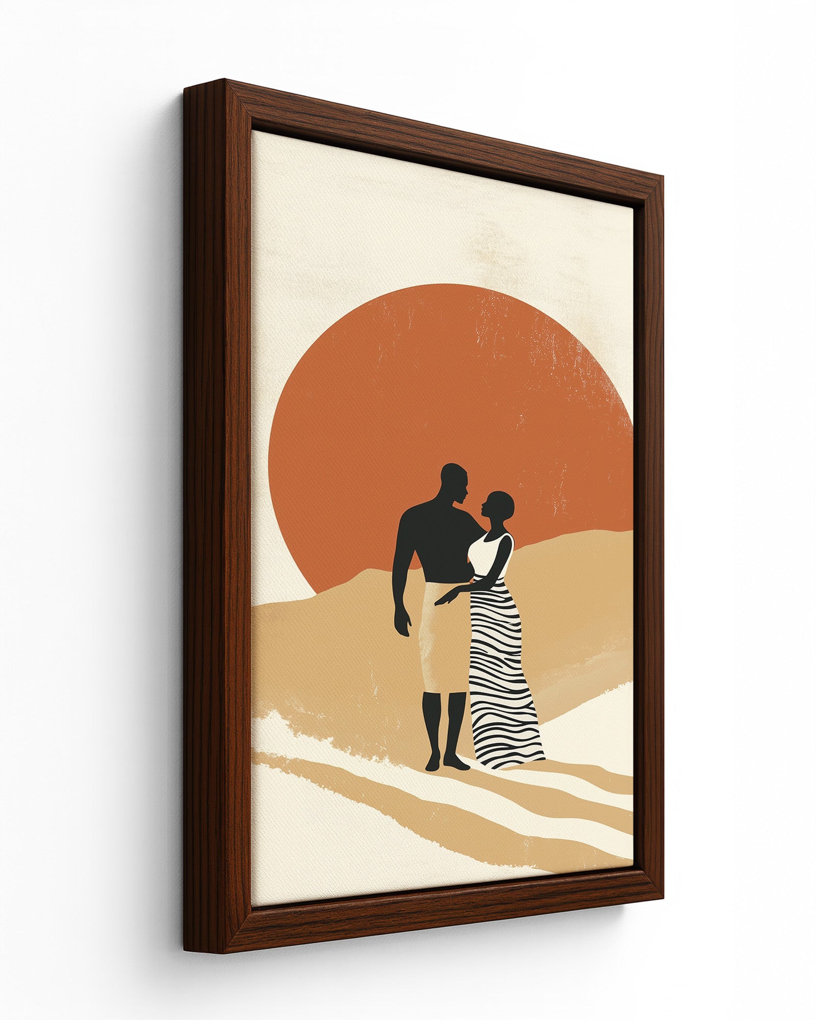 This captivating artwork portrays an intimate moment between a West African couple in a tender embrace, set against a warm beige and sandy backdrop that evokes the serene beauty of the savanna landscape. Distinctive black and white zebra patterns weave throughout the composition, creating visual rhythm and cultural connection, while an orange sun radiates warmth and vitality across the scene.