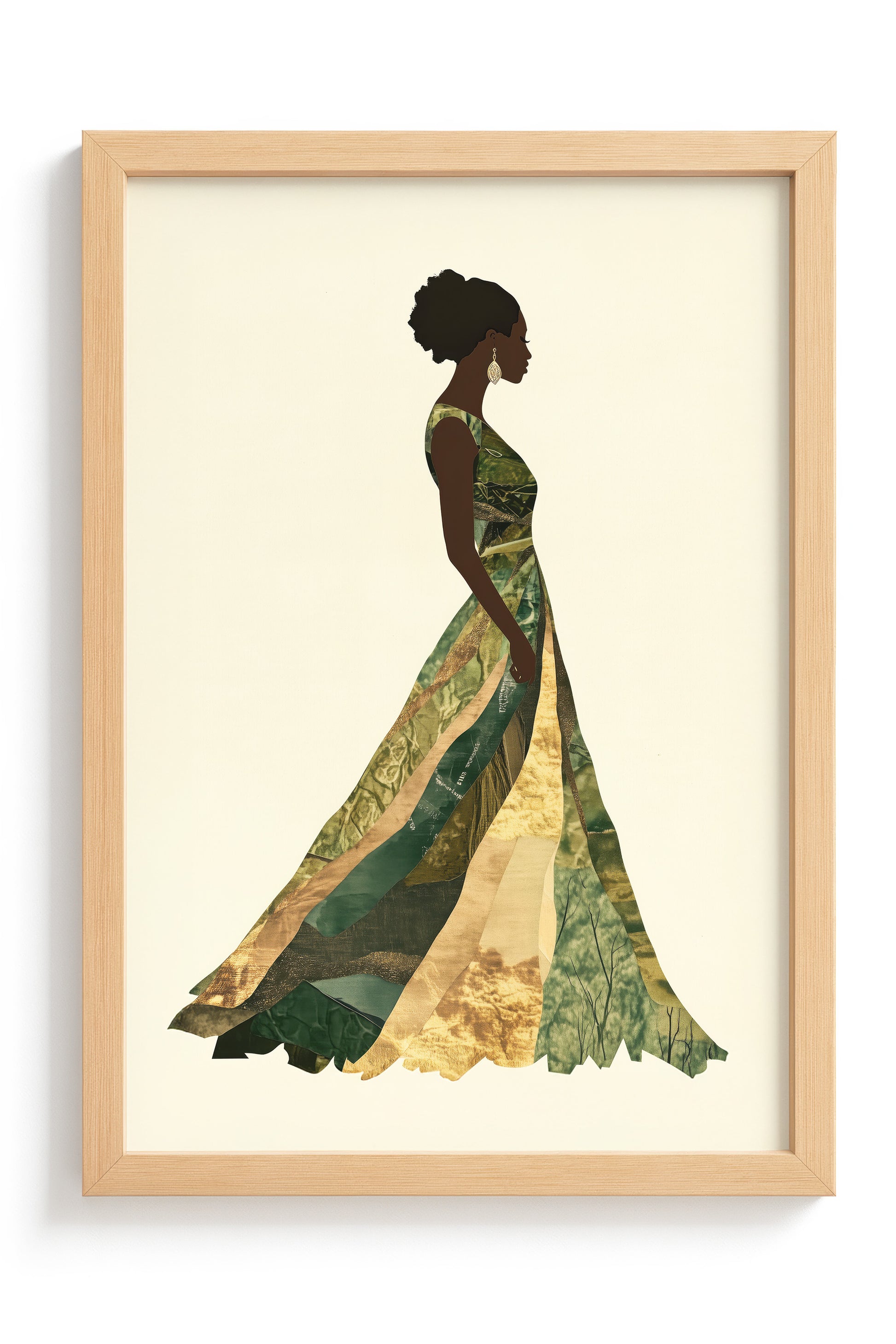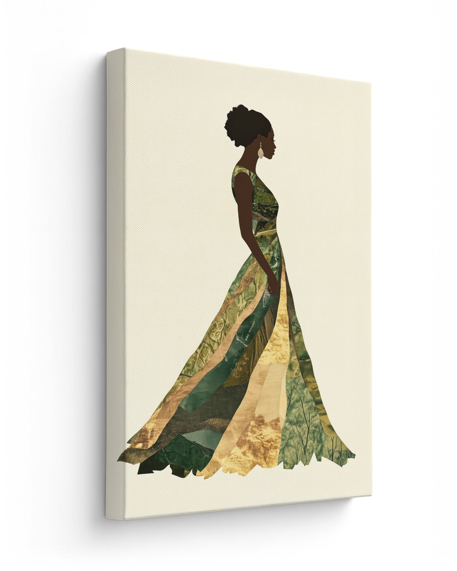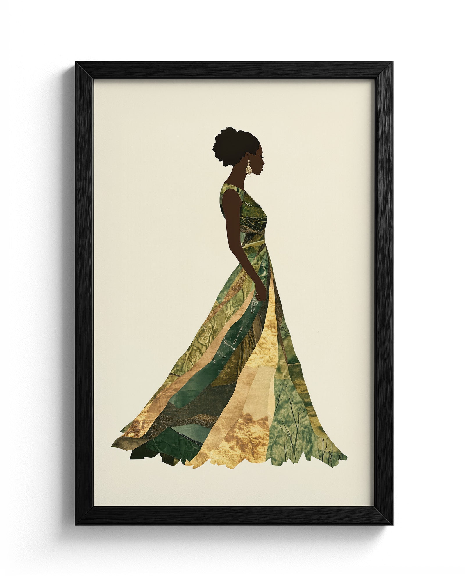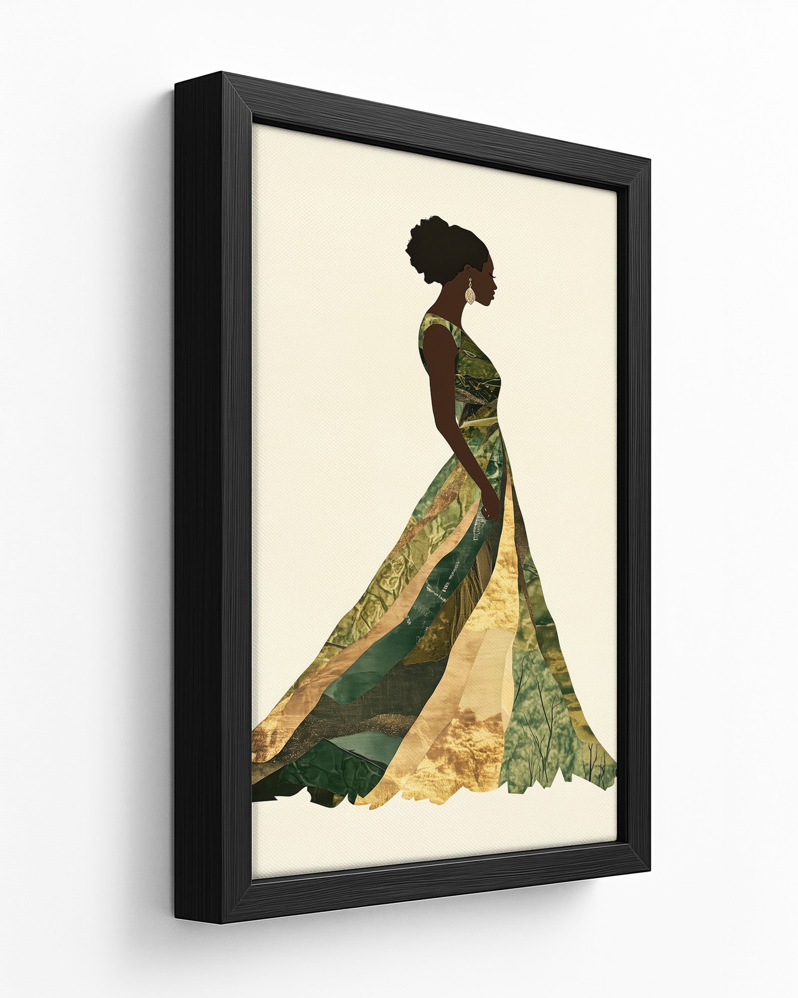 Infuse your space with the elegance of African heritage and nature with this stunning minimalist wall art. Featuring a serene side-profile of an African woman, her dress flowing in a blend of soft greens and golds.