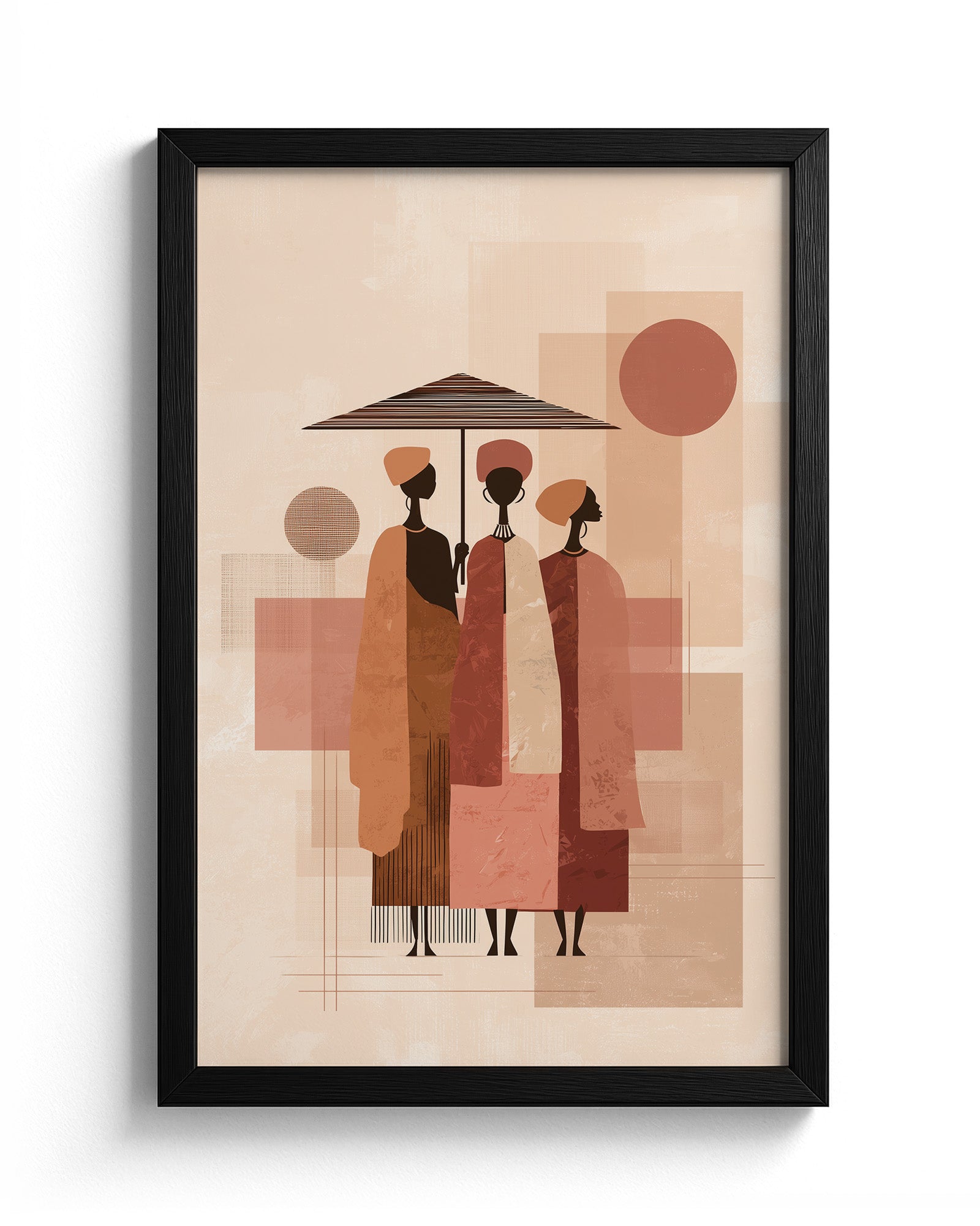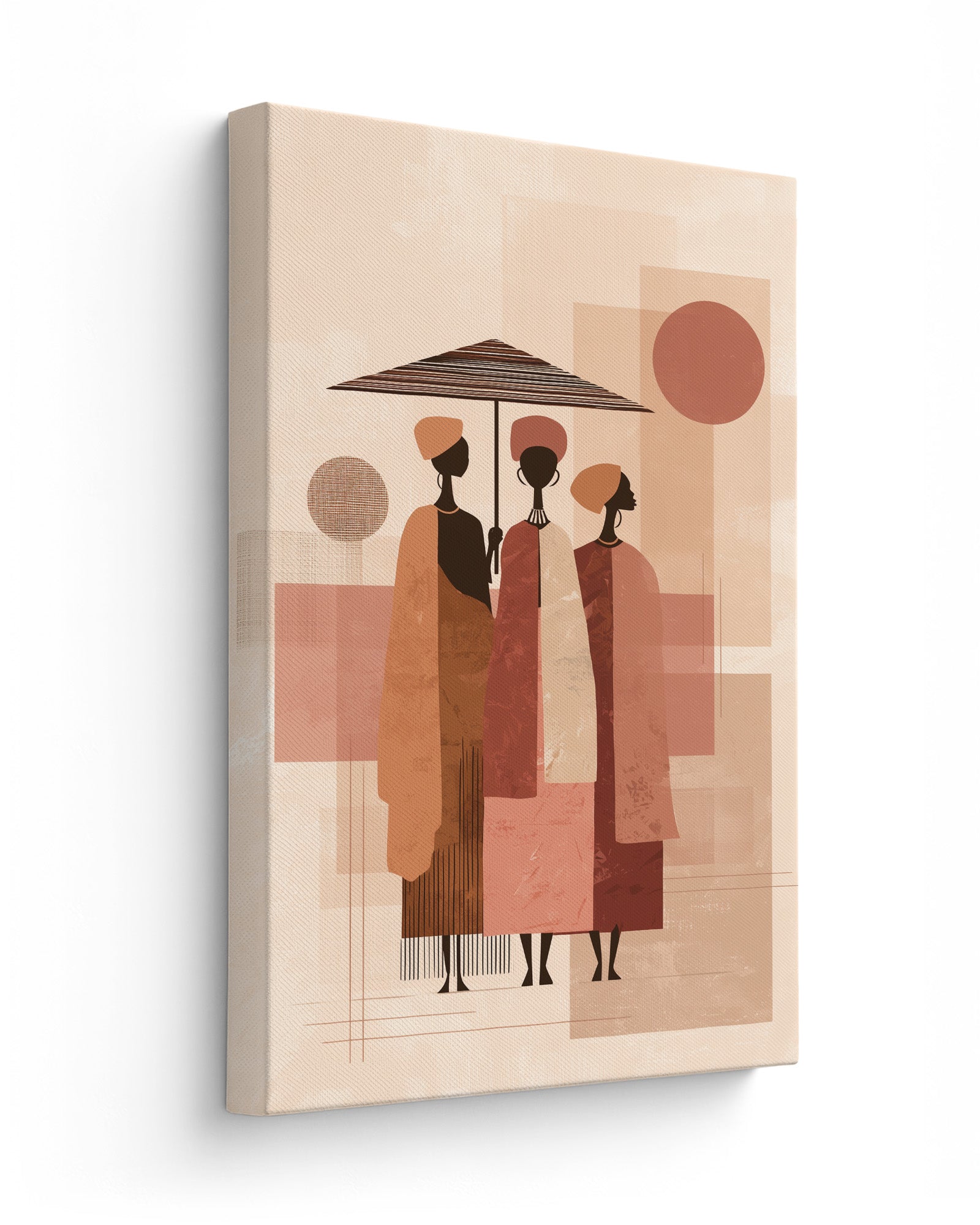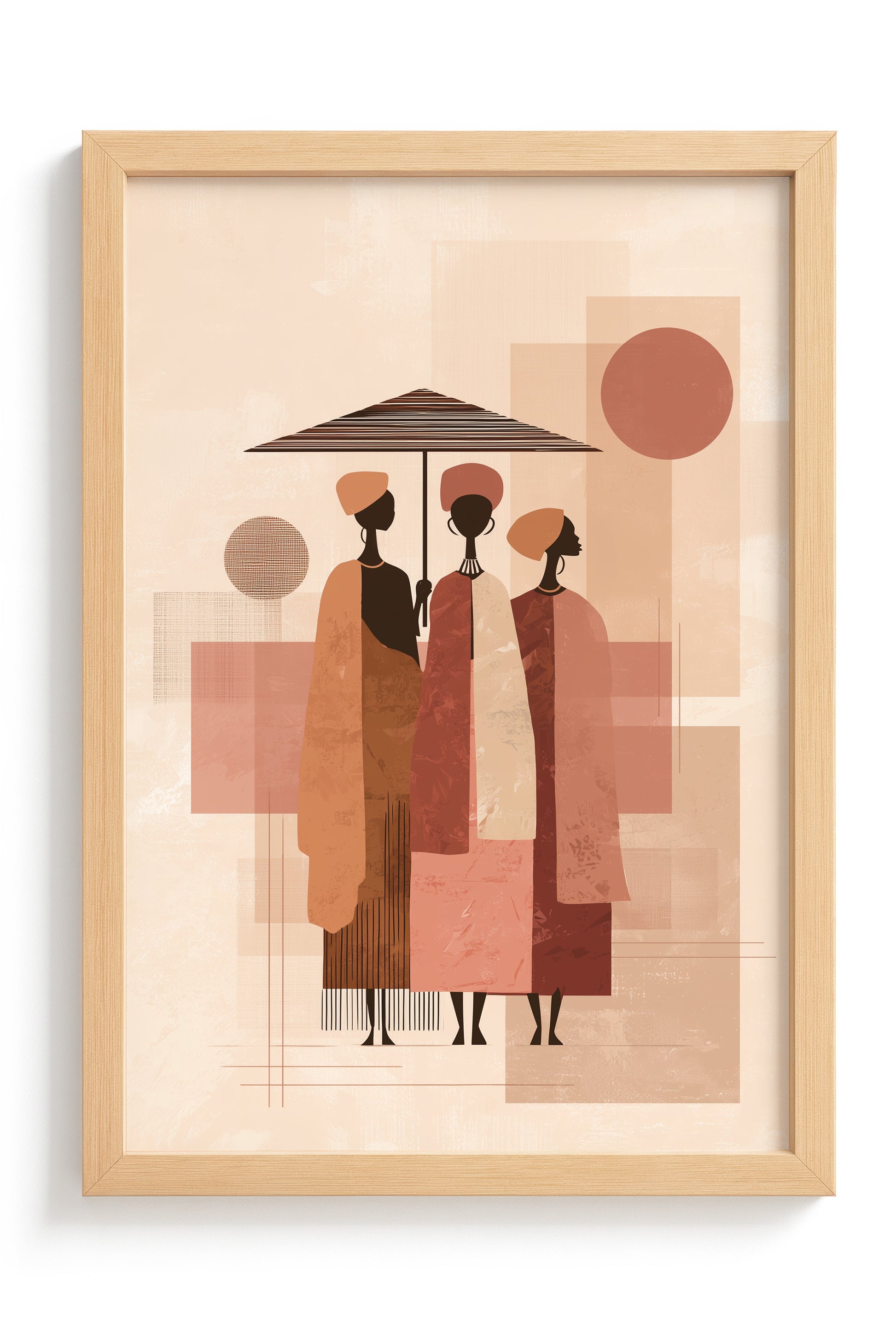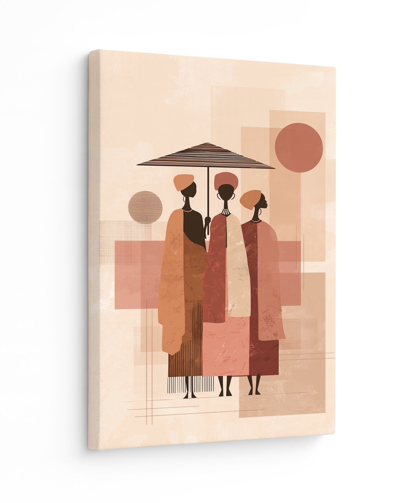 A minimalistic African artwork of three women in traditional attire beneath a woven umbrella. Painted in a silhouette style with soft blush, dusty pink, mauve, and ivory tones accented by rose gold. Abstract geometric shapes and simplified cultural motifs highlight the elegance, symbolism, and timeless grace of African femininity in a refined modern palette.