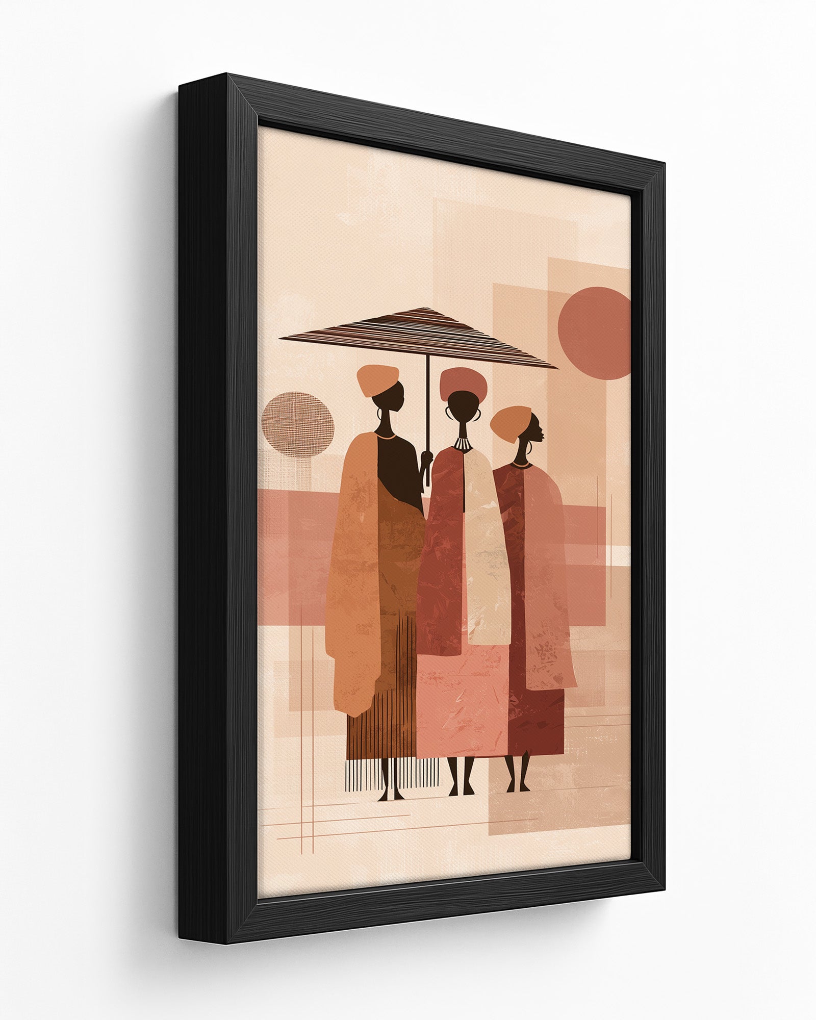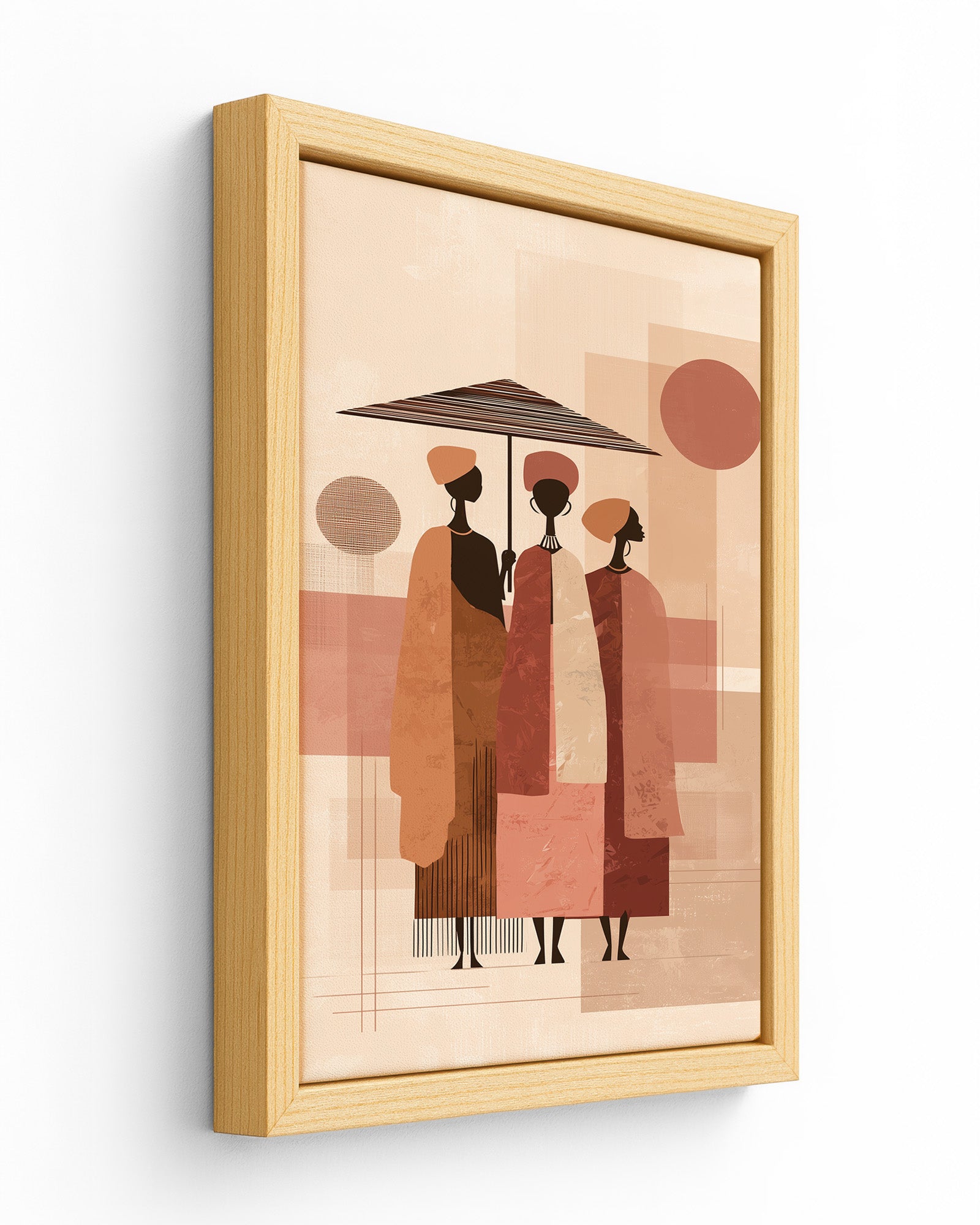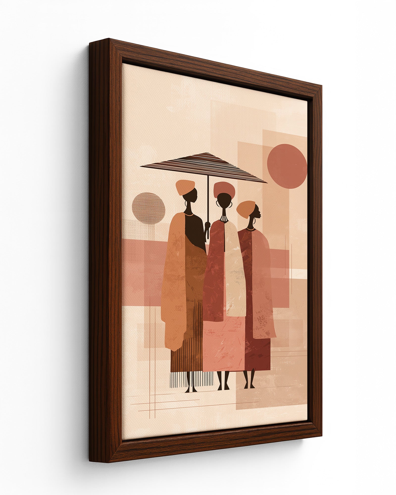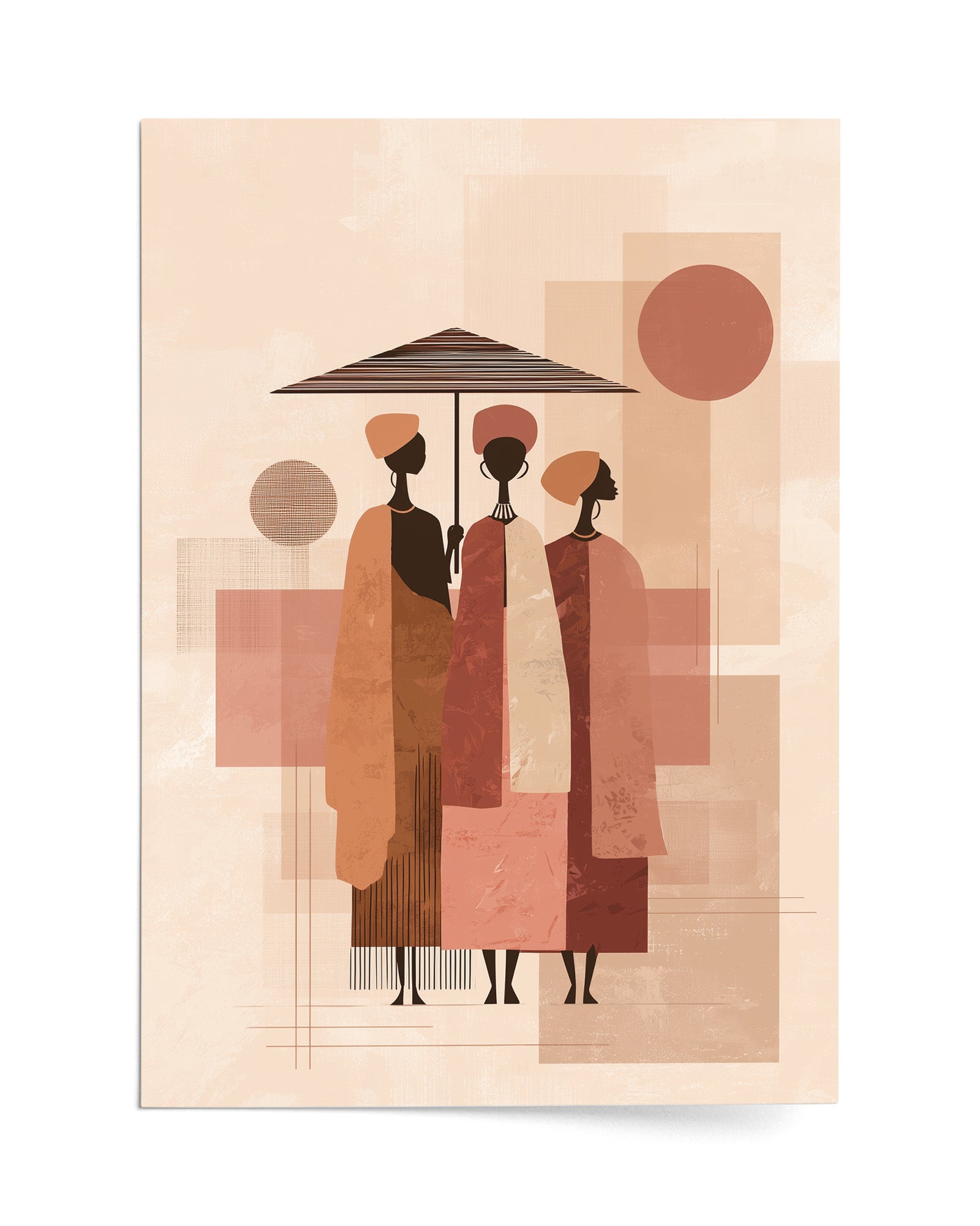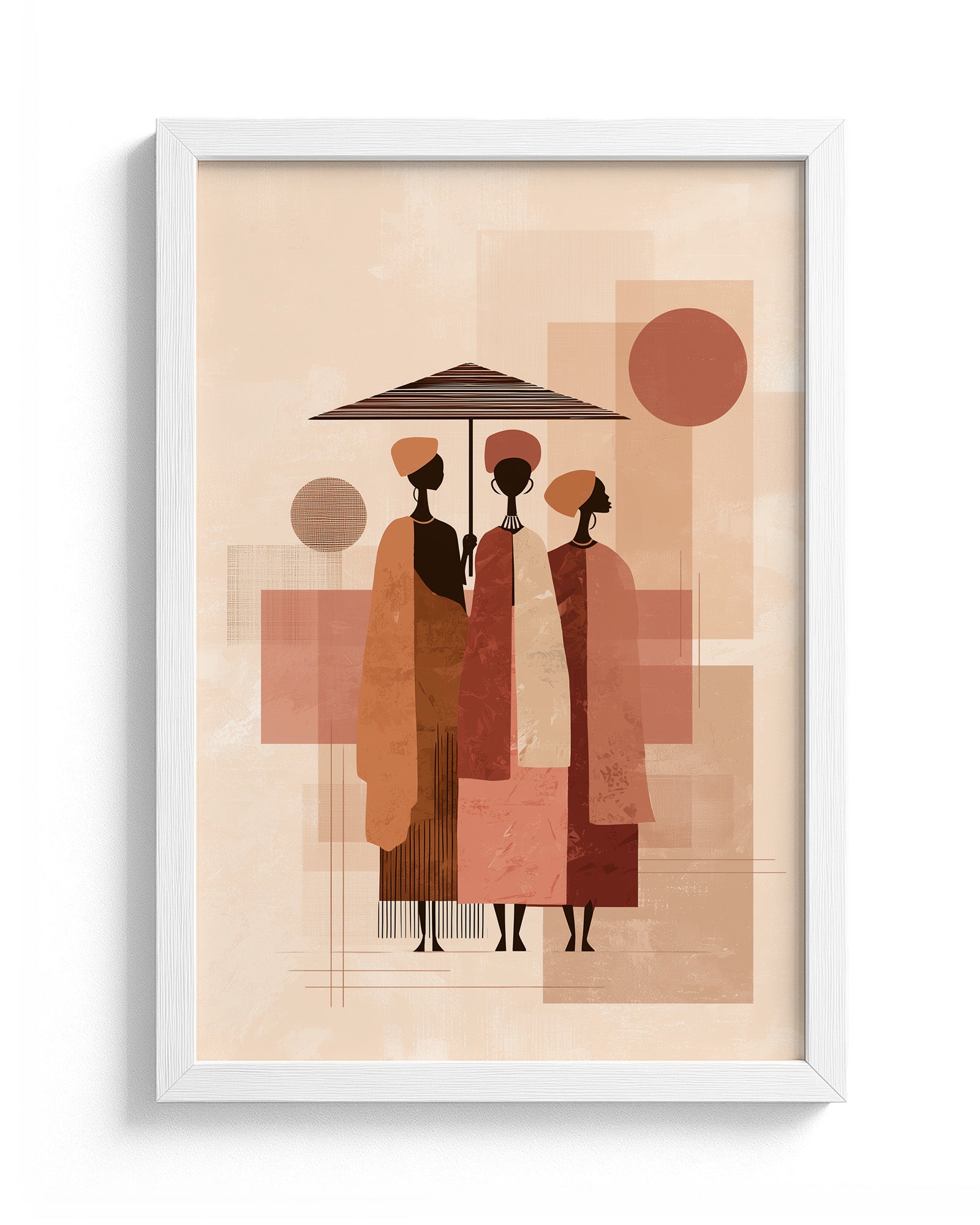 A minimalistic African artwork of three women in traditional attire beneath a woven umbrella. Painted in a silhouette style with soft blush, dusty pink, mauve, and ivory tones accented by rose gold. Abstract geometric shapes and simplified cultural motifs highlight the elegance, symbolism, and timeless grace of African femininity in a refined modern palette.