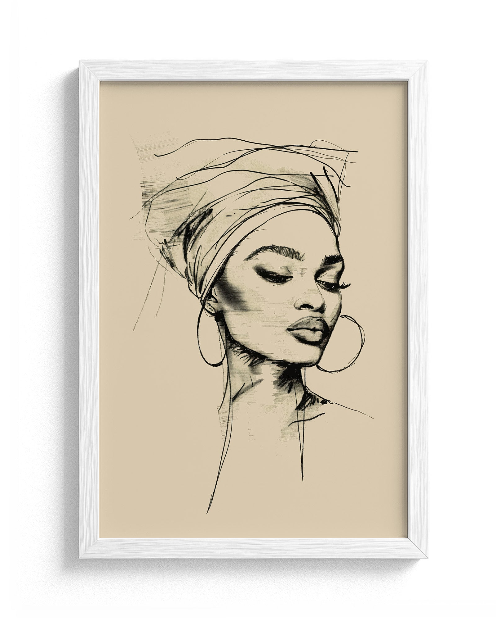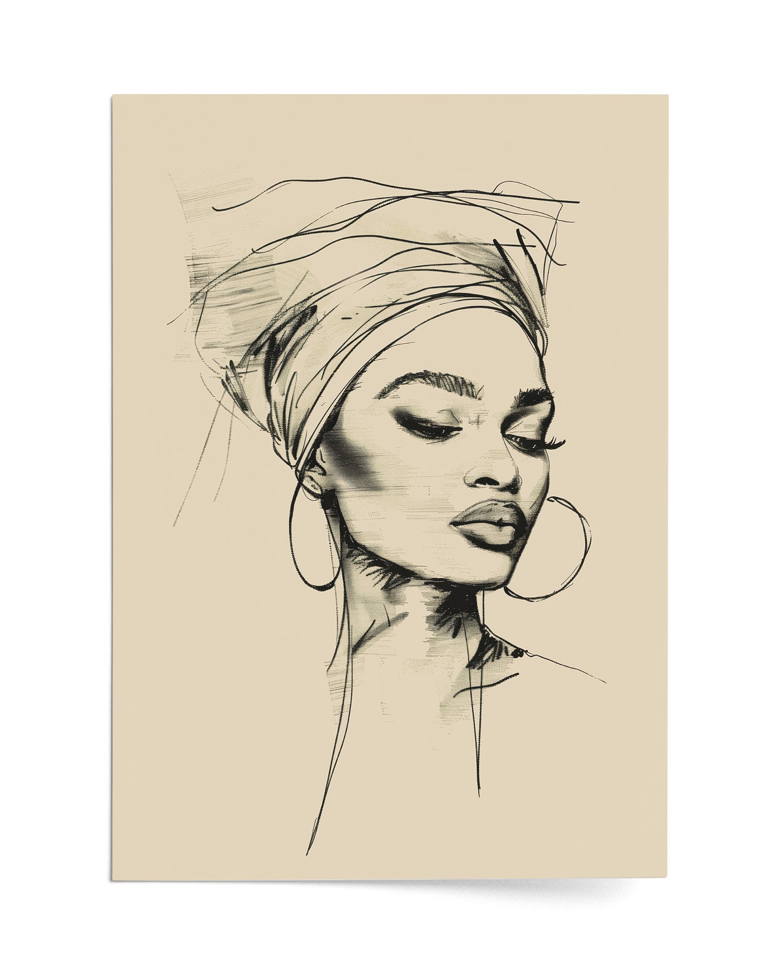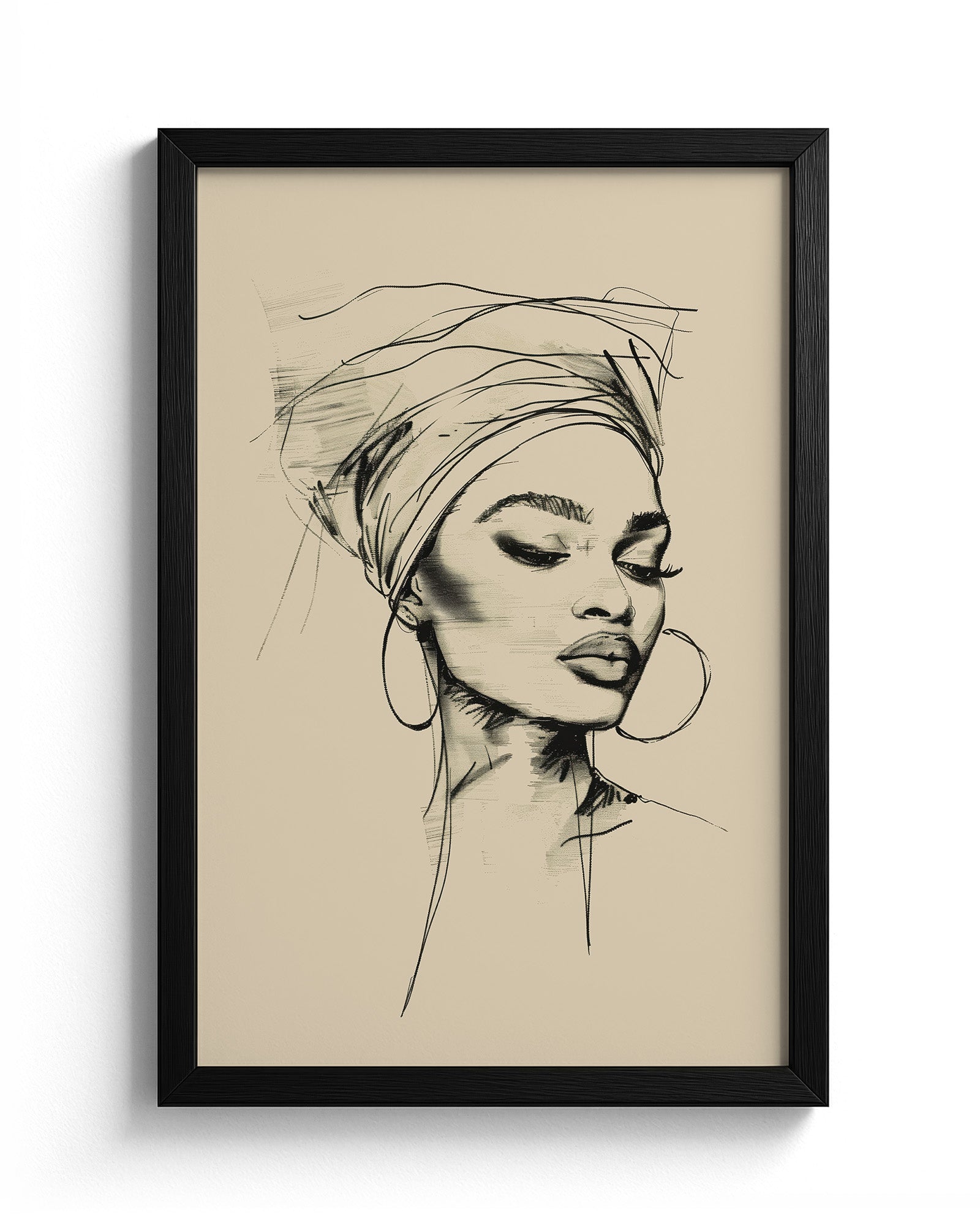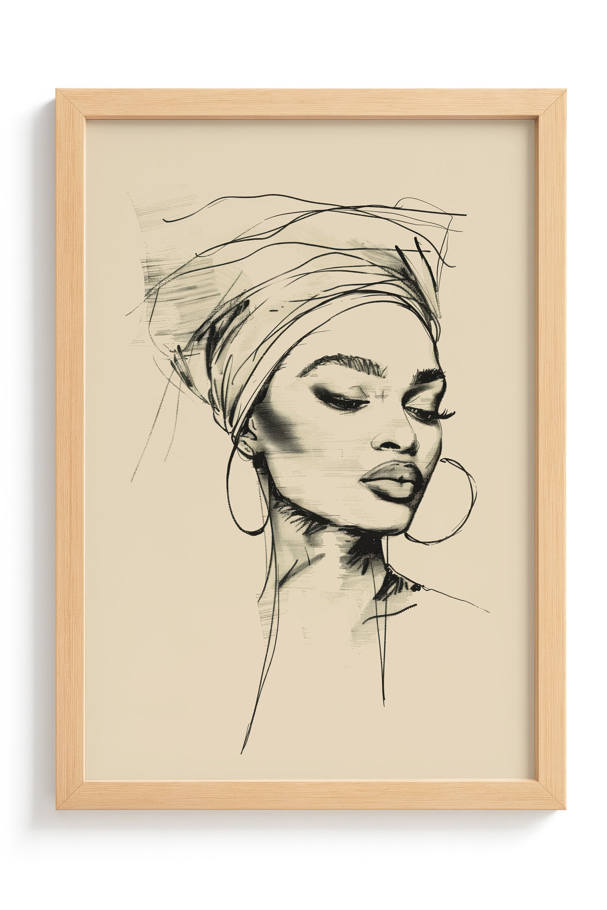 This minimalist line art portrait captures the quiet elegance of an African woman in a flowing head bonnet, tilting her head in serene reflection. Crafted with refined black strokes, her delicate profile exudes effortless grace and sophistication against a muted pastel background.
