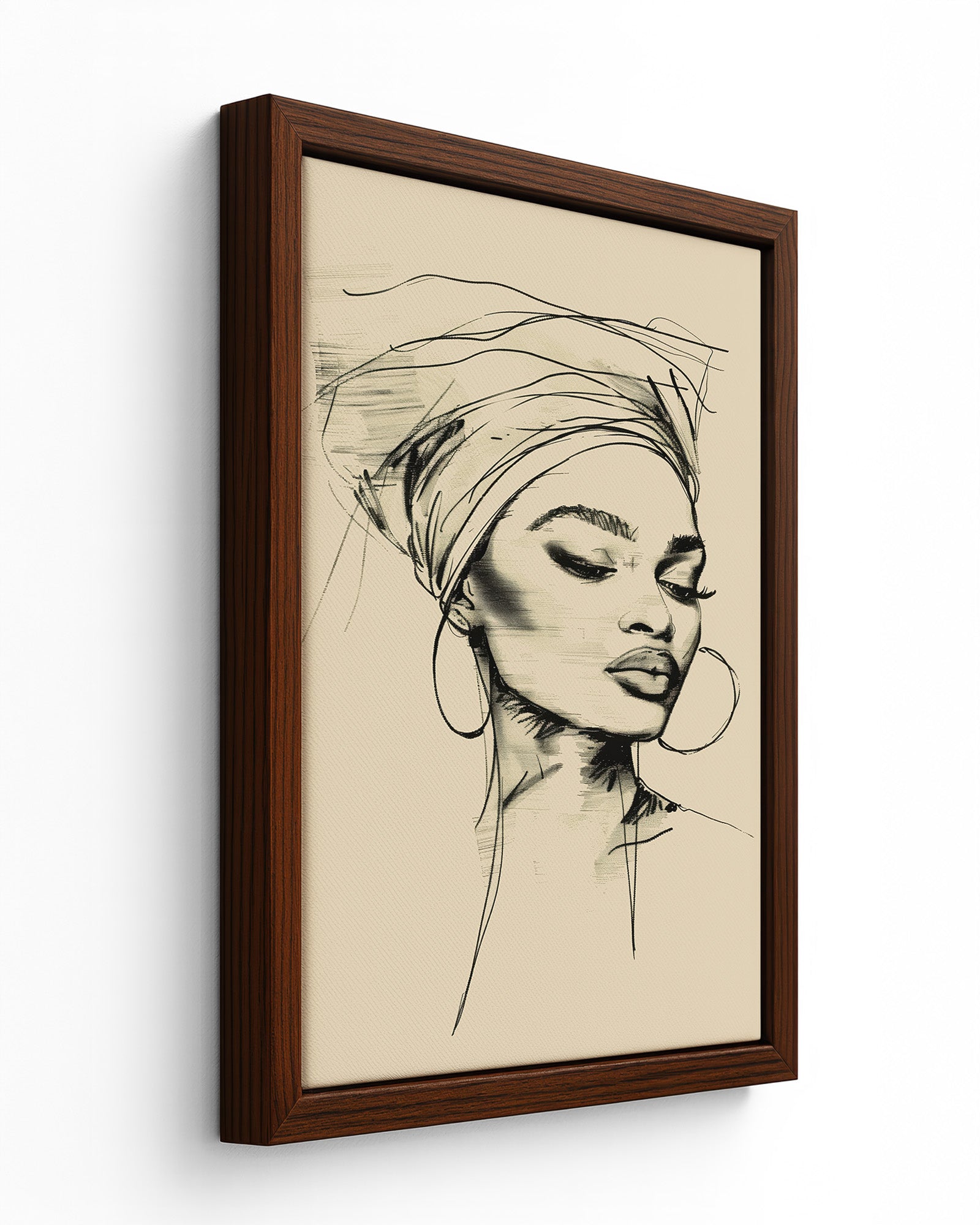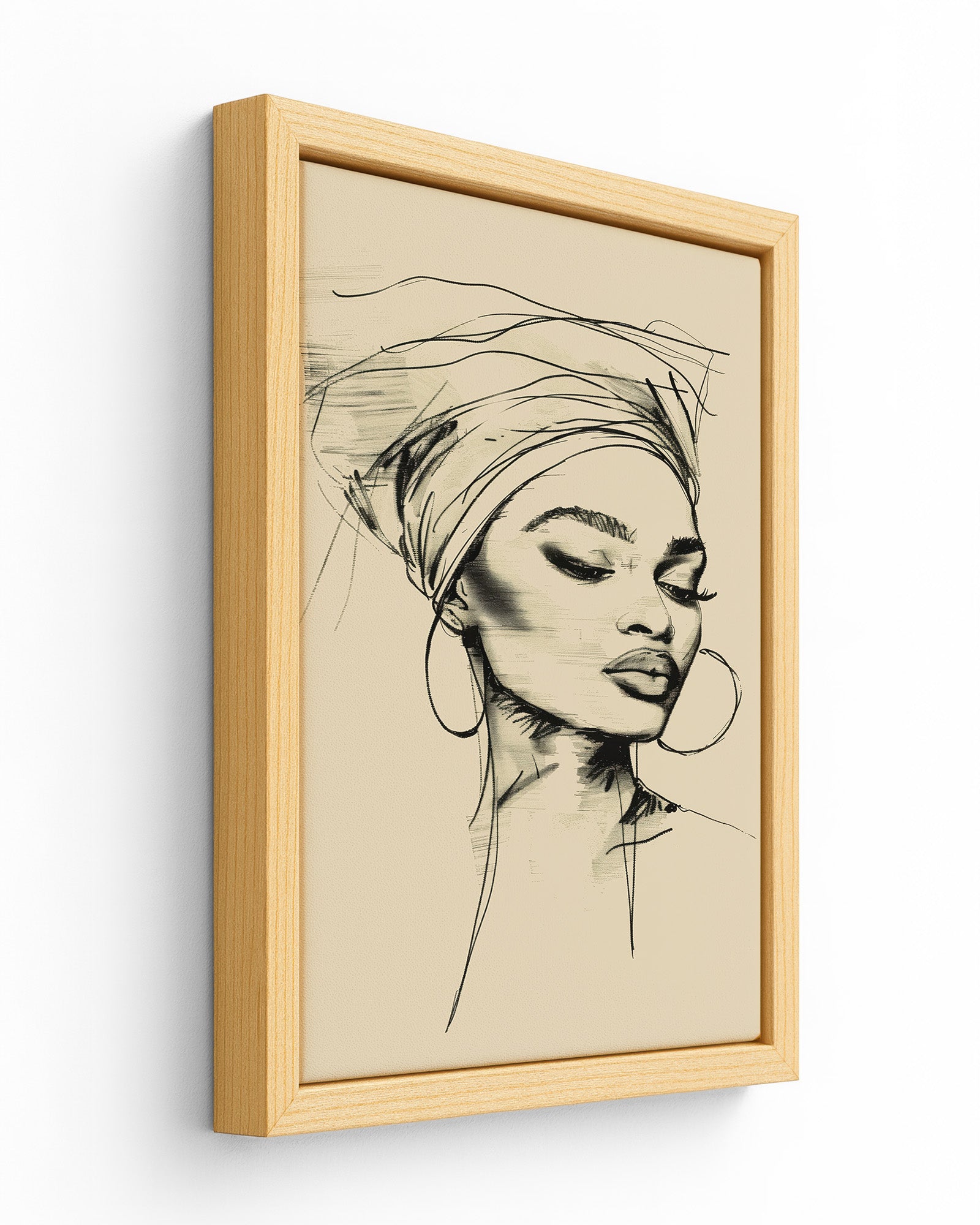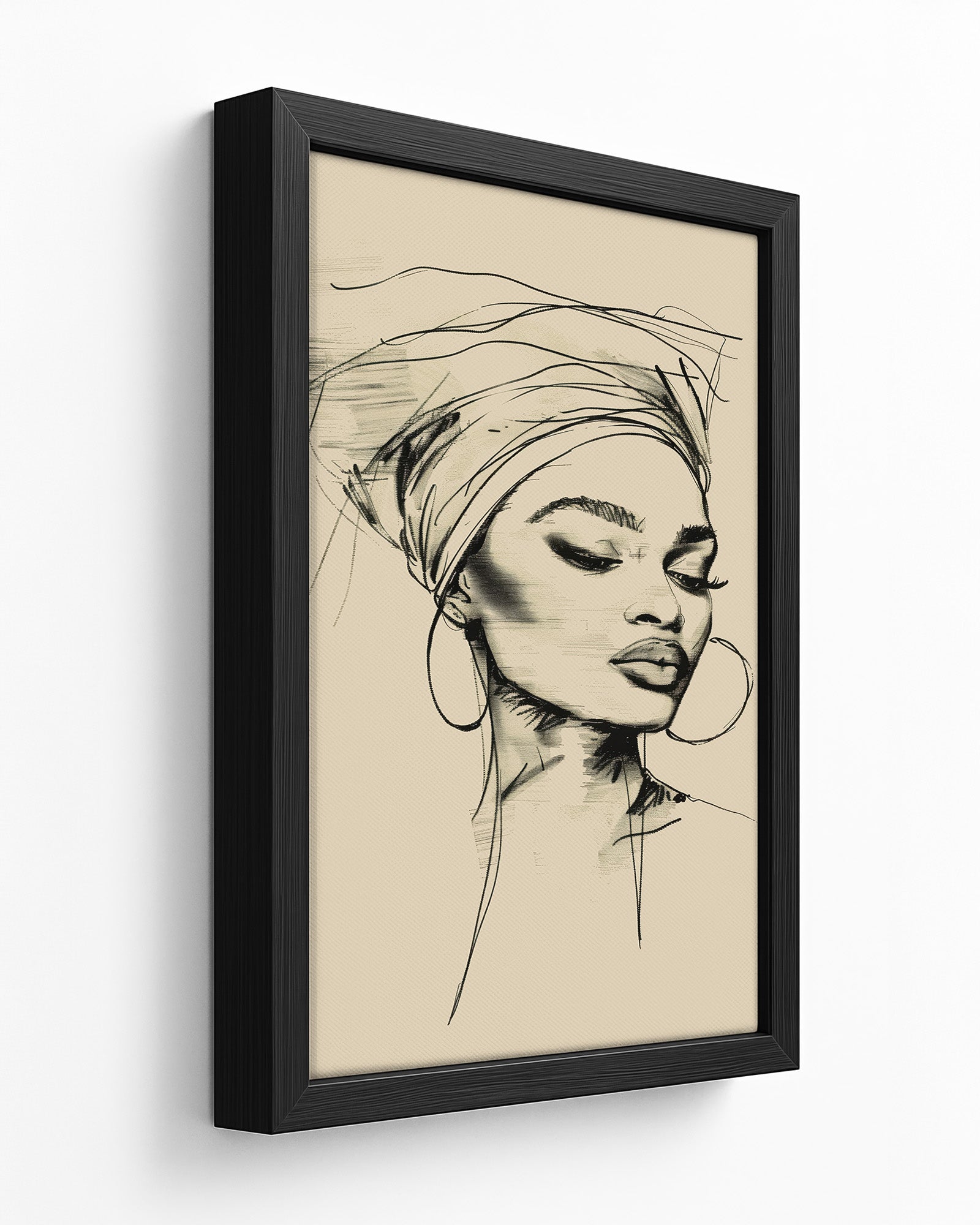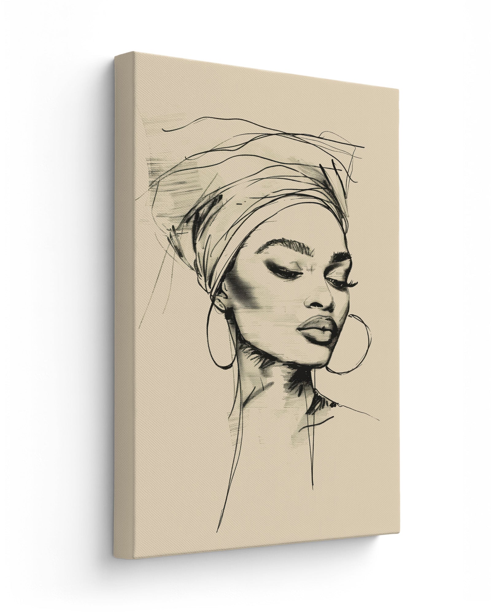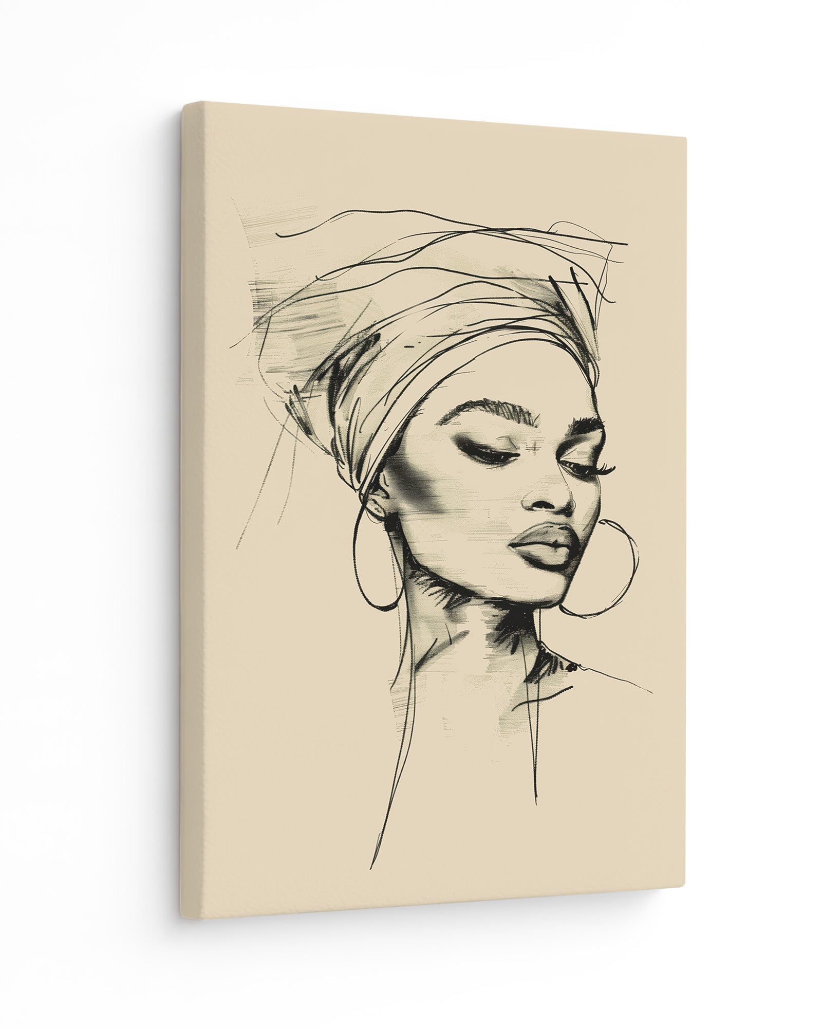 This minimalist line art portrait captures the quiet elegance of an African woman in a flowing head bonnet, tilting her head in serene reflection. Crafted with refined black strokes, her delicate profile exudes effortless grace and sophistication against a muted pastel background.