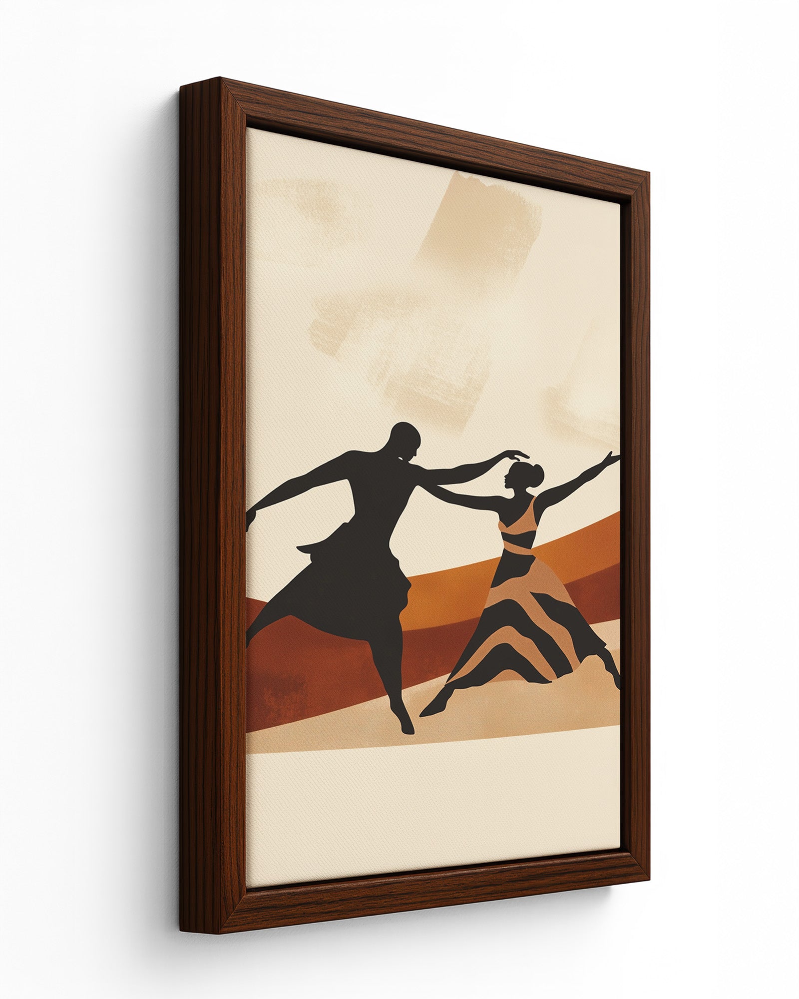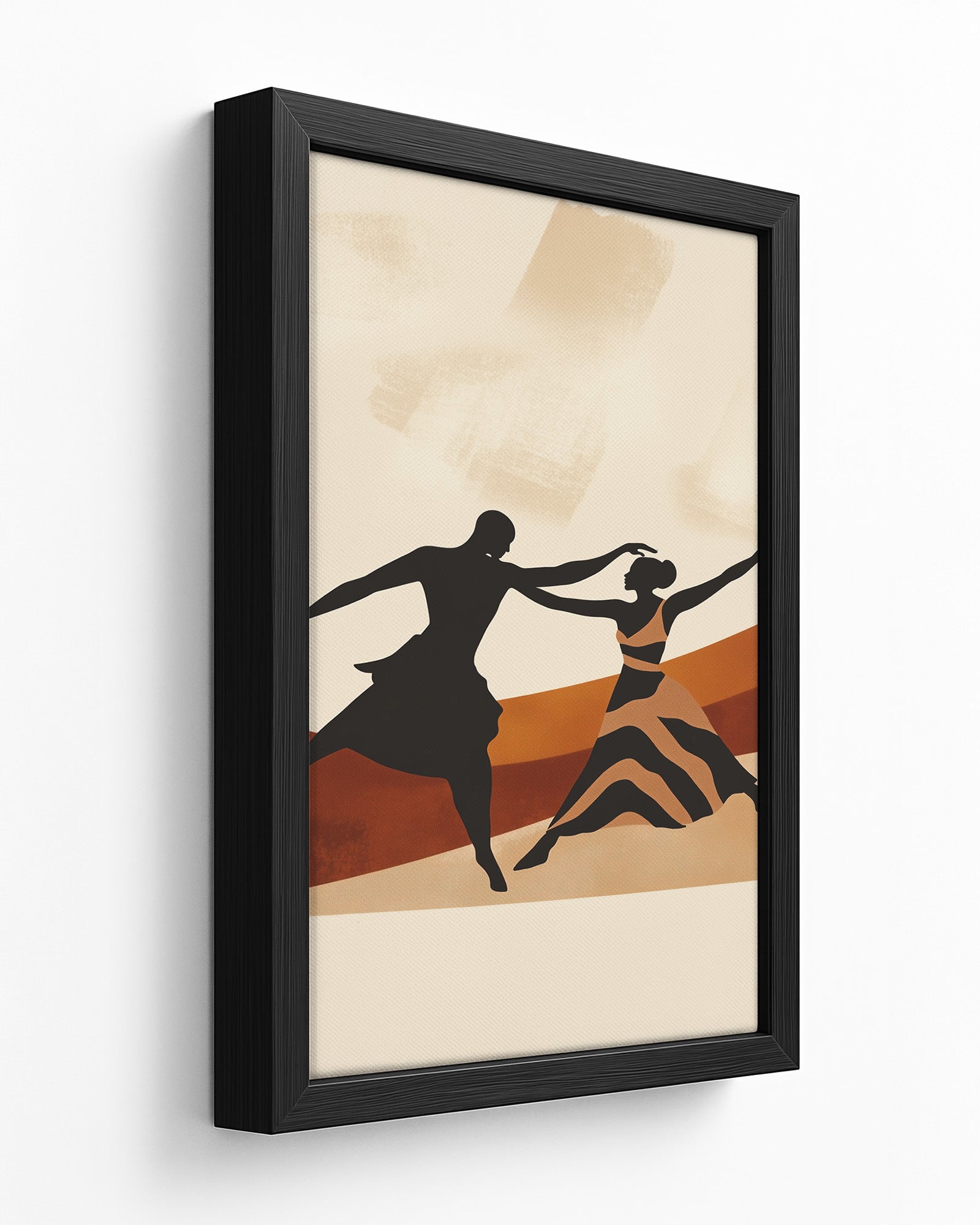 This vibrant artwork captures the intimate movement of an Zambian couple dancing together against a warm orange and beige background featuring earthy swirl stripes and striking zebra patterns. The piece celebrates the beautiful connection between the dancers while honouring African aesthetic traditions through its thoughtful use of pattern and colour.