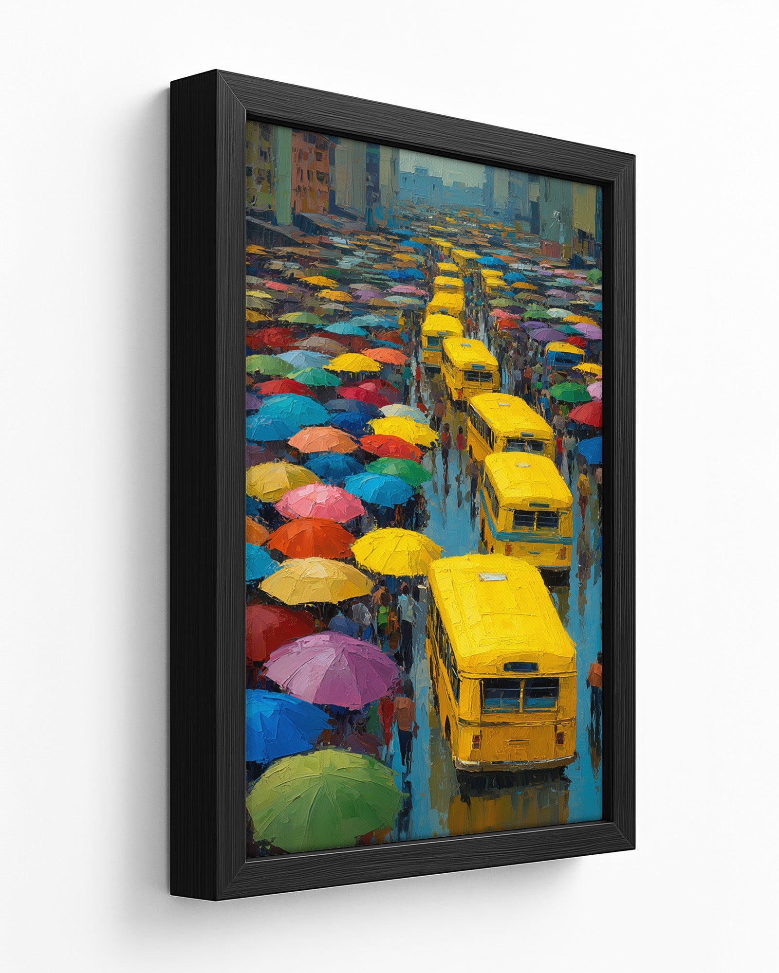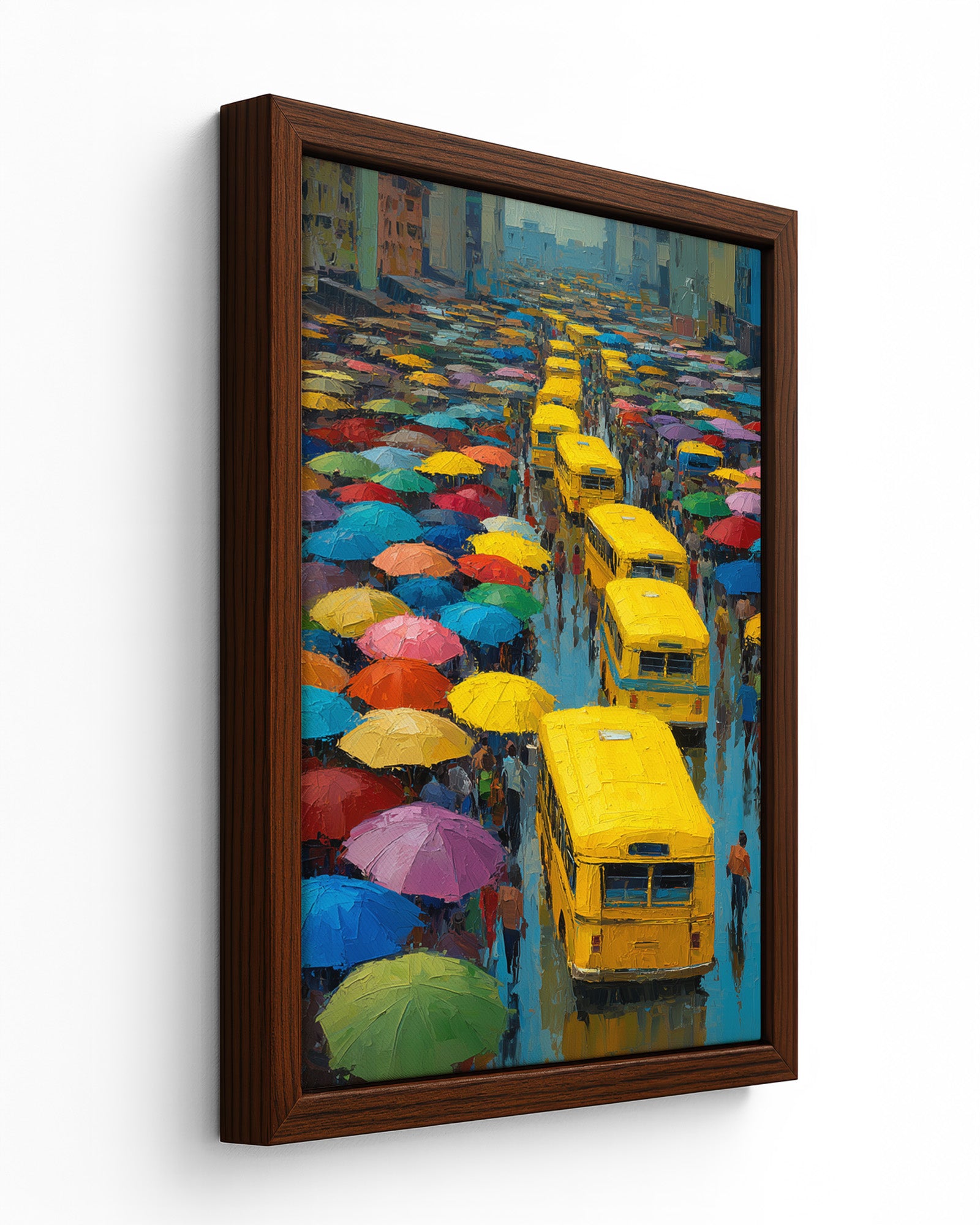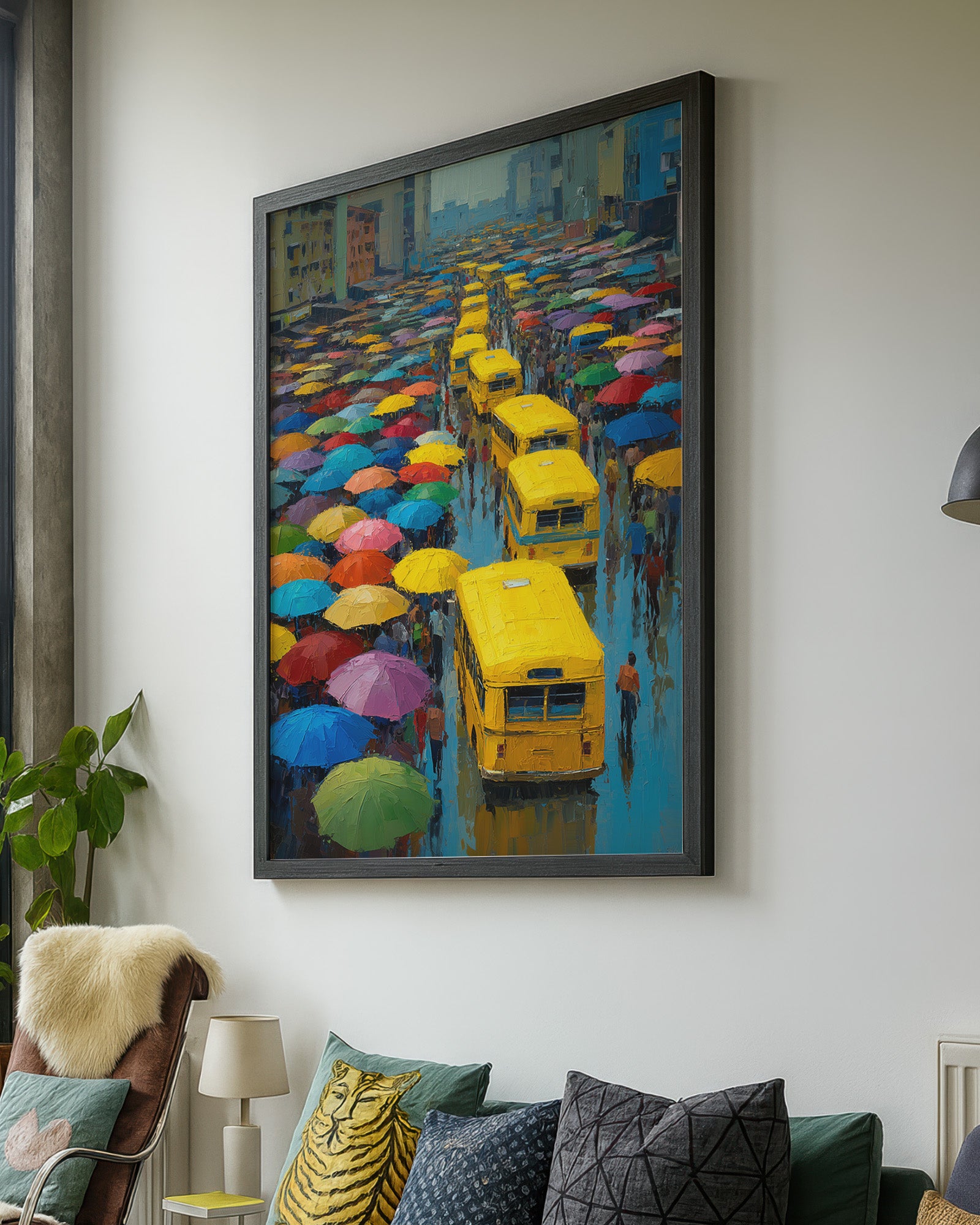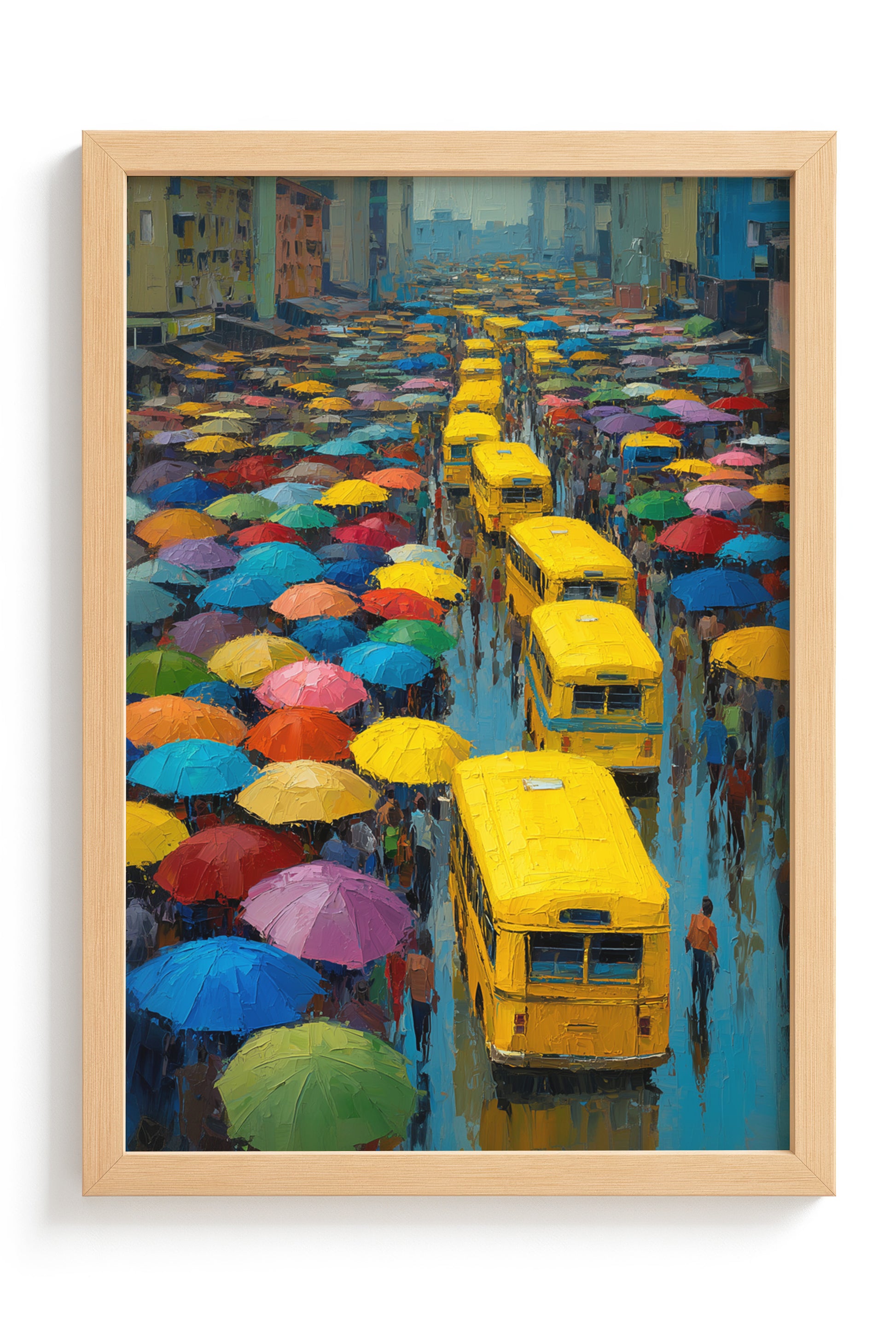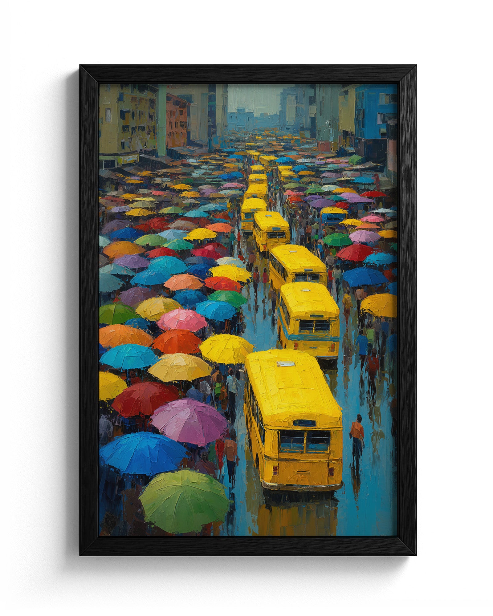An abstract oil painting of Lagos, alive with vibrant umbrellas, bustling crowds, and iconic yellow city buses. Bold brushstrokes and luminous colours capture the energy, rhythm, and cultural heartbeat of urban Nigeria, blending chaos and beauty into a living tapestry of movement.