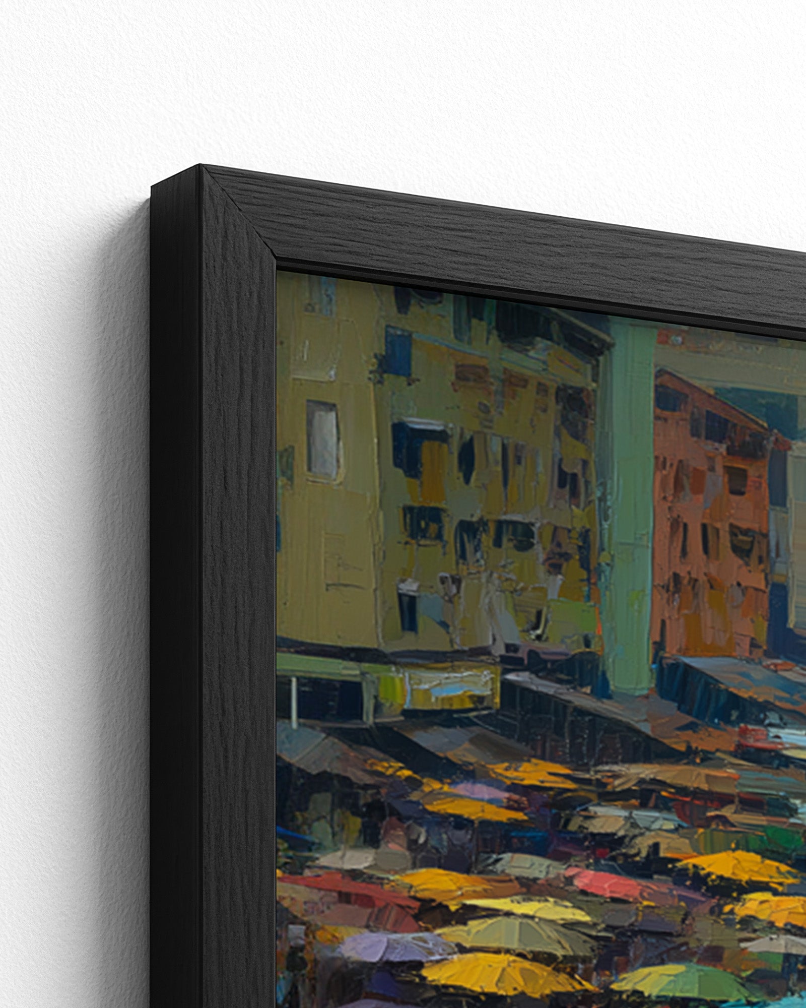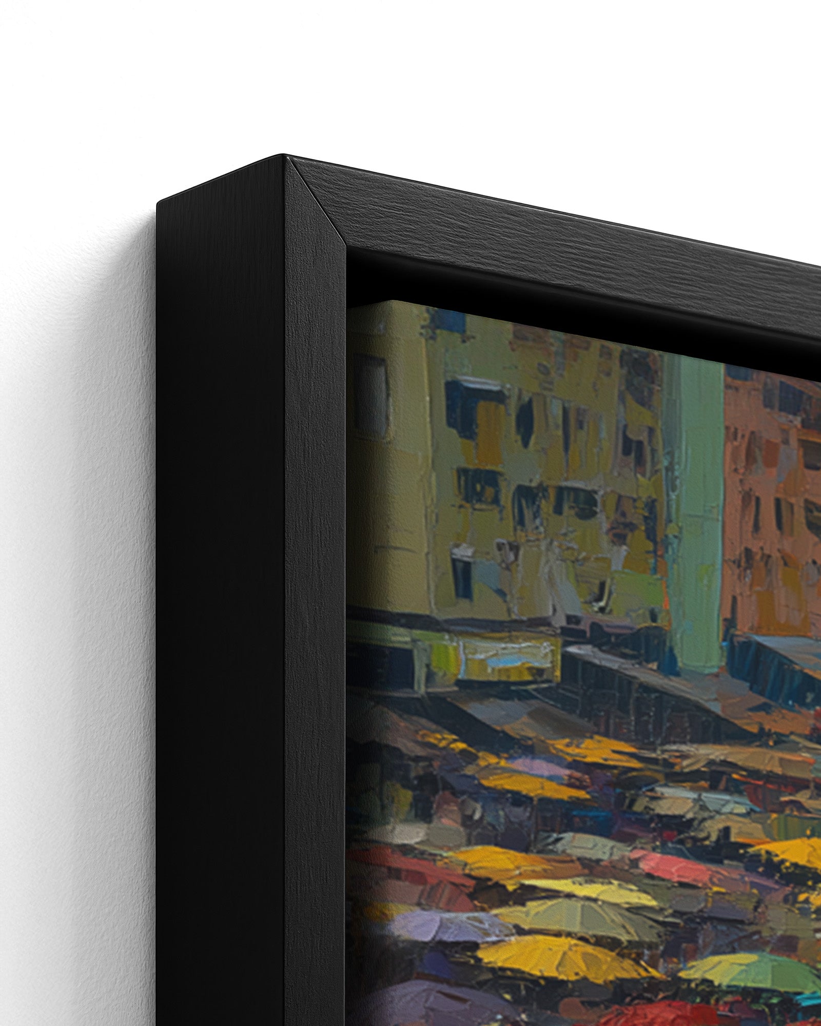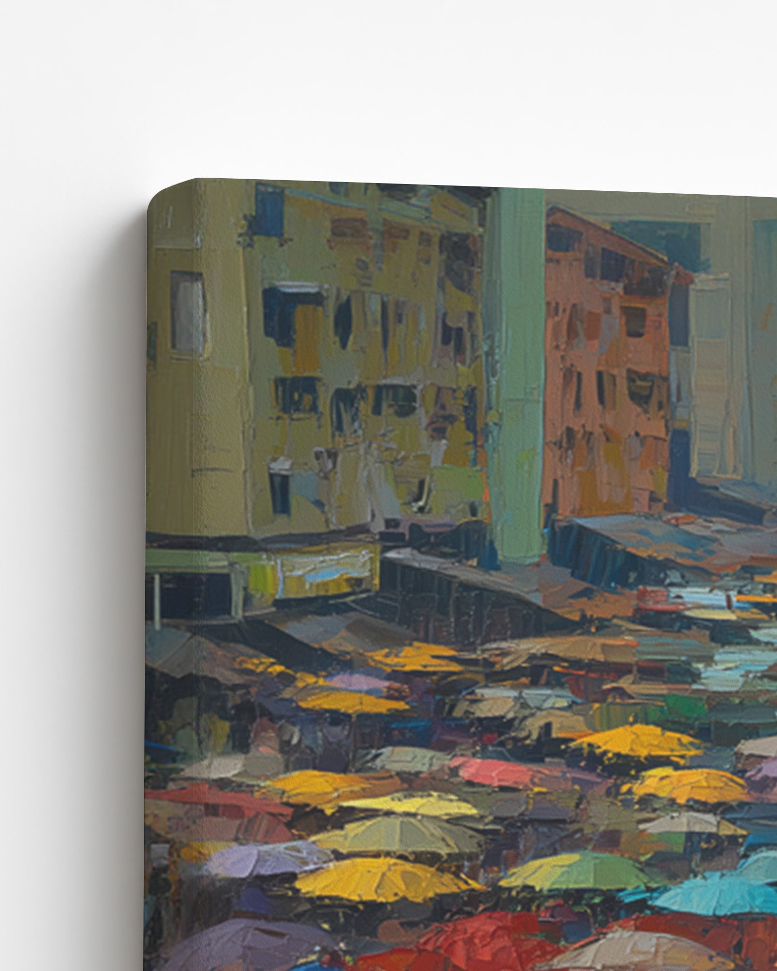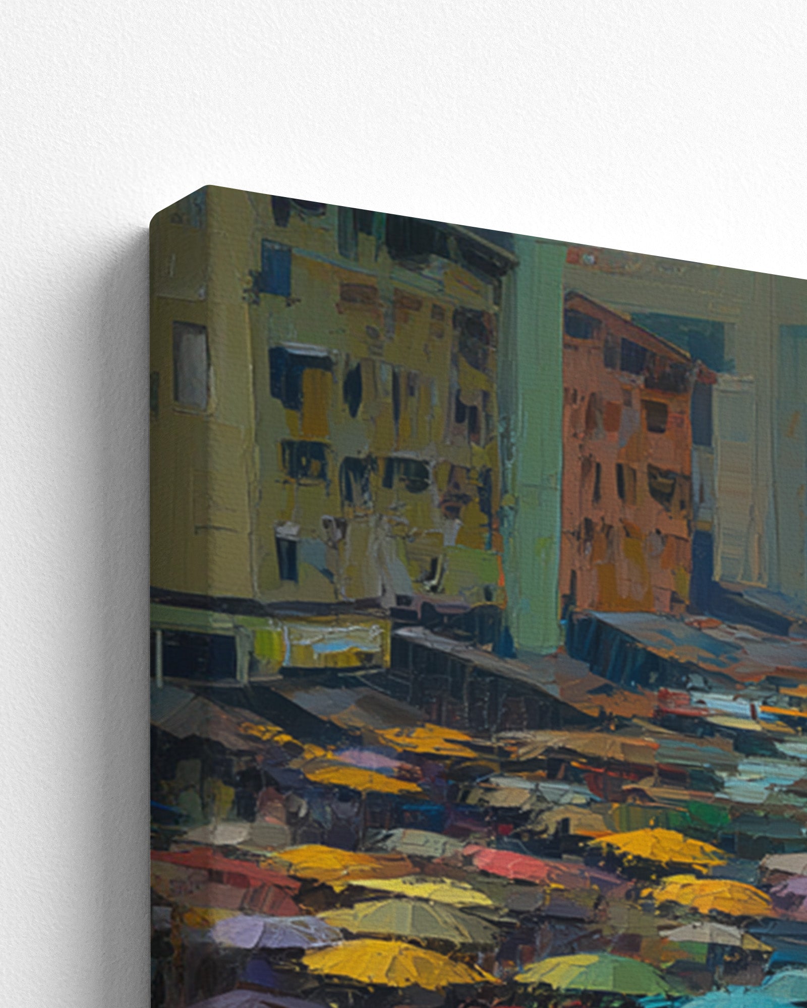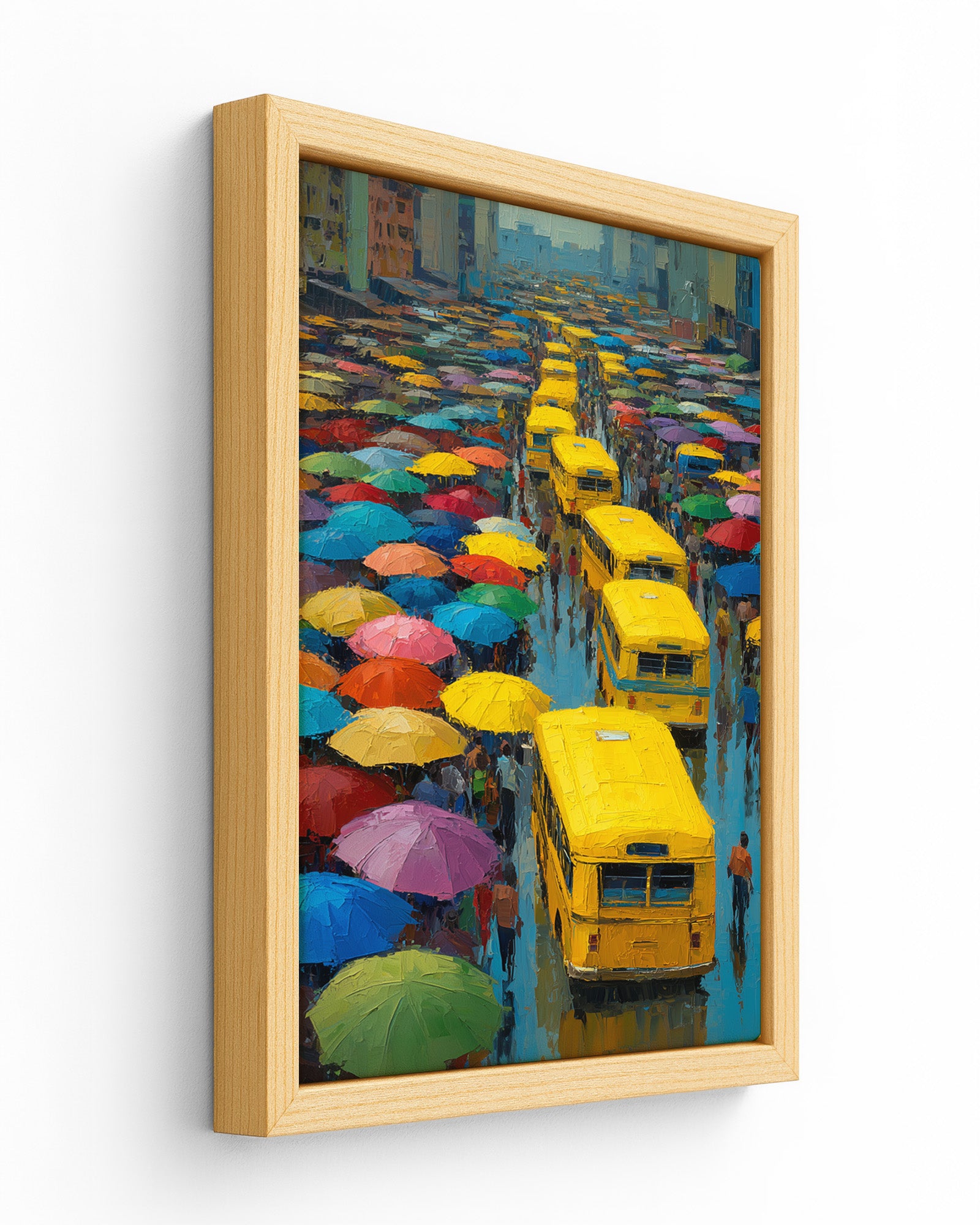 An abstract oil painting of Lagos, alive with vibrant umbrellas, bustling crowds, and iconic yellow city buses. Bold brushstrokes and luminous colours capture the energy, rhythm, and cultural heartbeat of urban Nigeria, blending chaos and beauty into a living tapestry of movement.