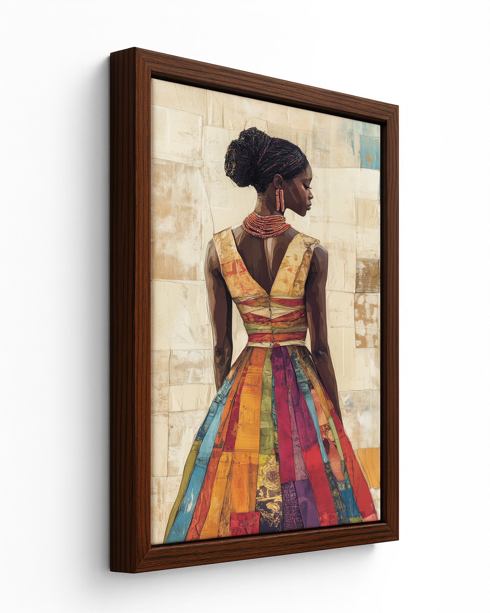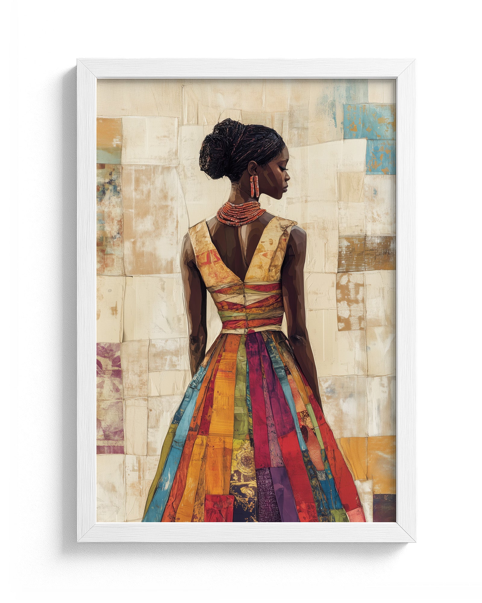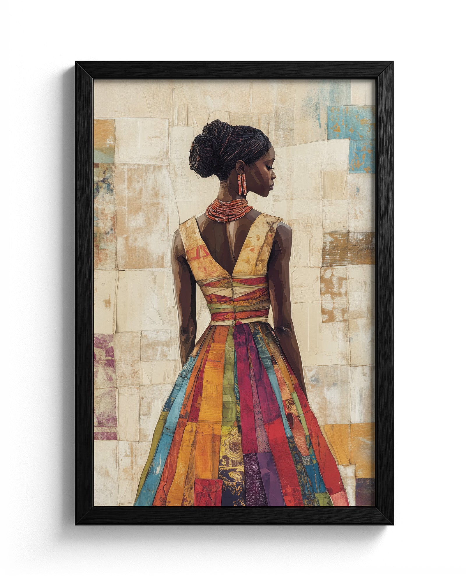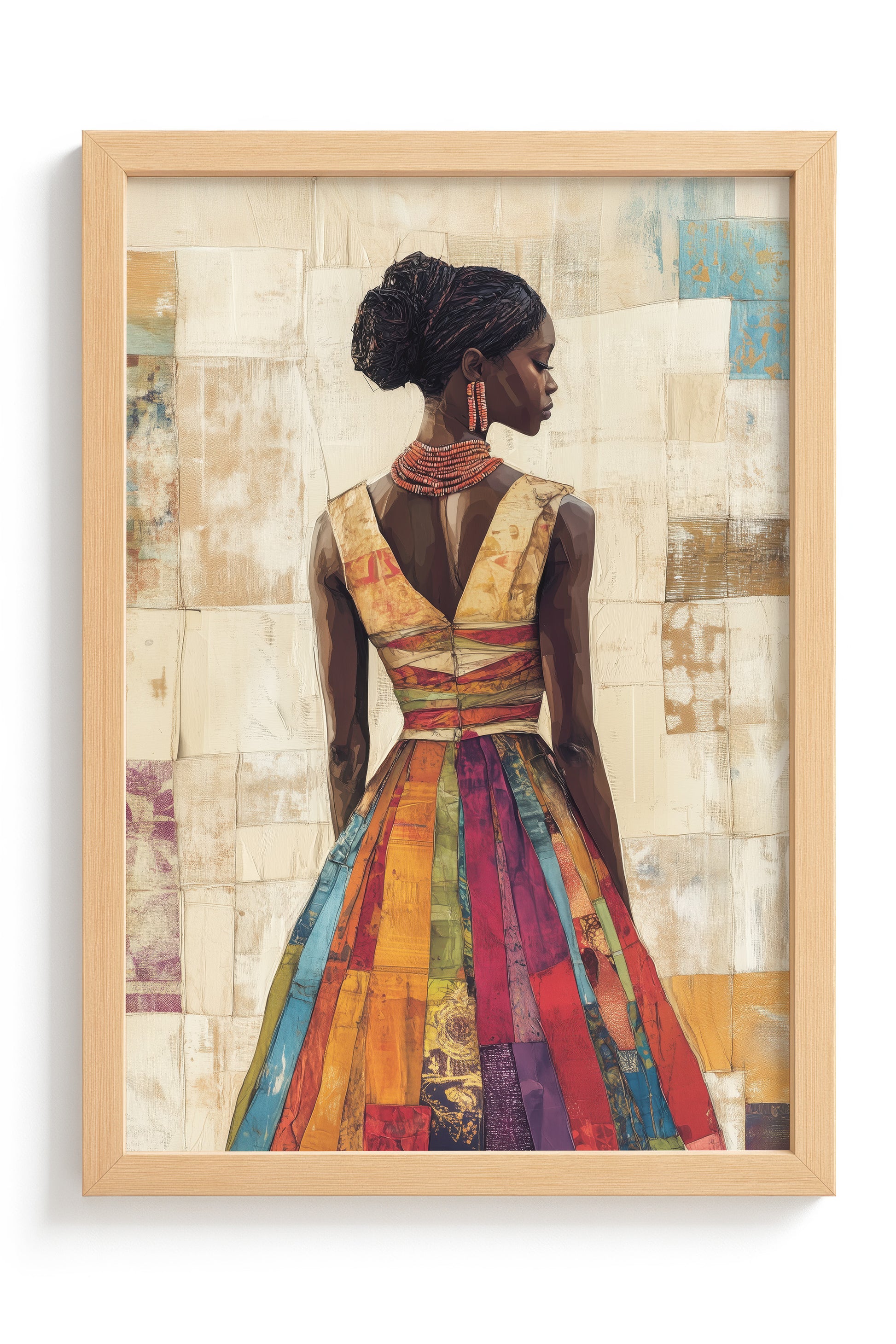 Elevate your space with this stunning minimalist collage art, celebrating African heritage and timeless elegance. A regal African woman, her silhouette adorned in vibrant, torn-paper textures, stands against a warm beige canvas.