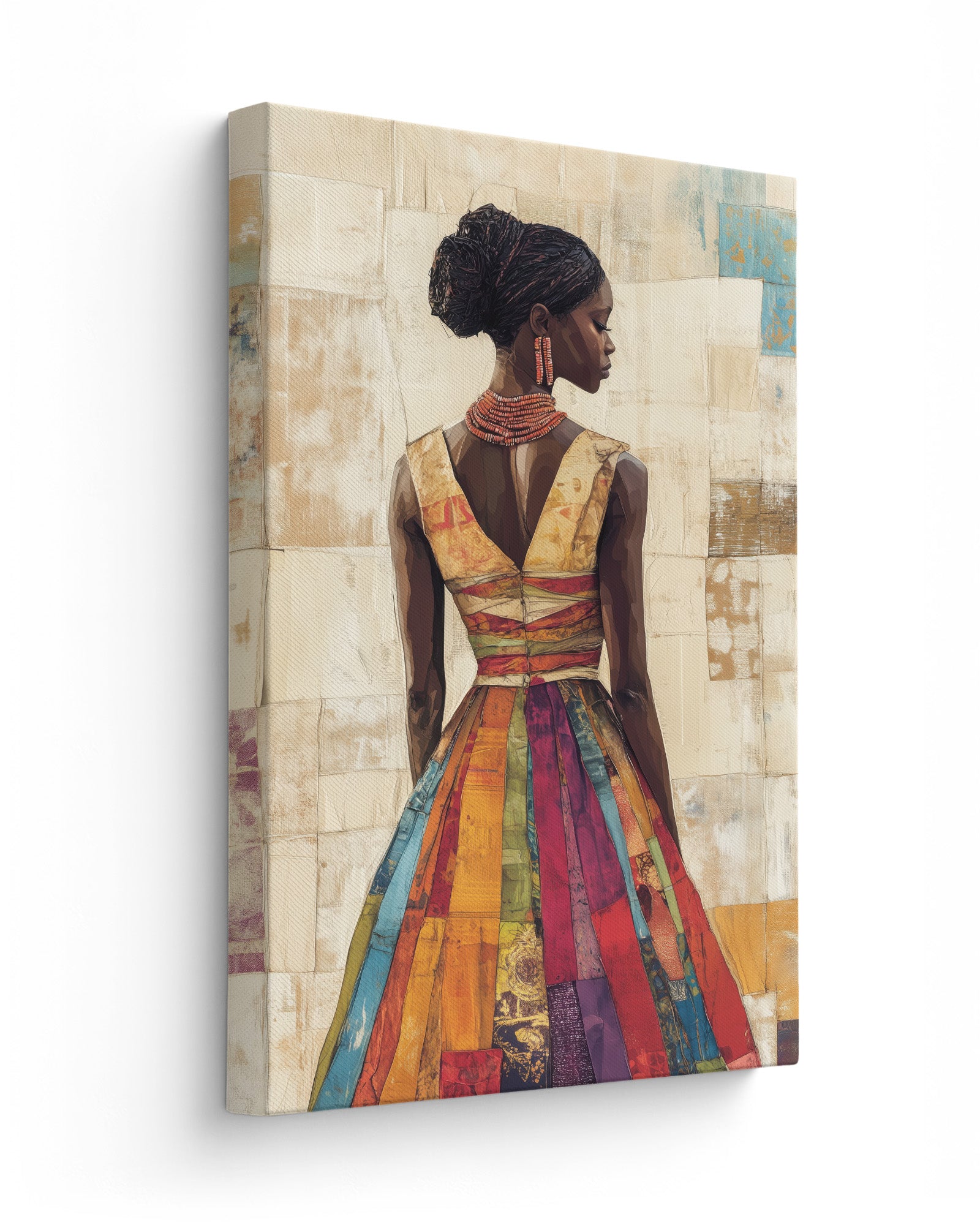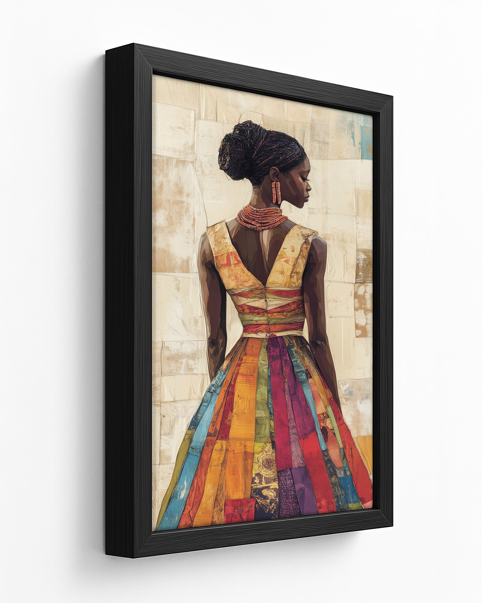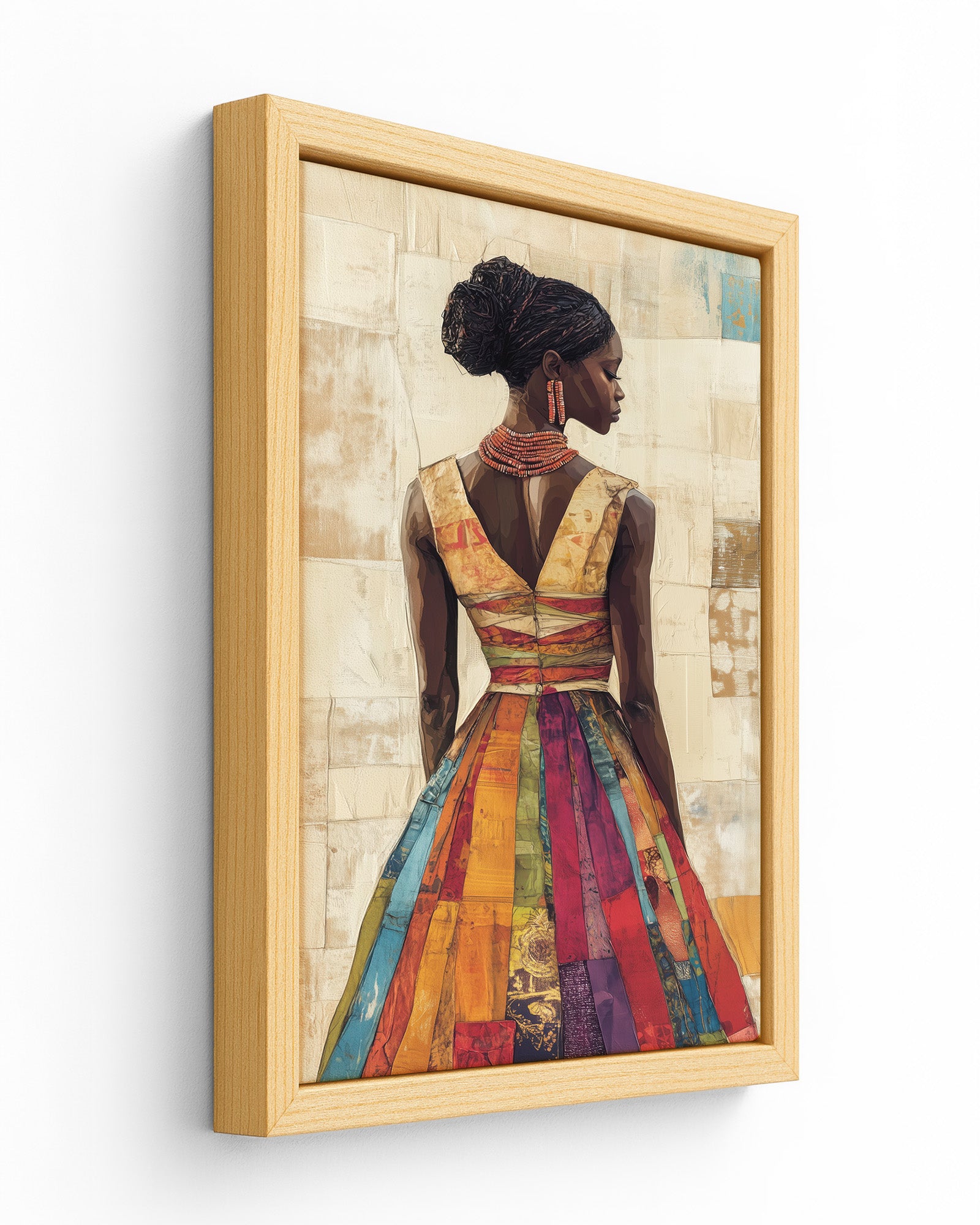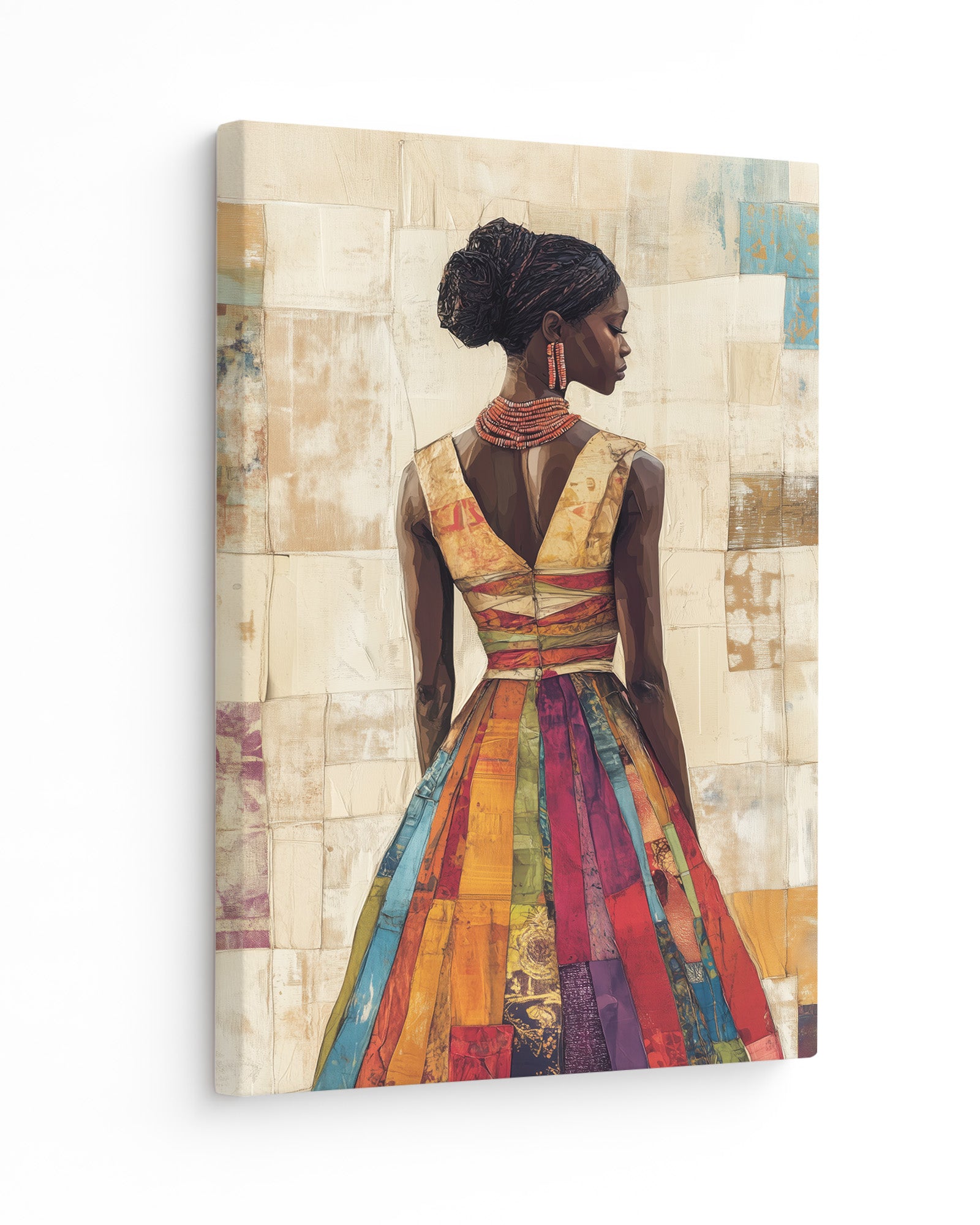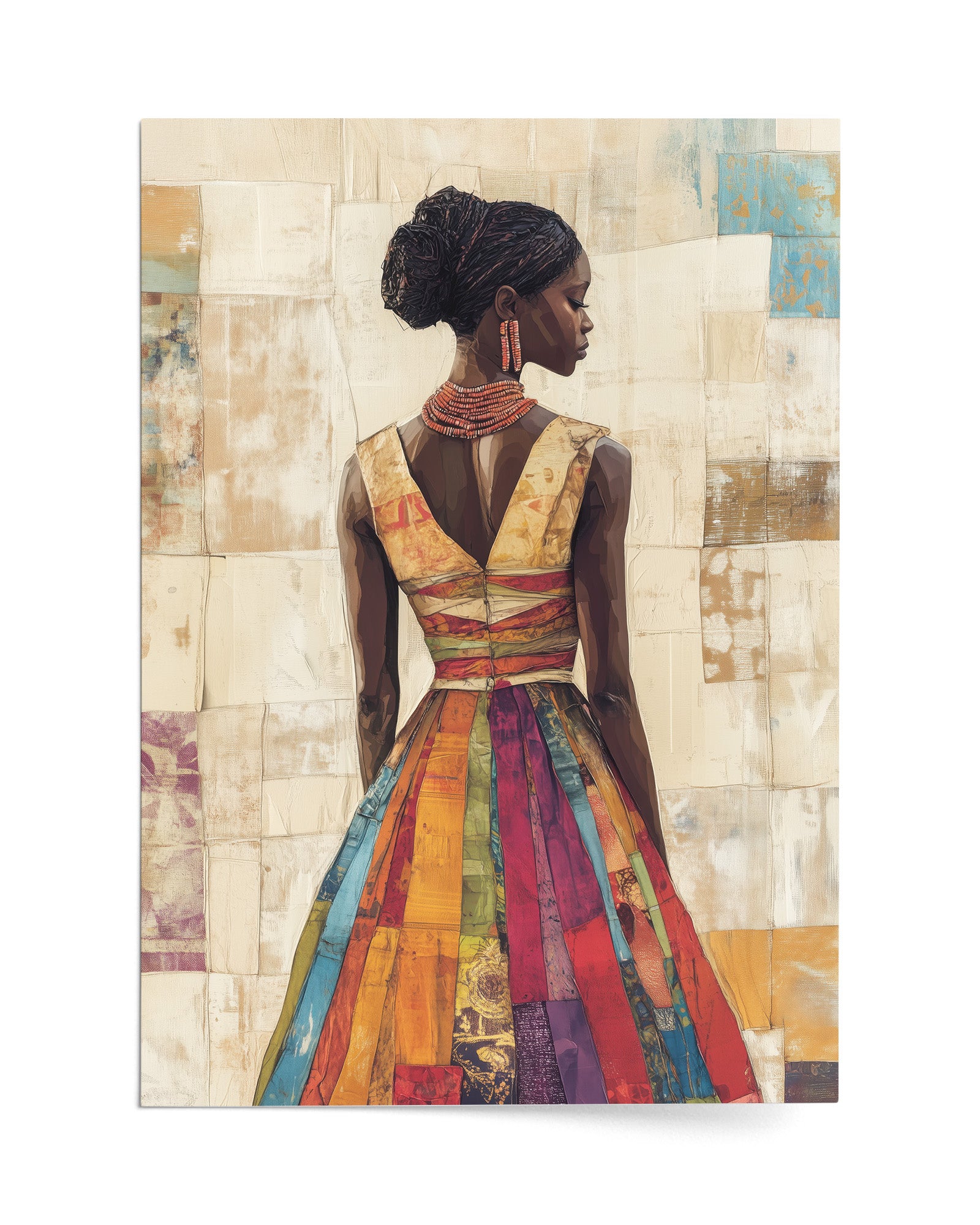 Elevate your space with this stunning minimalist collage art, celebrating African heritage and timeless elegance. A regal African woman, her silhouette adorned in vibrant, torn-paper textures, stands against a warm beige canvas.