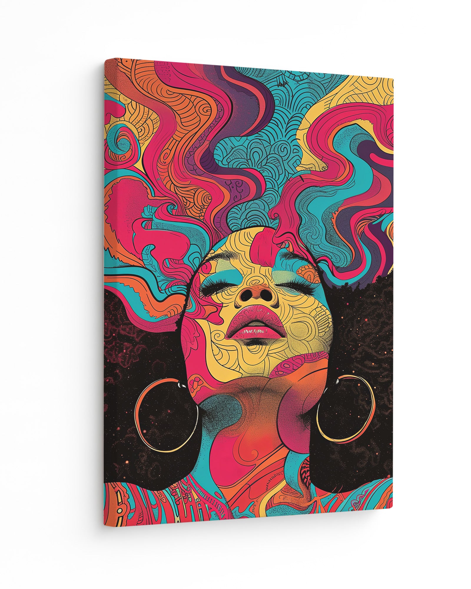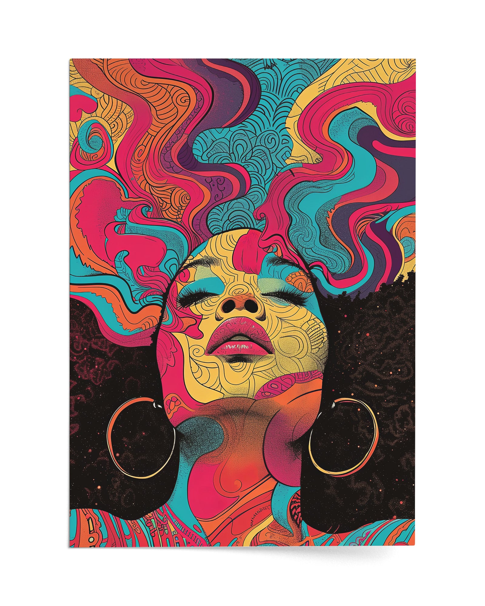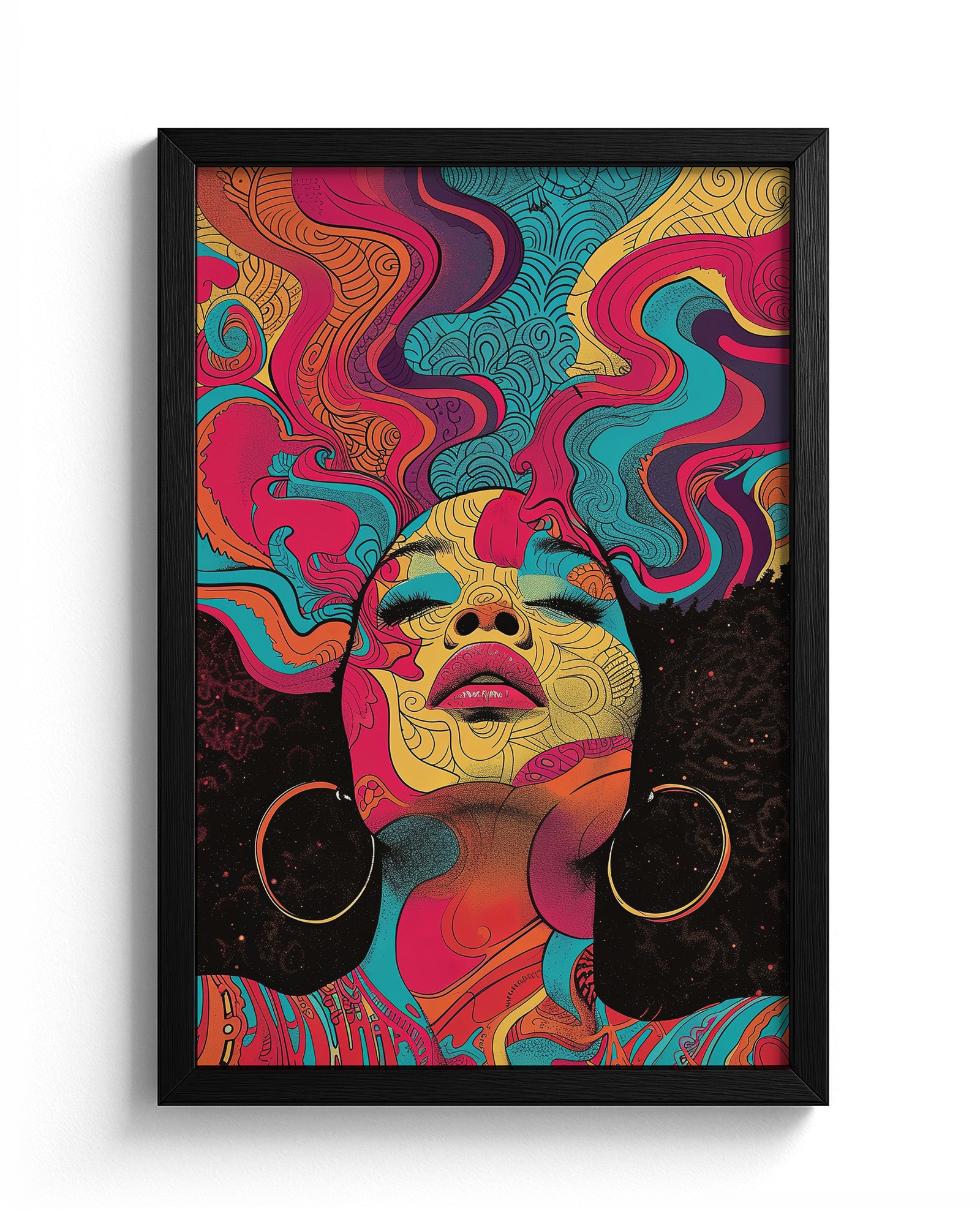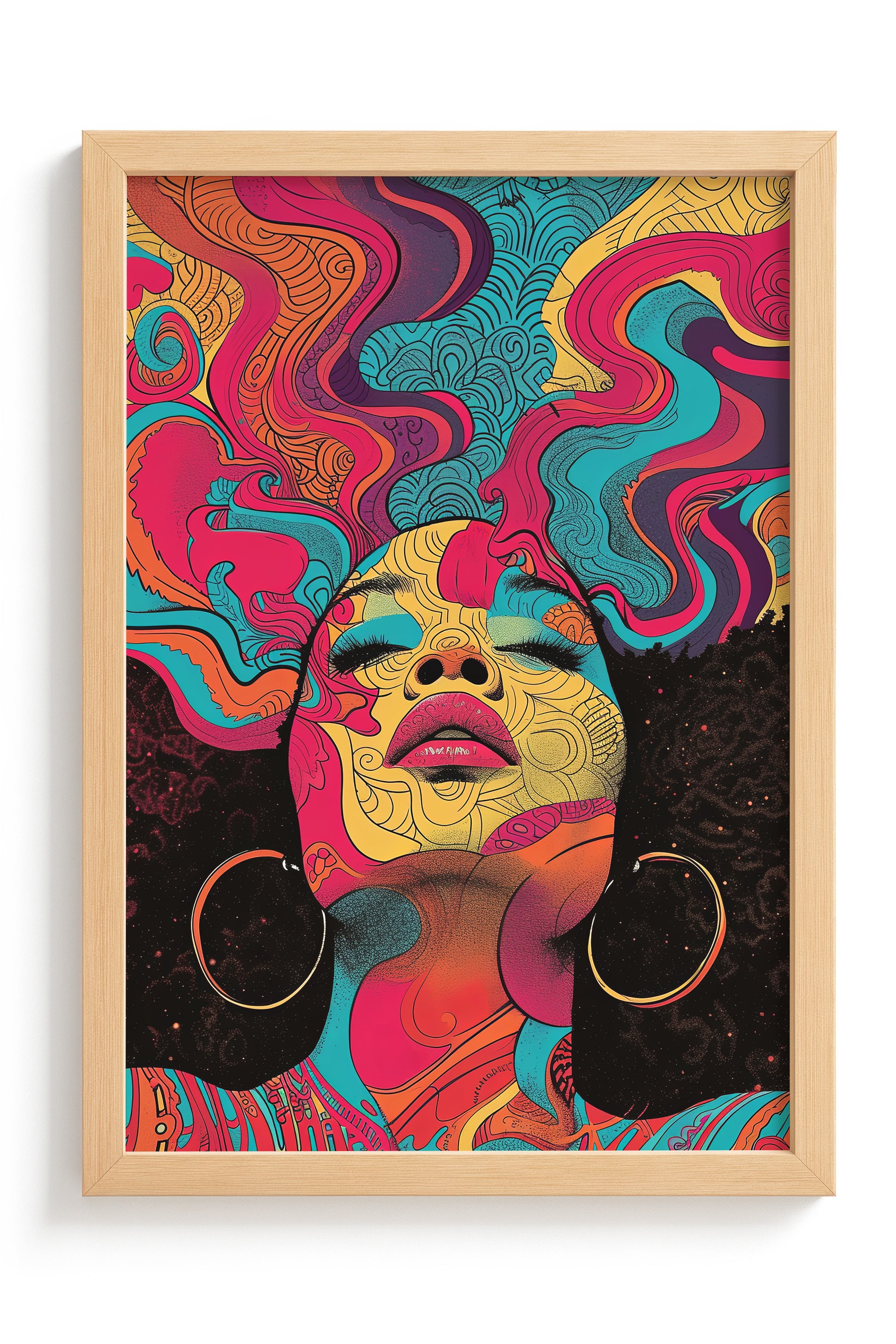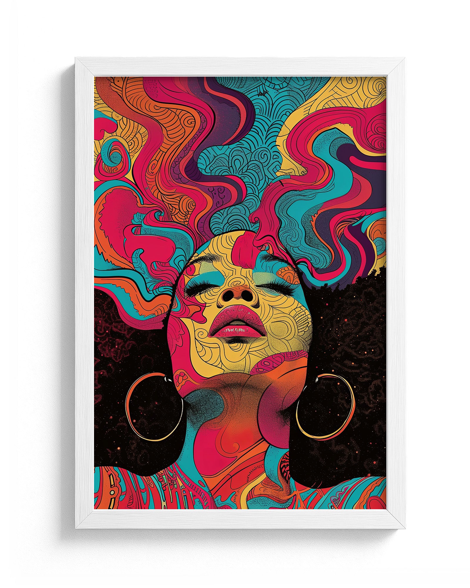 Immerse yourself in the vibrant energy of our painting featuring a lady adorned in abstract colours emanating from her head. This captivating artwork blends bold hues and dynamic forms, capturing the essence of creativity and self-expression.