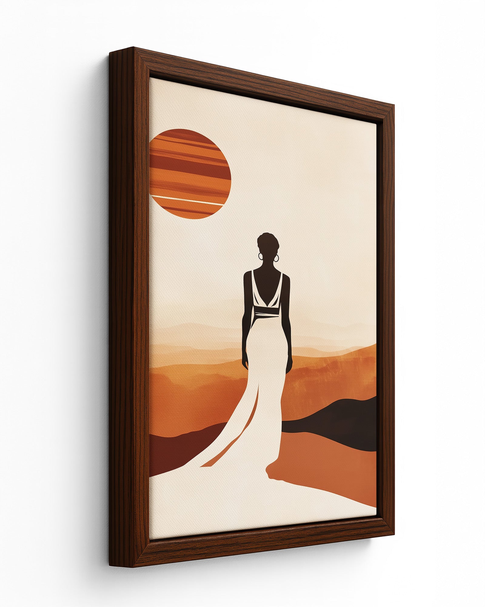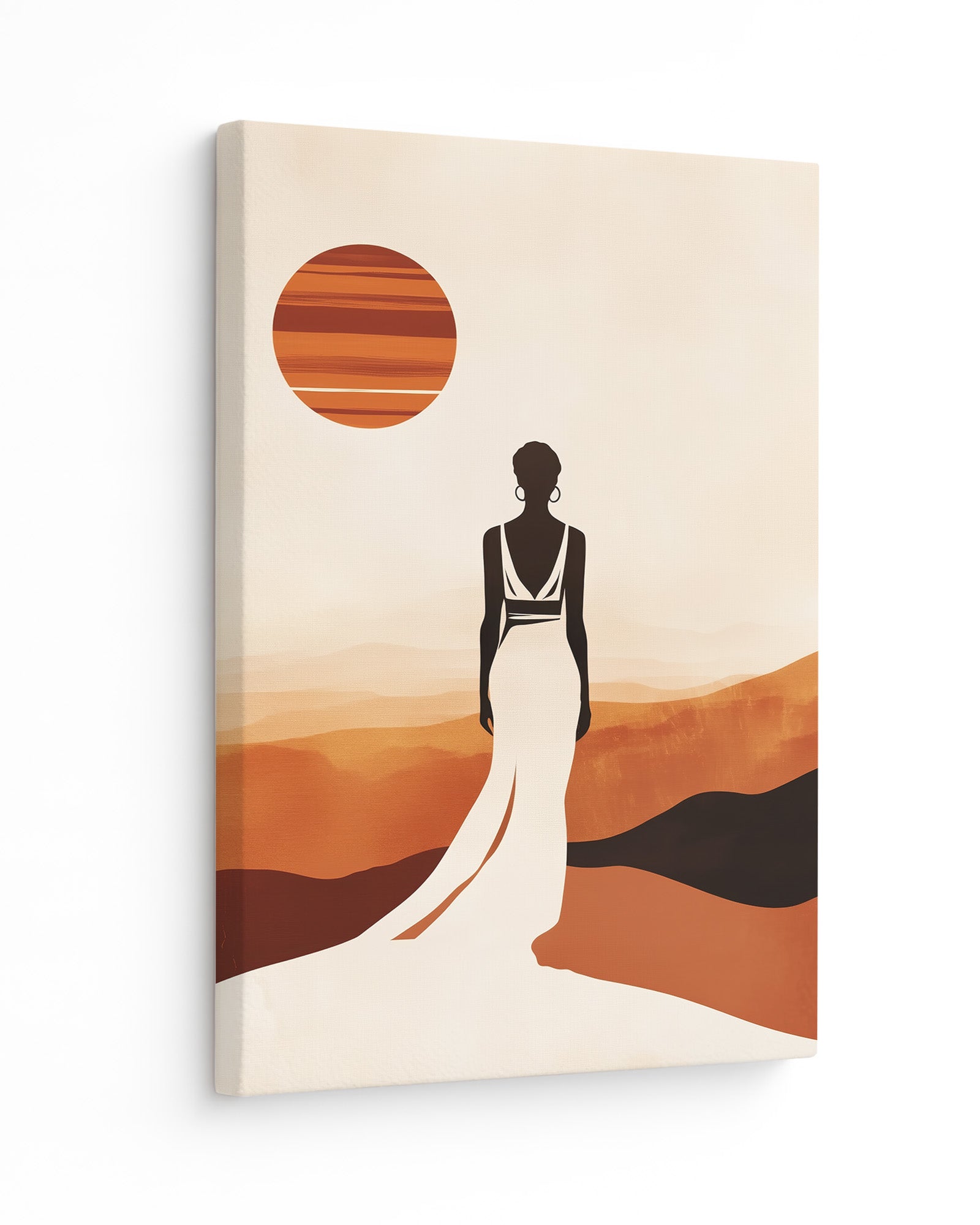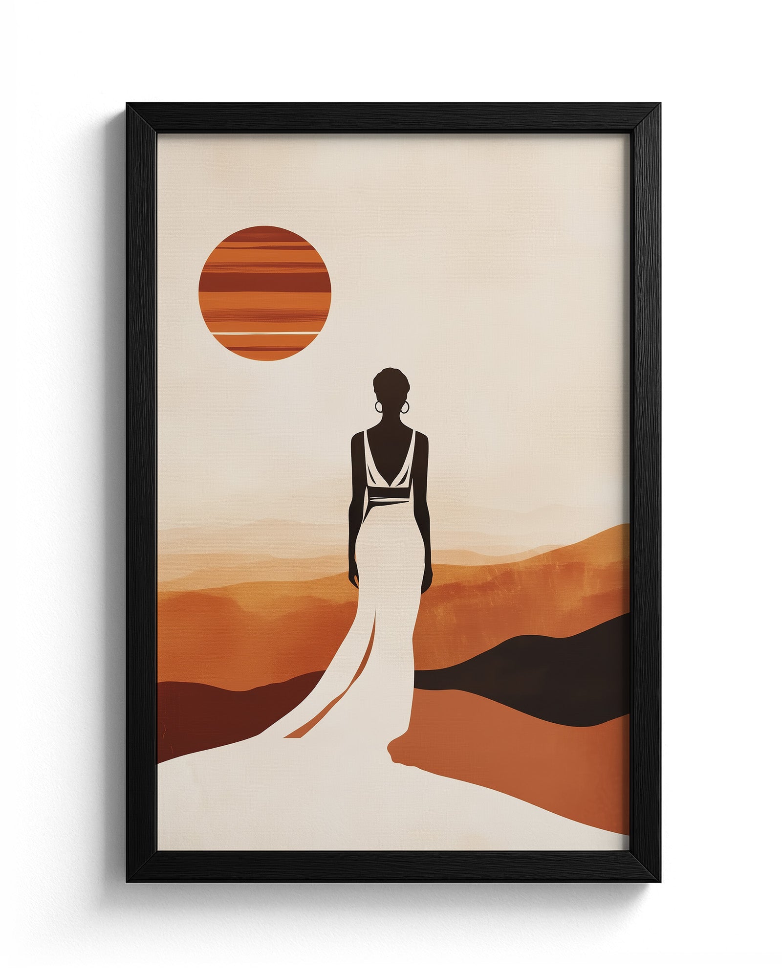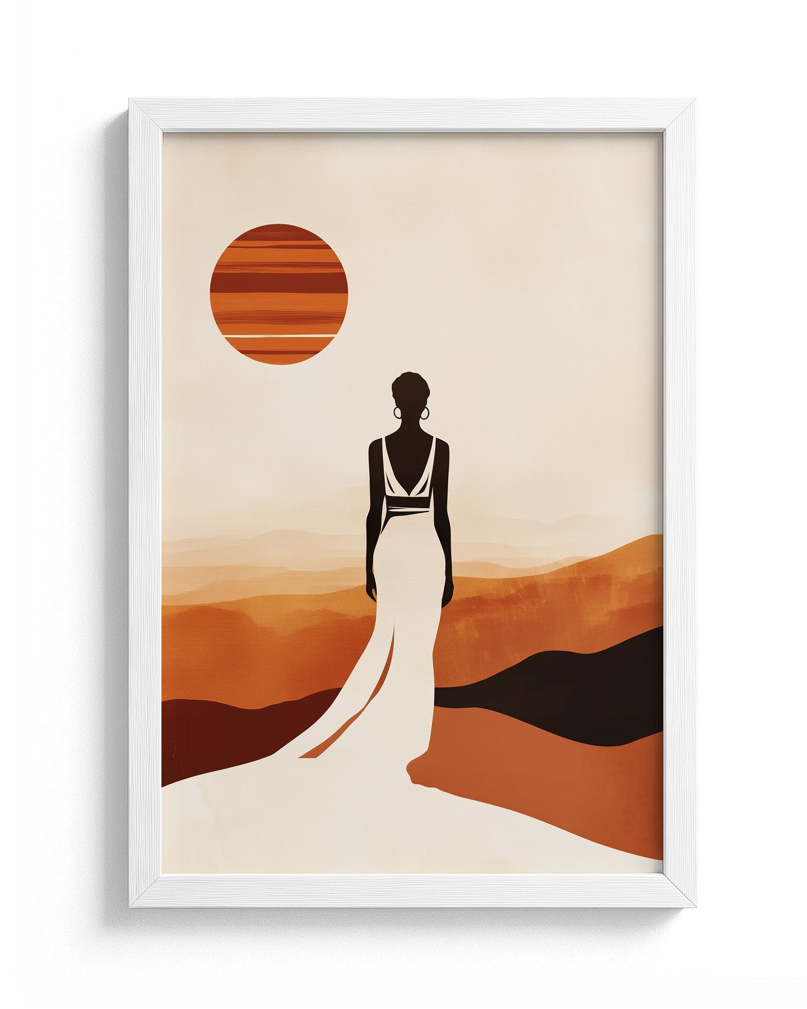 This powerful wall art depicts a woman in a flowing white gown walking into a painted sun. With layered earth-tone textures and soft gradients, it symbolises a spiritual journey, rooted in culture, strength, and connection to the land.