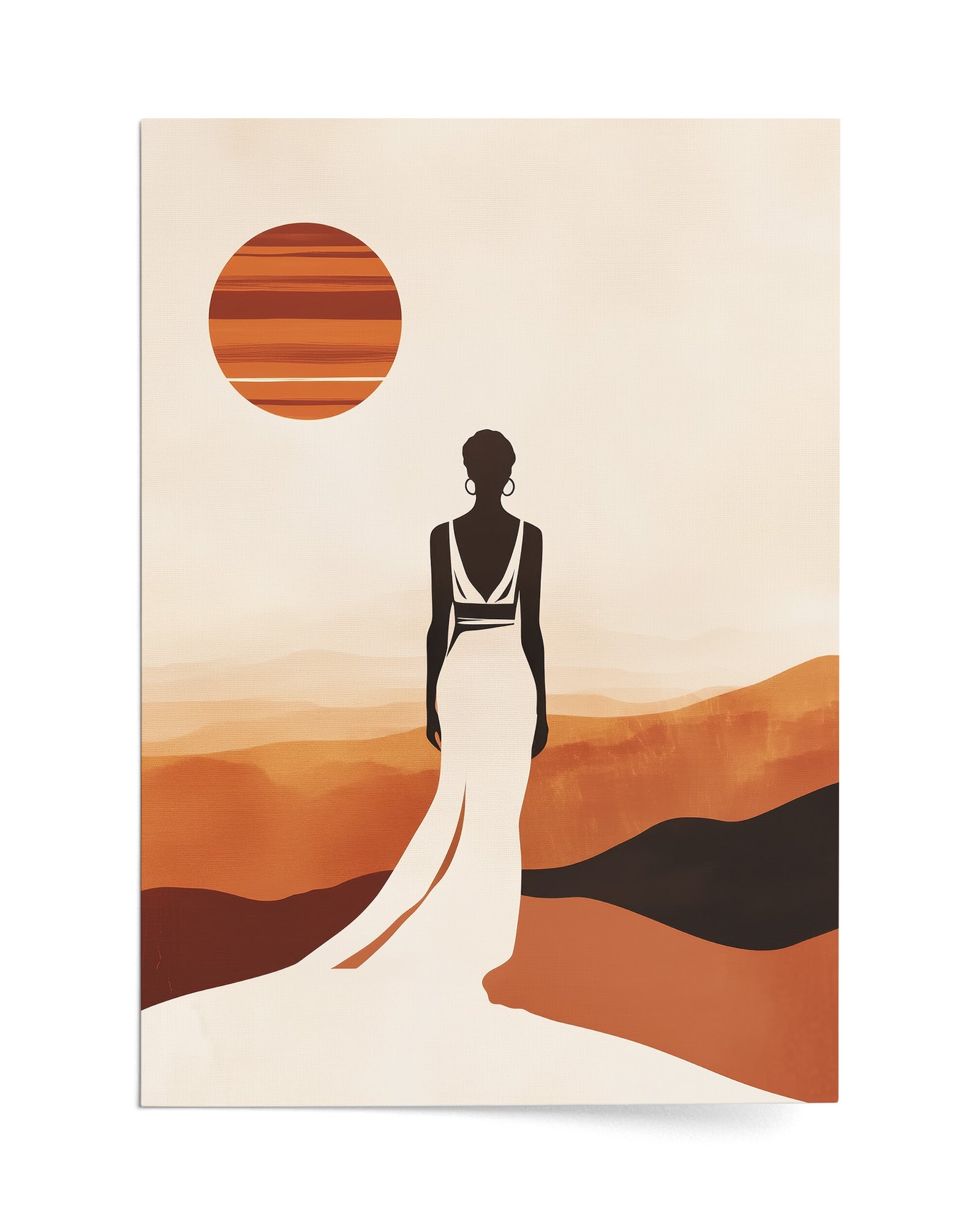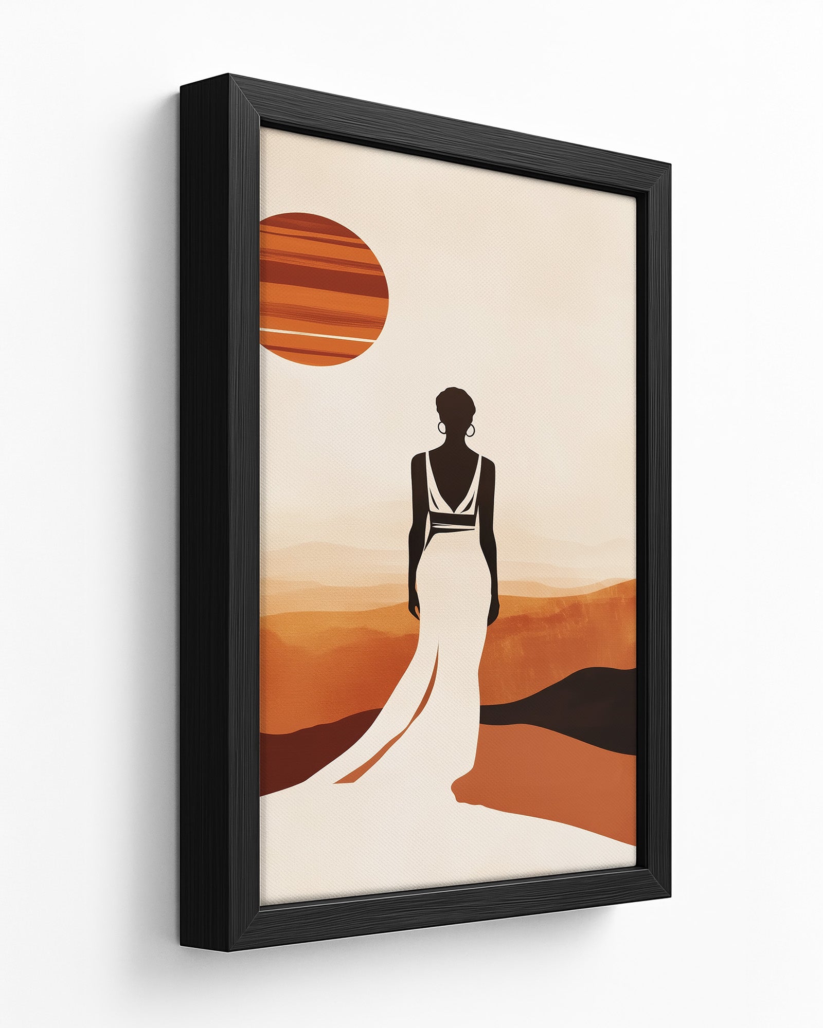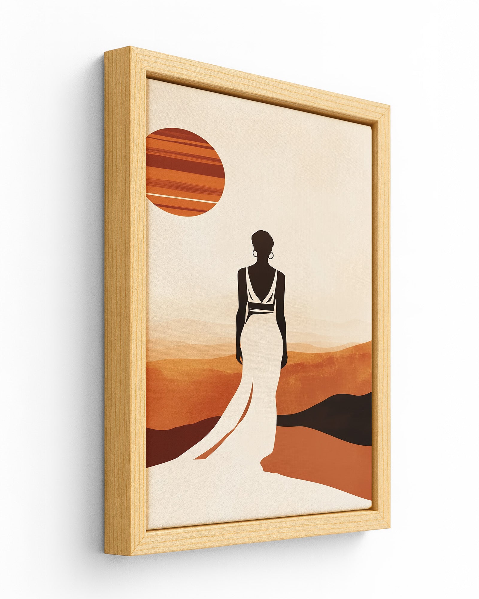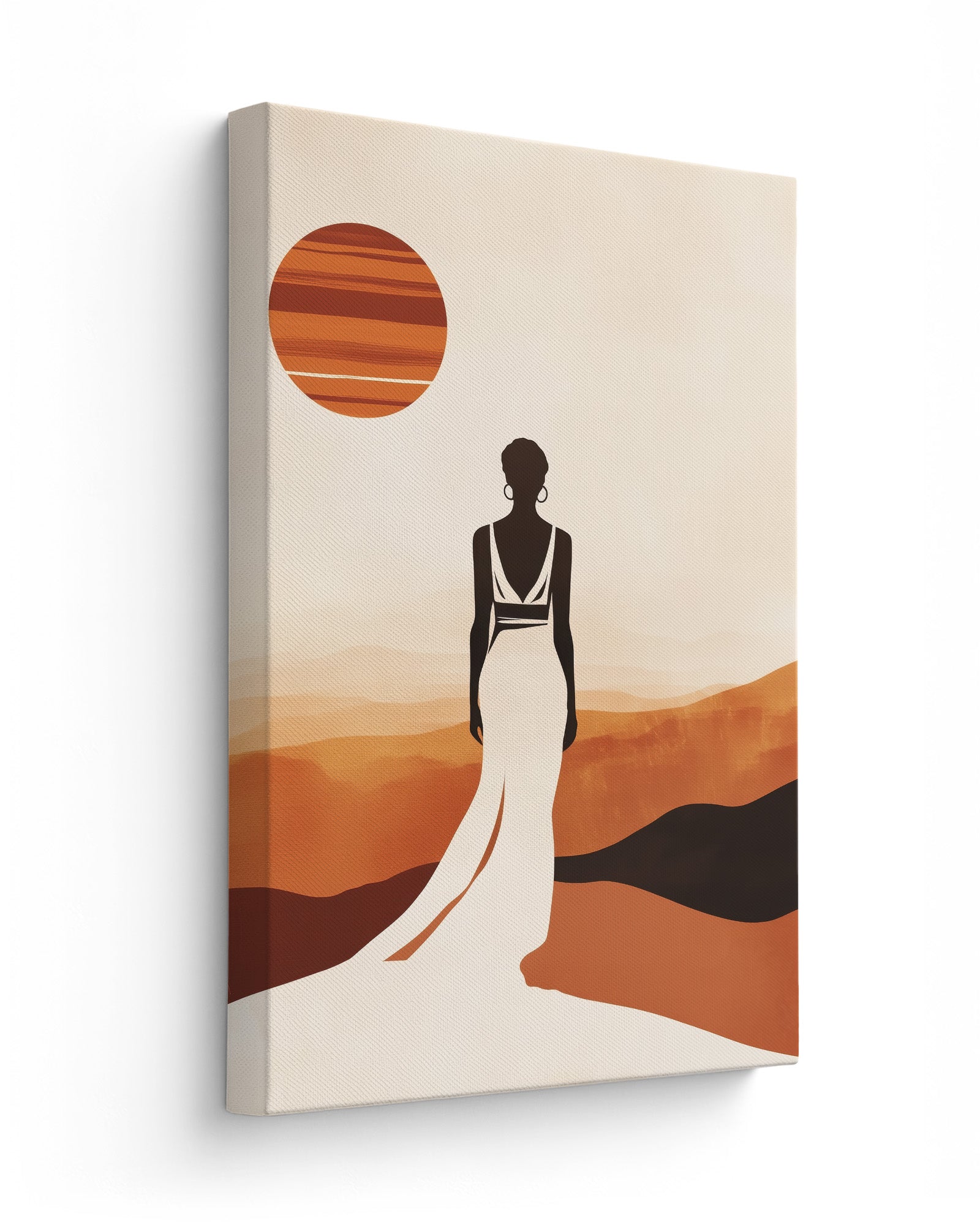 This powerful wall art depicts a woman in a flowing white gown walking into a painted sun. With layered earth-tone textures and soft gradients, it symbolises a spiritual journey, rooted in culture, strength, and connection to the land.