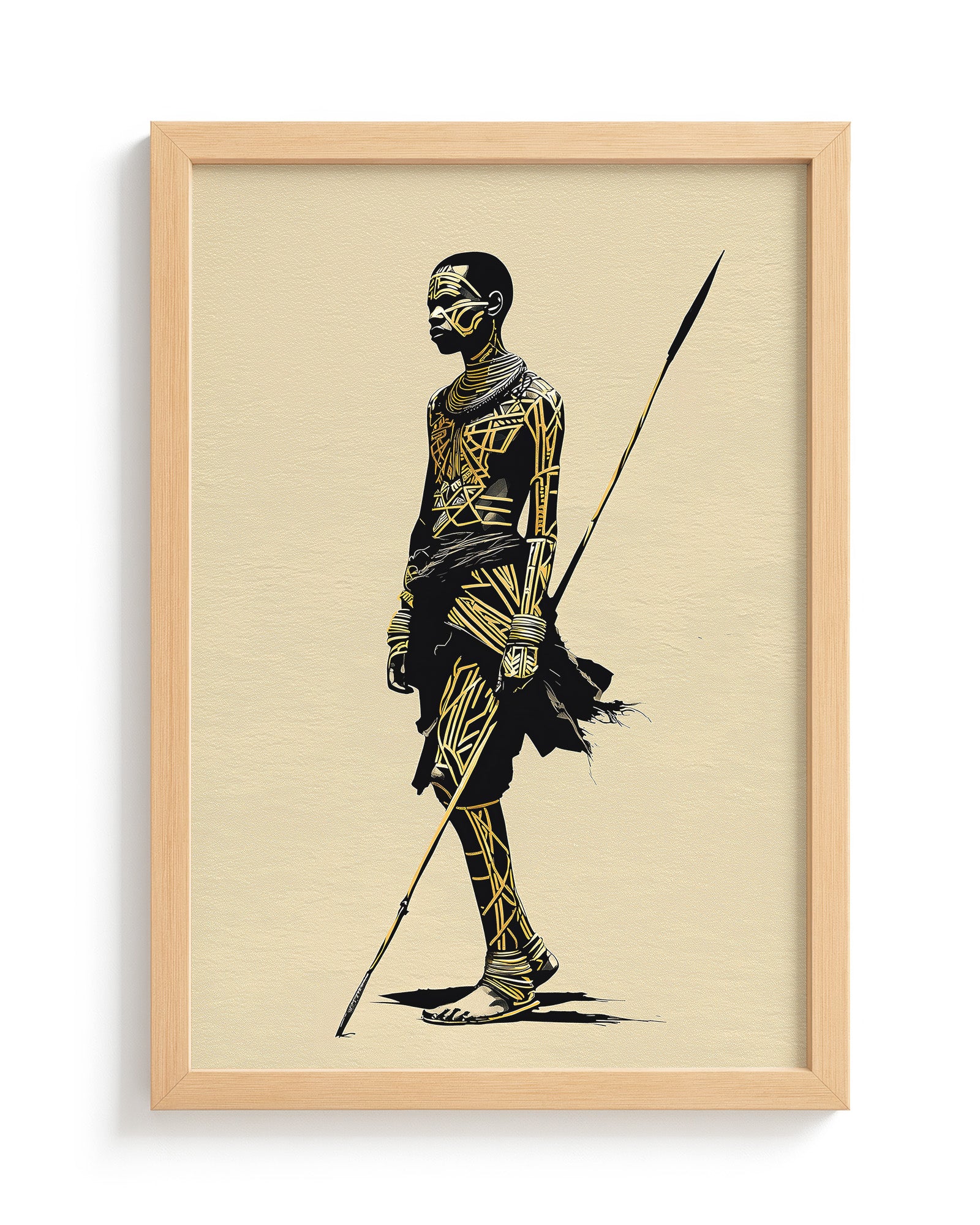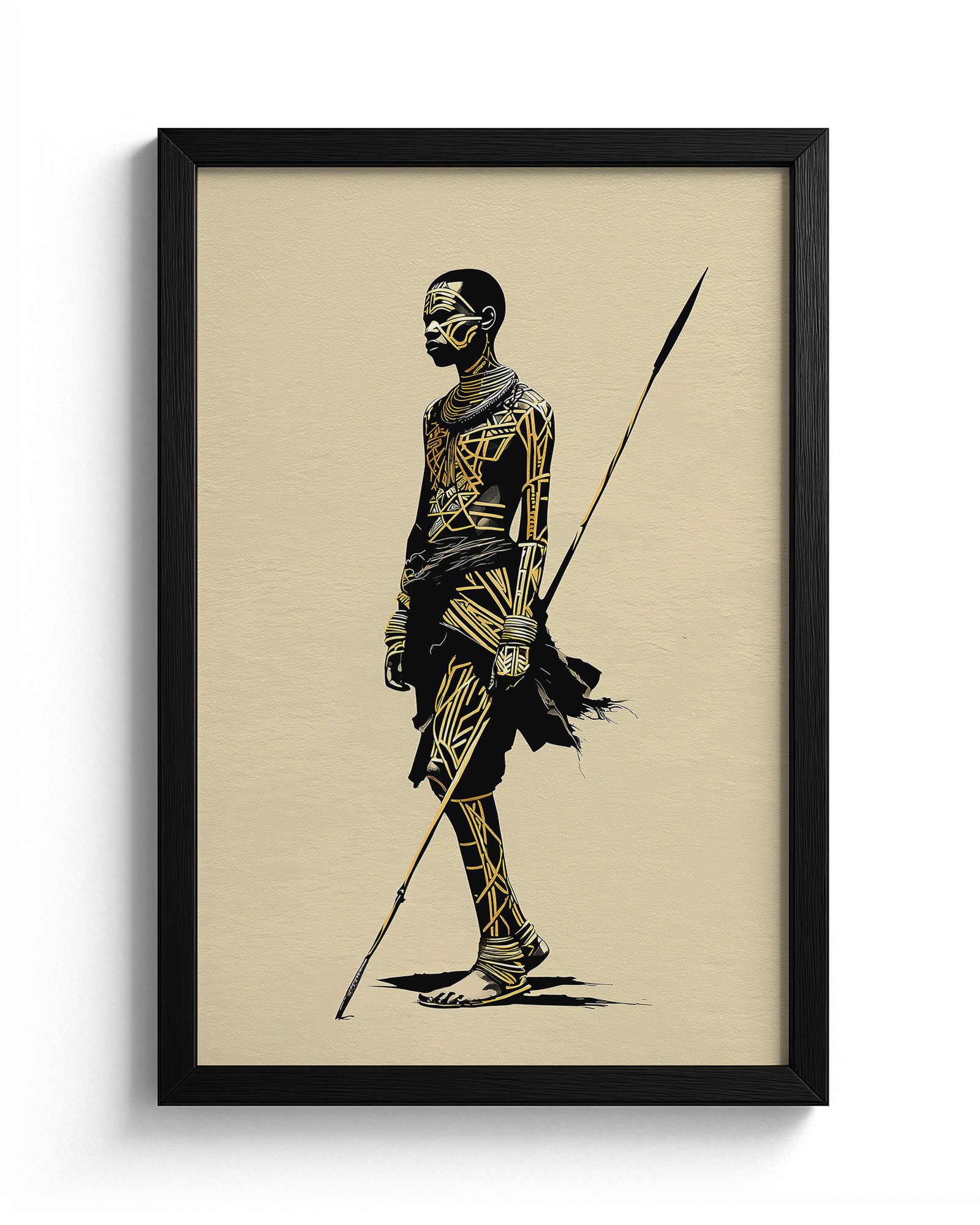 This artwork portrays a warrior inspired by the Karo people of Ethiopia, an indigenous community living along the banks of the Omo River in the Lower Omo Valley. The Karo are widely recognised for their striking body painting traditions, where intricate patterns made from white chalk, ash, and natural pigments are applied across the skin. These geometric designs are not only decorative but also communicate identity, status, and participation in ceremonies or moments of social significance.