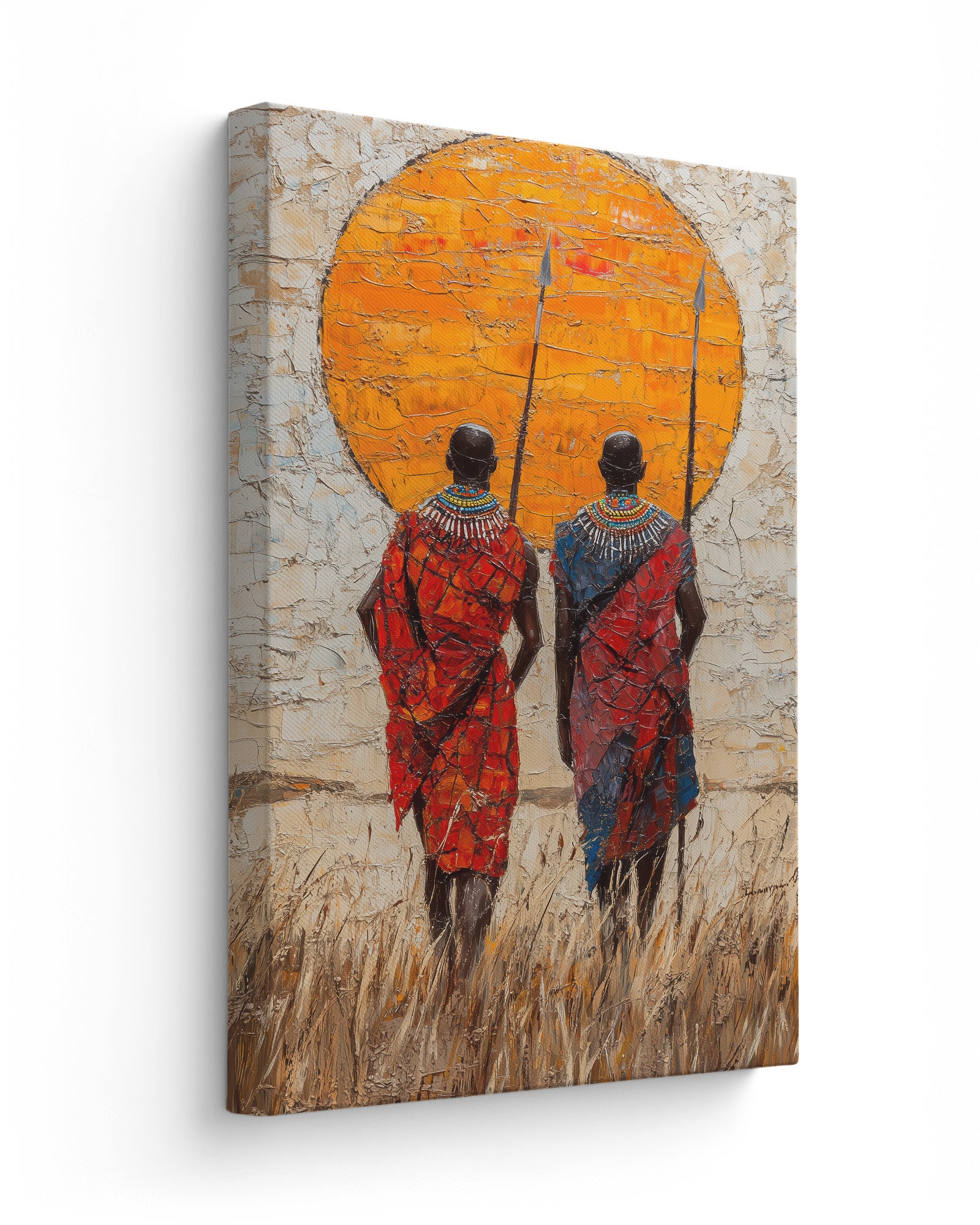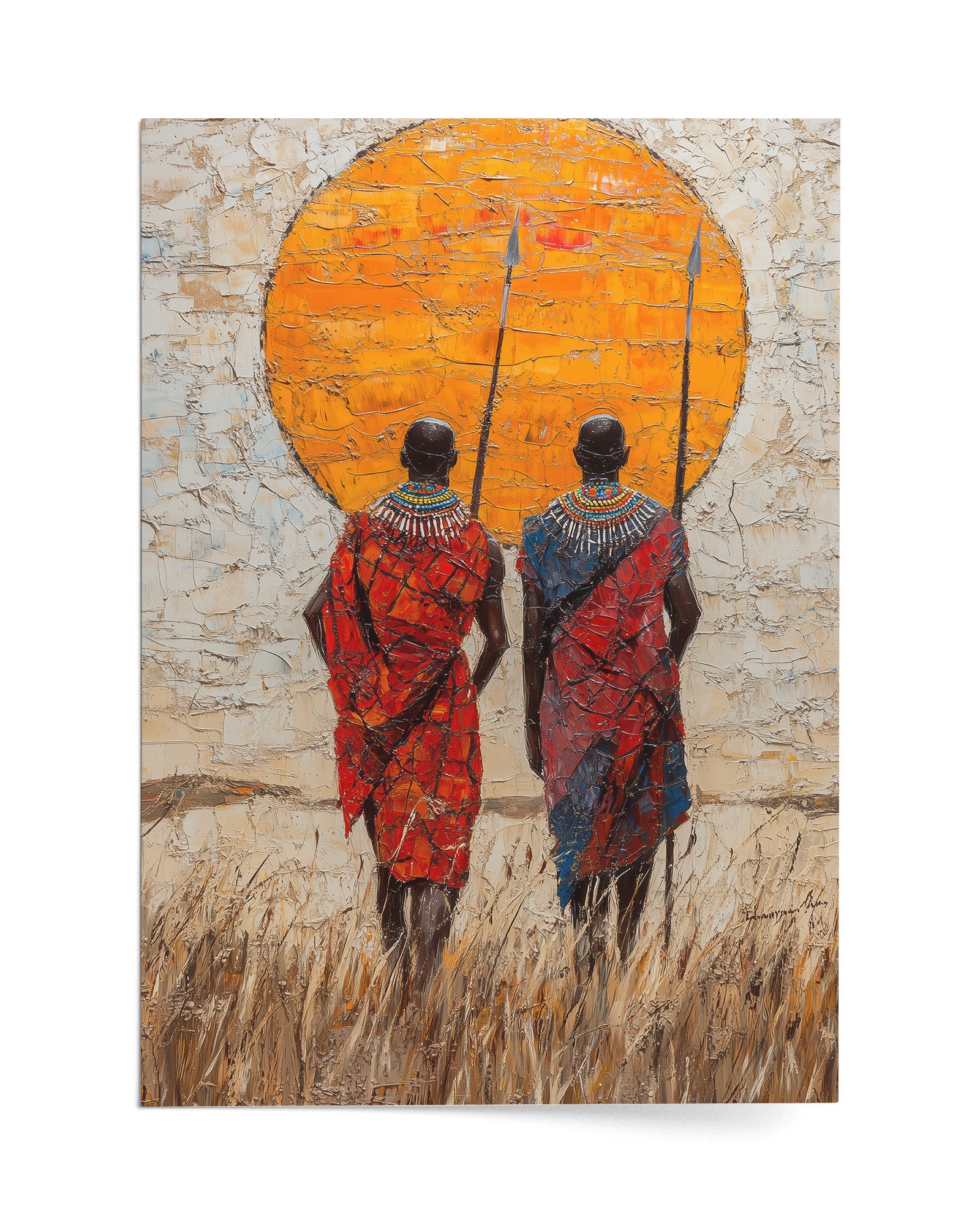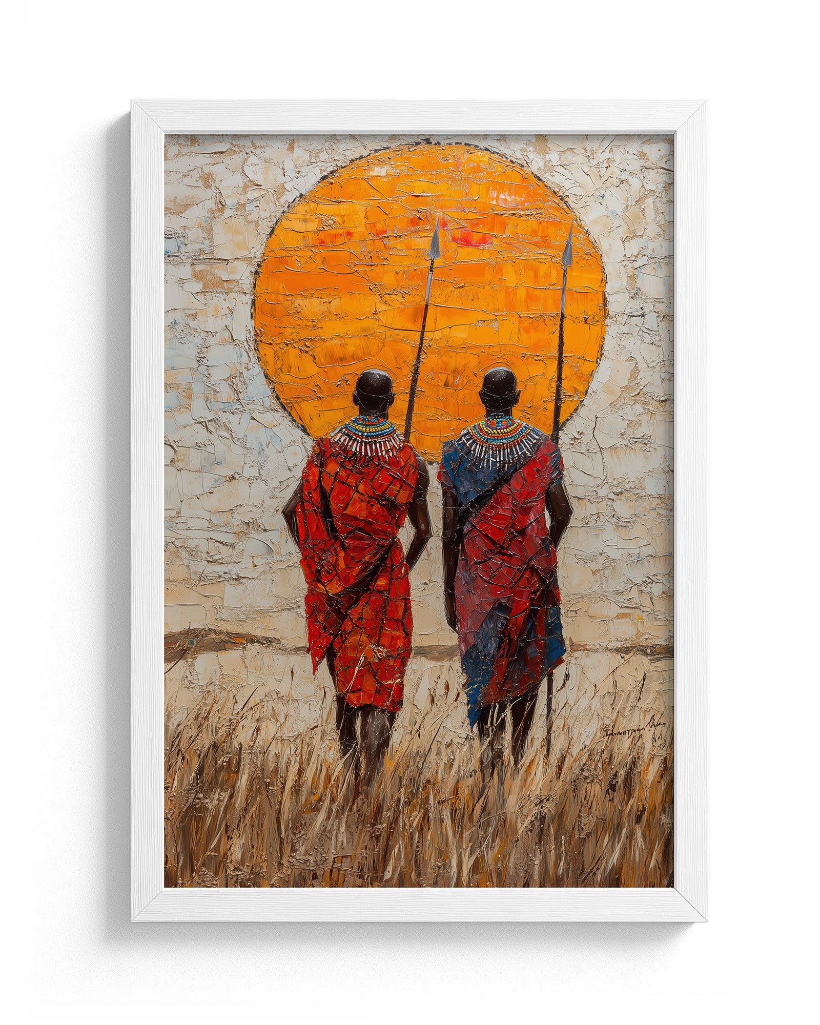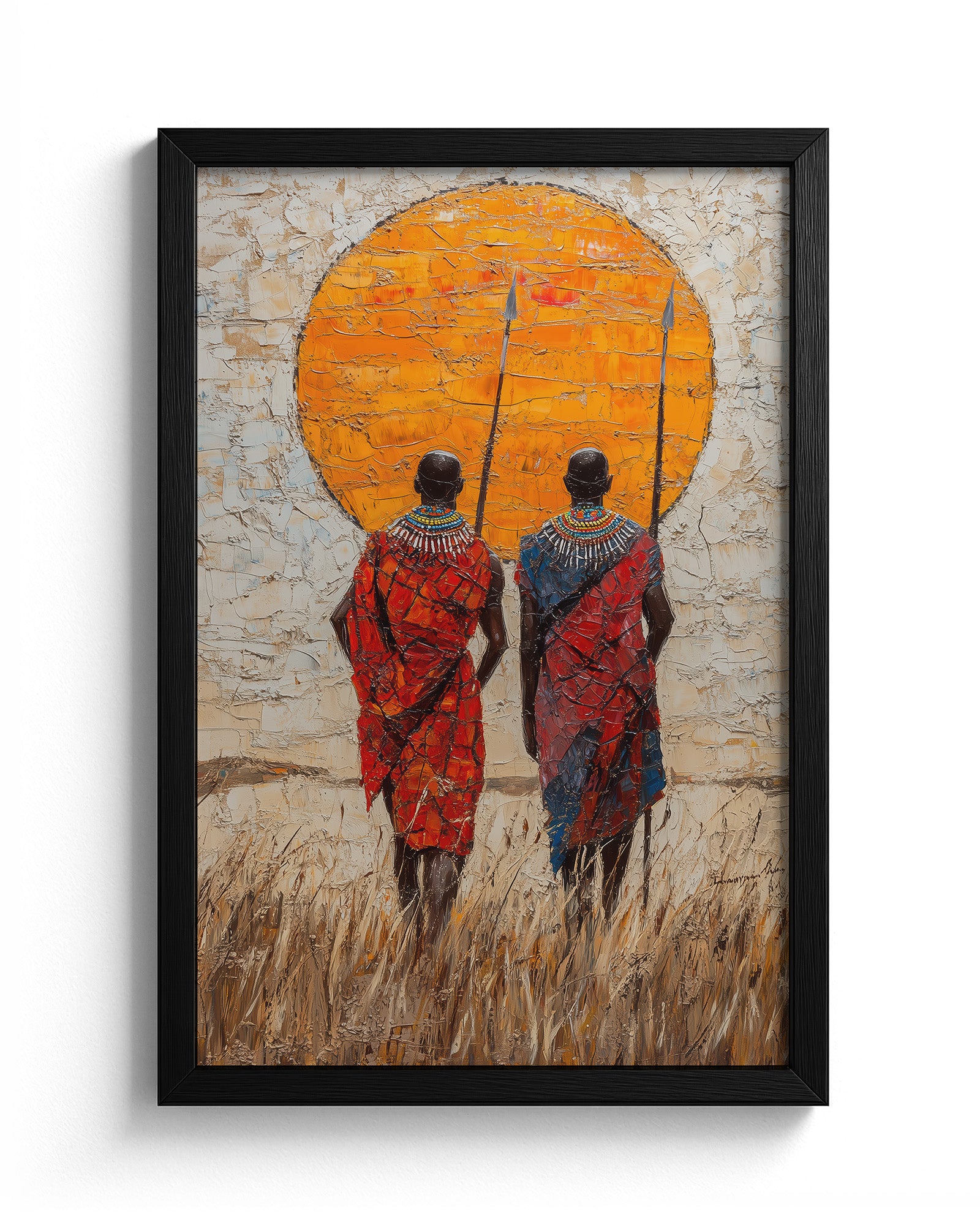 This captivating oil painting portrays a group of Maasai people standing tall, facing the rising sun as they look into the vast expanse of the African savannah. Dressed in their traditional gowns, the Maasai are silhouetted against the warm glow of the horizon, symbolising resilience, tradition, and their deep connection to the land.