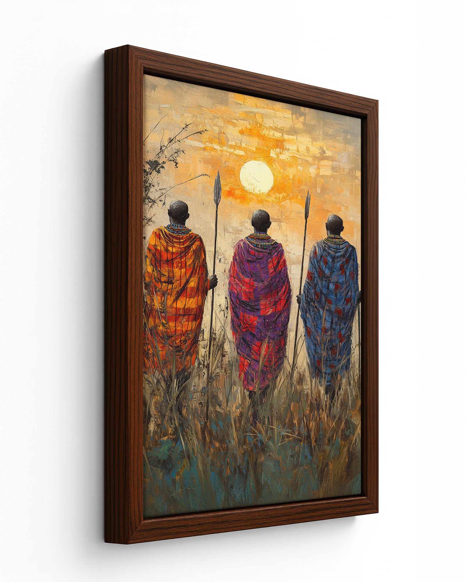 This captivating oil painting portrays a group of Maasai people standing tall, facing the rising sun as they look into the vast expanse of the African savannah. Dressed in their traditional gowns, the Maasai are silhouetted against the warm glow of the horizon, symbolising resilience, tradition, and their deep connection to the land.