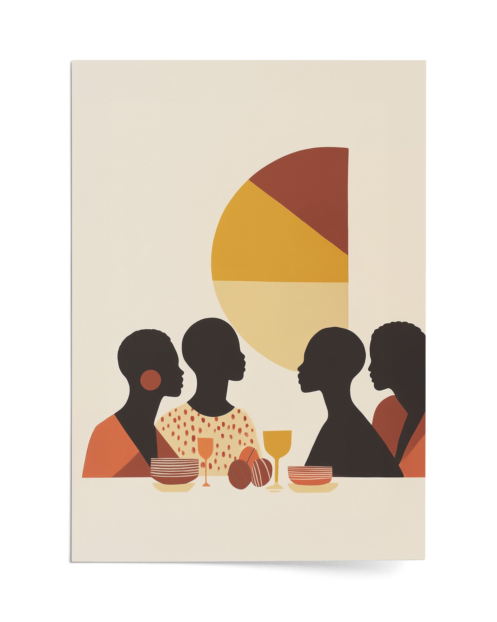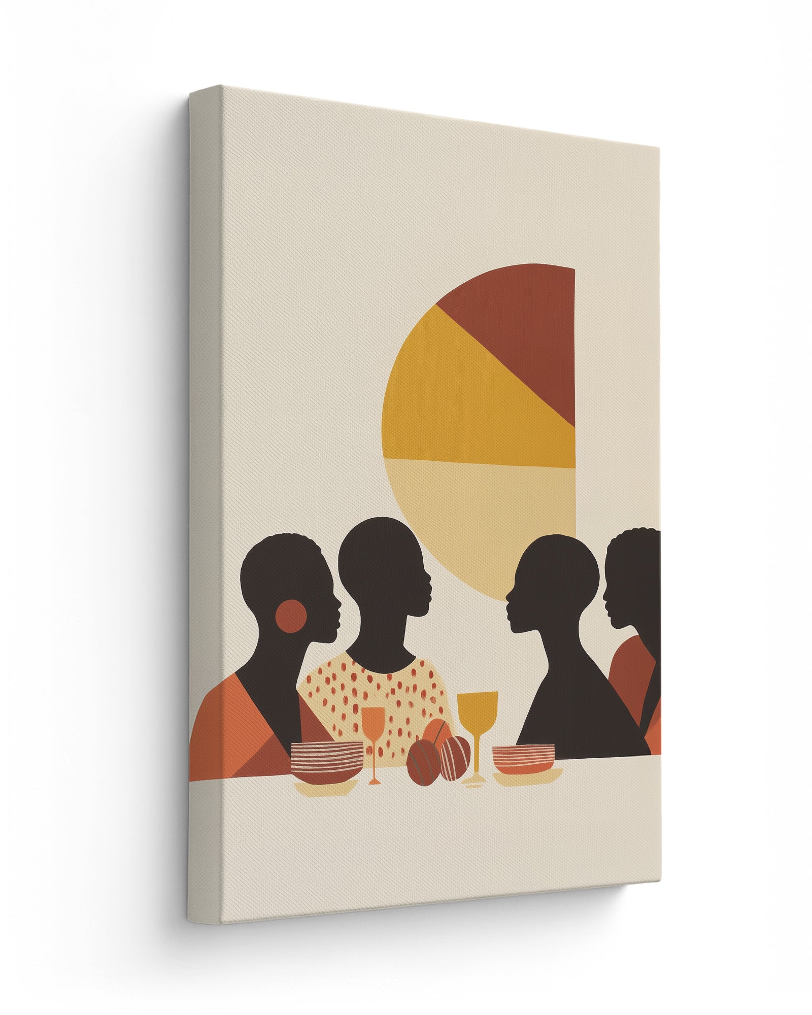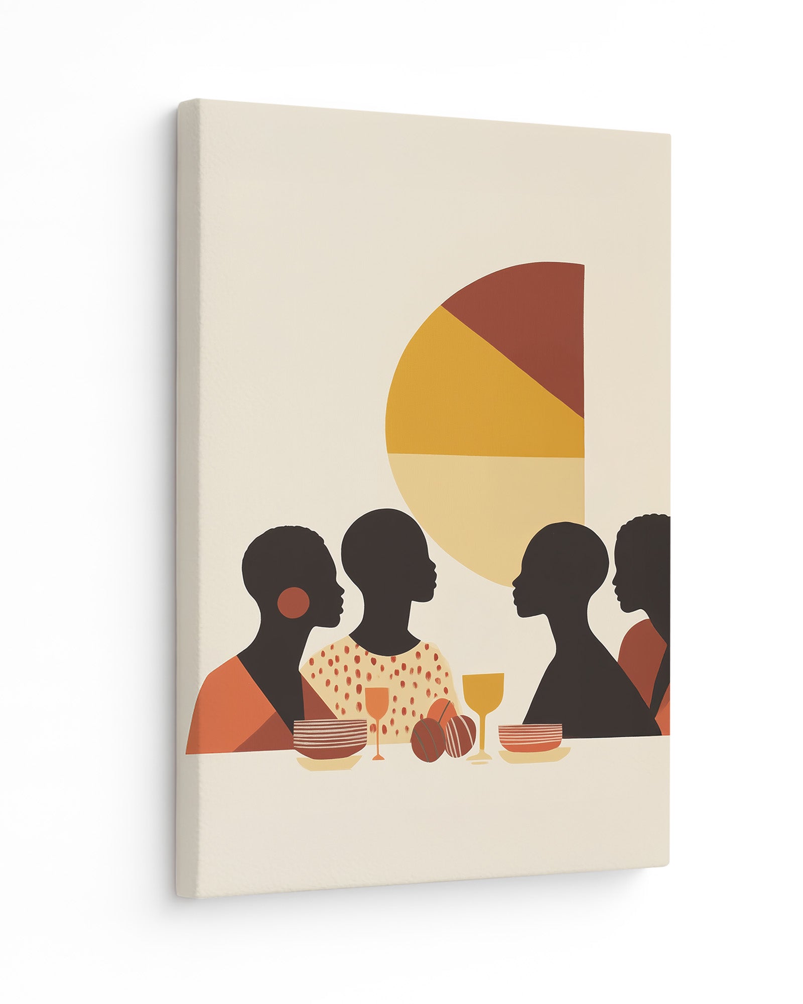 This vibrant contemporary painting captures a family gathered around a dinner table, rendered in the distinctive geometric style. The subjects, dressed in harmonising neutral attire, are surrounded by bold geometric patterns and shapes that create a dynamic yet intimate atmosphere. Warm lighting casts gentle shadows across their joyful expressions, highlighting the emotional connection between family members.