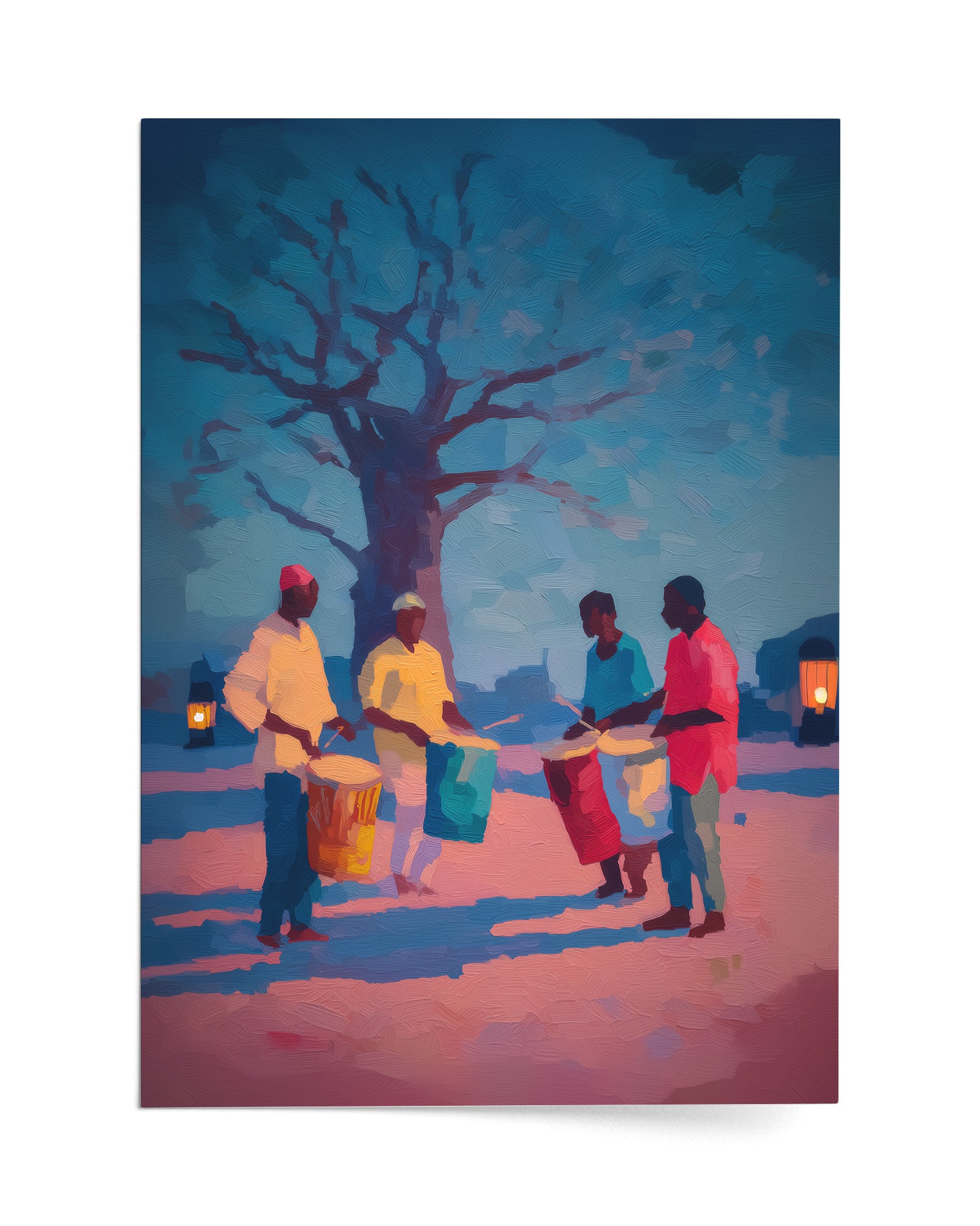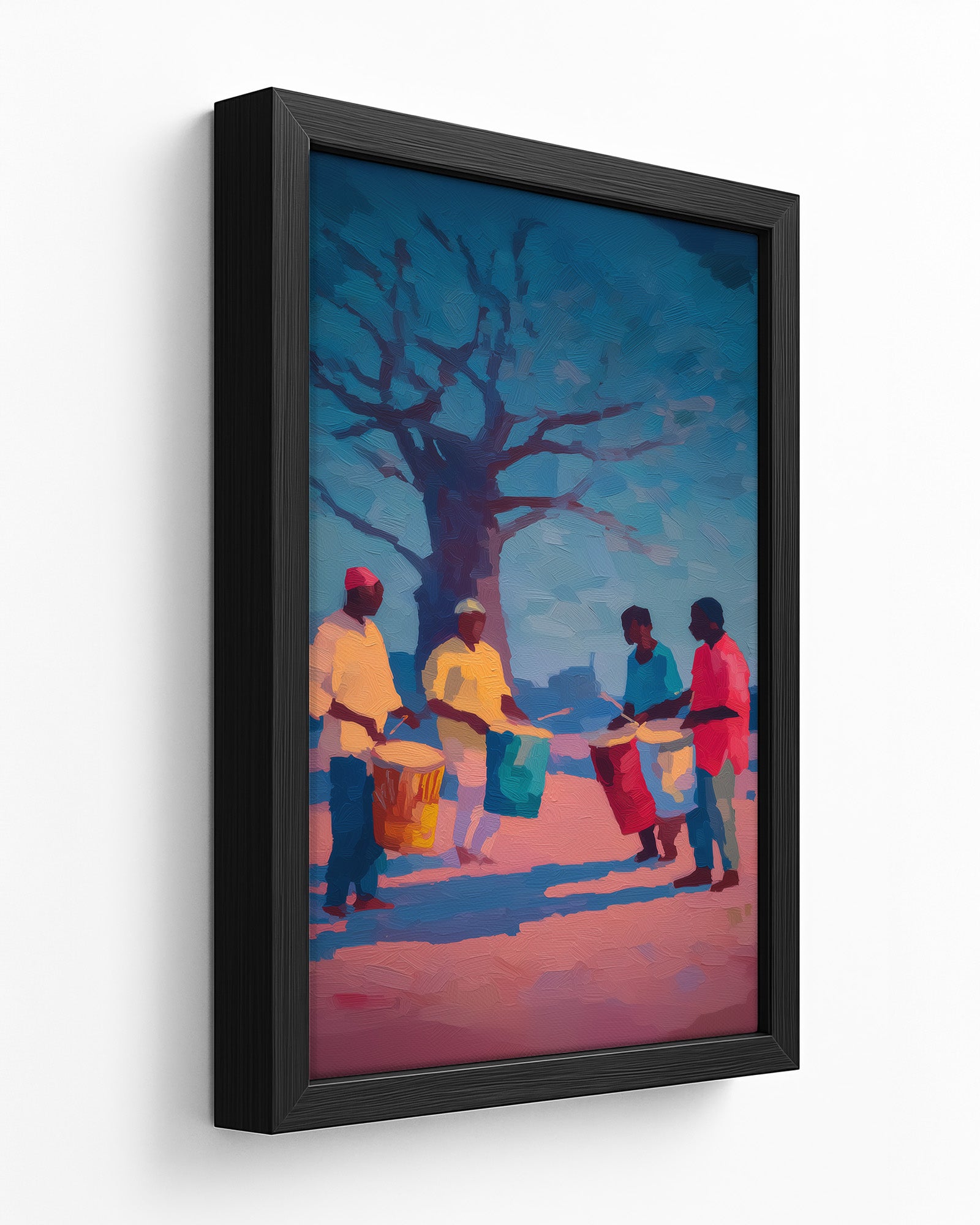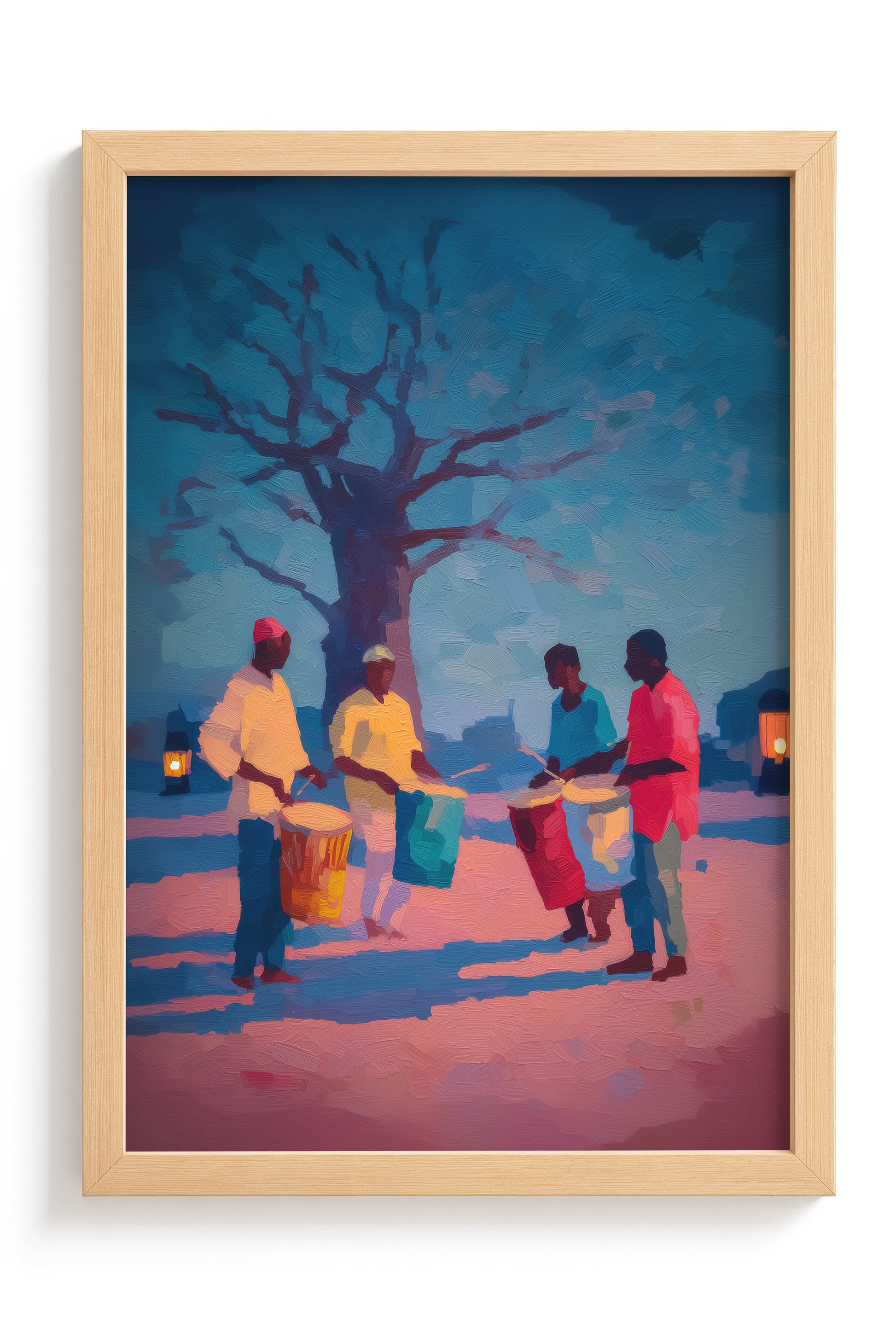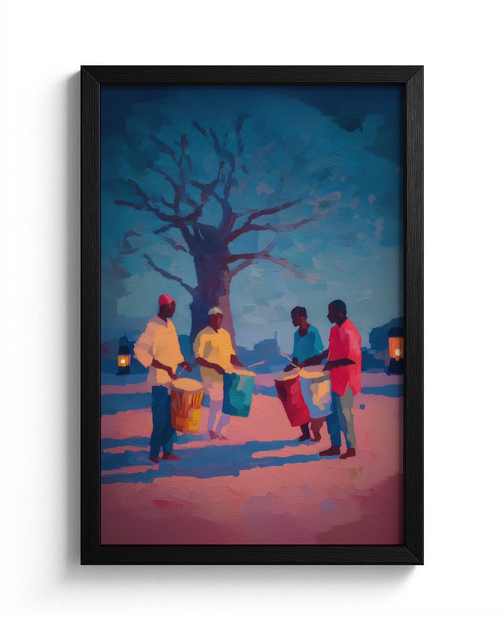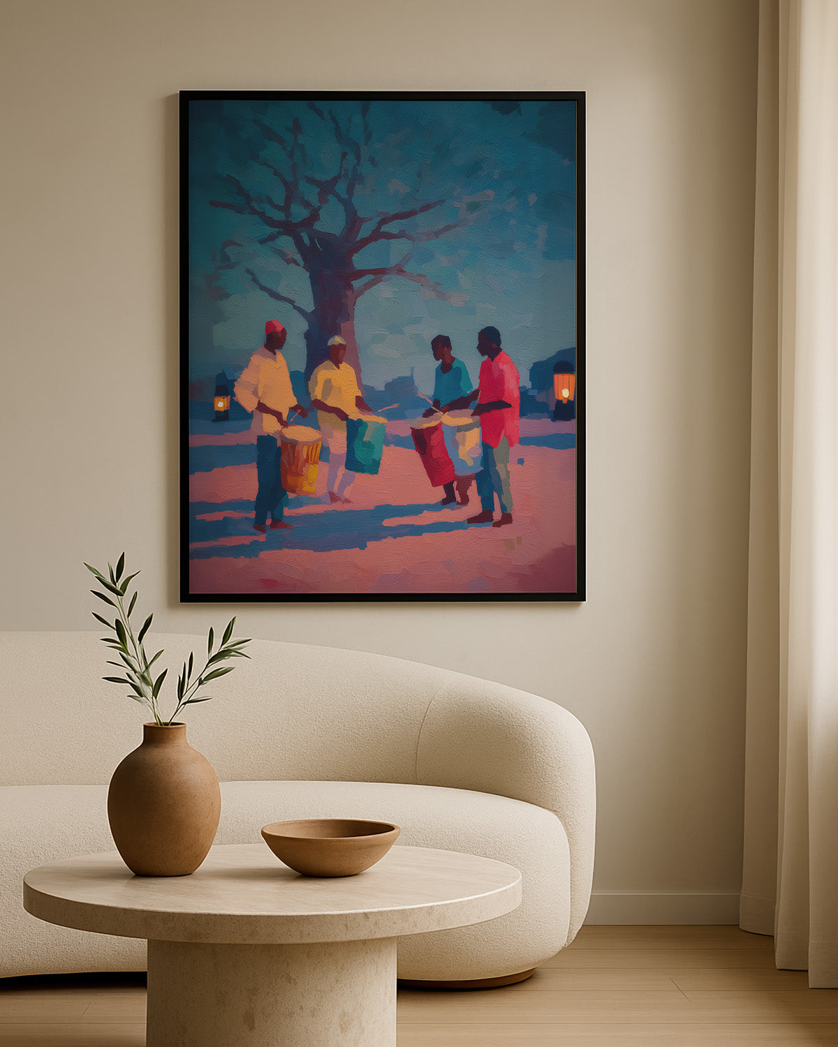 "Ancestral Music and Sacred Gathering: Contemporary Ghanaian Art Exploring Rhythm, Community, and the Tree as Spiritual Anchor": This magnificent artwork celebrates the profound spiritual significance of music, drumming, and communal gathering beneath ancestral trees within Ghanaian cultural and spiritual traditions. The composition depicts five figures rendered in vibrant warm colors of yellow, coral red, teal, and orange gathered in intimate circle beneath a monumental gnarled tree rendered in deep burgundy and black silhouette.
