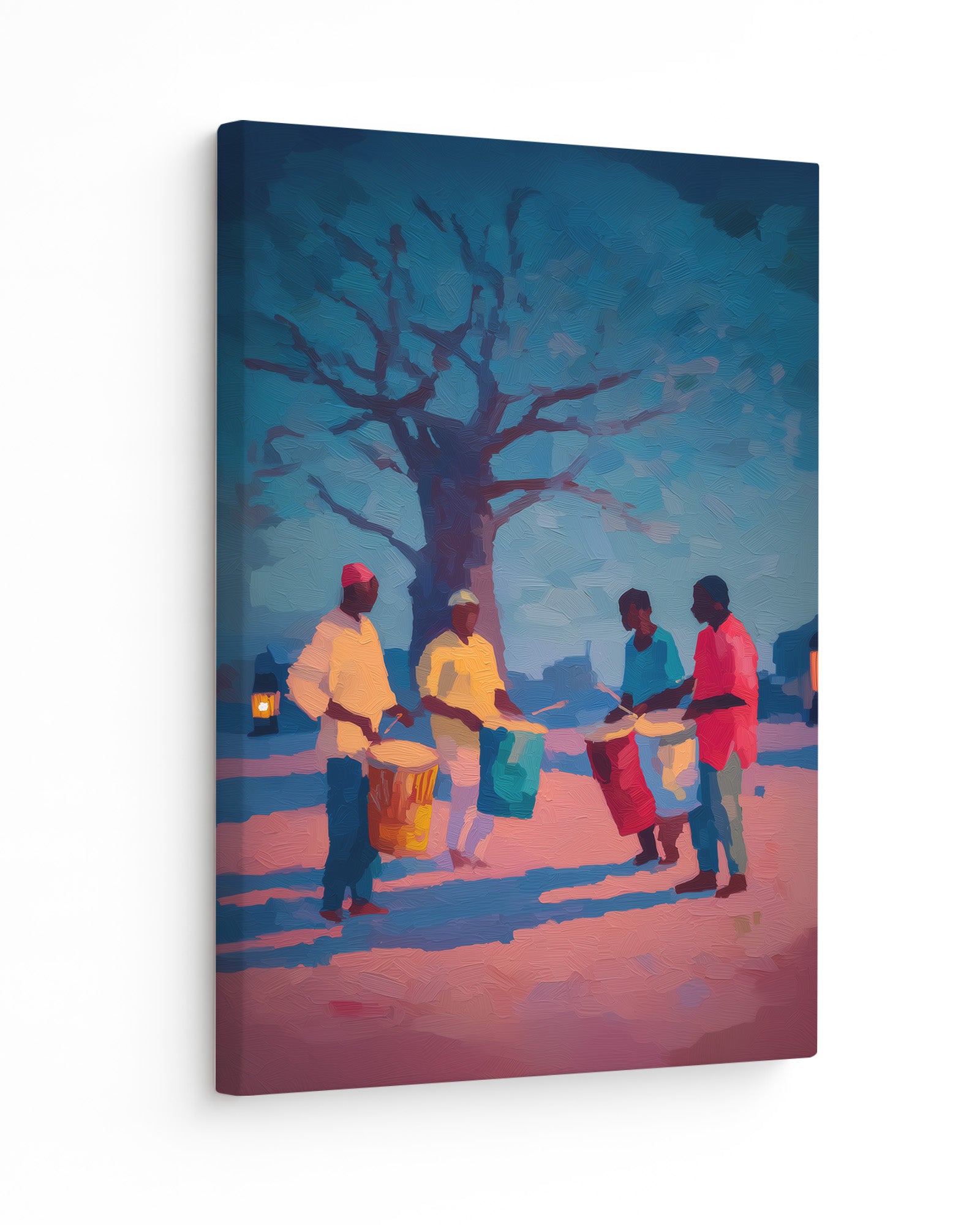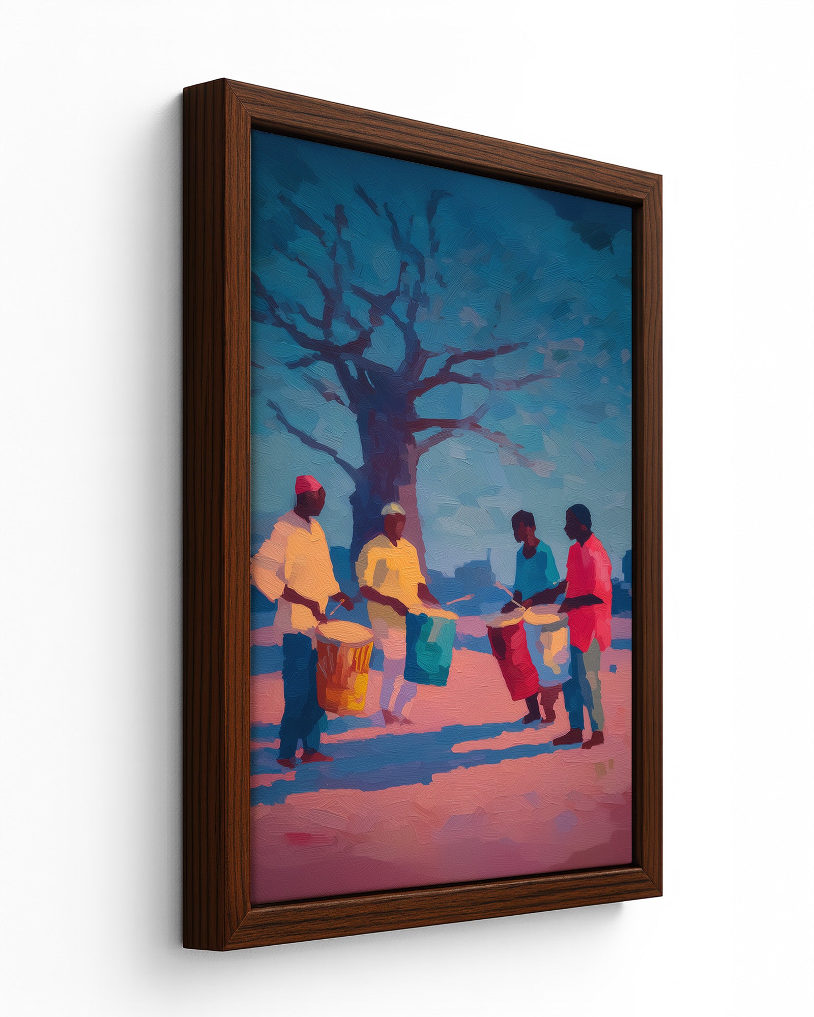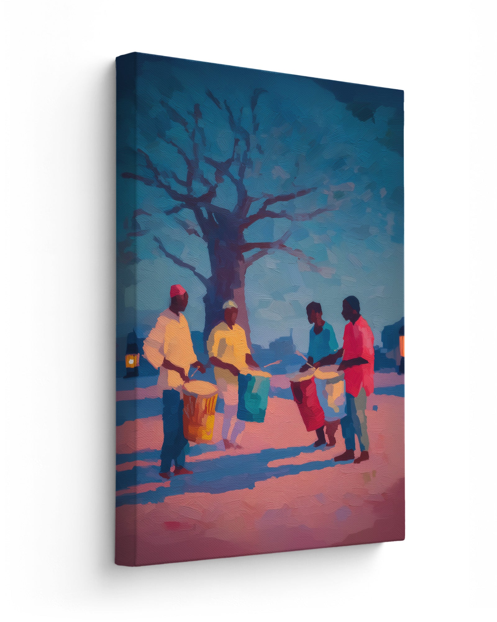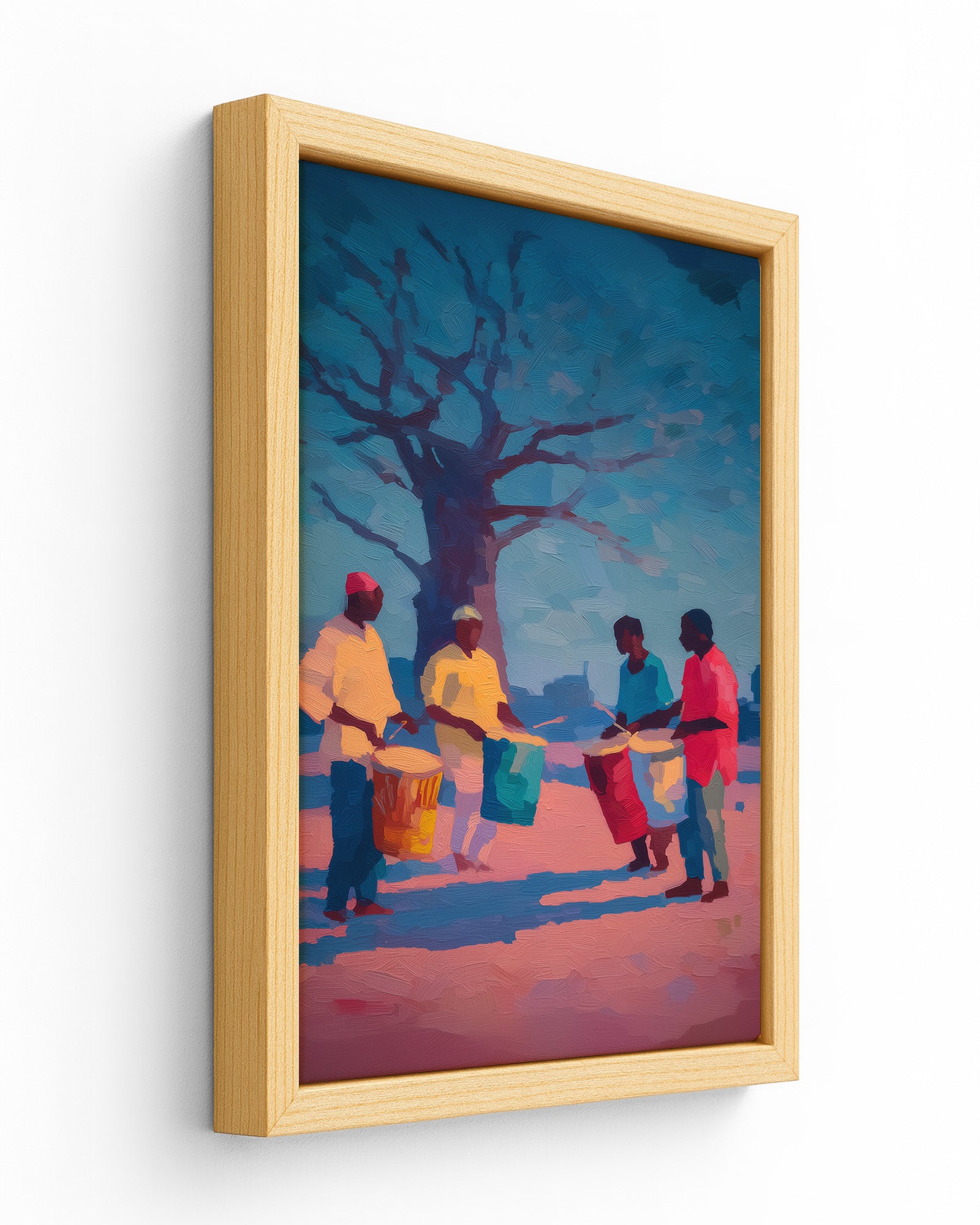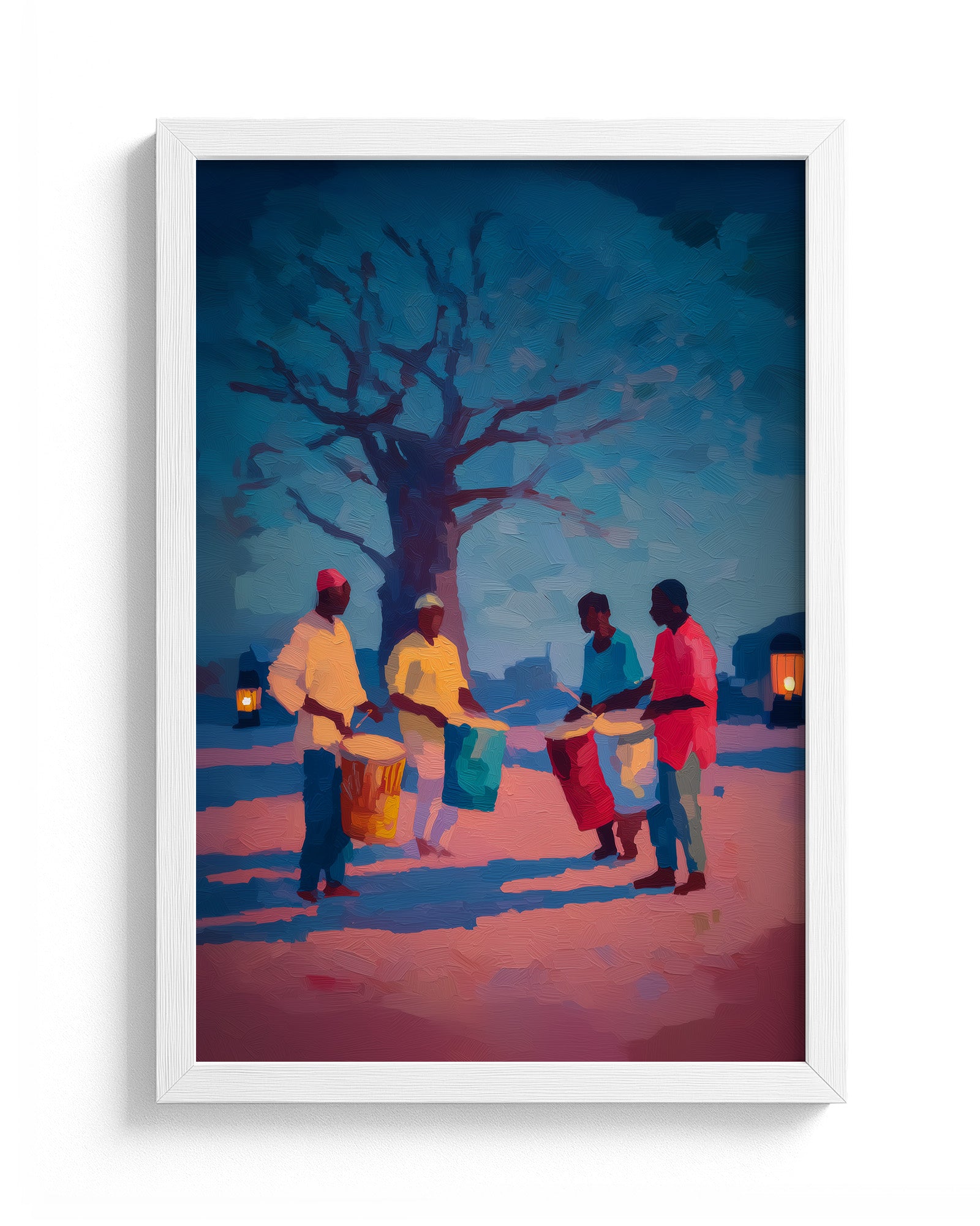 "Ancestral Music and Sacred Gathering: Contemporary Ghanaian Art Exploring Rhythm, Community, and the Tree as Spiritual Anchor": This magnificent artwork celebrates the profound spiritual significance of music, drumming, and communal gathering beneath ancestral trees within Ghanaian cultural and spiritual traditions. The composition depicts five figures rendered in vibrant warm colors of yellow, coral red, teal, and orange gathered in intimate circle beneath a monumental gnarled tree rendered in deep burgundy and black silhouette.