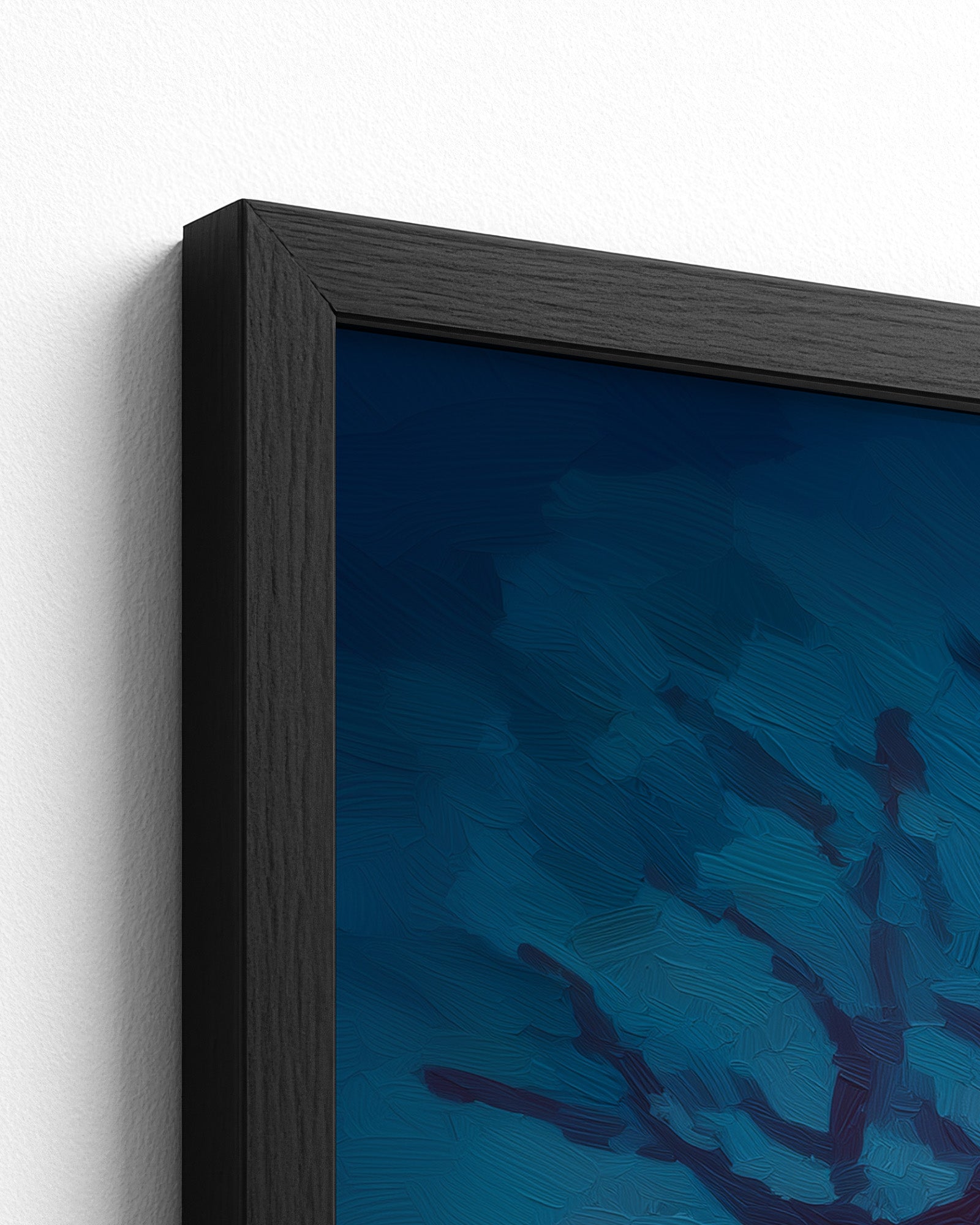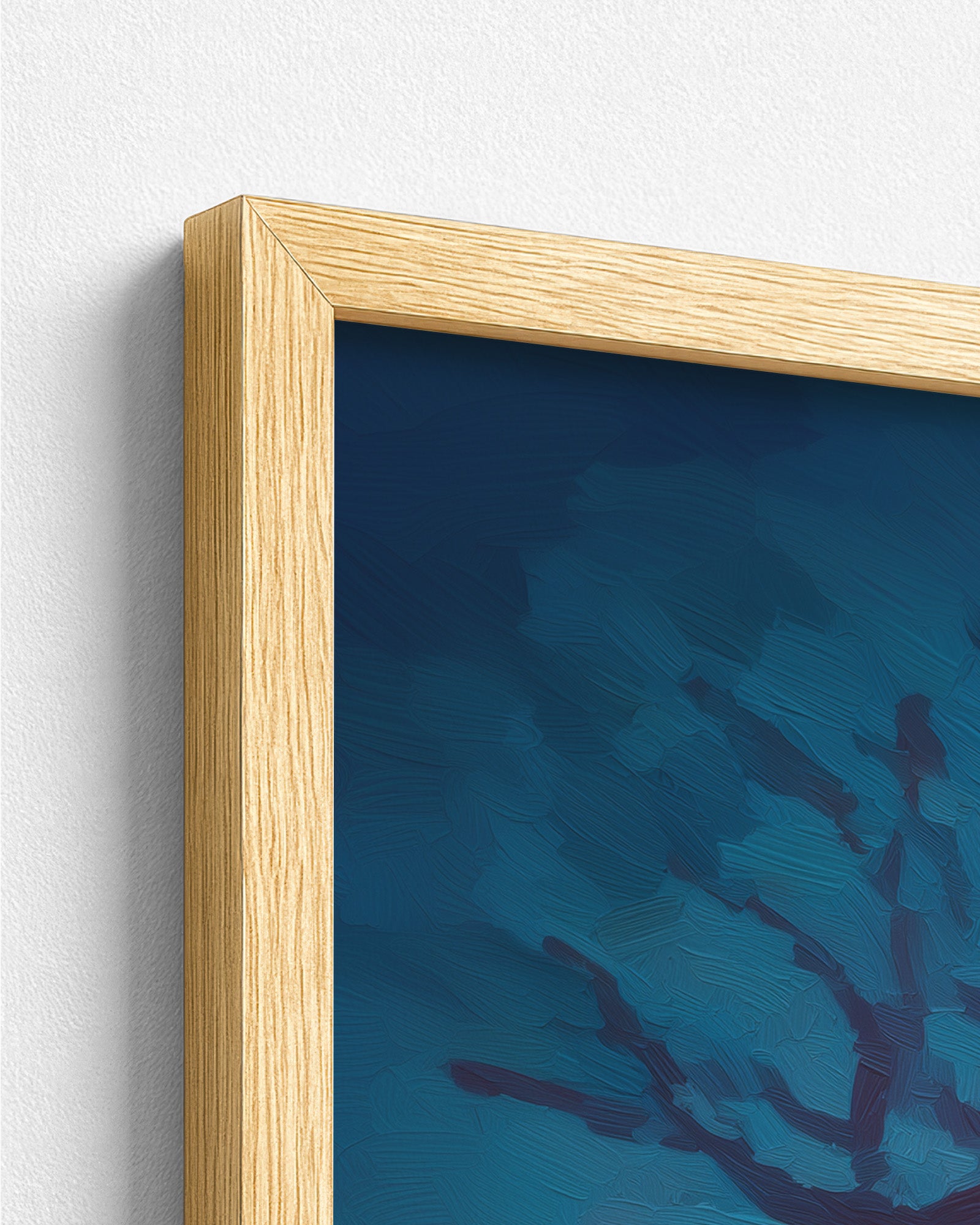 Premium artwork printed on high-quality paper, professionally mounted within a durable pine wood frame.