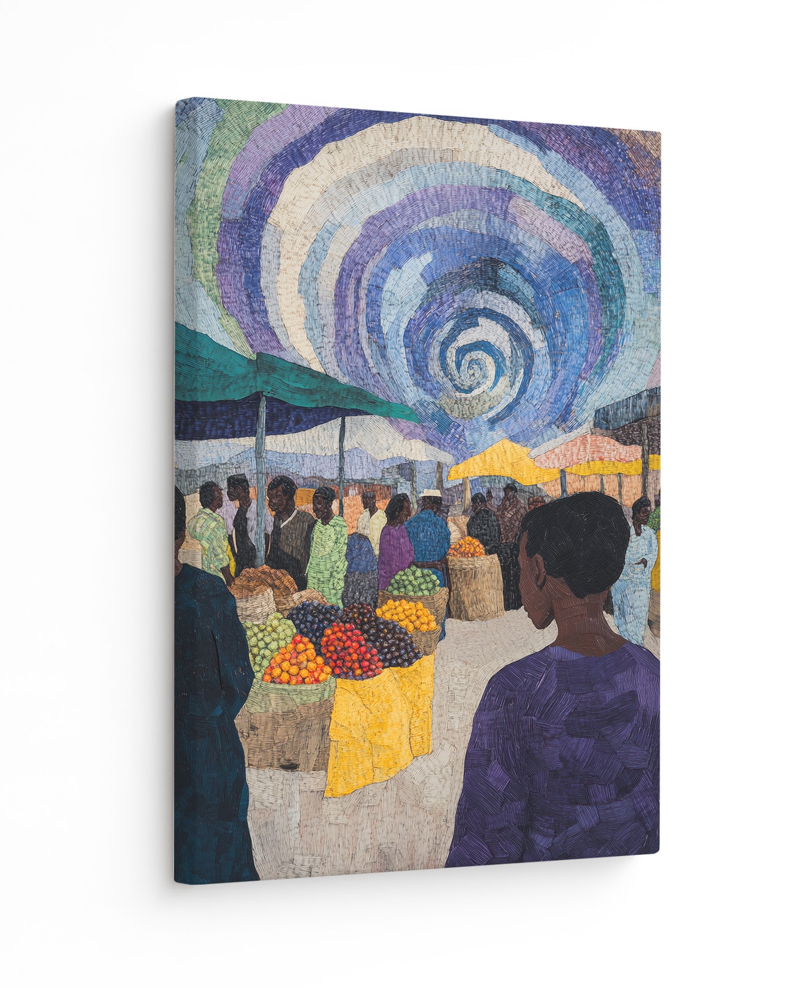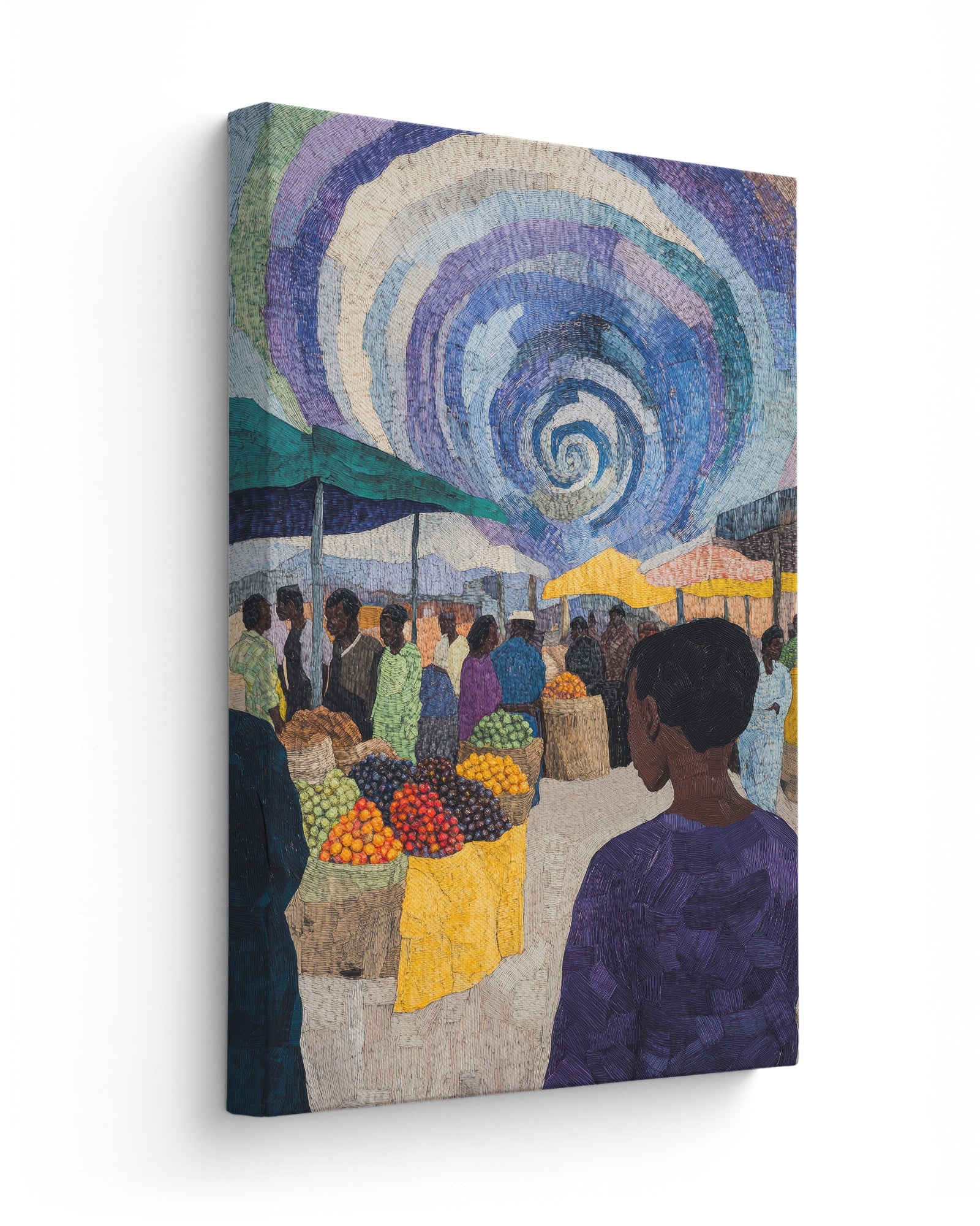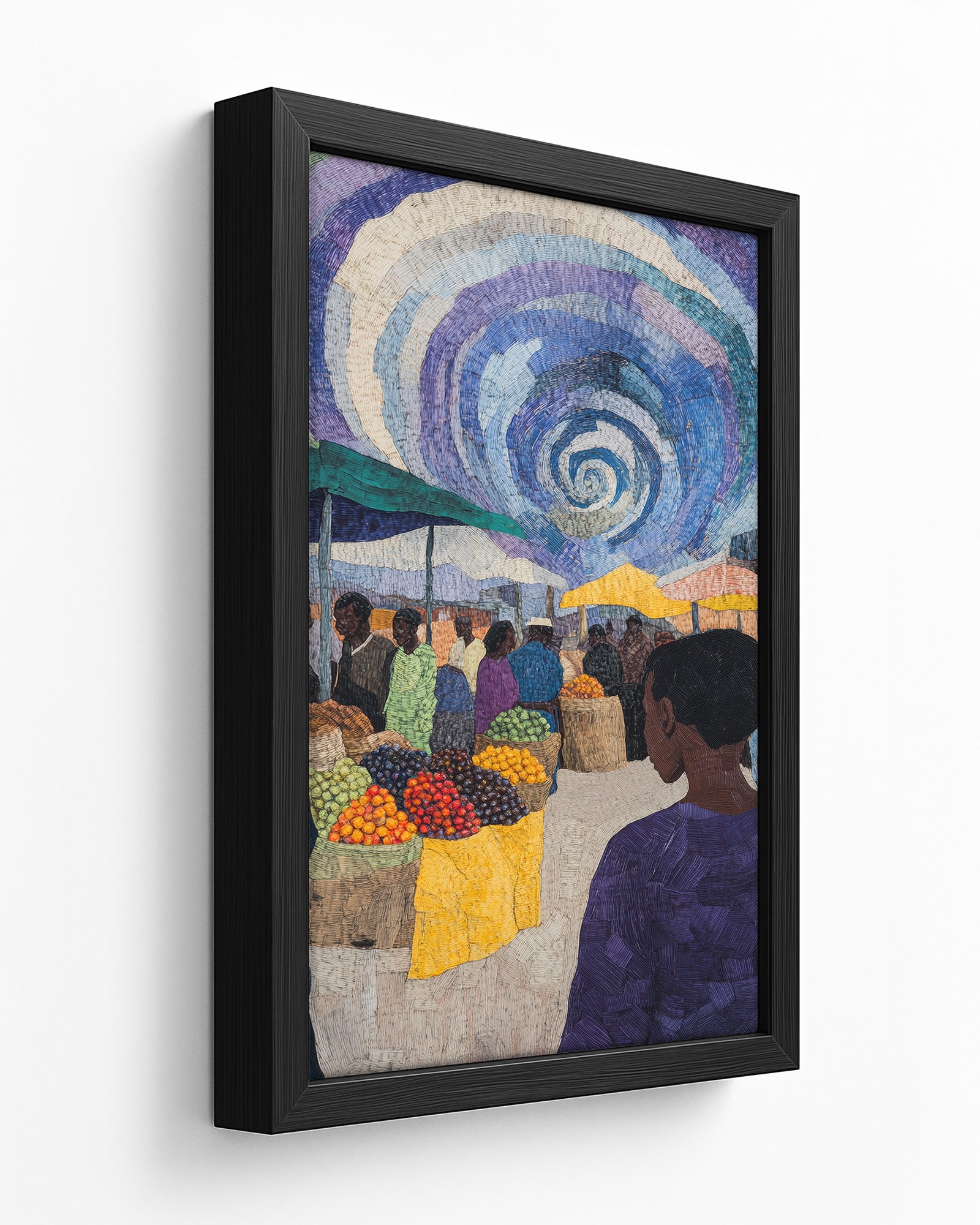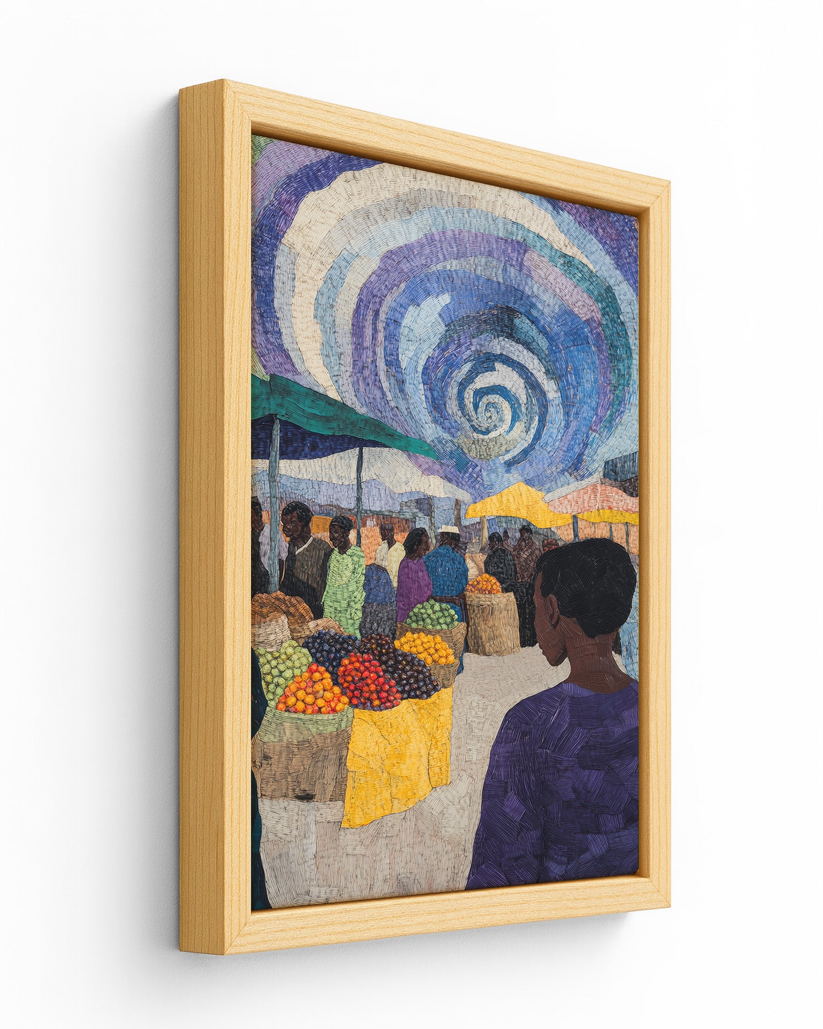 Step into the vibrant energy of an African market scene. Stalls brimming with fruits, fabrics, and pottery come alive under warm golden tones.