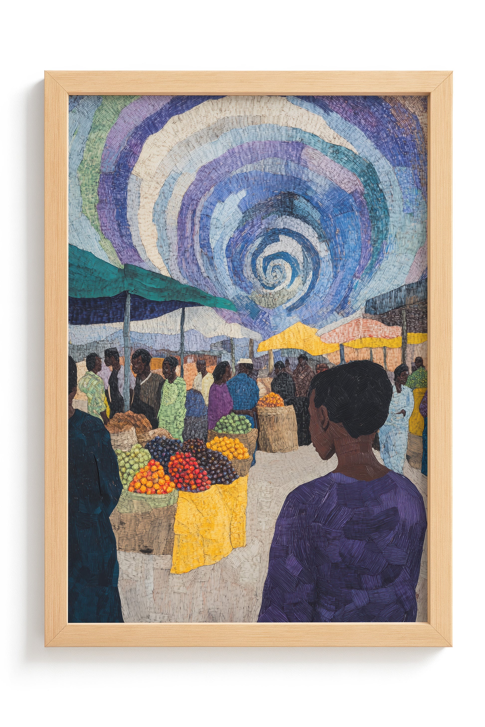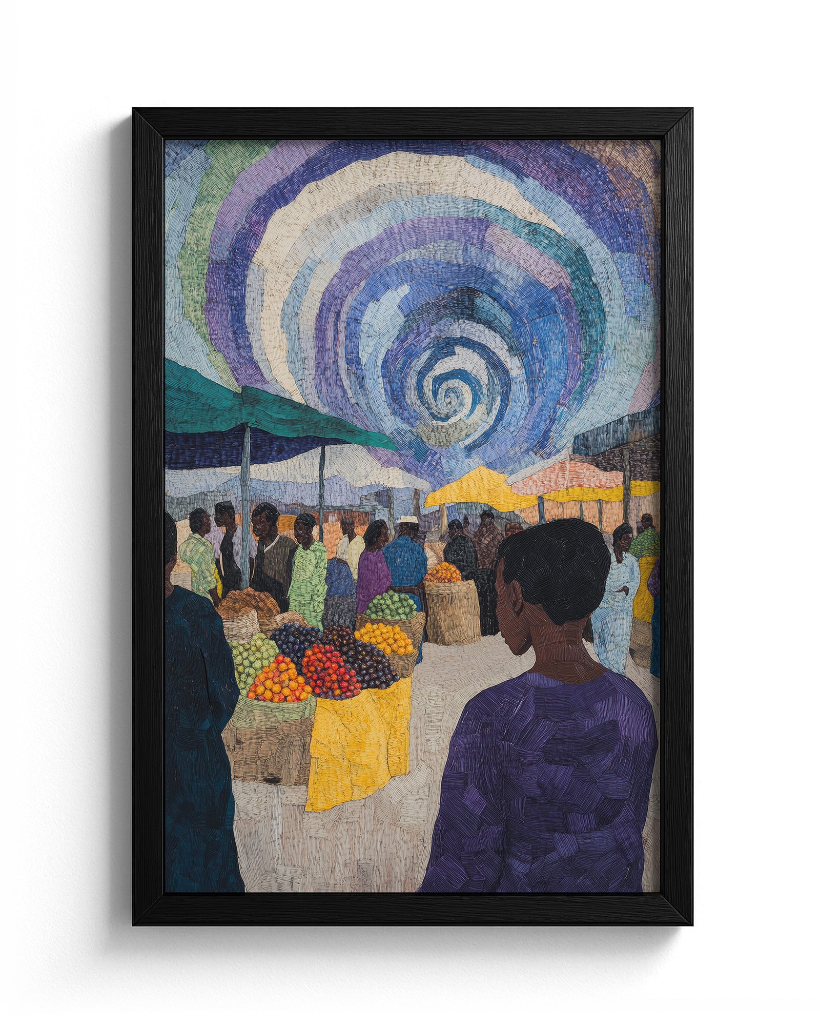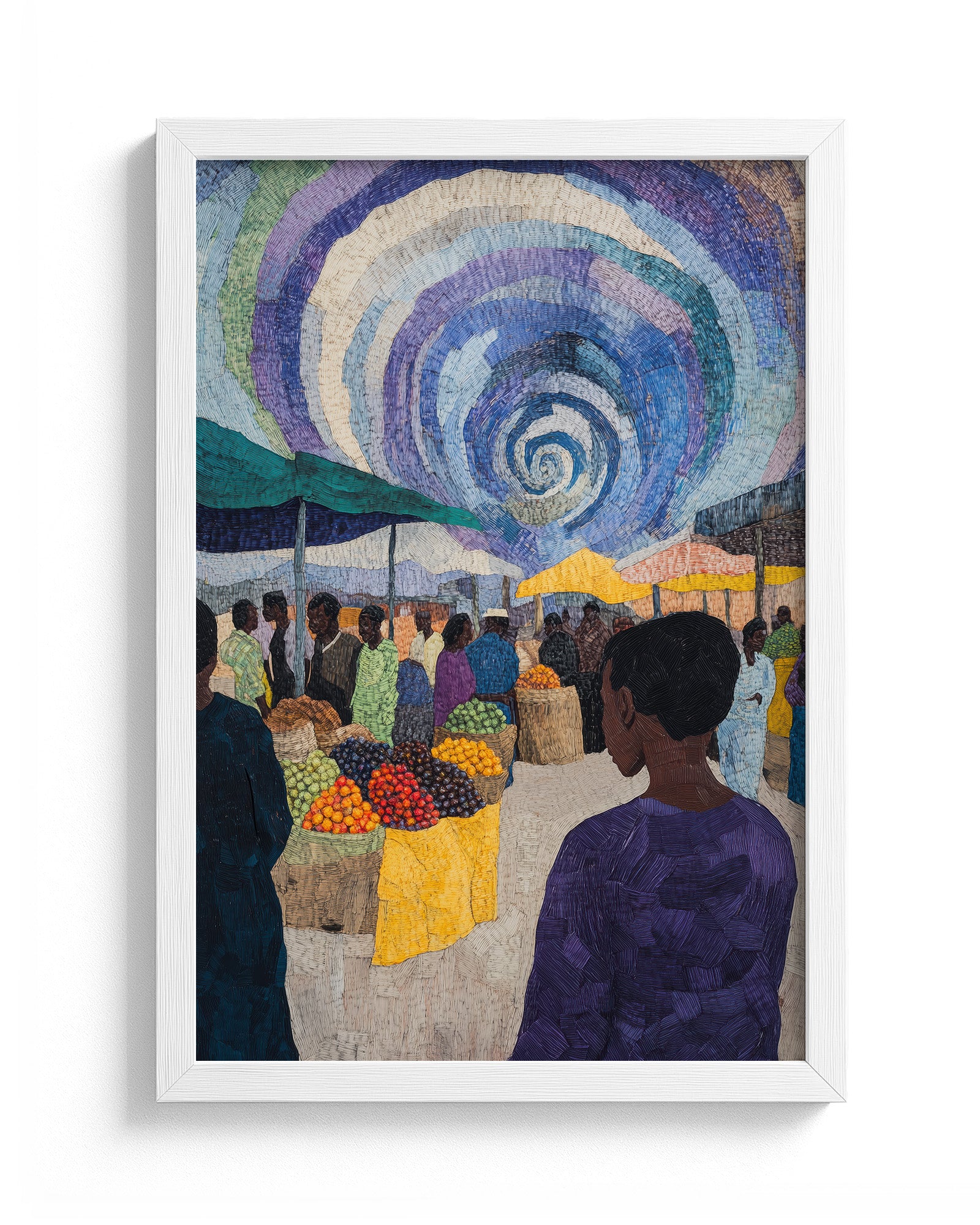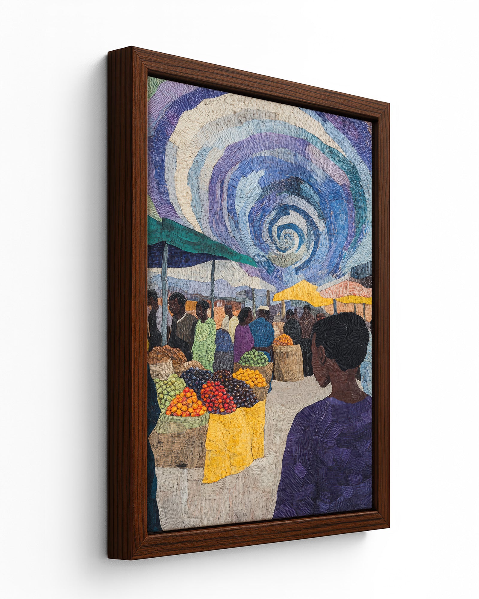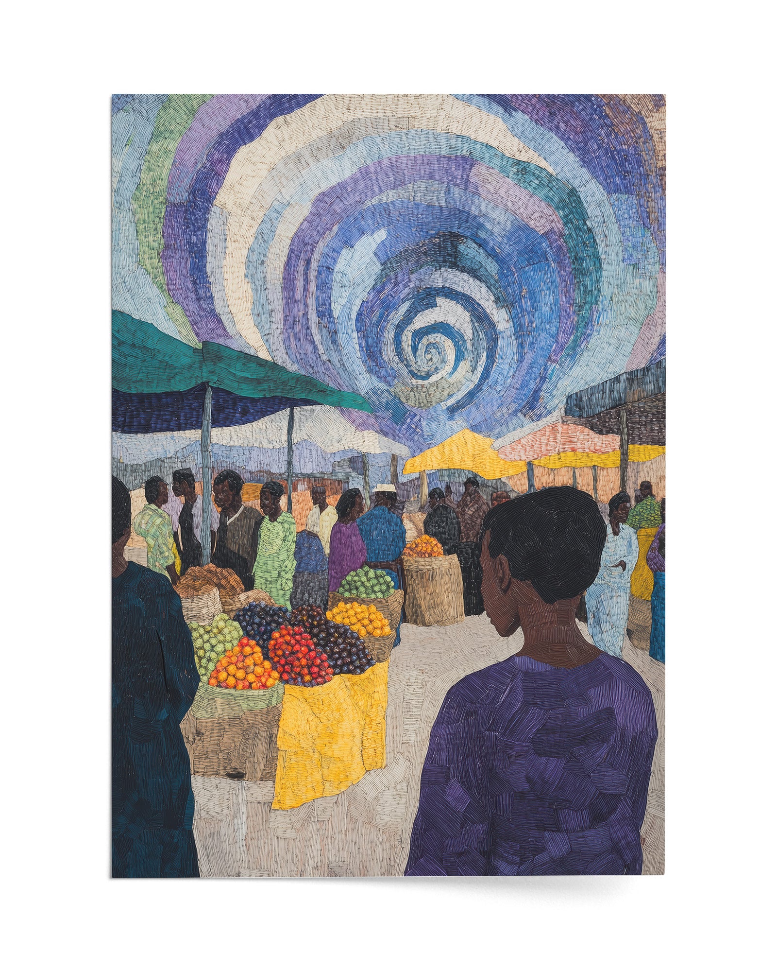 Step into the vibrant energy of an African market scene. Stalls brimming with fruits, fabrics, and pottery come alive under warm golden tones.
