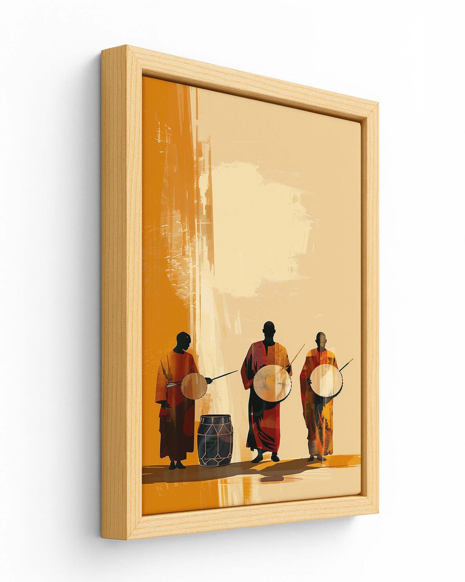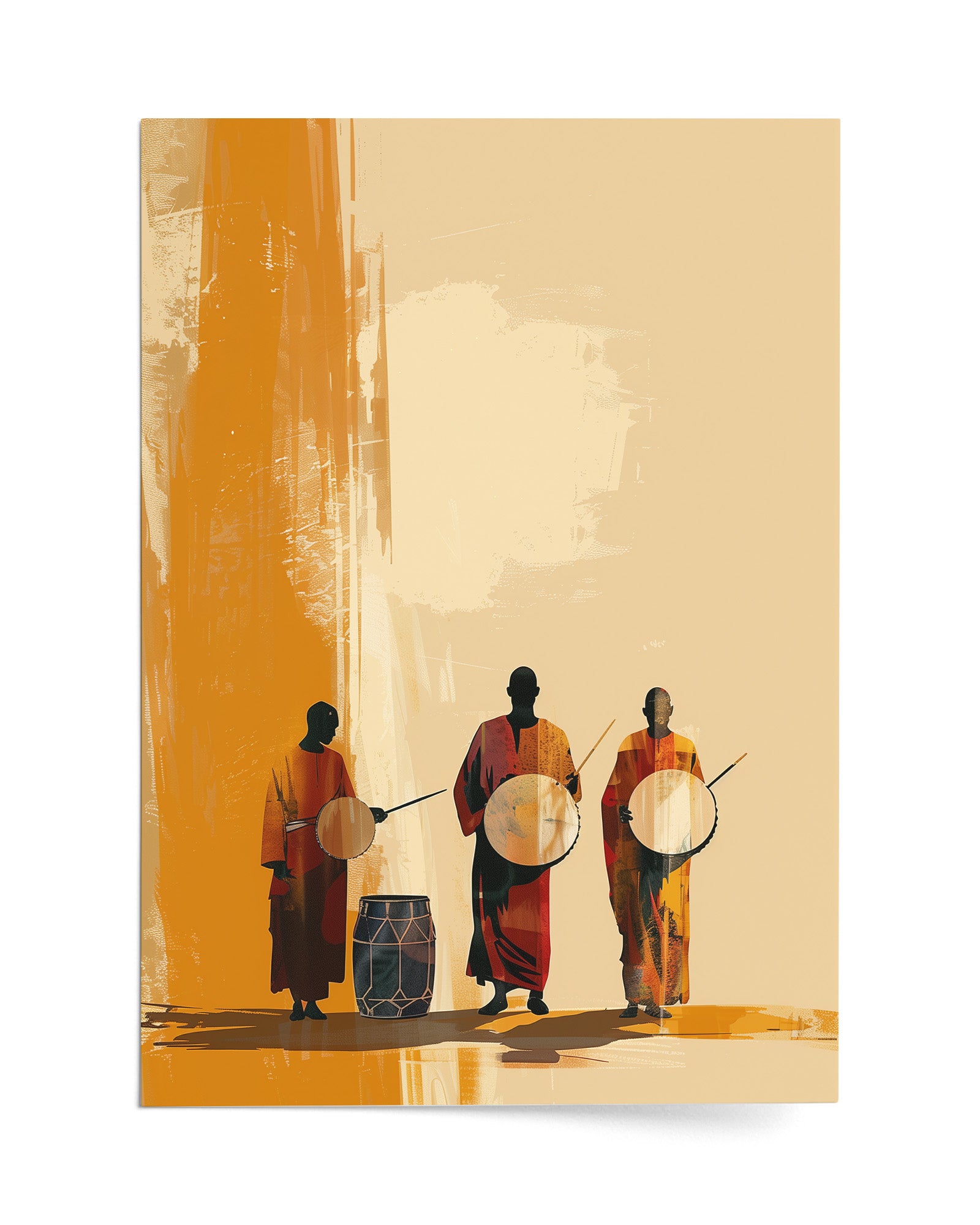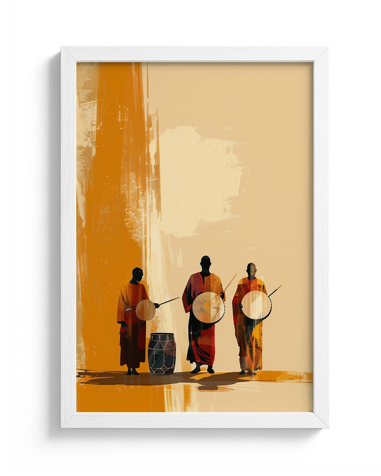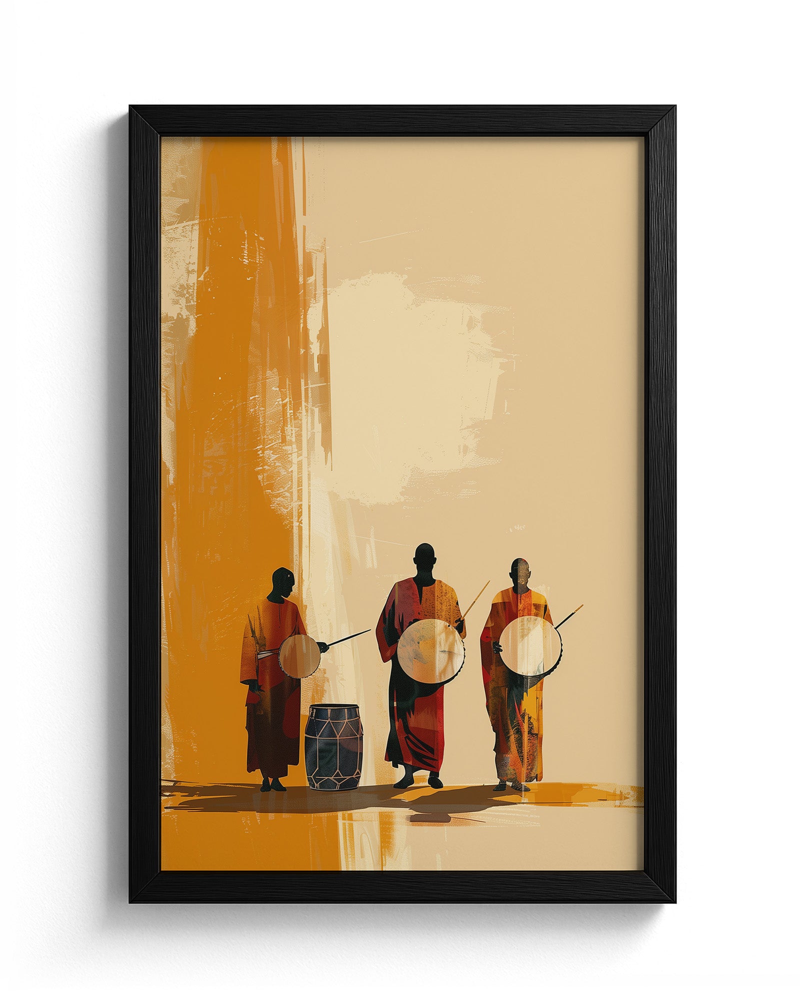 Immerse yourself in the soulful rhythm of African heritage with this minimalist art piece. Featuring a serene scene of drummers in muted earth tones, the artwork captures subtle motion and cultural celebration in an elegant, understated style.