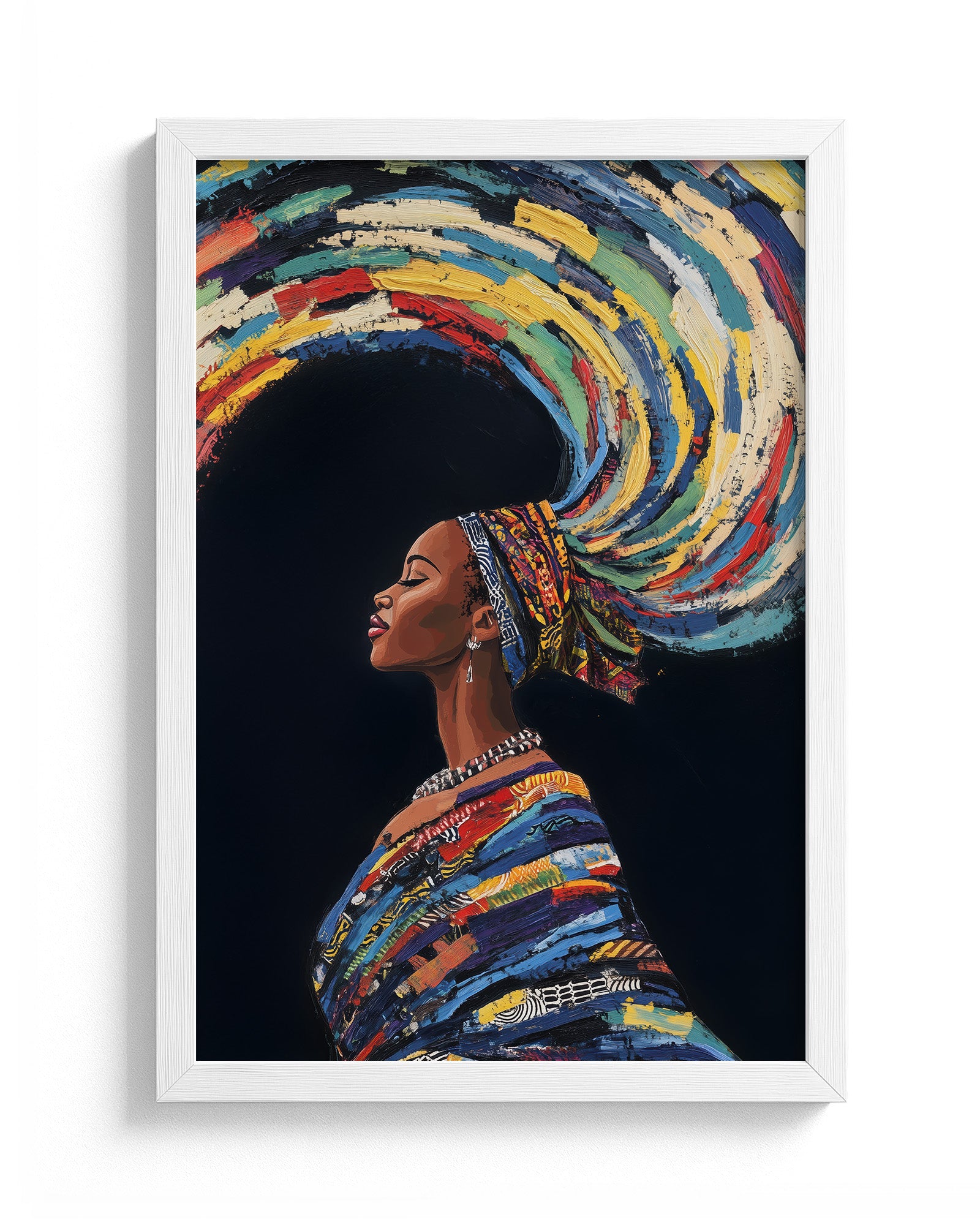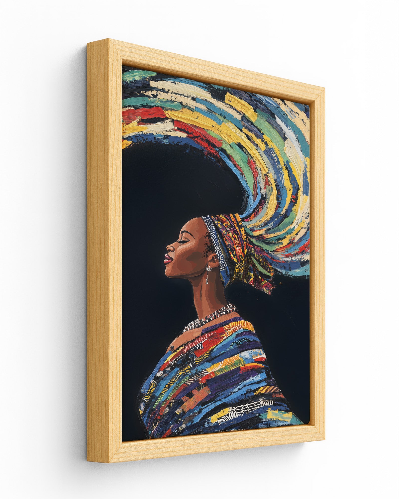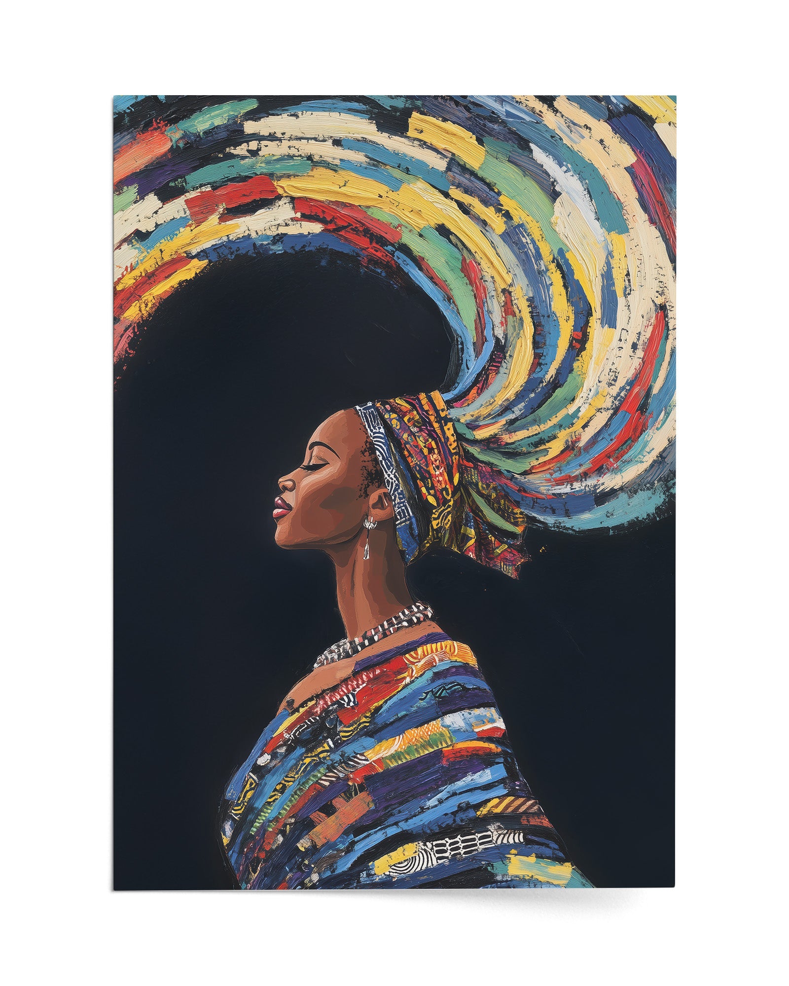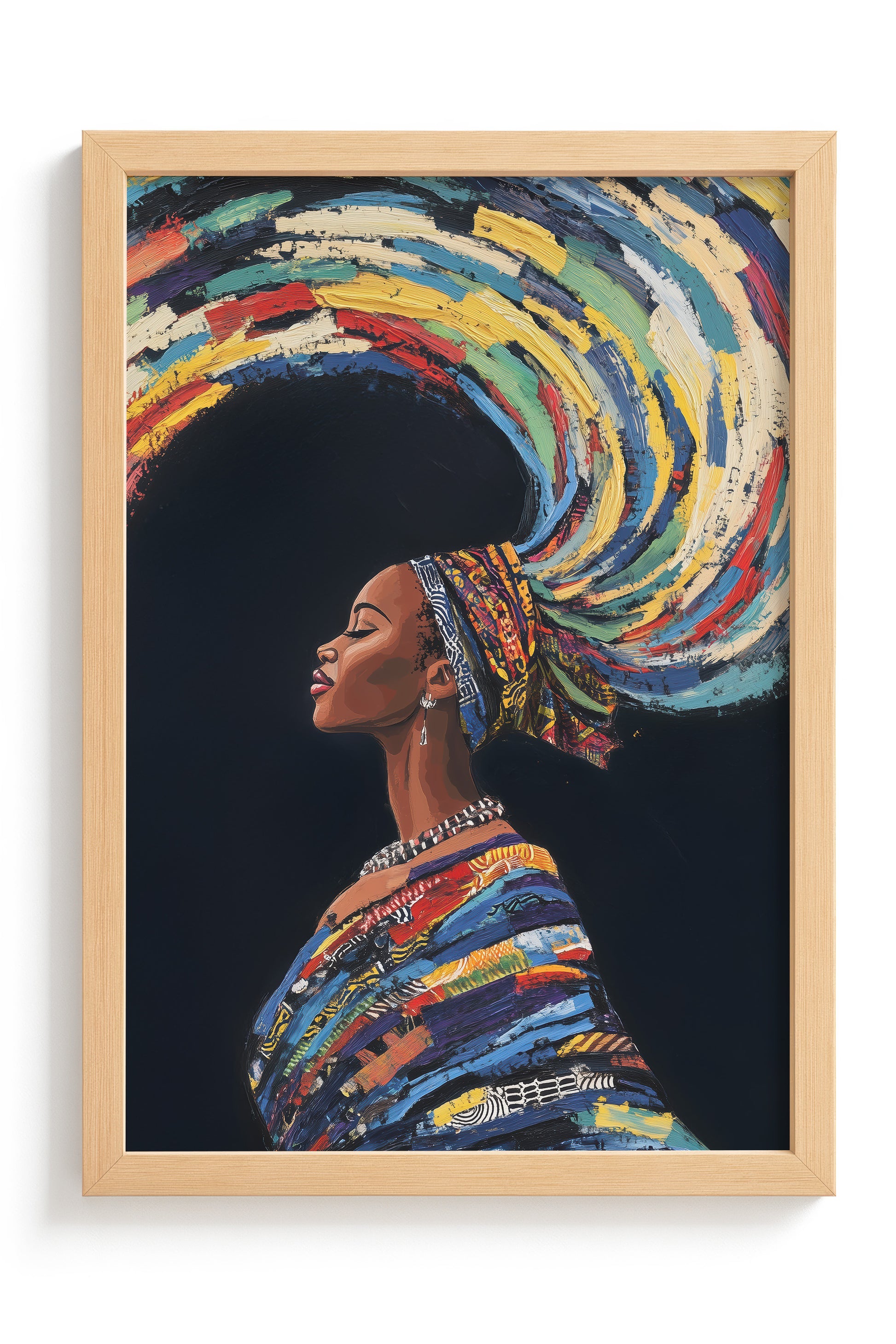 This stunning artwork captures a woman adorned in traditional attire with colourful swirling hair, symbolising earth, wind, and fire. The vivid details of her patterns, combined with the dynamic representation of natural elements, create a piece rich in cultural heritage and symbolic beauty.