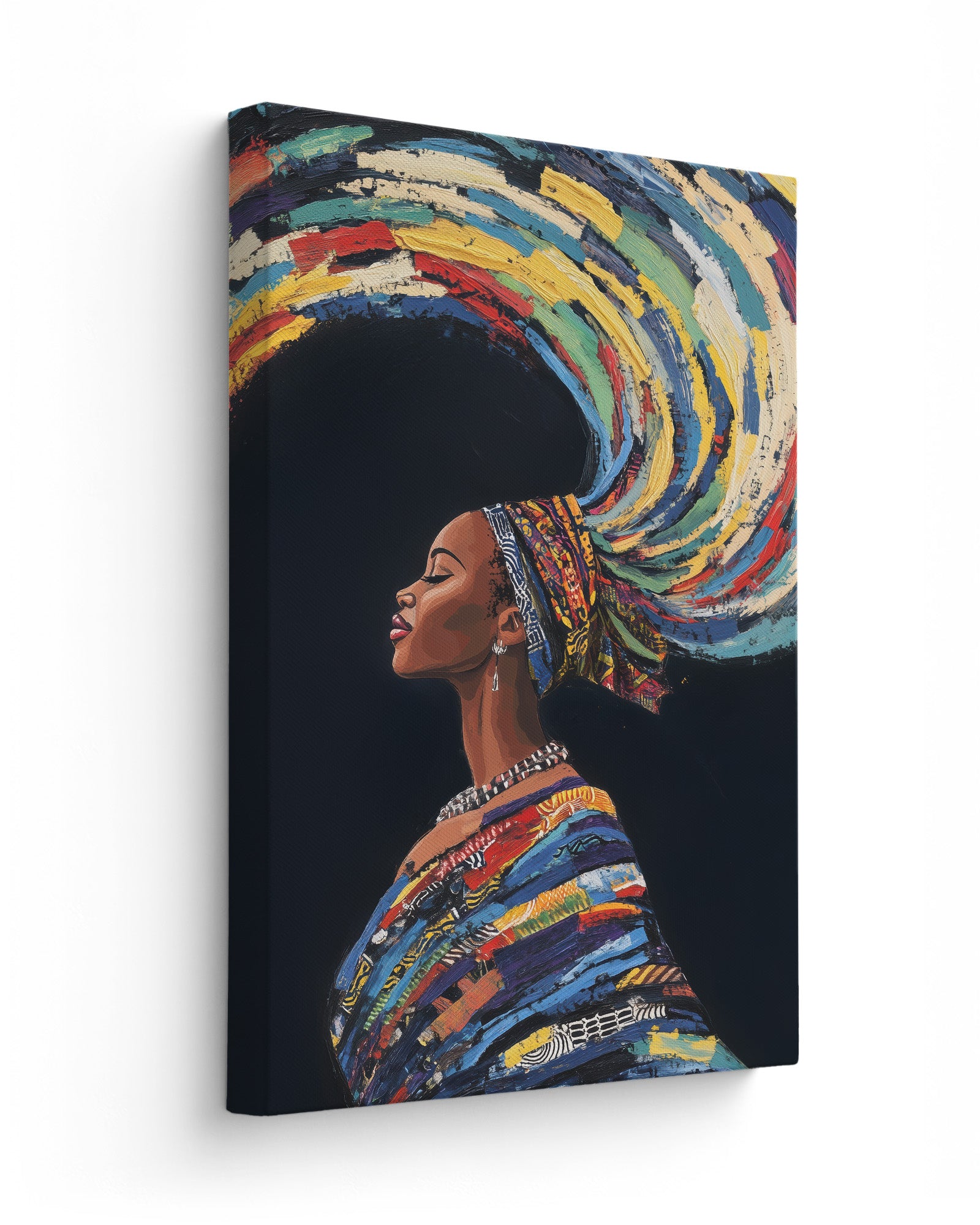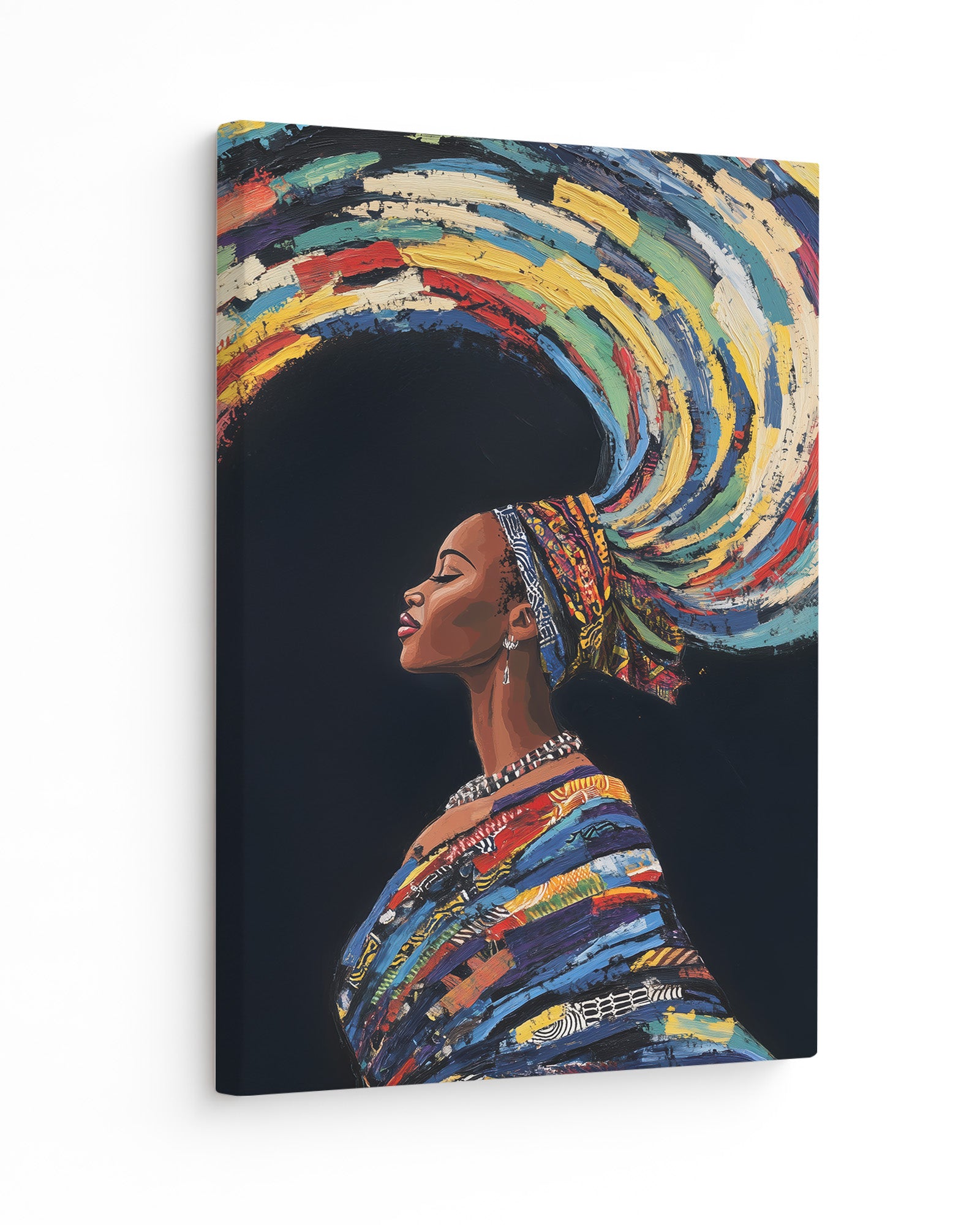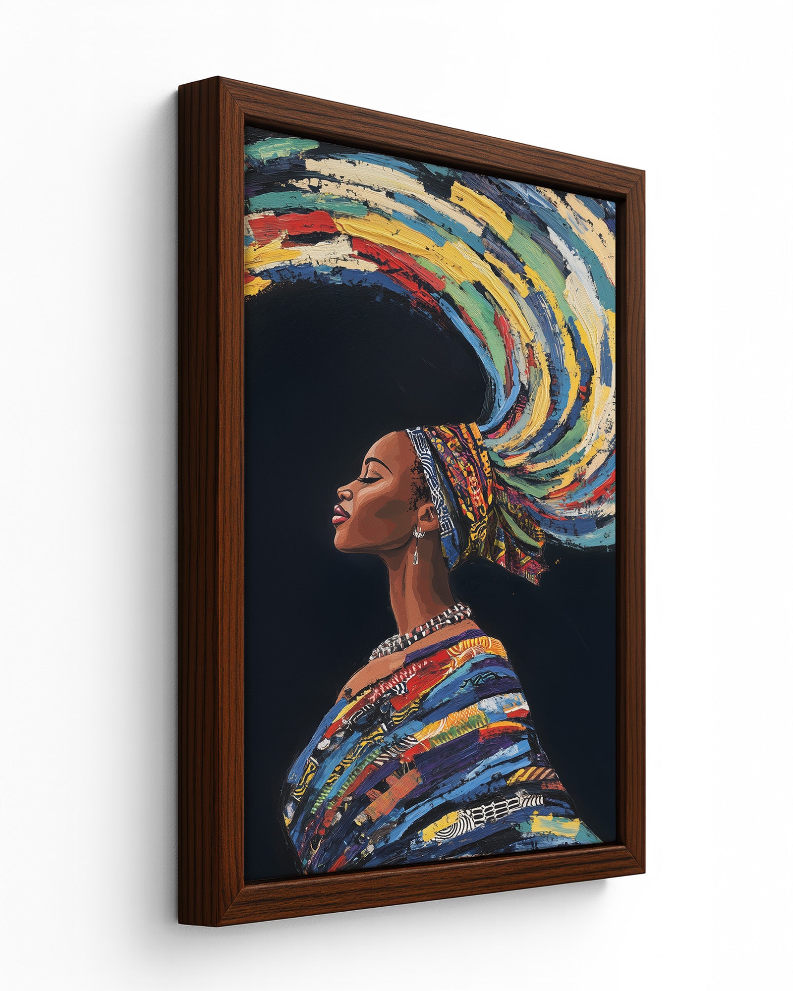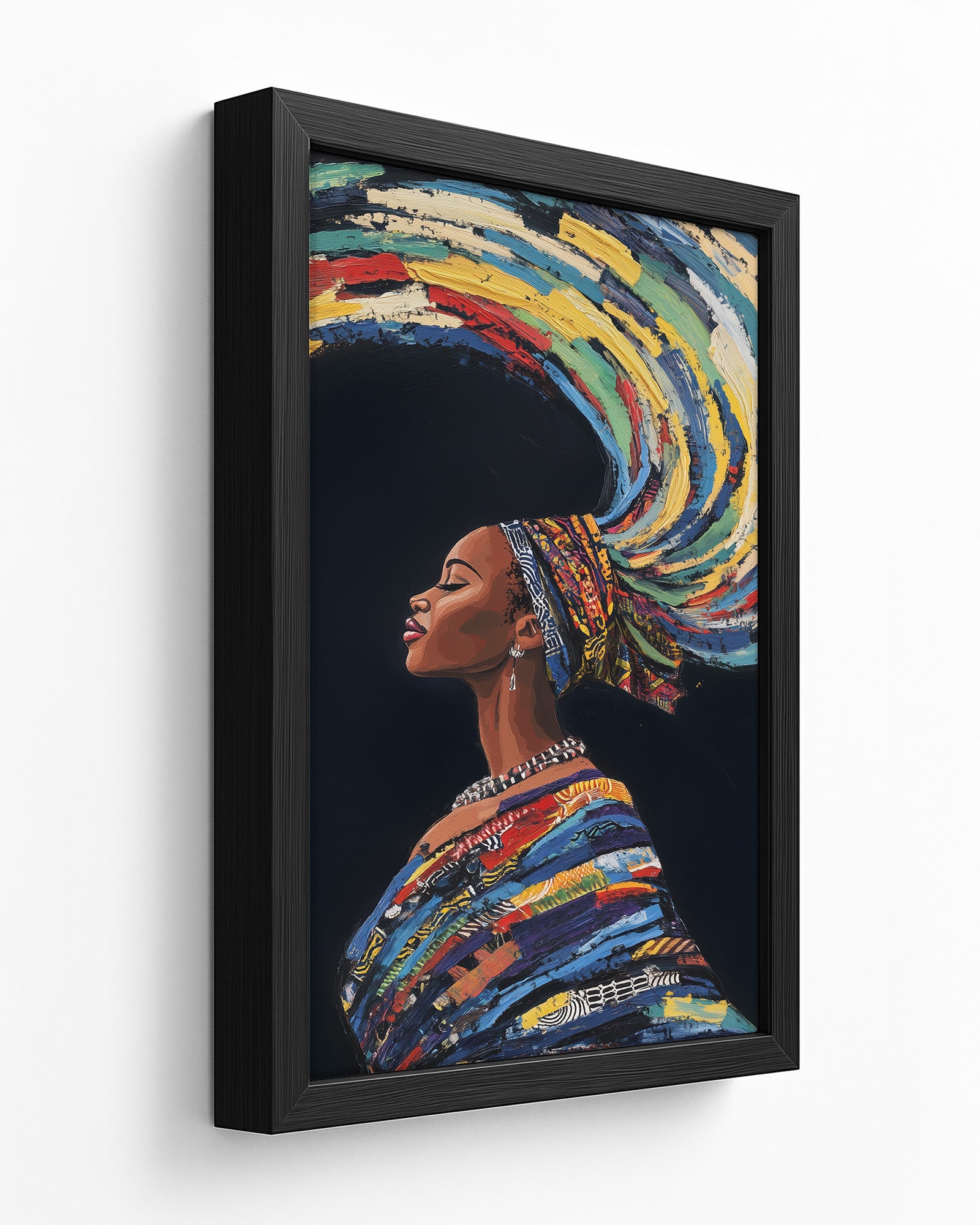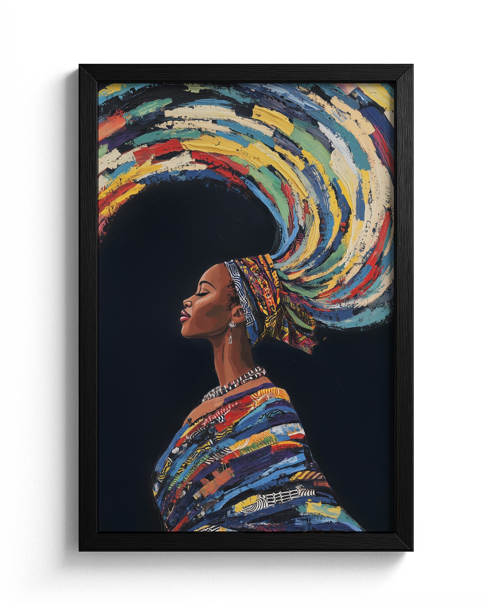 This stunning artwork captures a woman adorned in traditional attire with colourful swirling hair, symbolising earth, wind, and fire. The vivid details of her patterns, combined with the dynamic representation of natural elements, create a piece rich in cultural heritage and symbolic beauty.