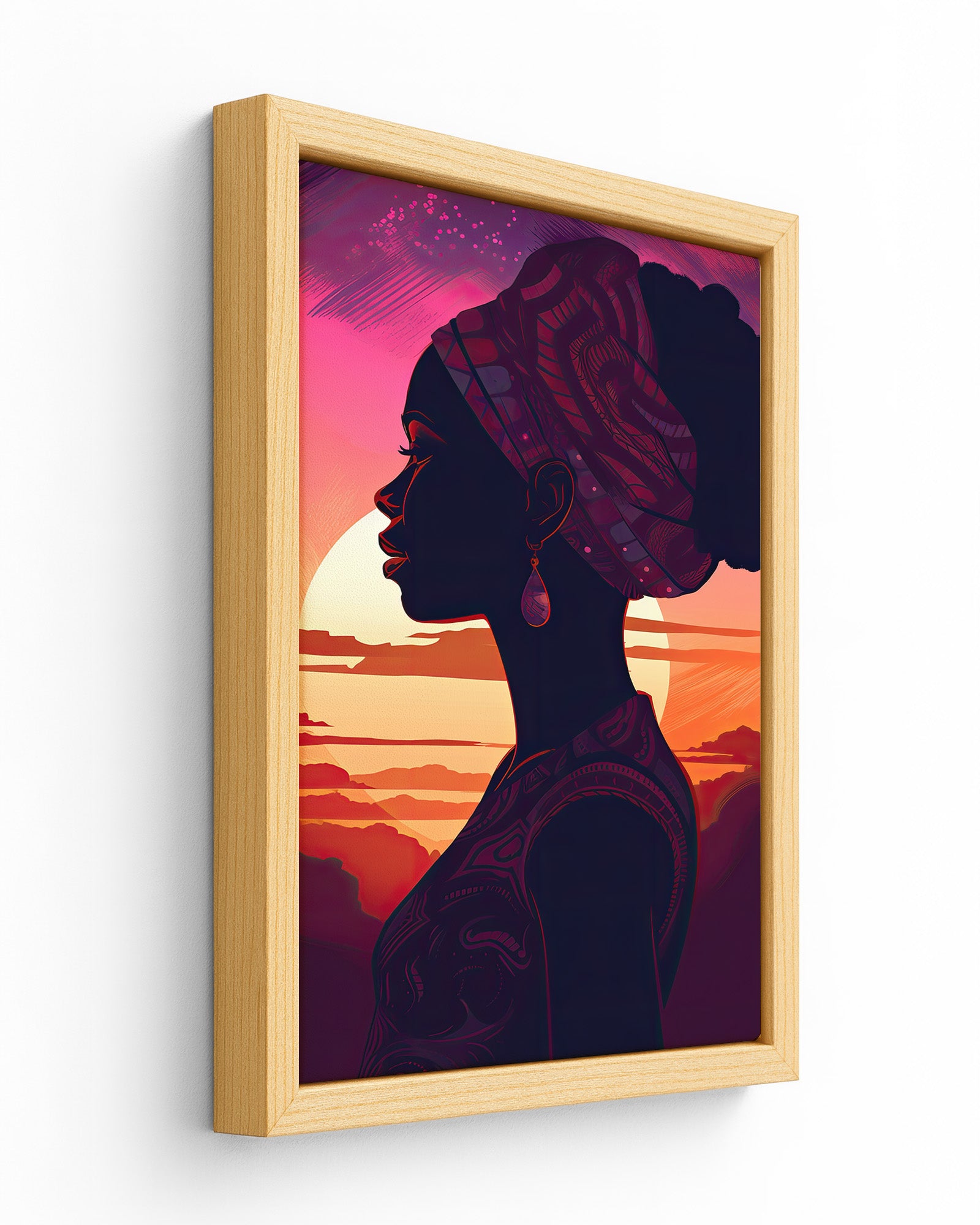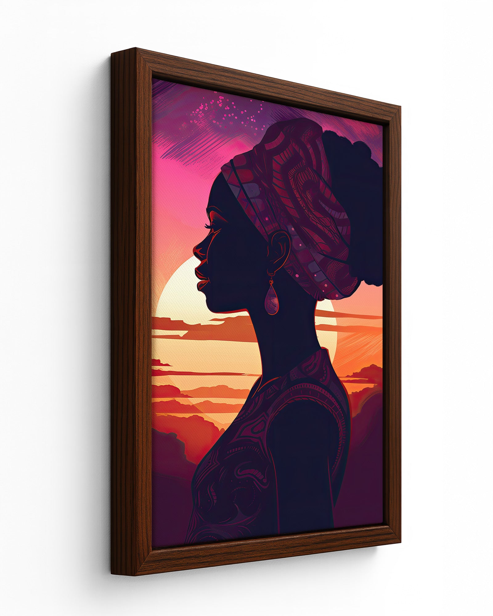 Immerse yourself in the breathtaking beauty of Zambia's sunset with our captivating oil painting. It features a Zambian lady standing against a mesmerising purple-hued sky, capturing the essence of serenity and natural beauty. The vibrant colours of the setting sun beautifully highlight her silhouette, making this artwork a stunning addition to any home.