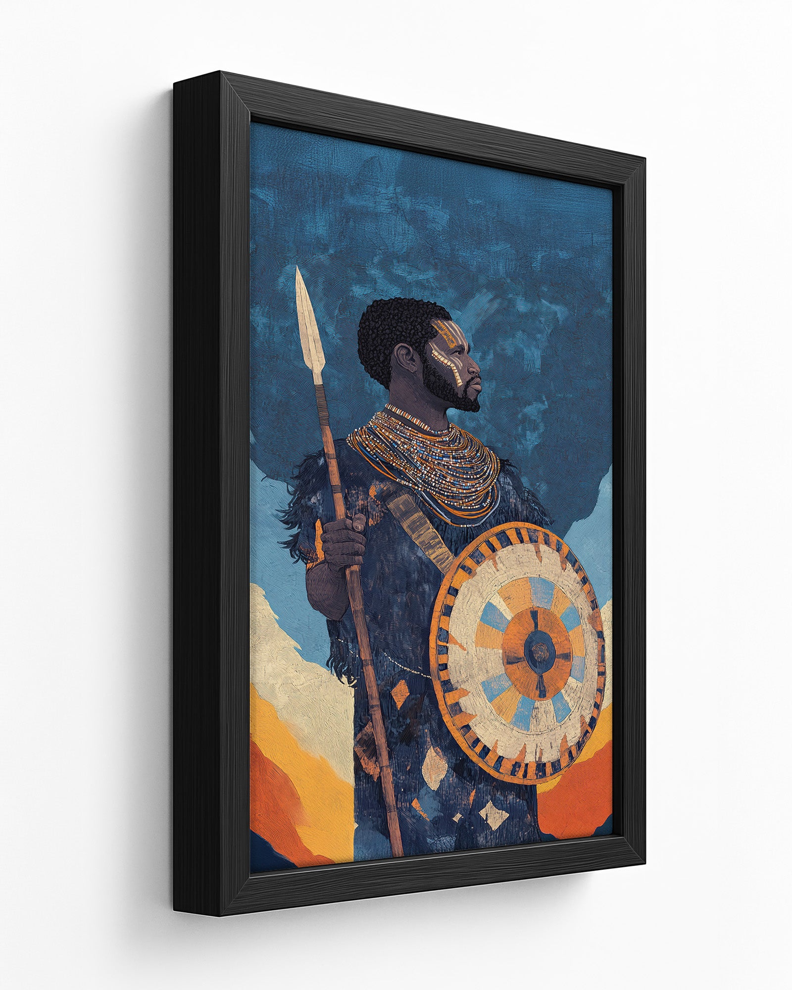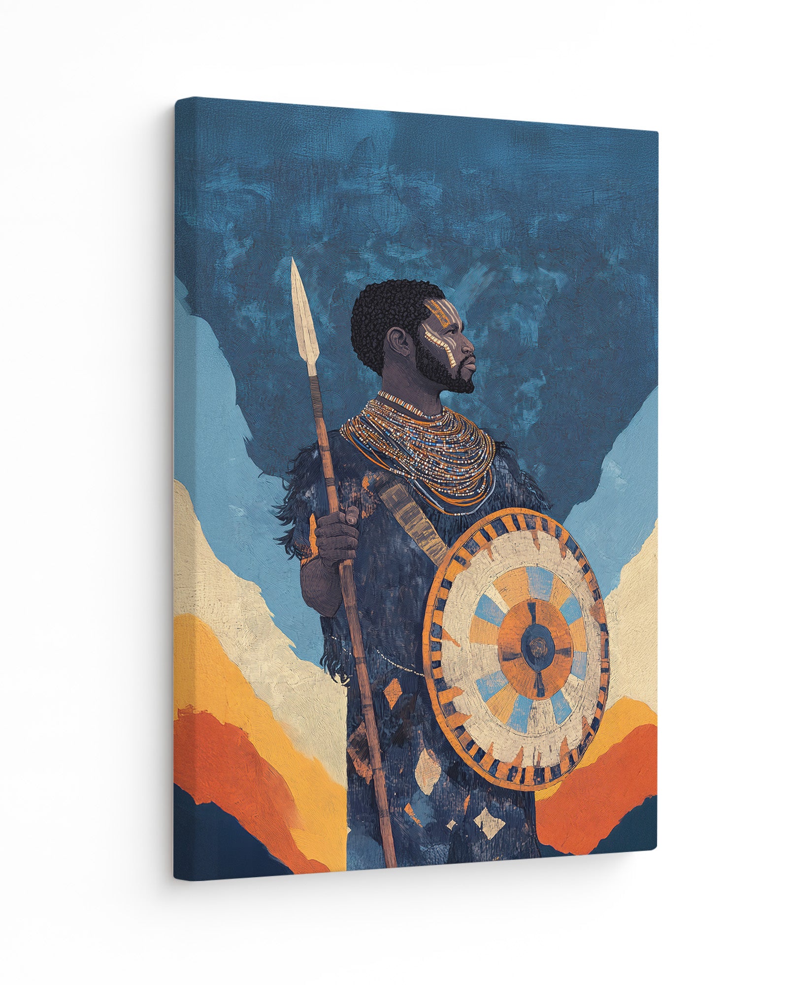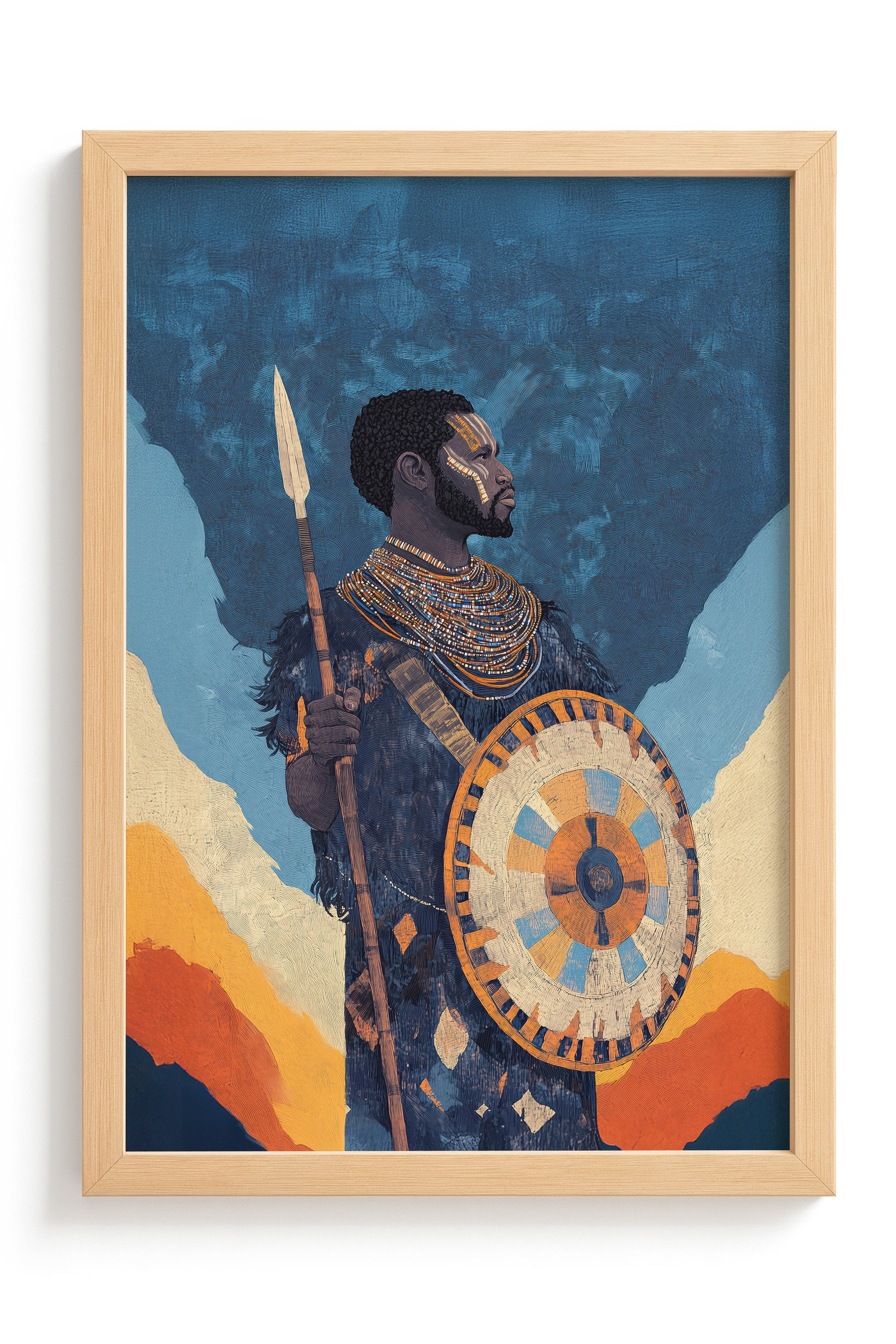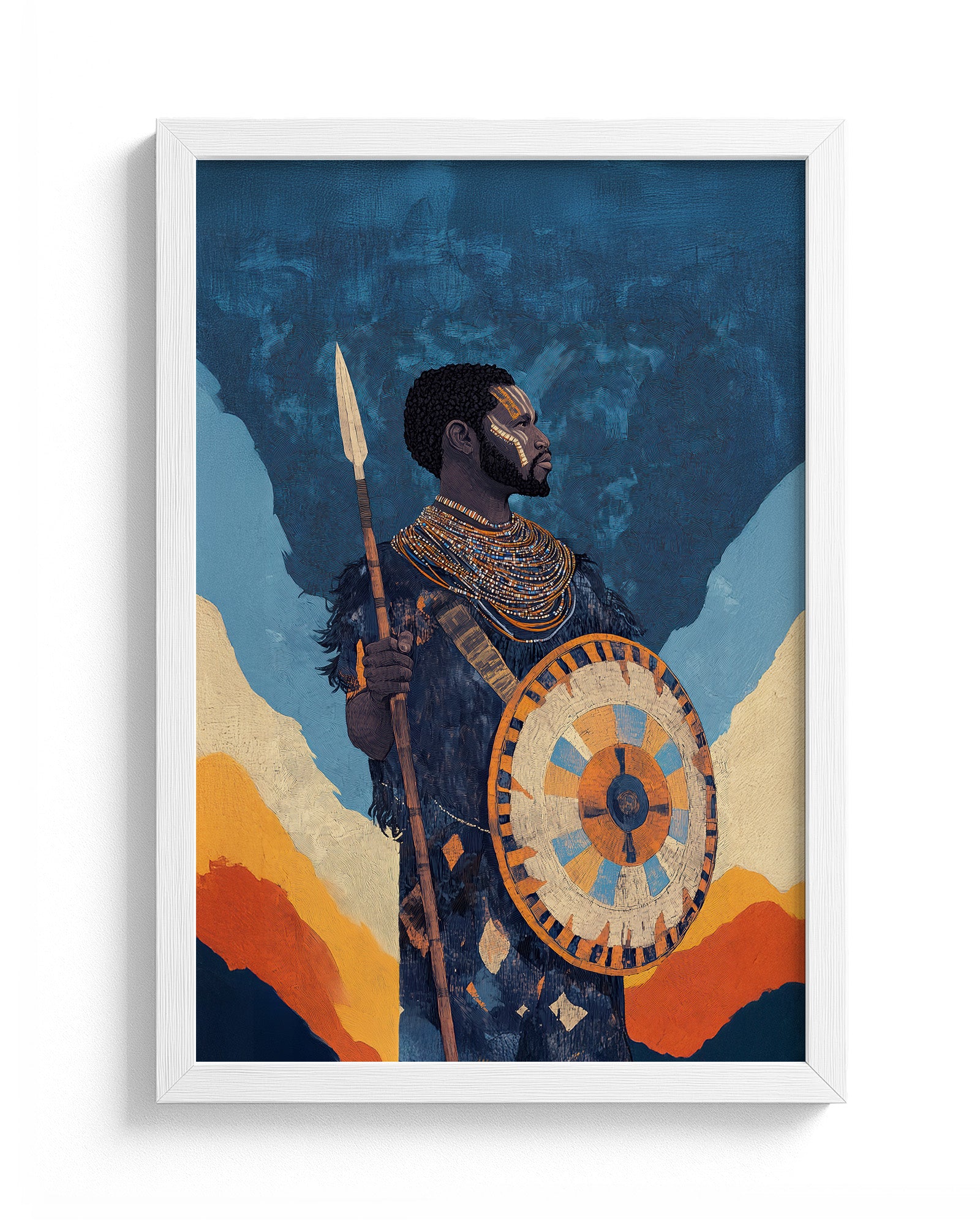 This breathtaking artwork portrays a Zulu warrior standing tall and proud, dressed in traditional tribal attire and holding a spear. His shield, adorned with intricate tribal patterns, symbolises a deep connection to his heritage. The background blends dynamic, modern abstract swirls of colour, representing tradition merging with contemporary energy.