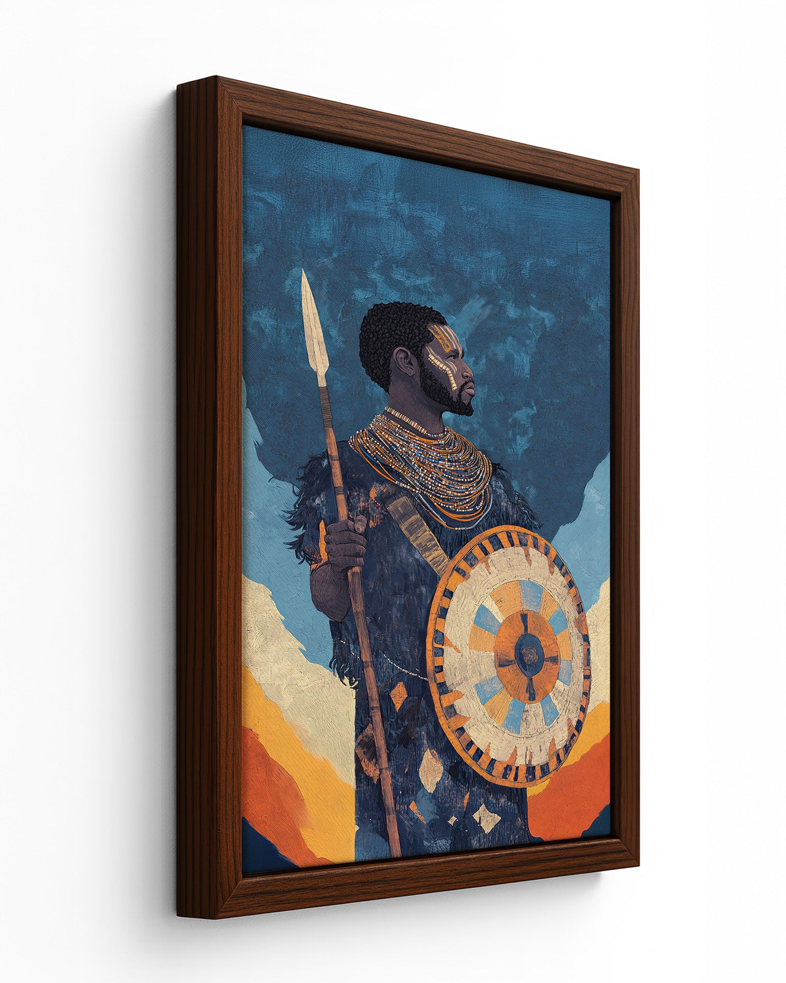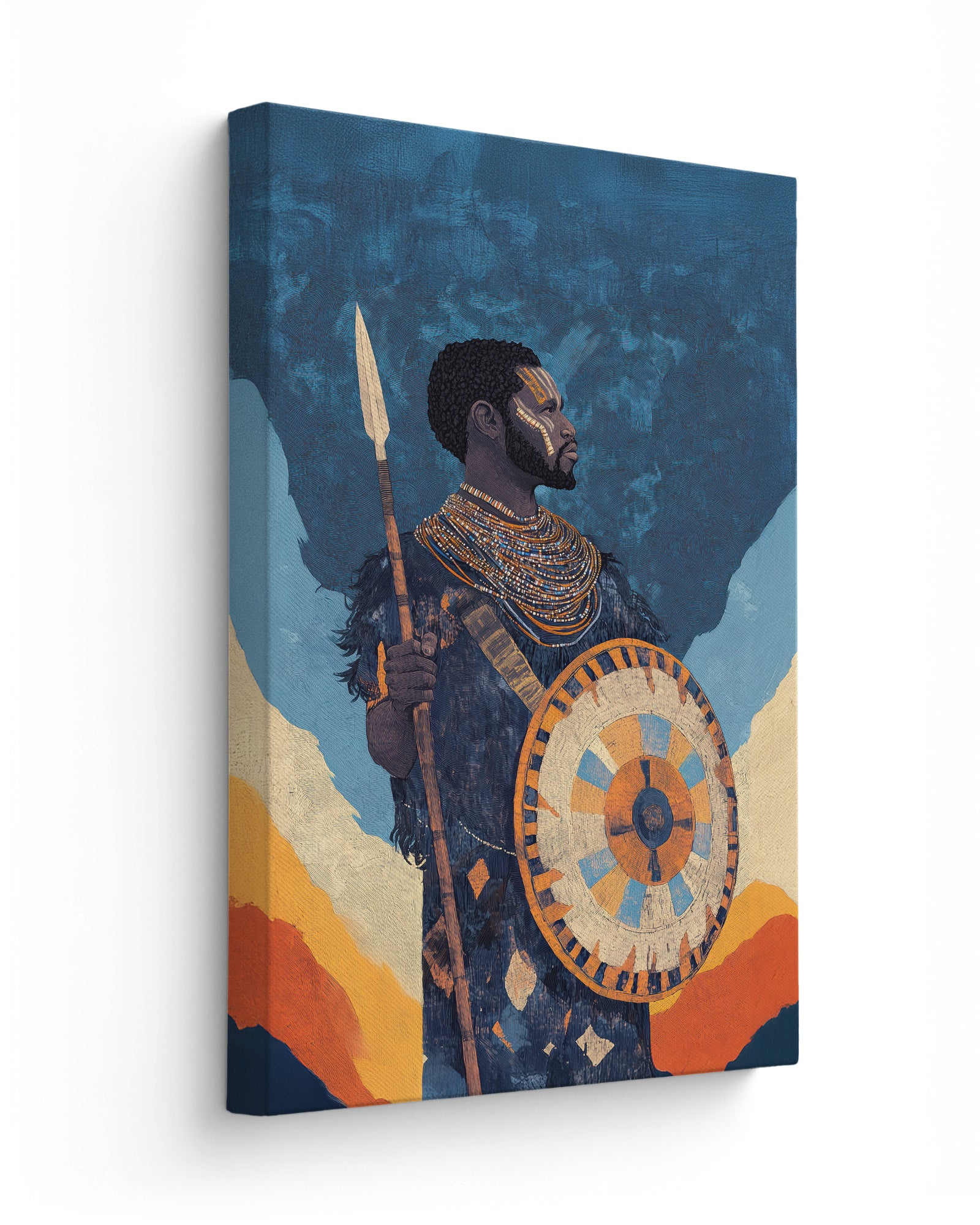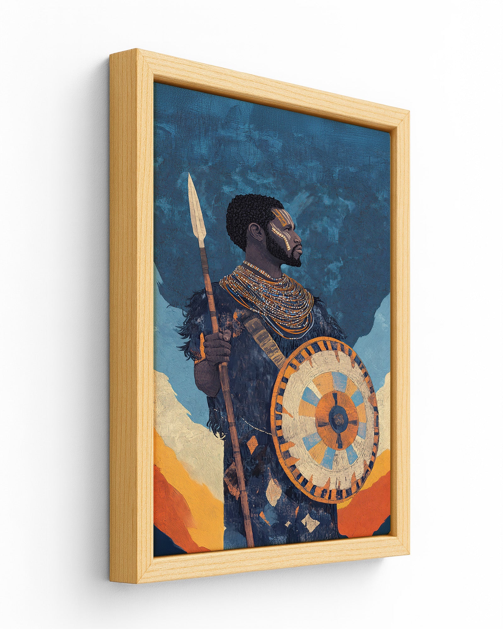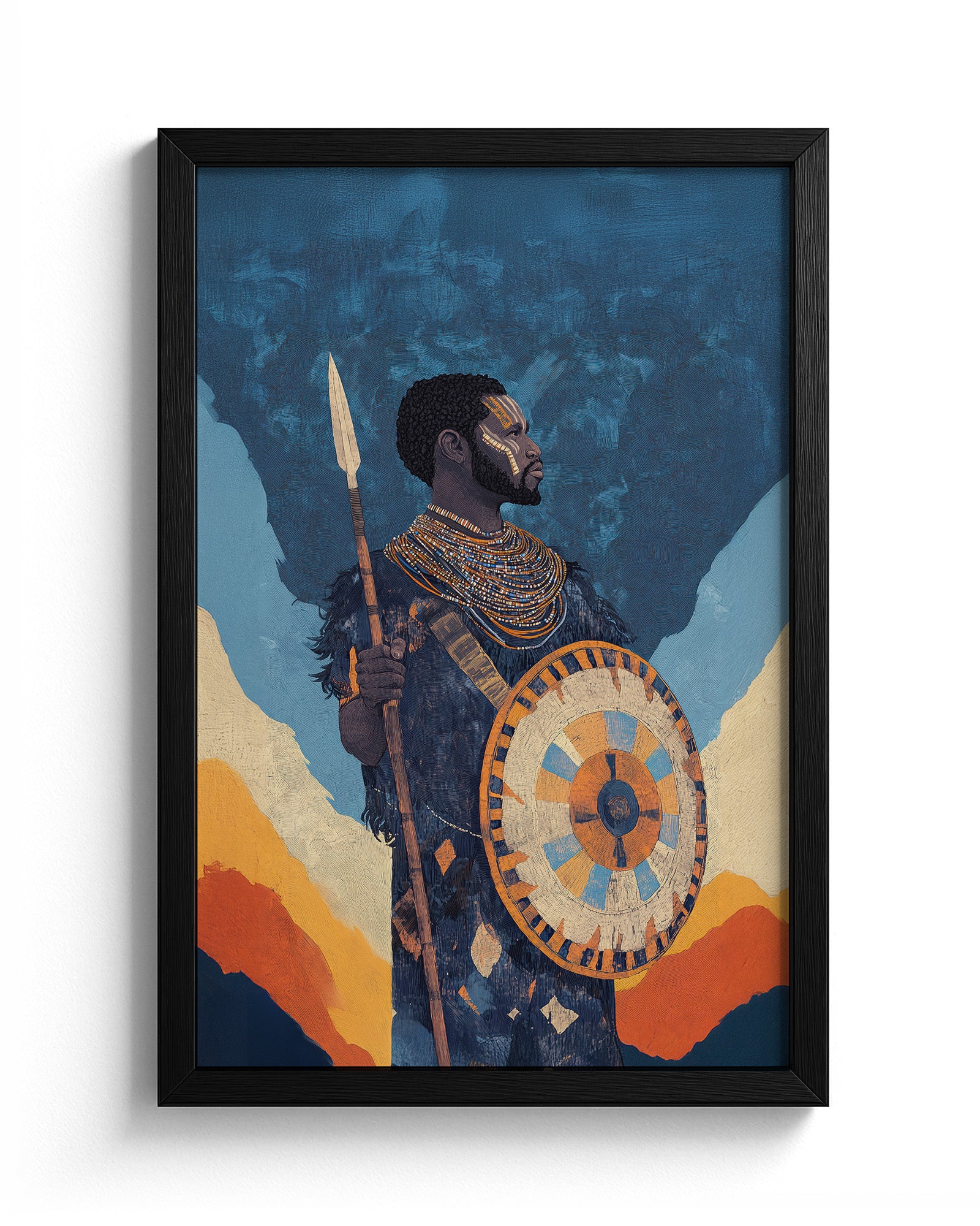 This breathtaking artwork portrays a Zulu warrior standing tall and proud, dressed in traditional tribal attire and holding a spear. His shield, adorned with intricate tribal patterns, symbolises a deep connection to his heritage. The background blends dynamic, modern abstract swirls of colour, representing tradition merging with contemporary energy.